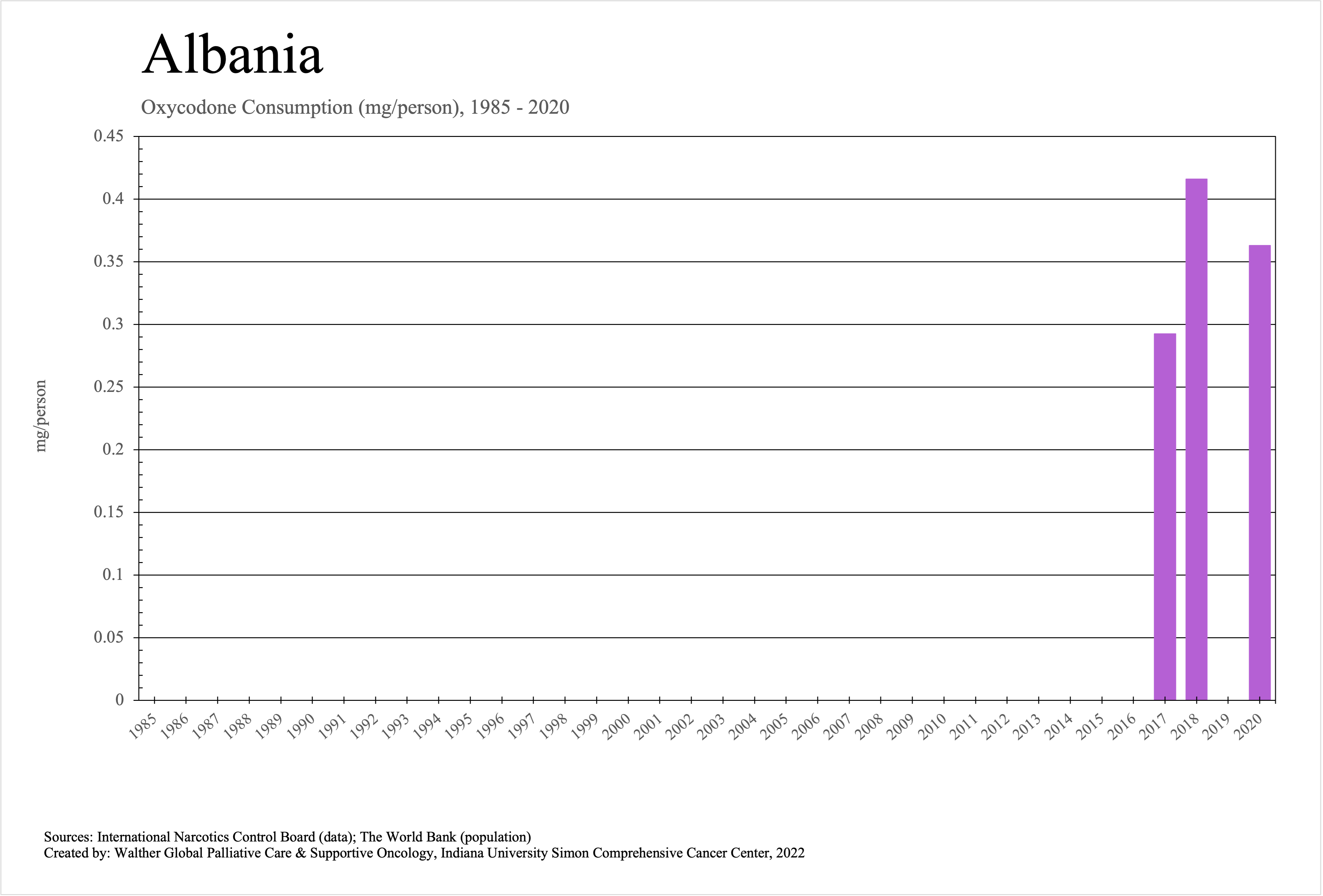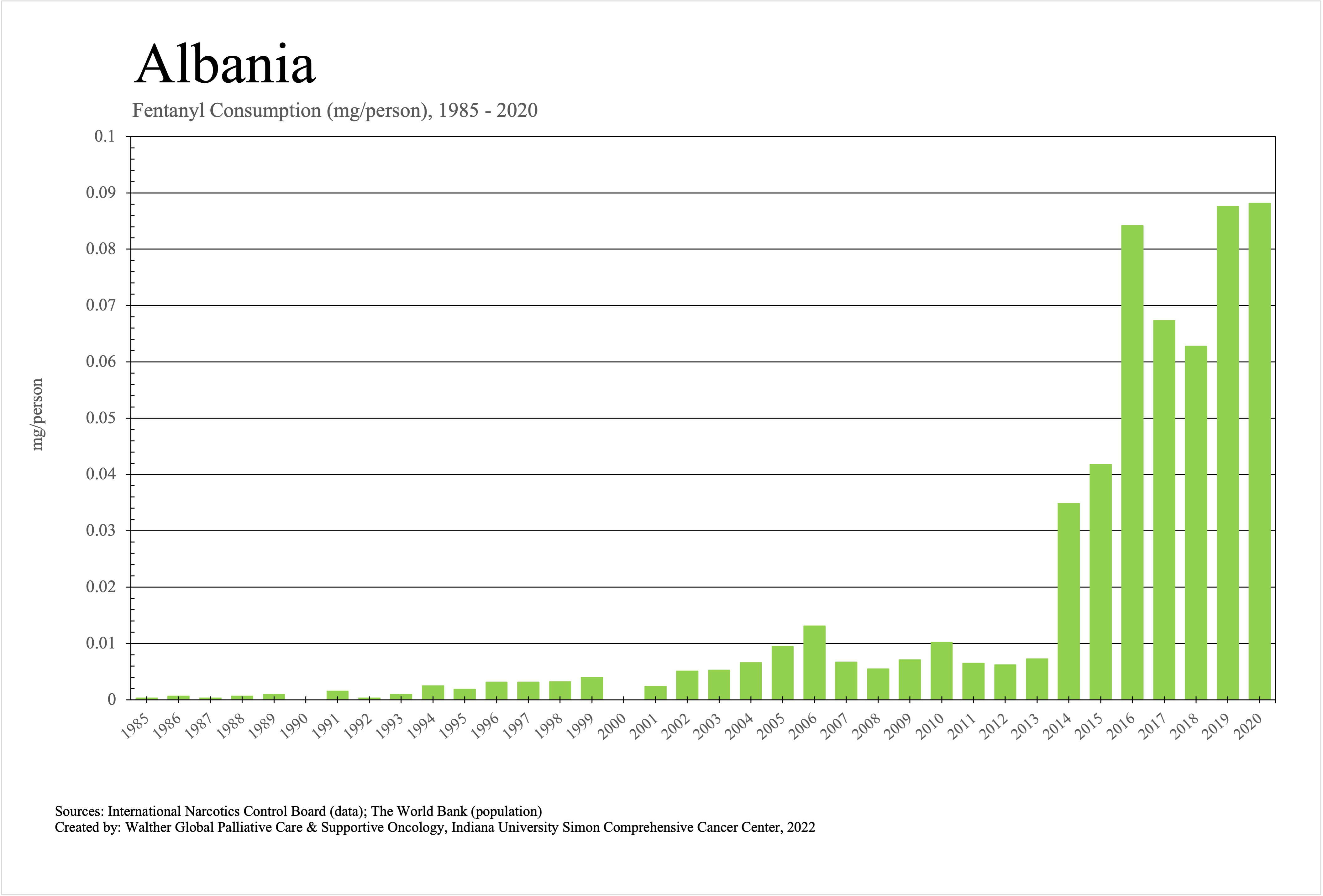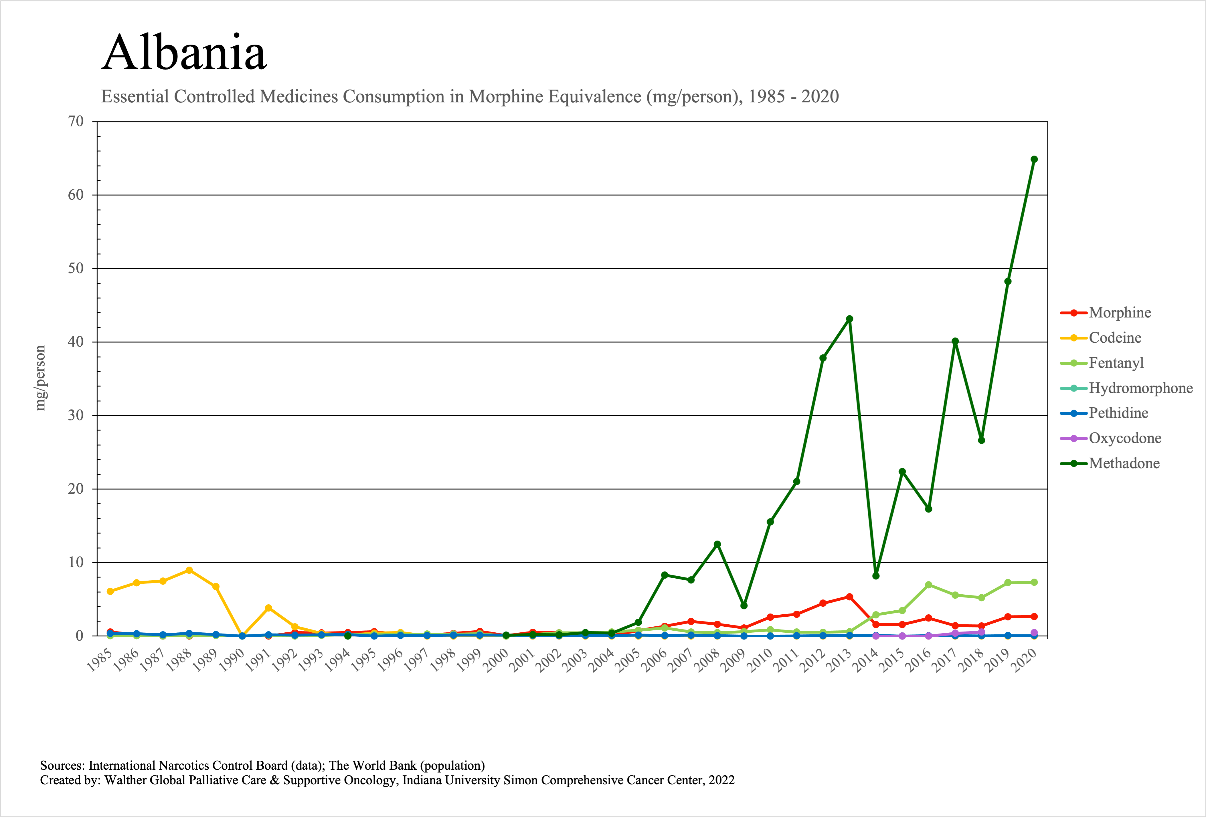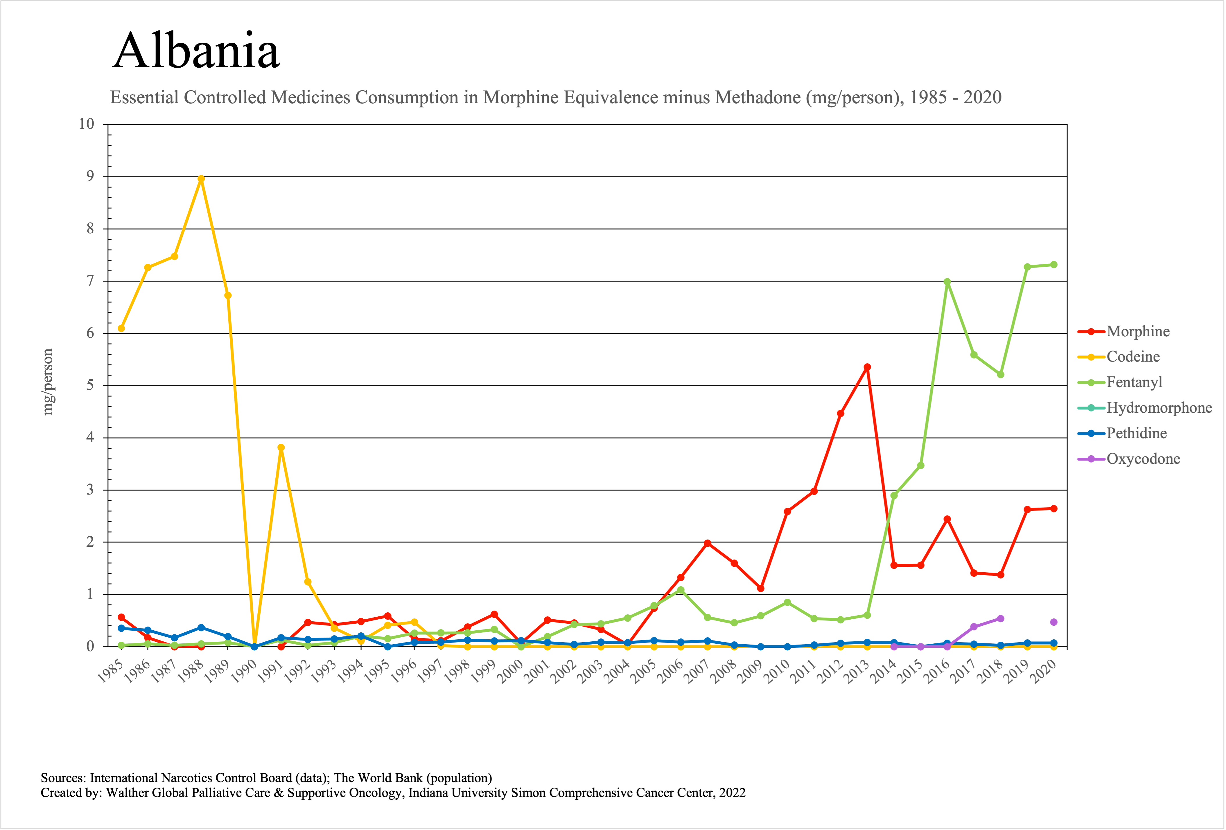 The graphs below provide the Essential Controlled Medicines consumption data trends from 1985 to 2020 in milligrams per capita and Morphine Equivalence (ME) milligrams per capita, as reported to the International Narcotics Control Board (INCB).