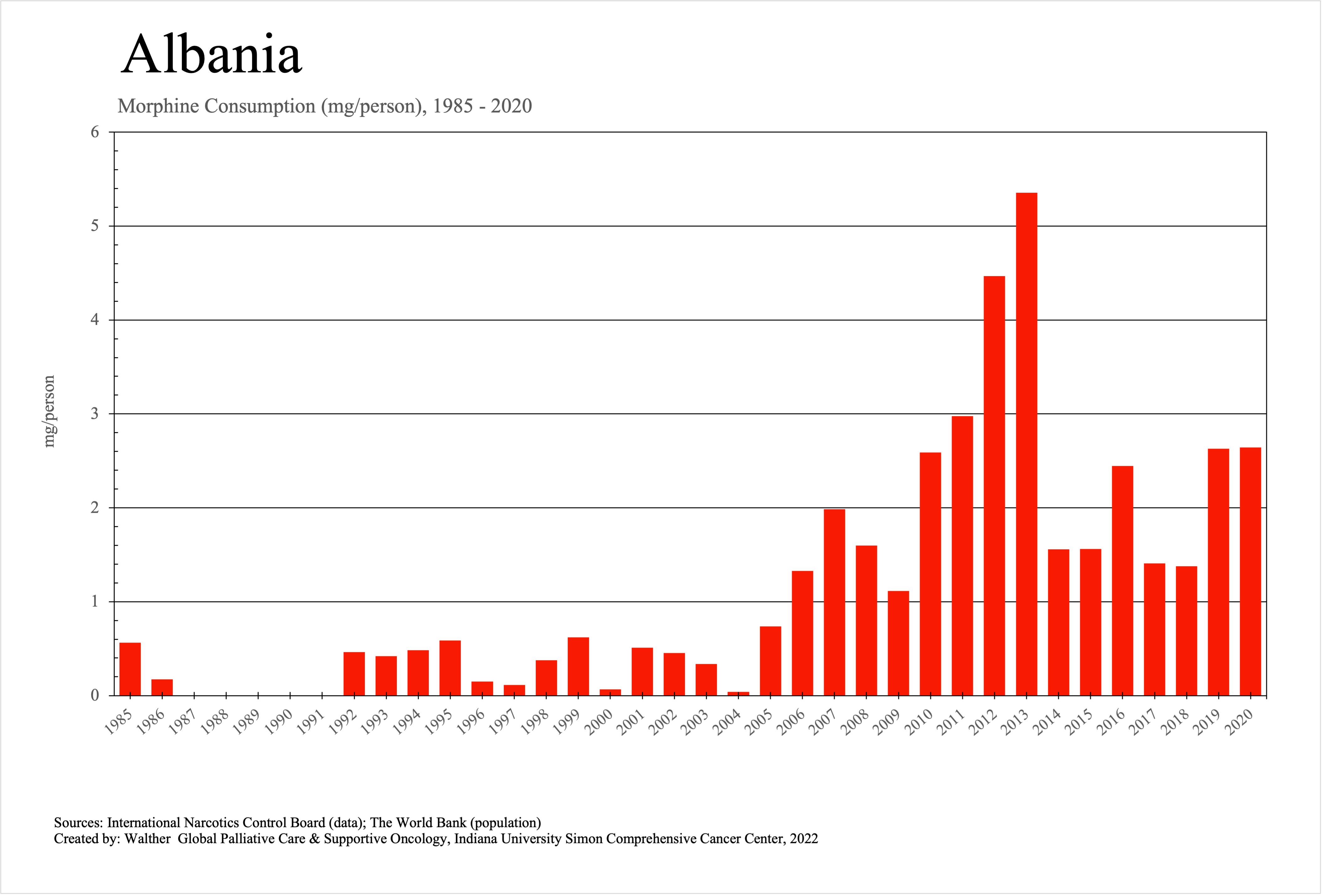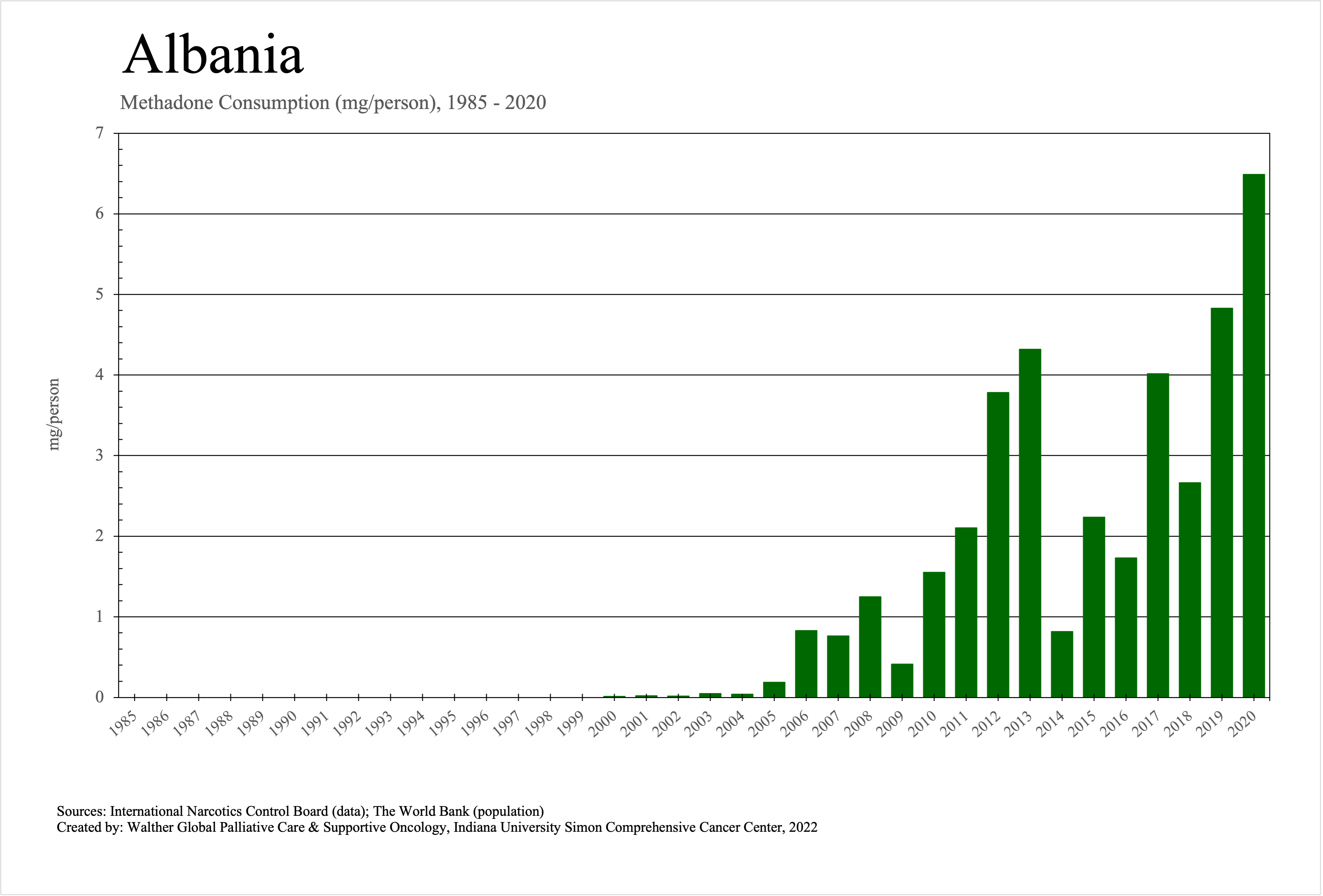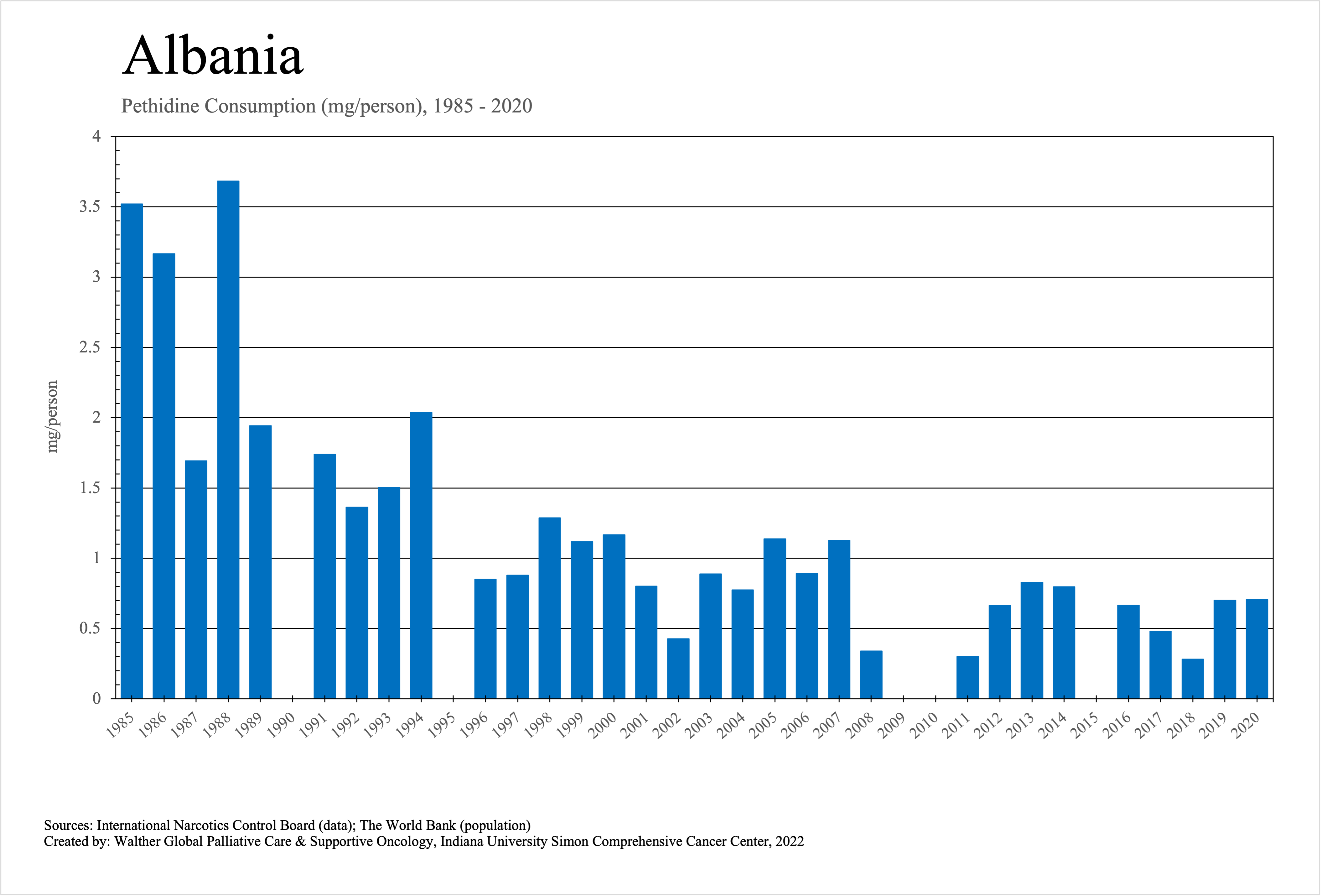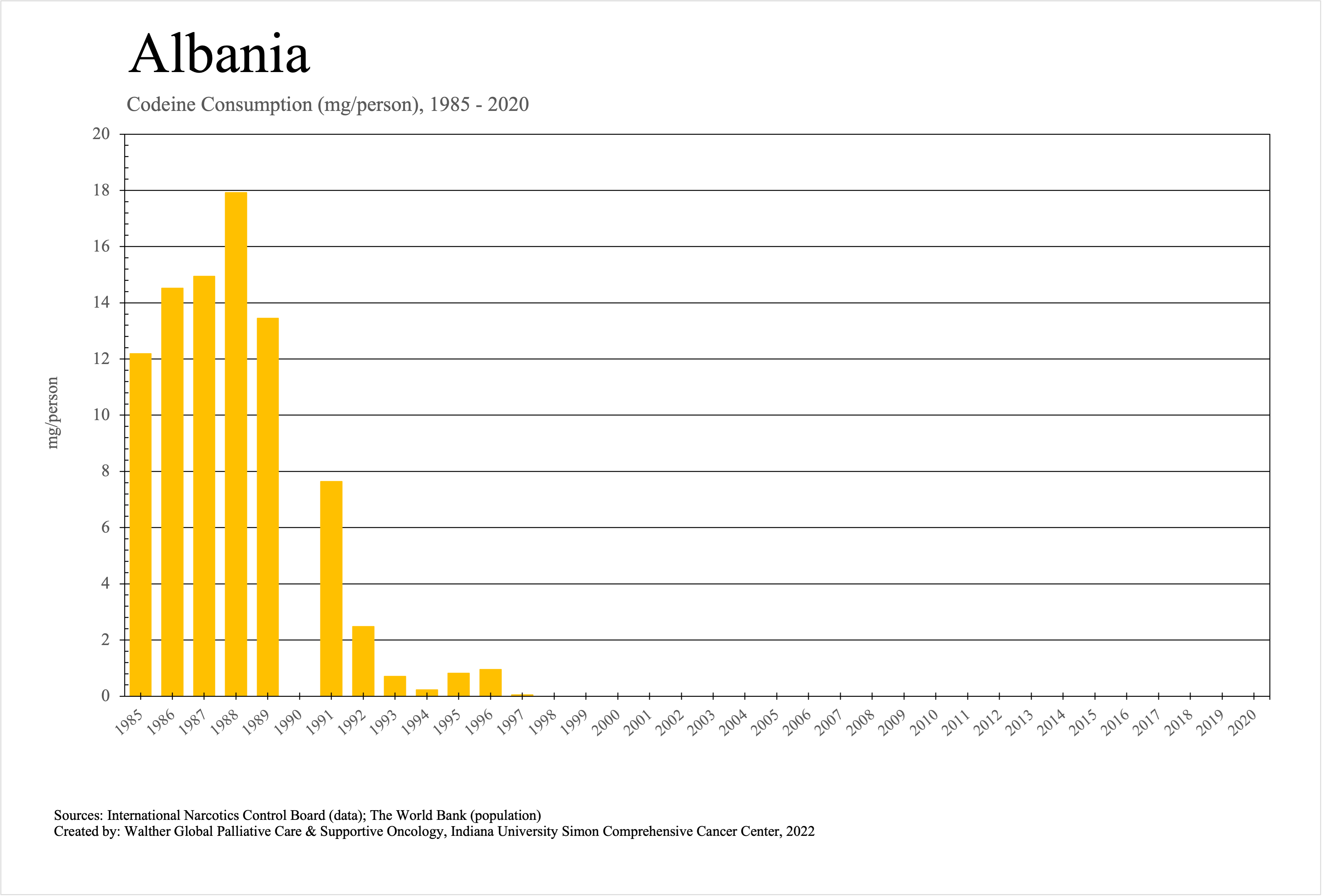 The graphs below provide the Essential Controlled Medicines consumption data trends from 1985 to 2020 in milligrams per capita and Morphine Equivalence (ME) milligrams per capita, as reported to the International Narcotics Control Board (INCB).