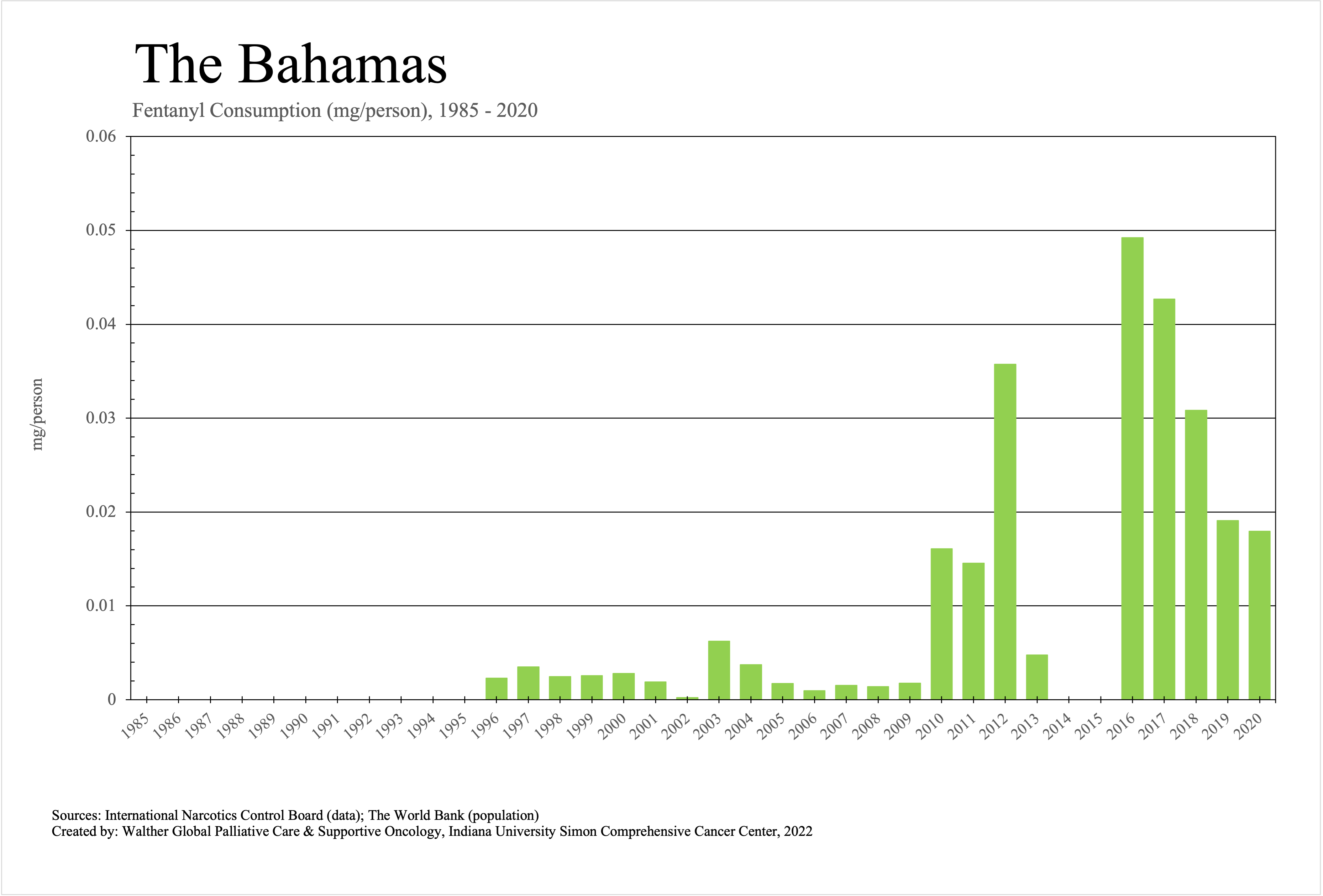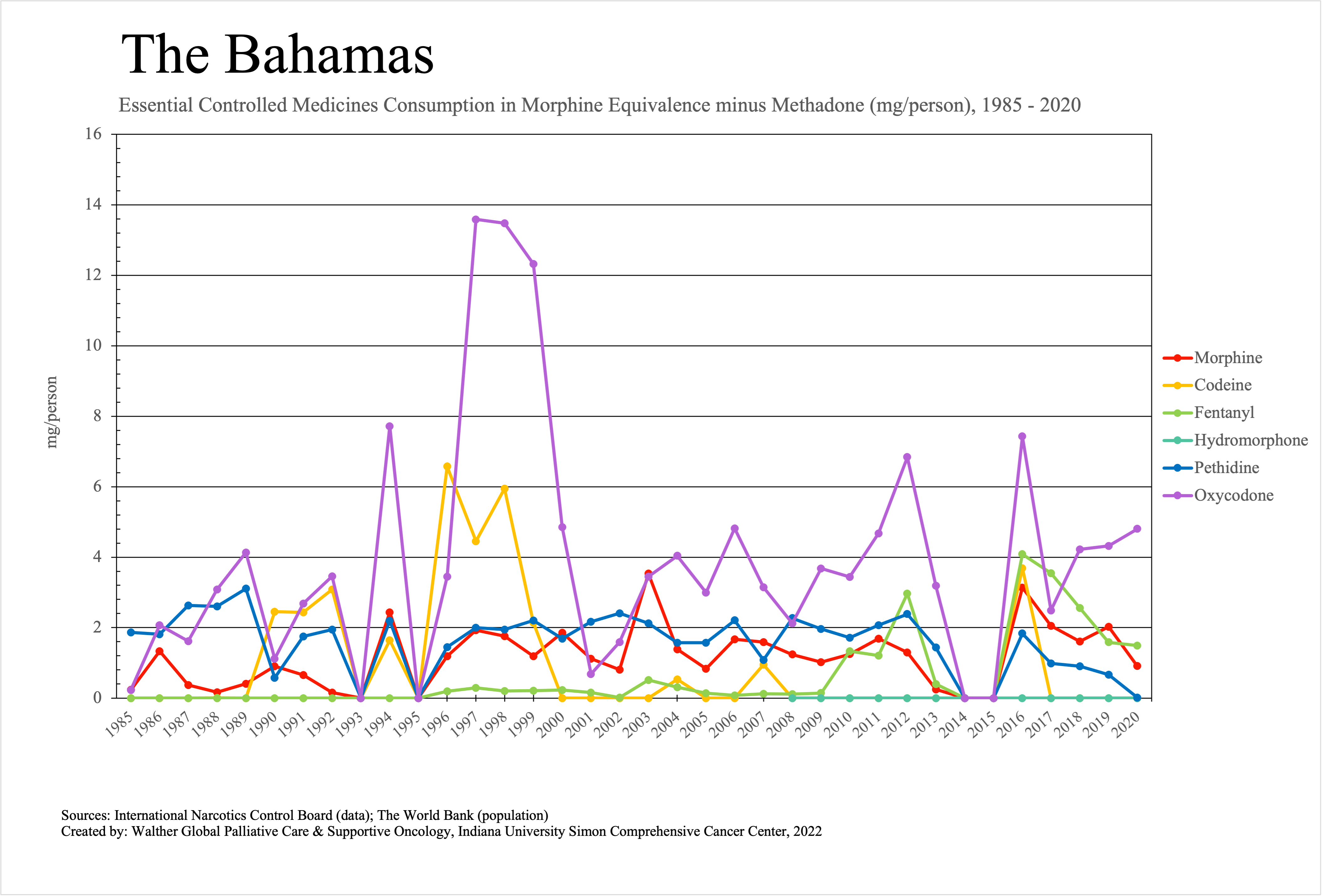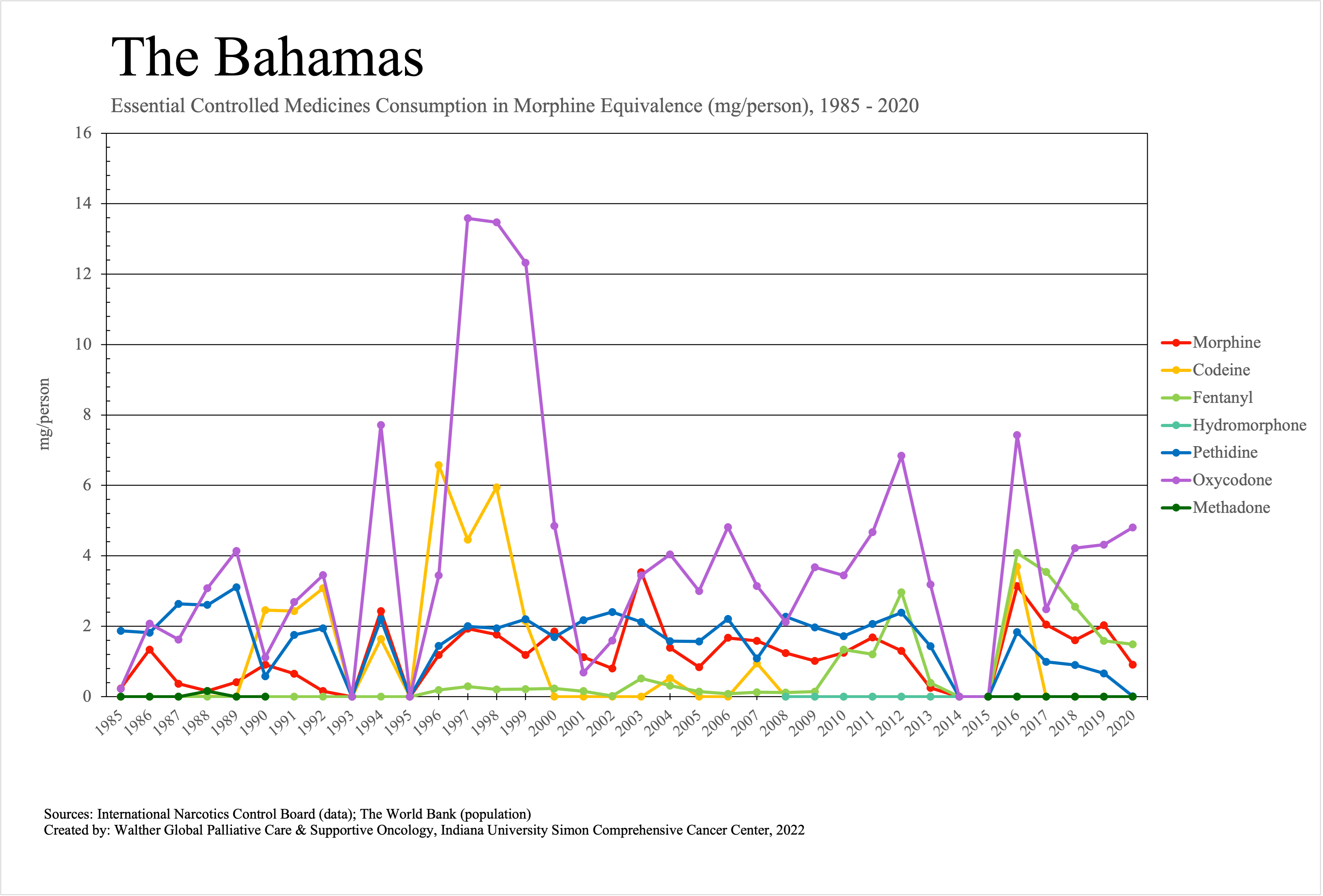 The graphs below provide the Essential Controlled Medicines consumption data trends from 1985 to 2020 in milligrams per capita and Morphine Equivalence (ME) milligrams per capita, as reported to the International Narcotics Control Board (INCB).