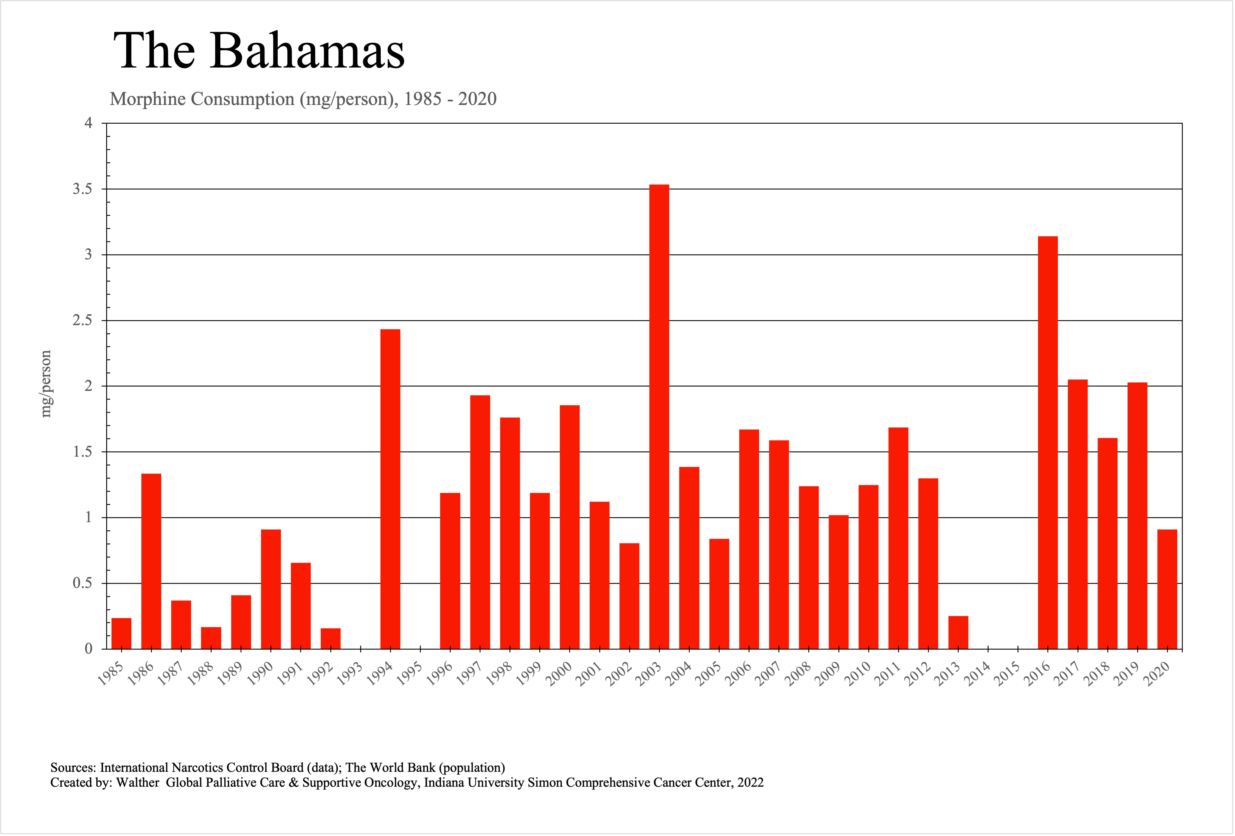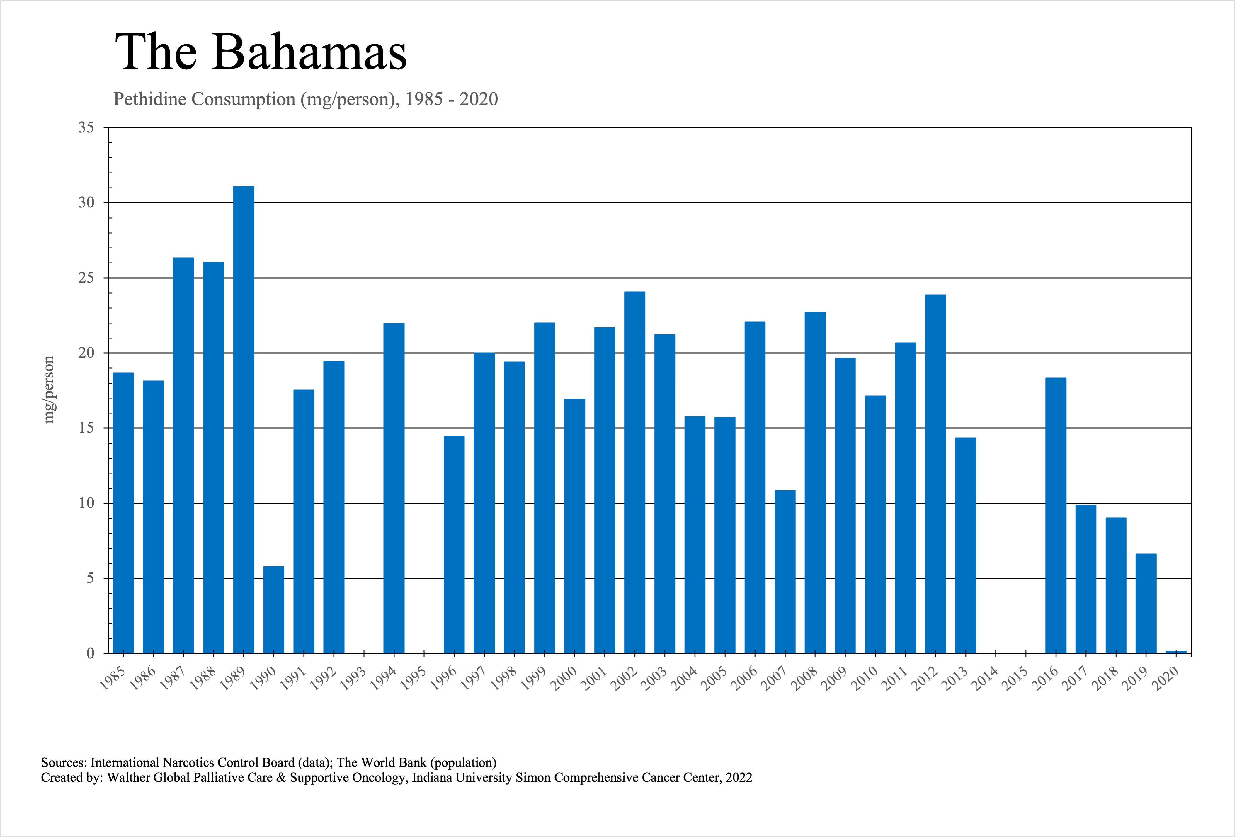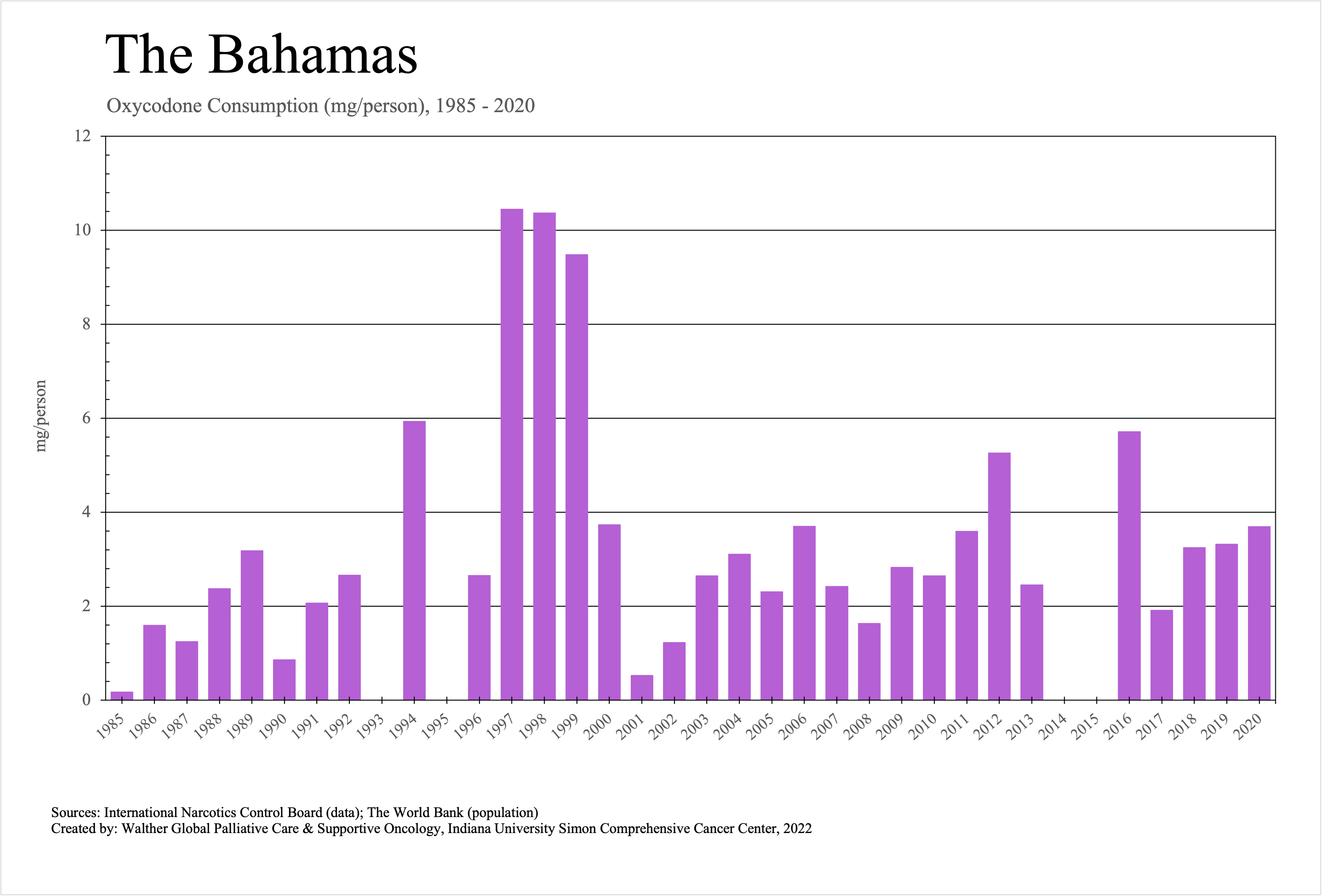 The graphs below provide the Essential Controlled Medicines consumption data trends from 1985 to 2020 in milligrams per capita and Morphine Equivalence (ME) milligrams per capita, as reported to the International Narcotics Control Board (INCB).