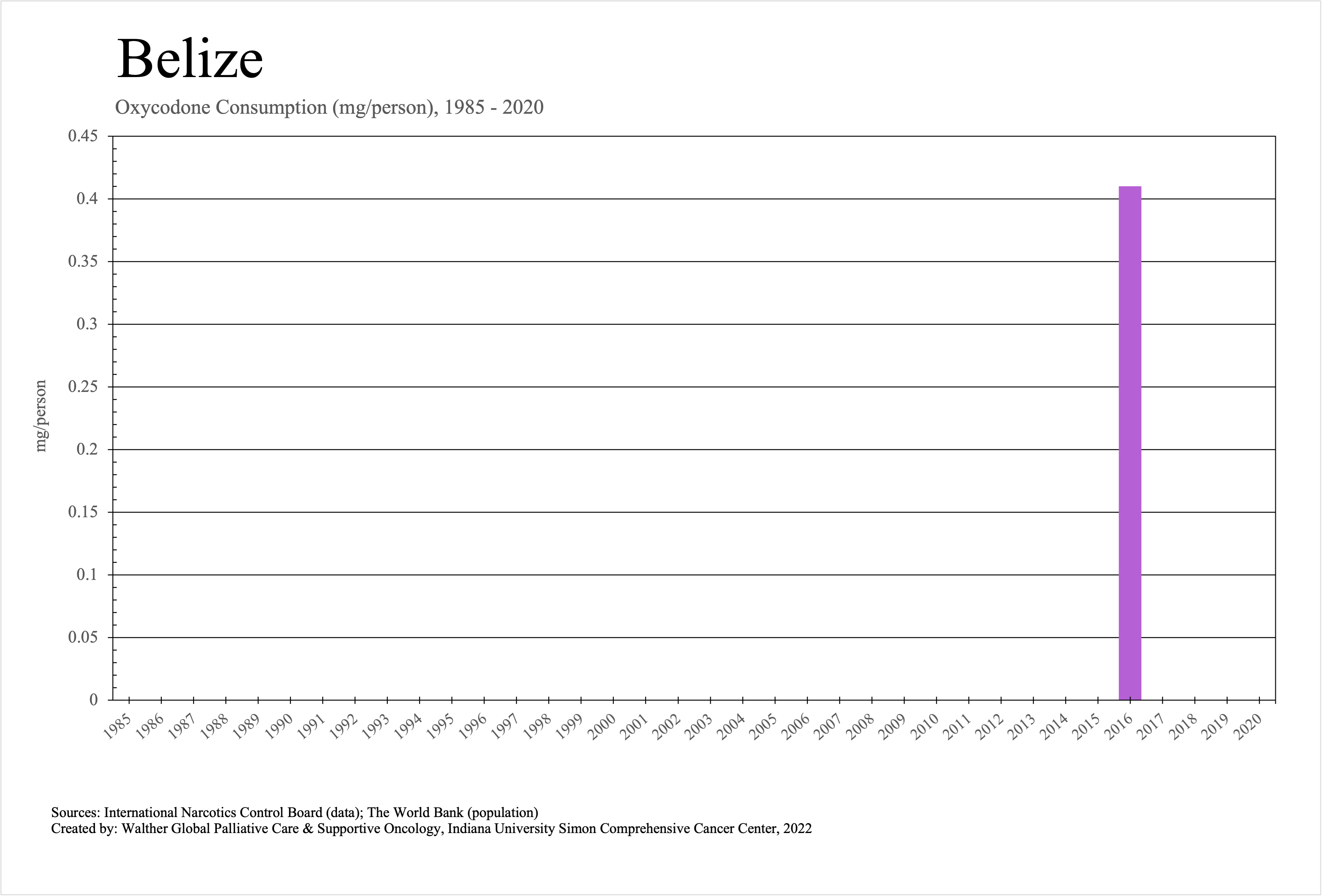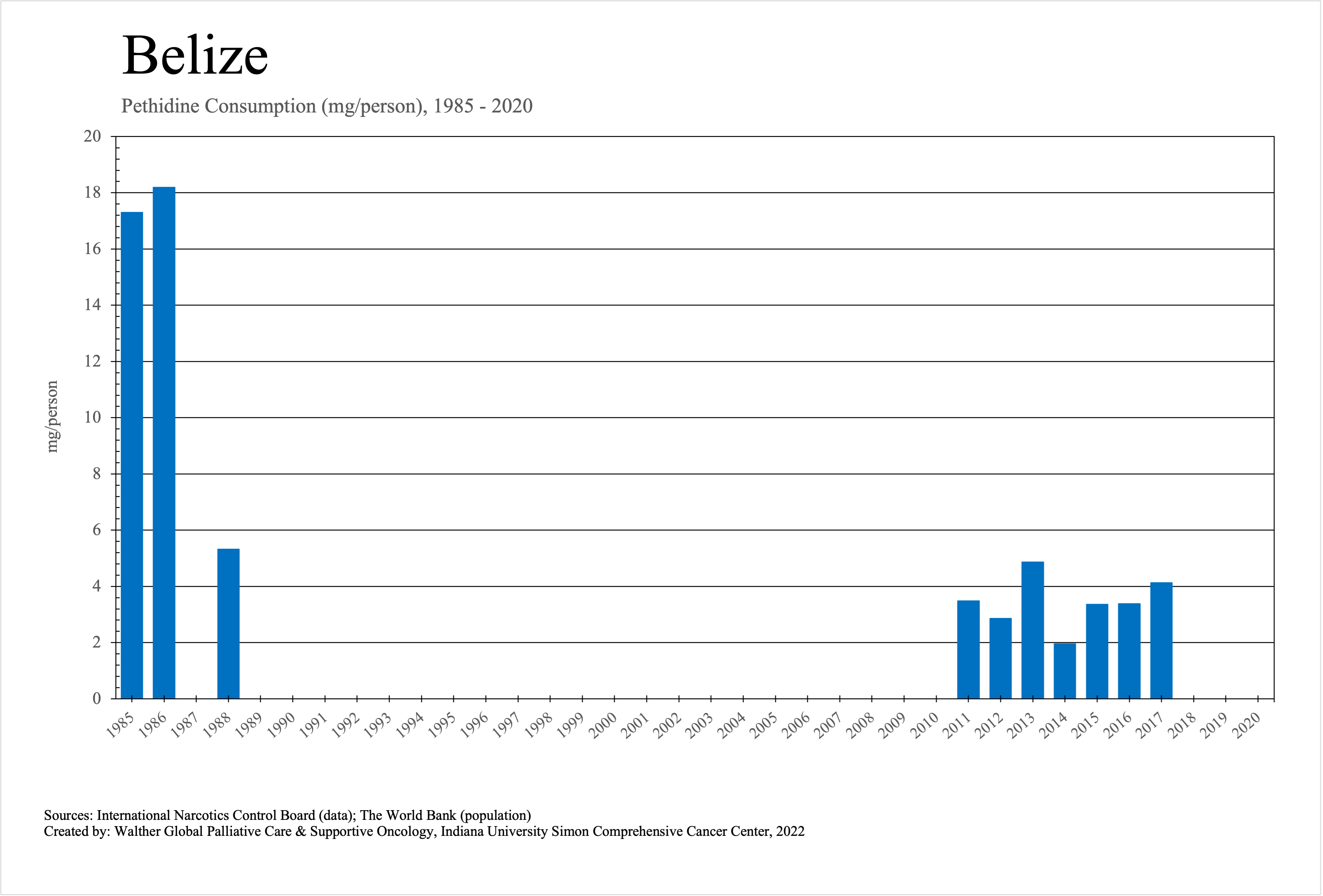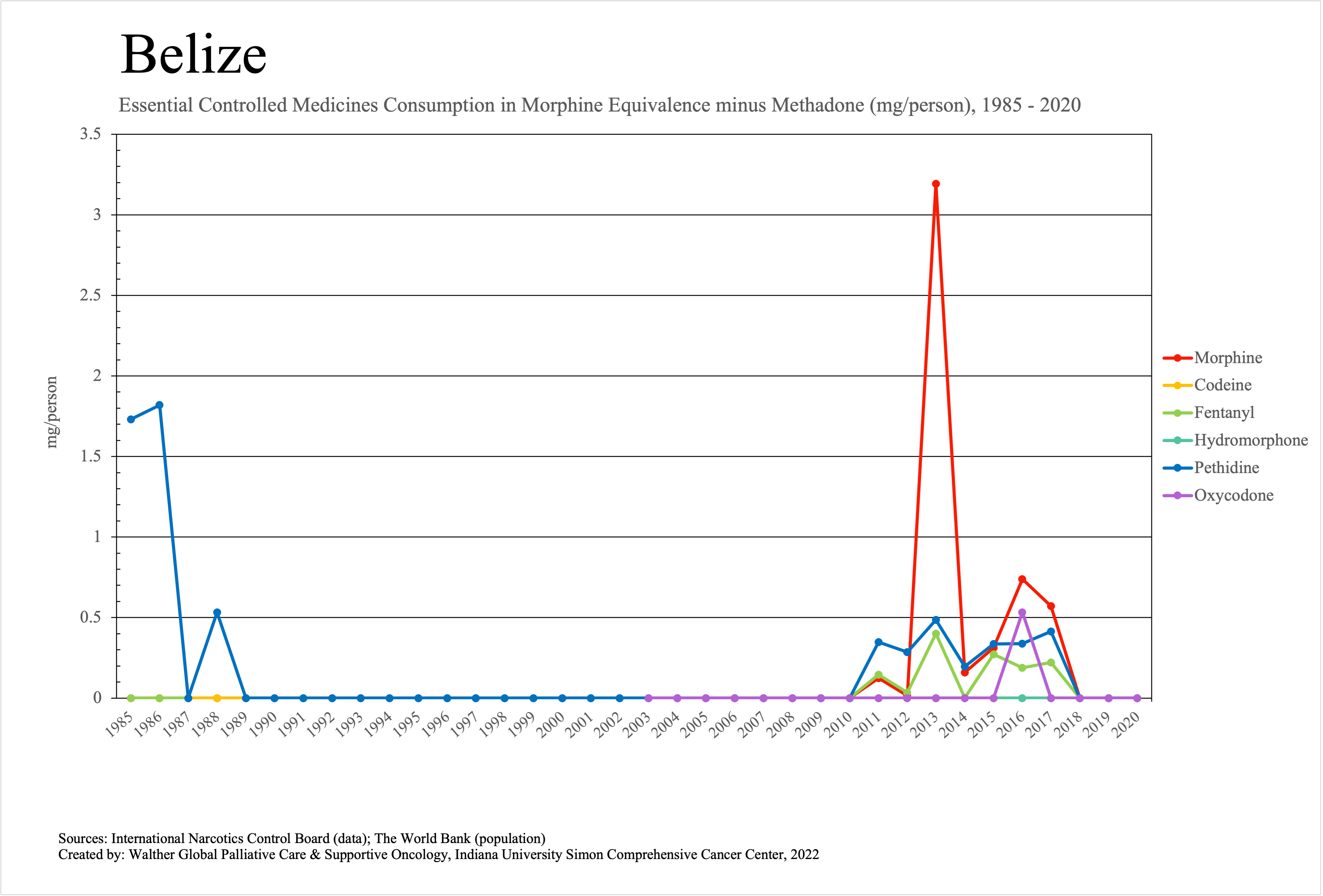 The graphs below provide the Essential Controlled Medicines consumption data trends from 1985 to 2020 in milligrams per capita and Morphine Equivalence (ME) milligrams per capita, as reported to the International Narcotics Control Board (INCB).
