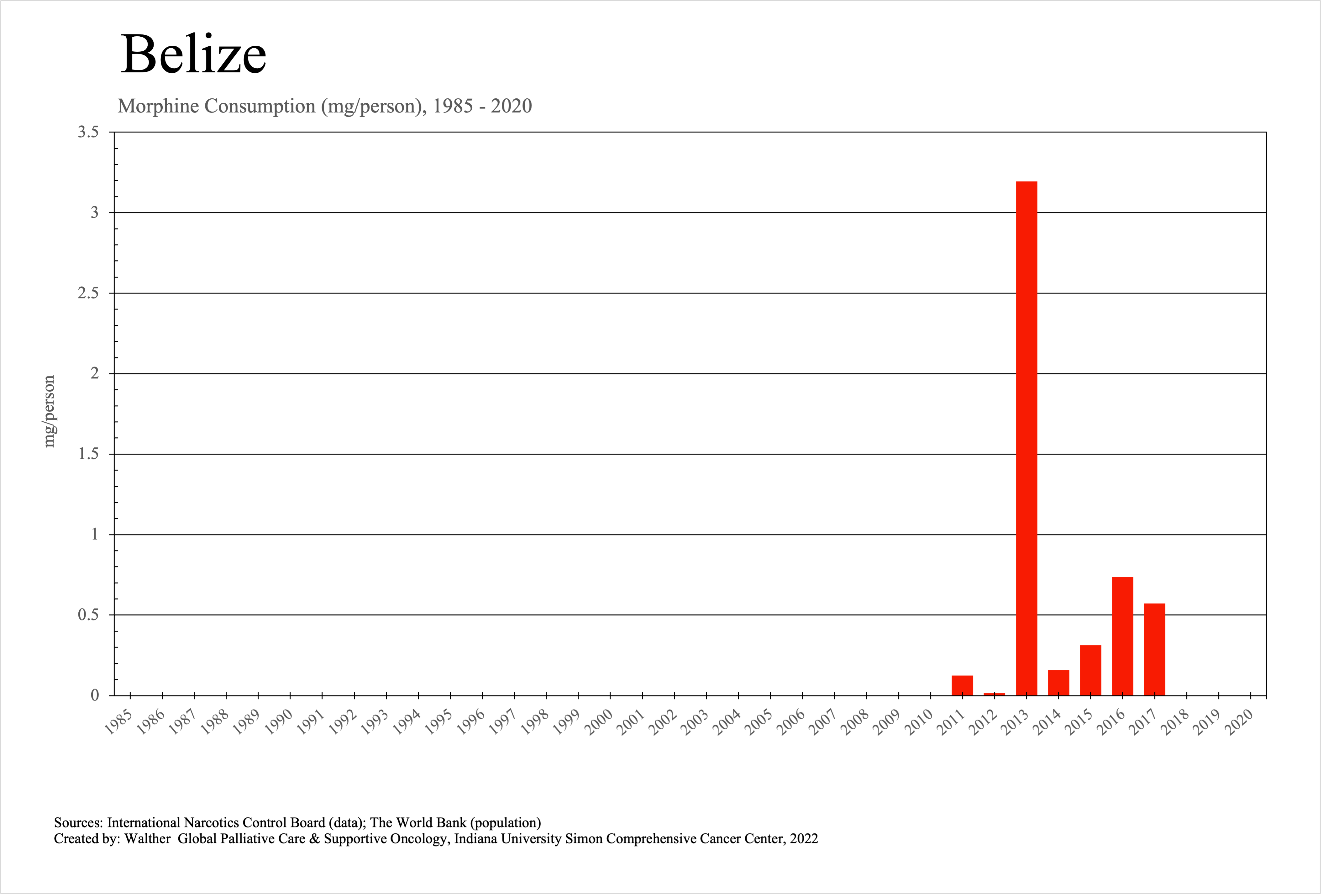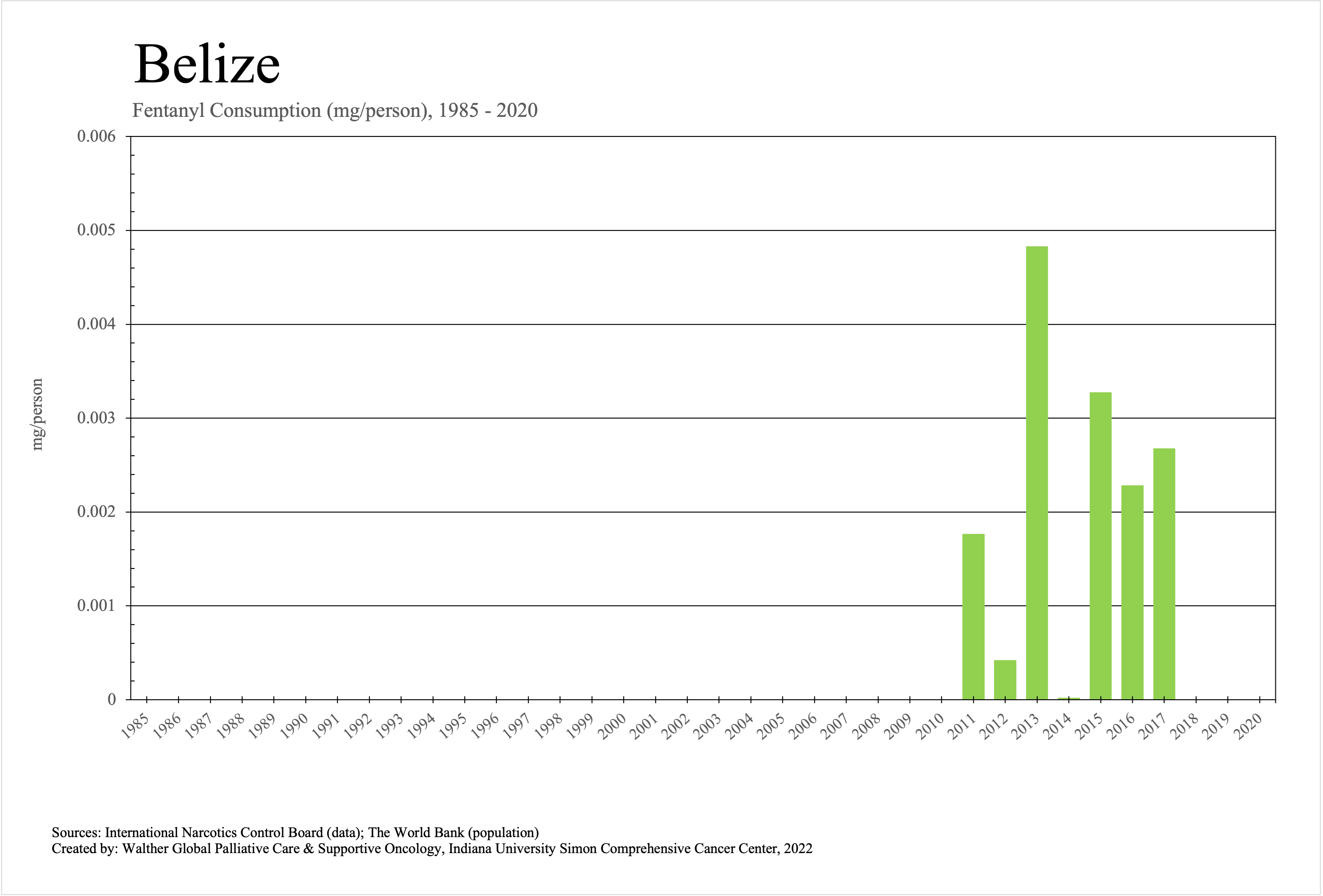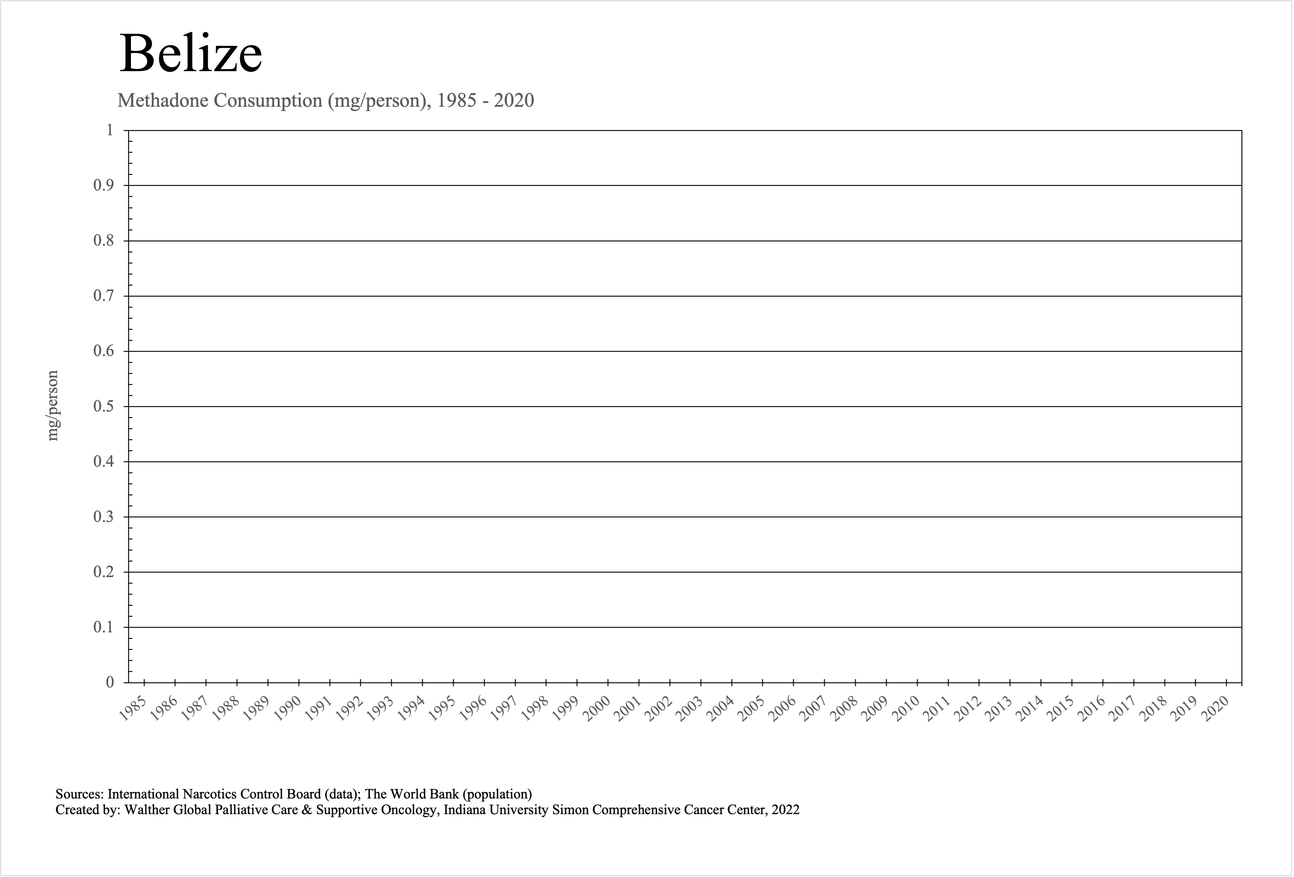 The graphs below provide the Essential Controlled Medicines consumption data trends from 1985 to 2020 in milligrams per capita and Morphine Equivalence (ME) milligrams per capita, as reported to the International Narcotics Control Board (INCB).