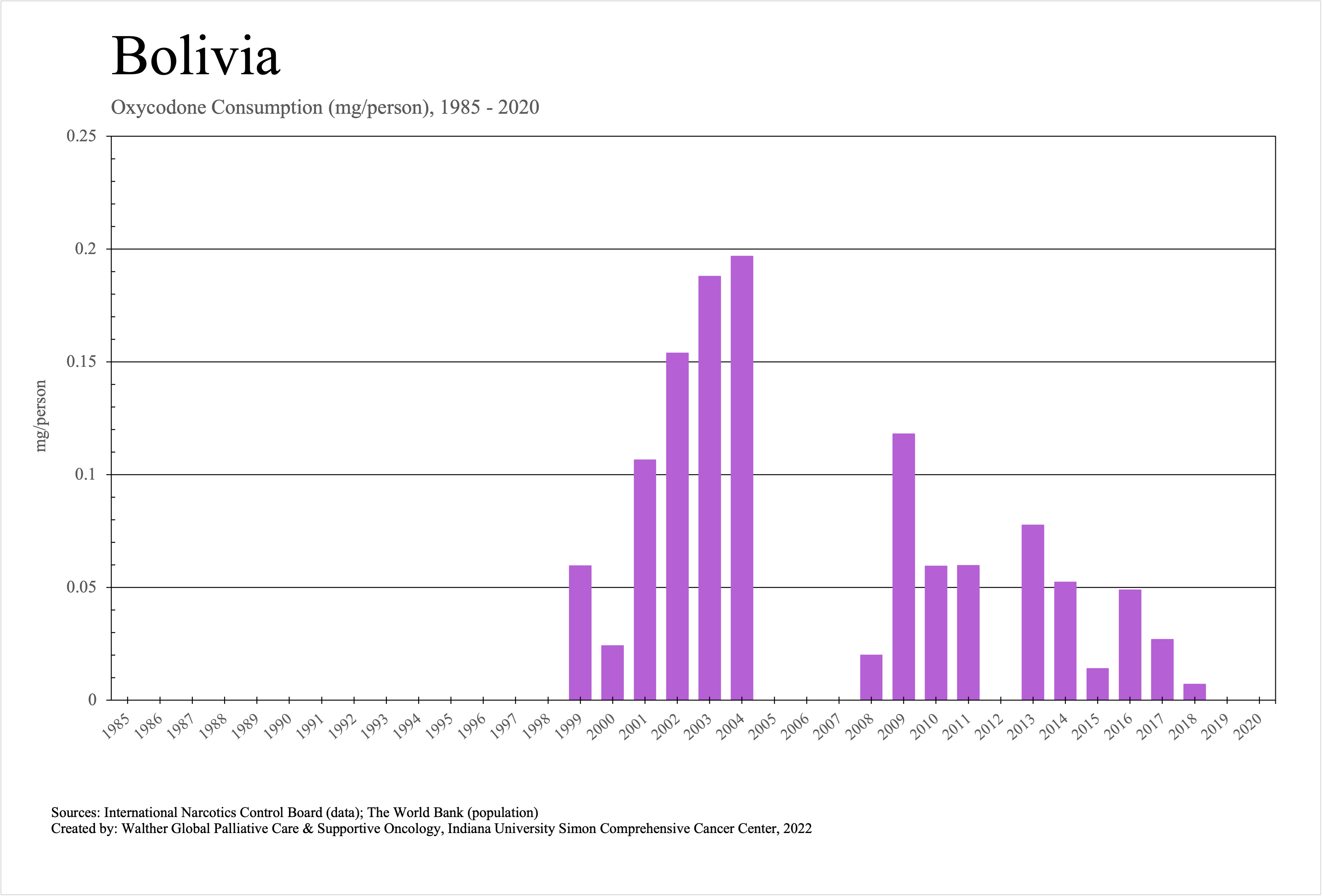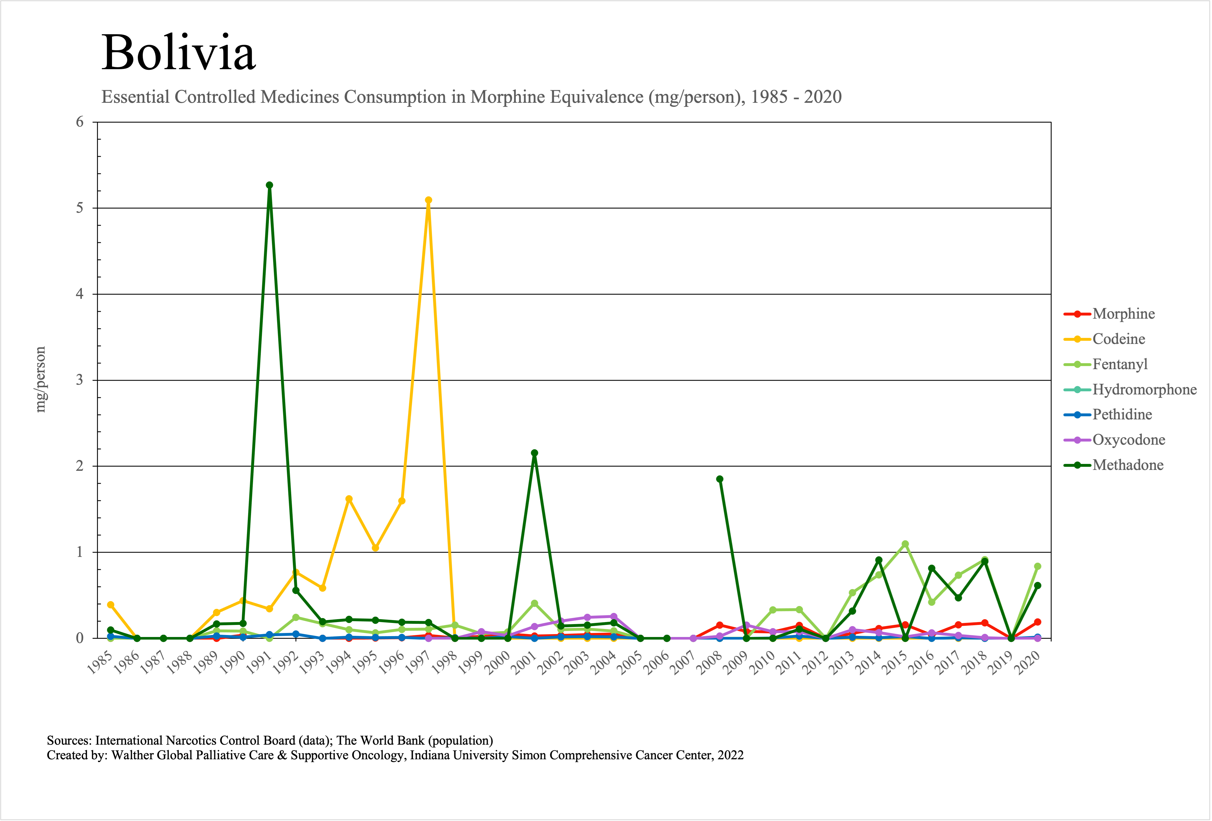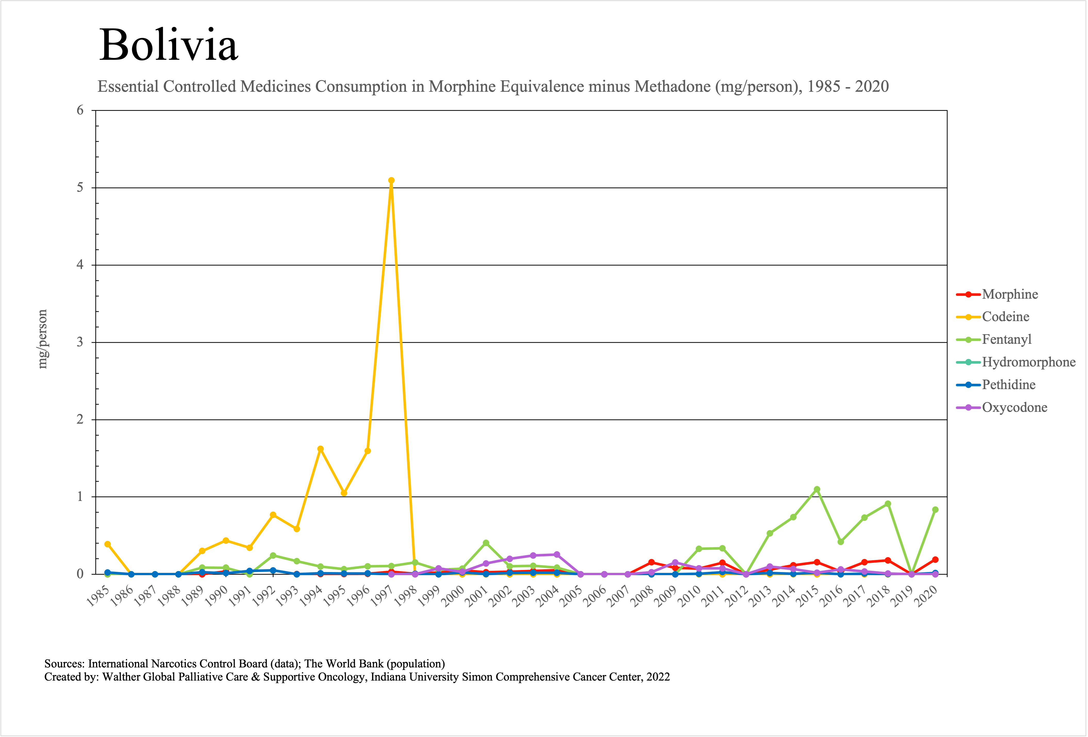 The graphs below provide the Essential Controlled Medicines consumption data trends from 1985 to 2020 in milligrams per capita and Morphine Equivalence (ME) milligrams per capita, as reported to the International Narcotics Control Board (INCB).