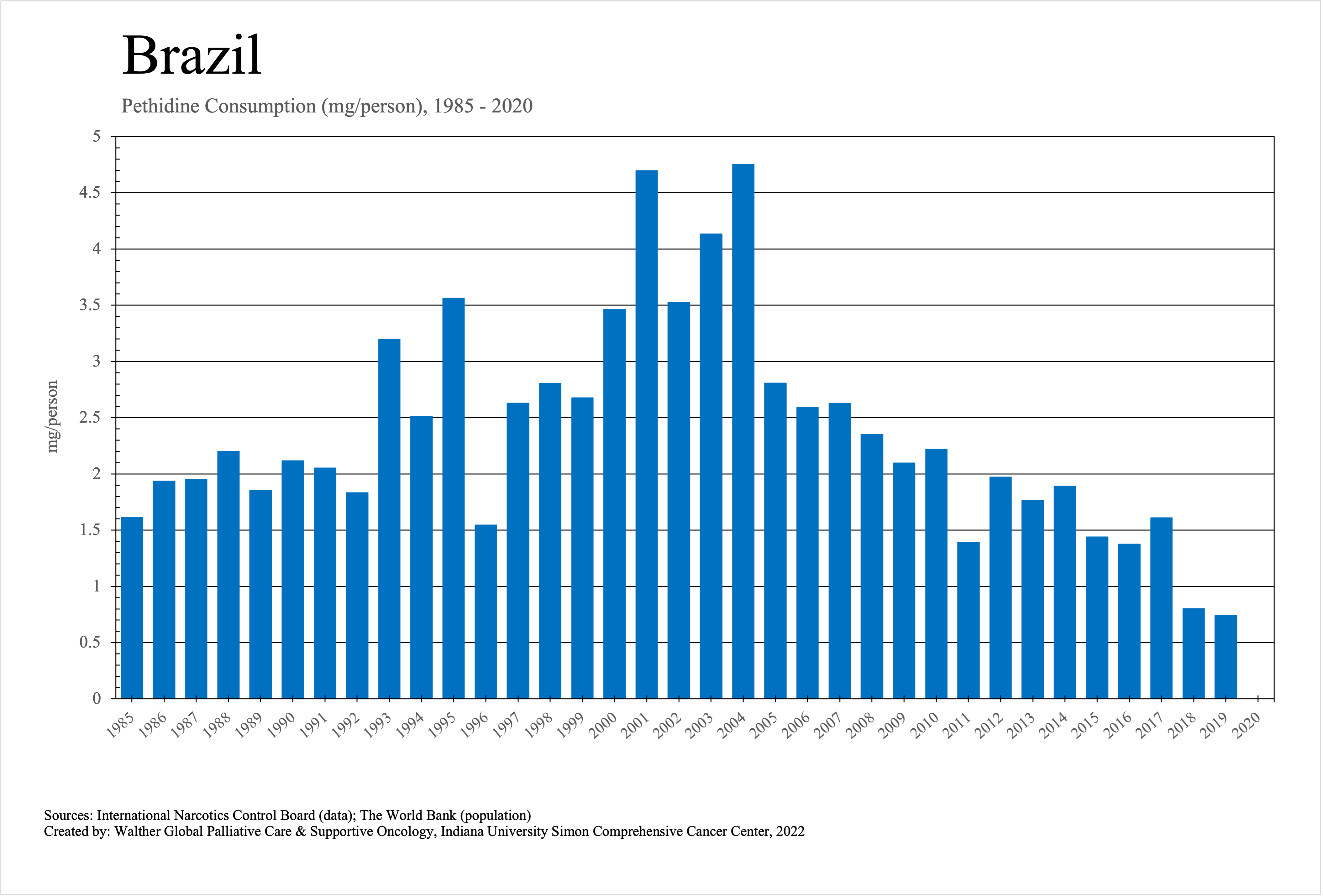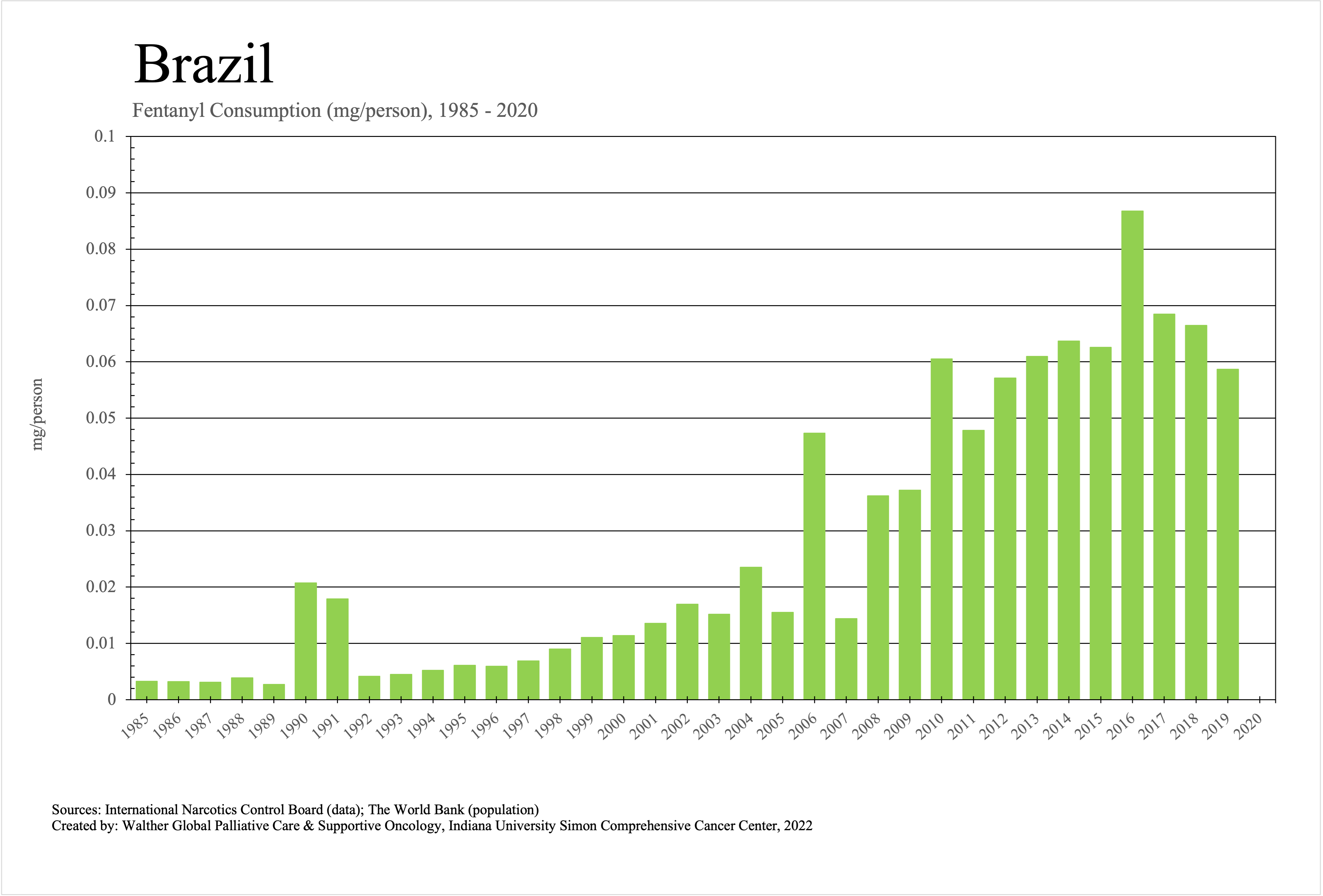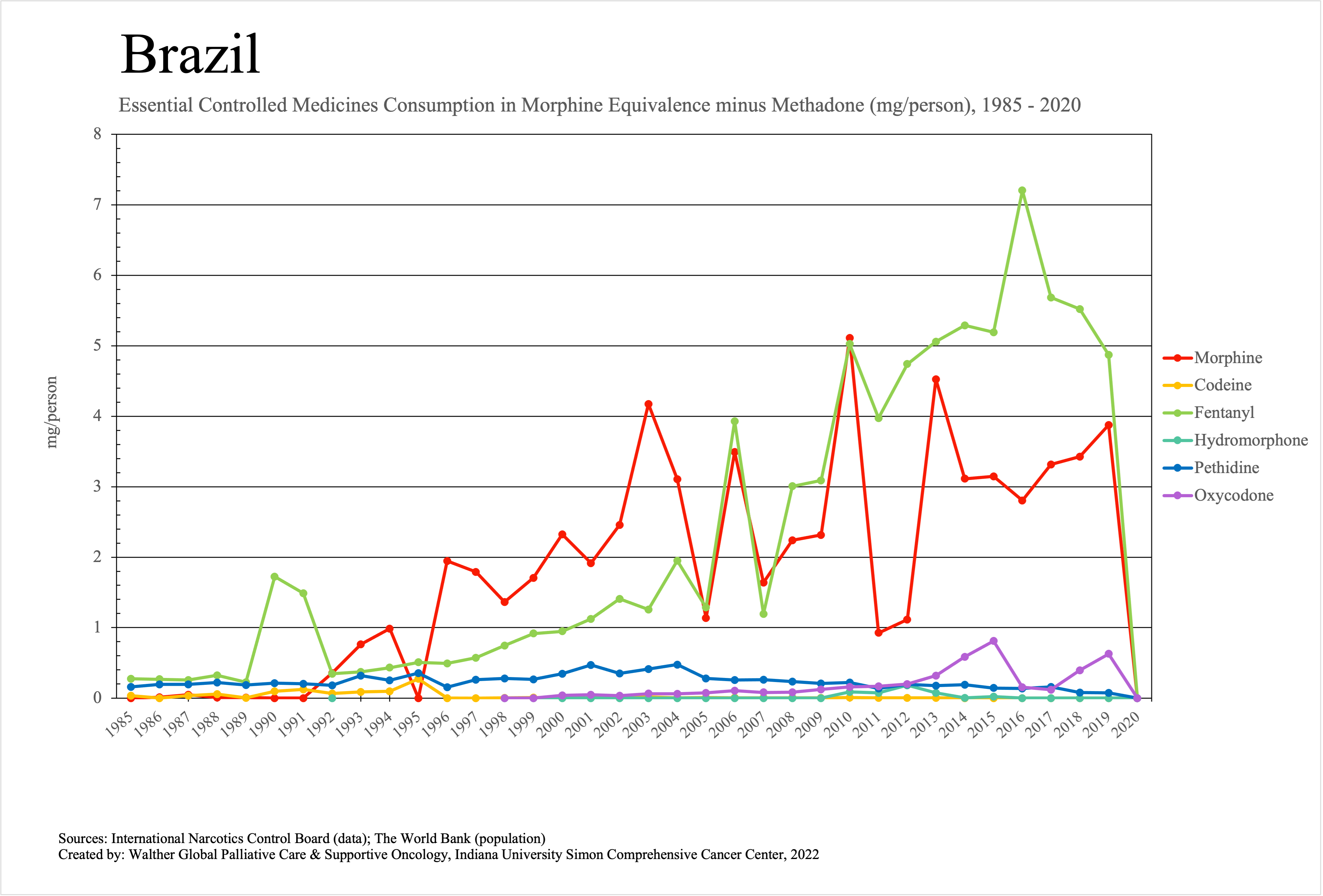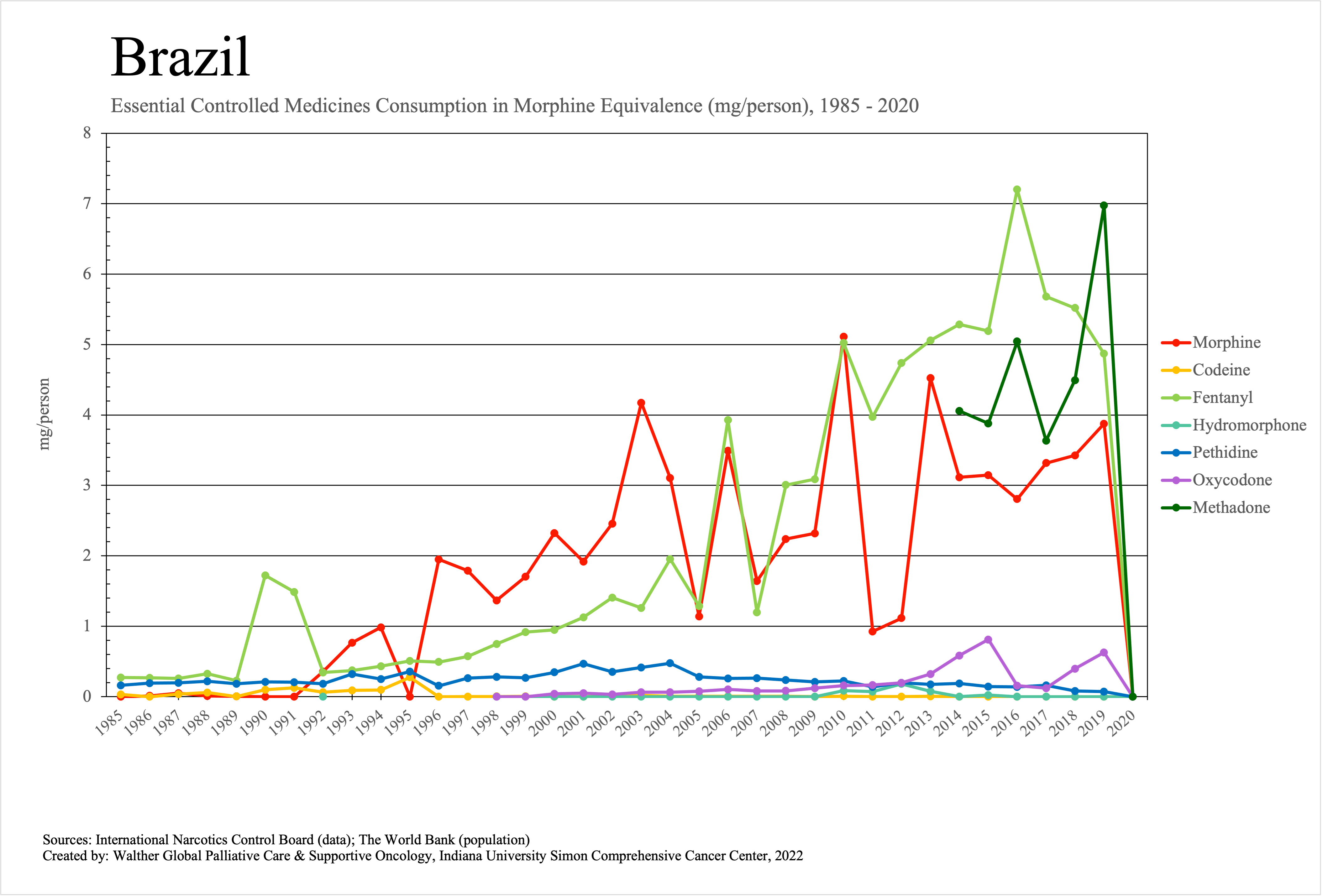The graphs below provide the Essential Controlled Medicines consumption data trends from 1985 to 2020 in milligrams per capita and Morphine Equivalence (ME) milligrams per capita, as reported to the International Narcotics Control Board (INCB).