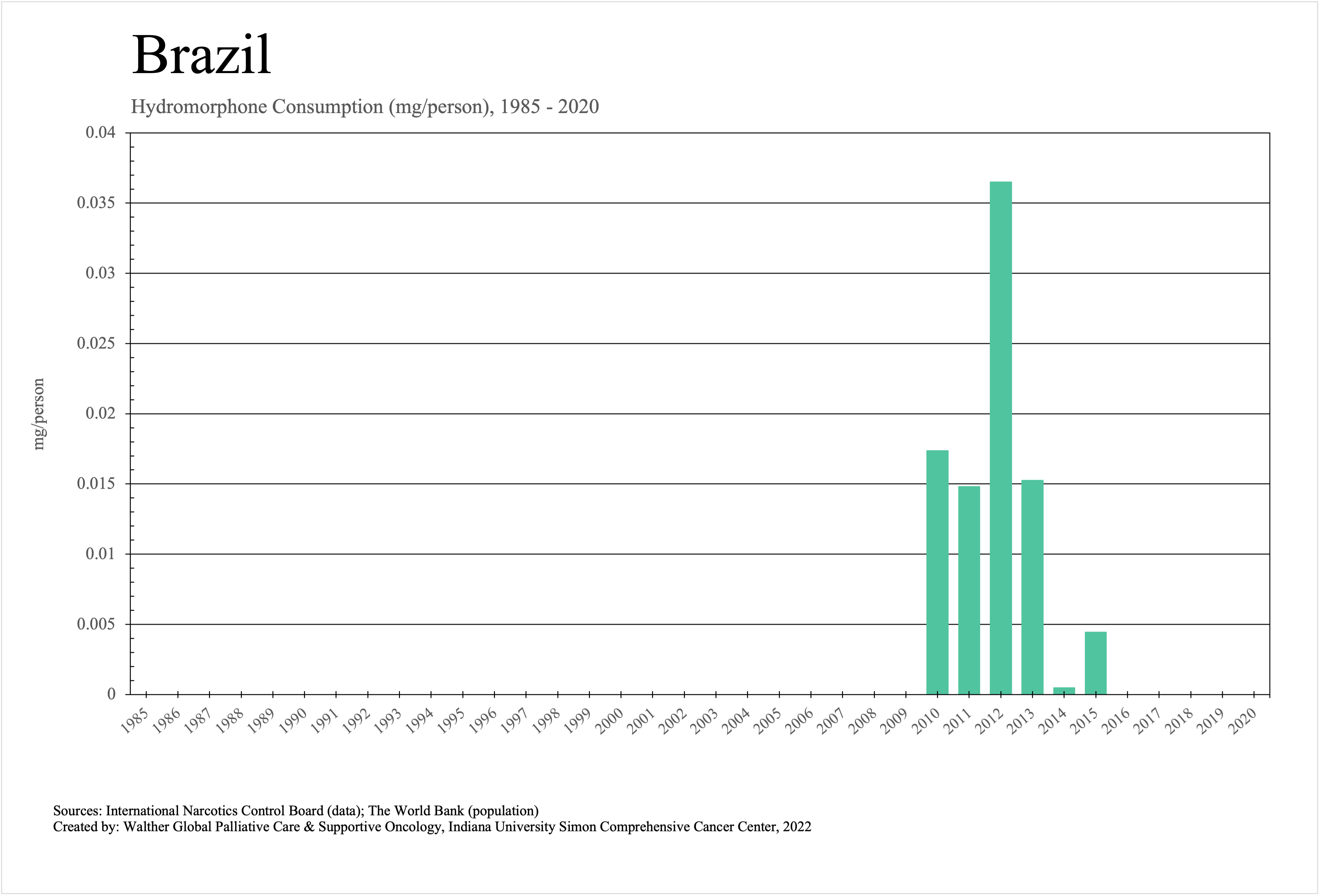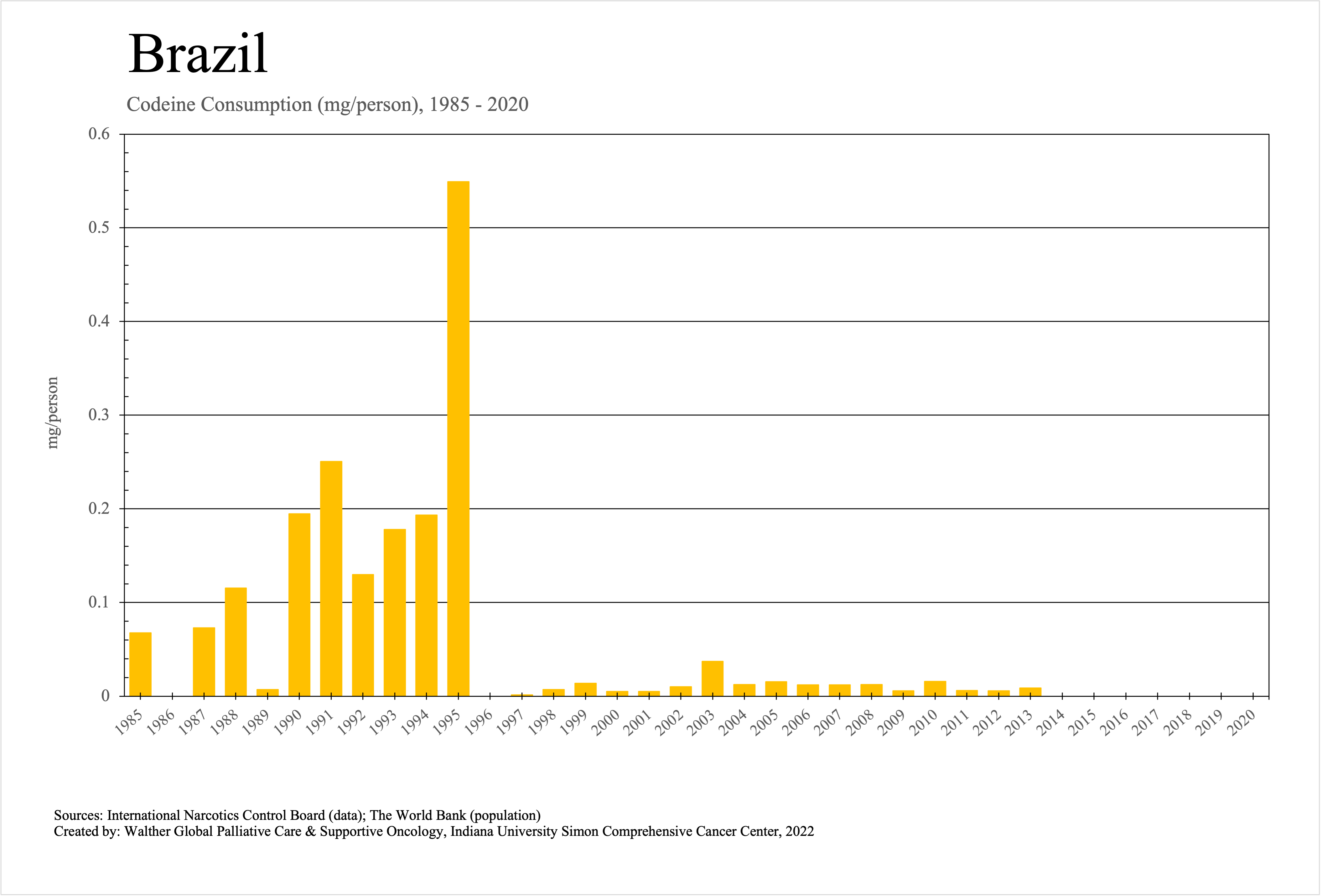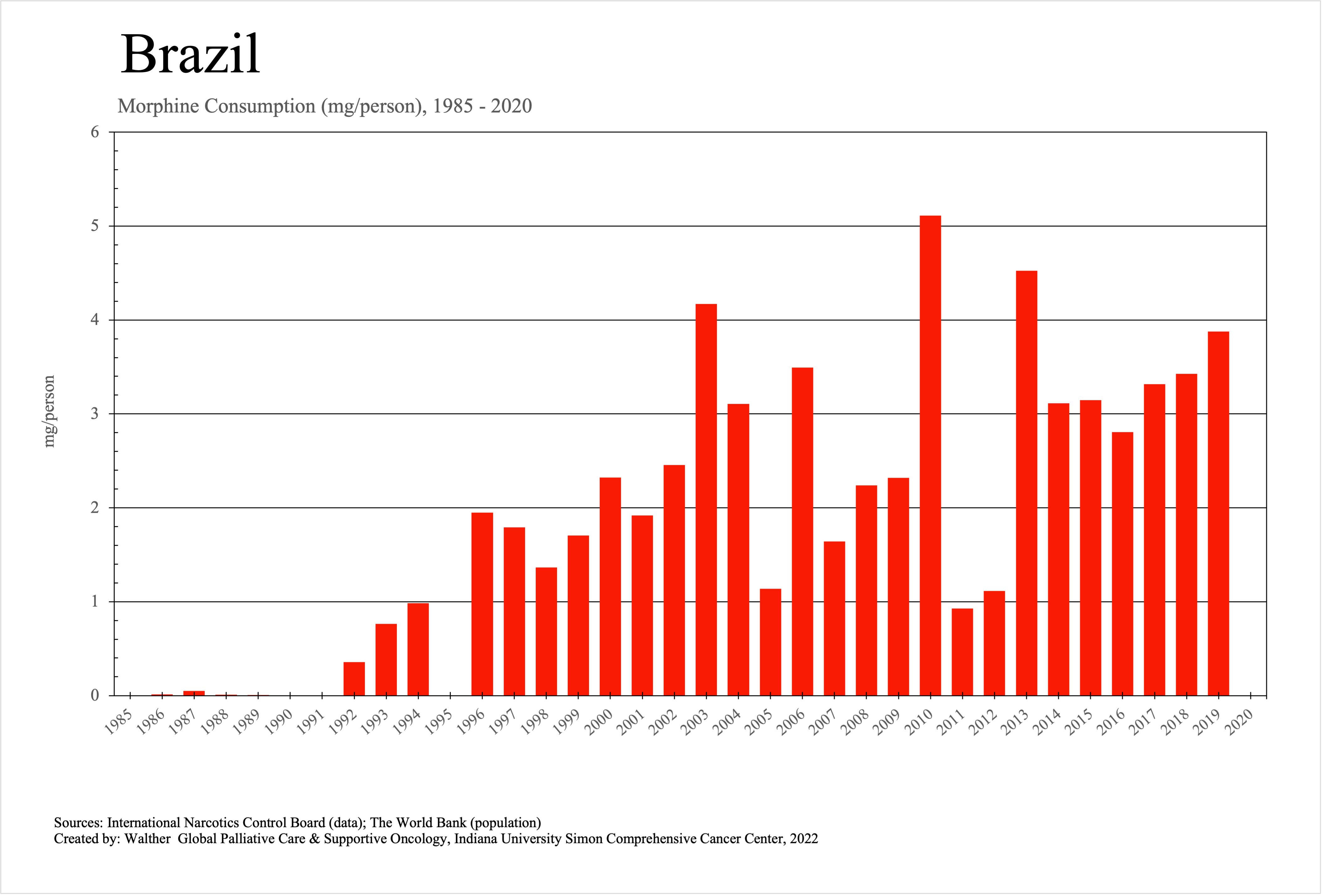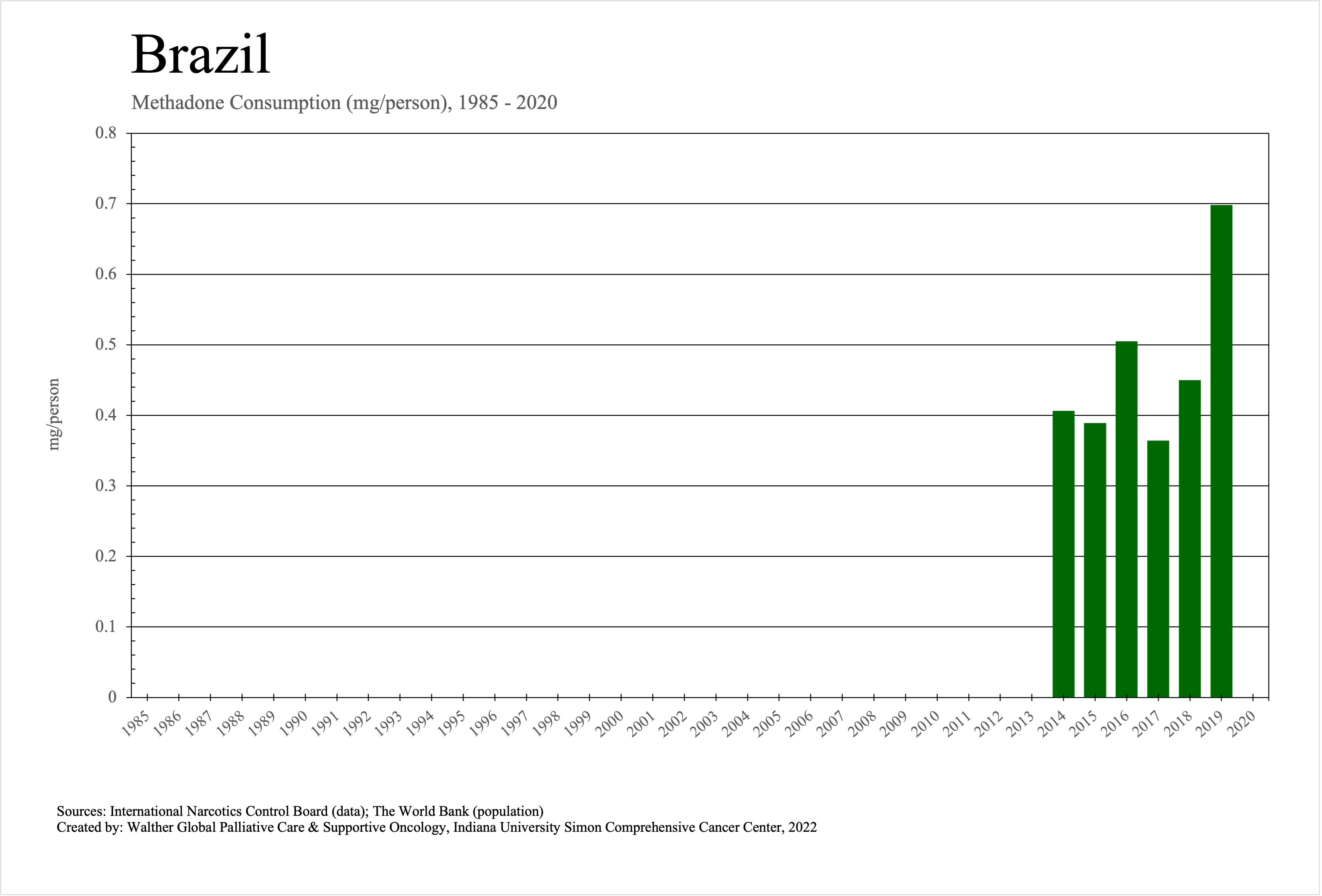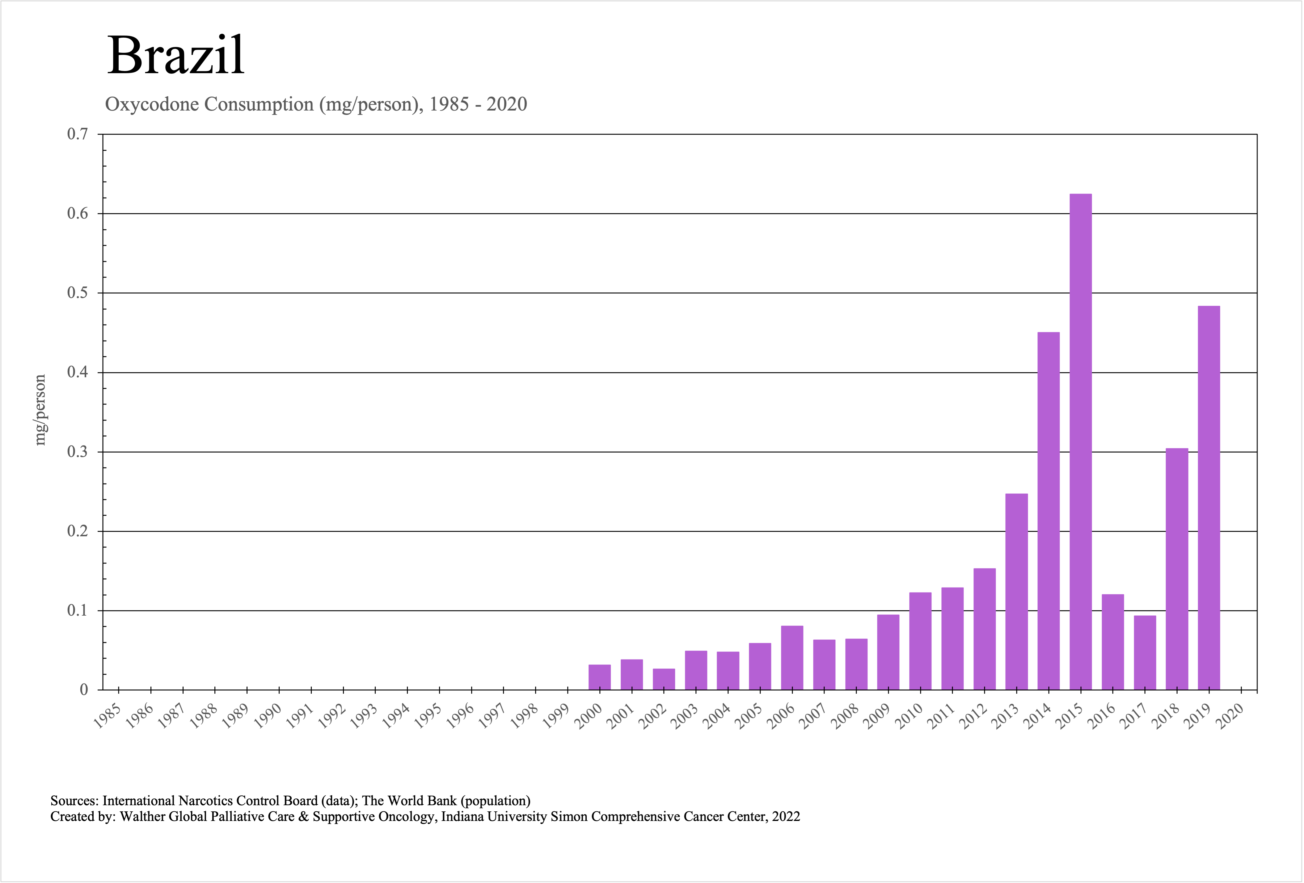 The graphs below provide the Essential Controlled Medicines consumption data trends from 1985 to 2020 in milligrams per capita and Morphine Equivalence (ME) milligrams per capita, as reported to the International Narcotics Control Board (INCB).