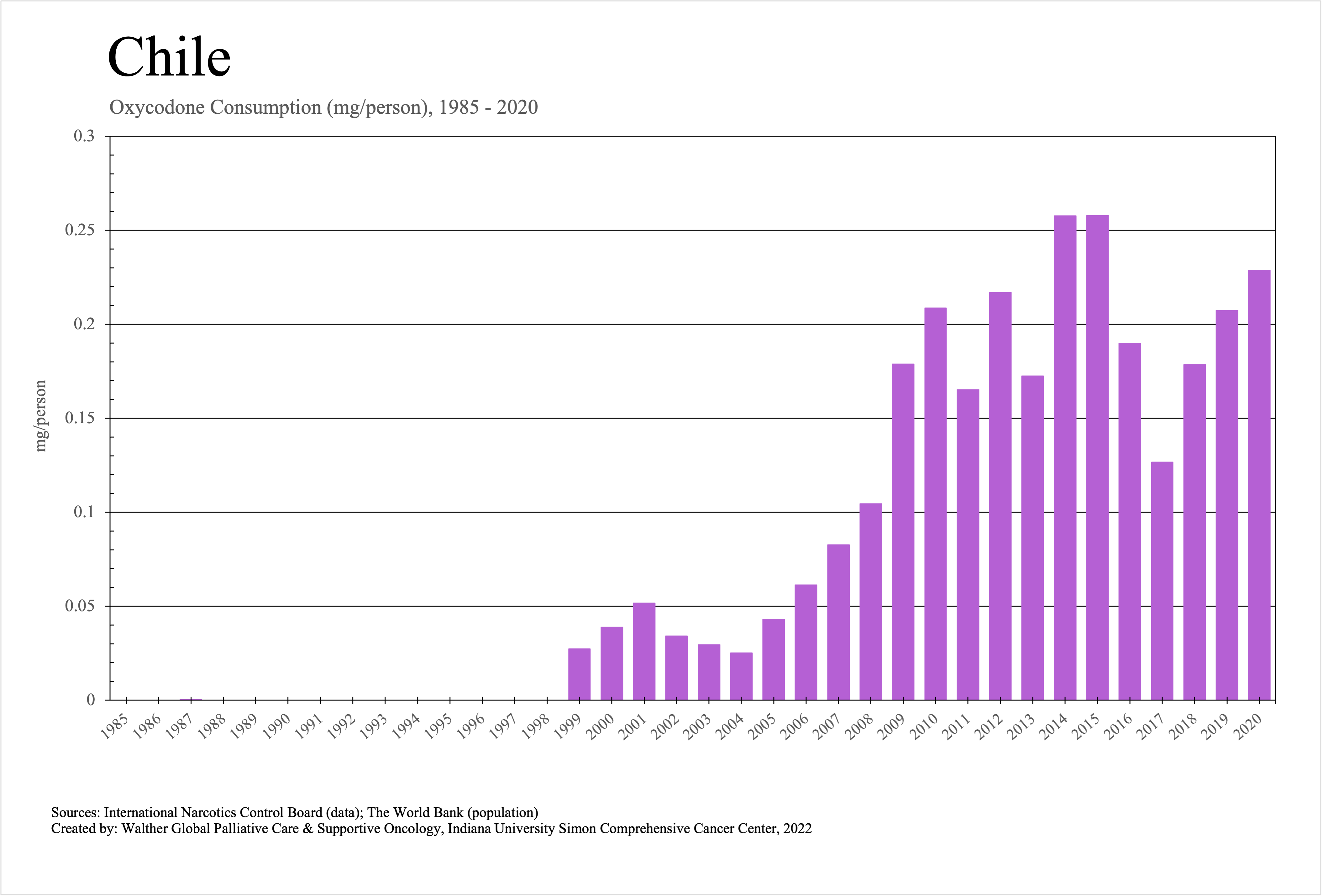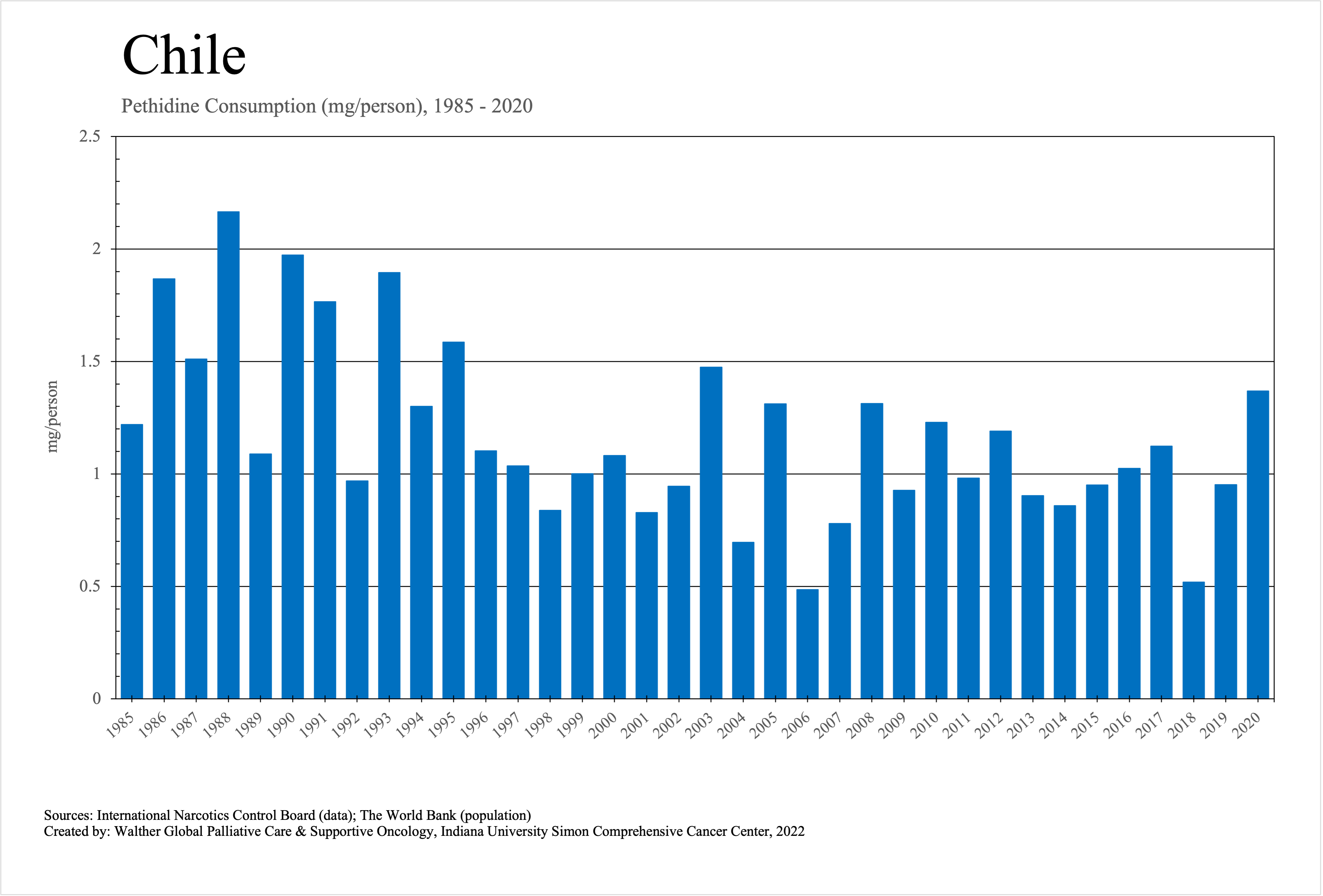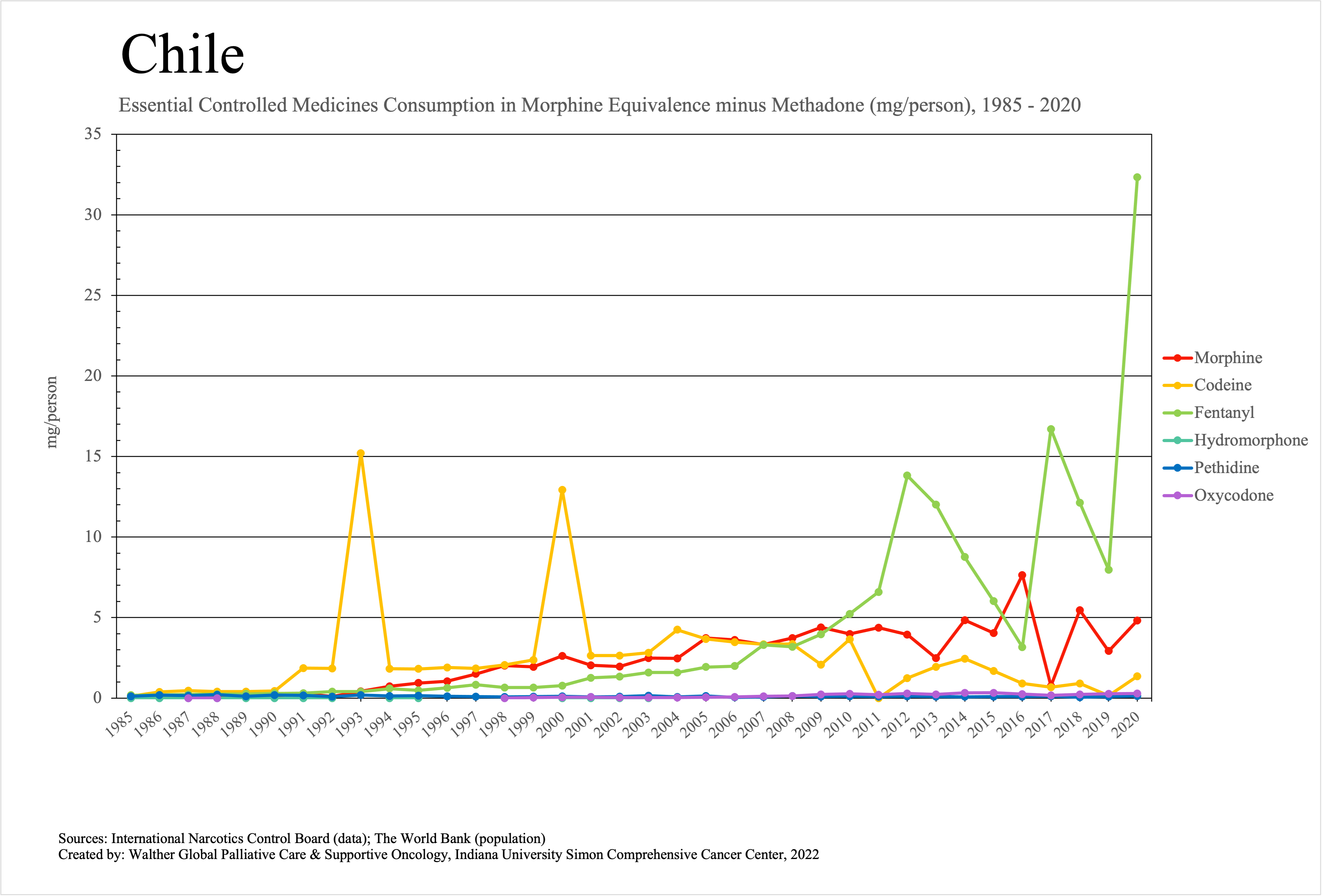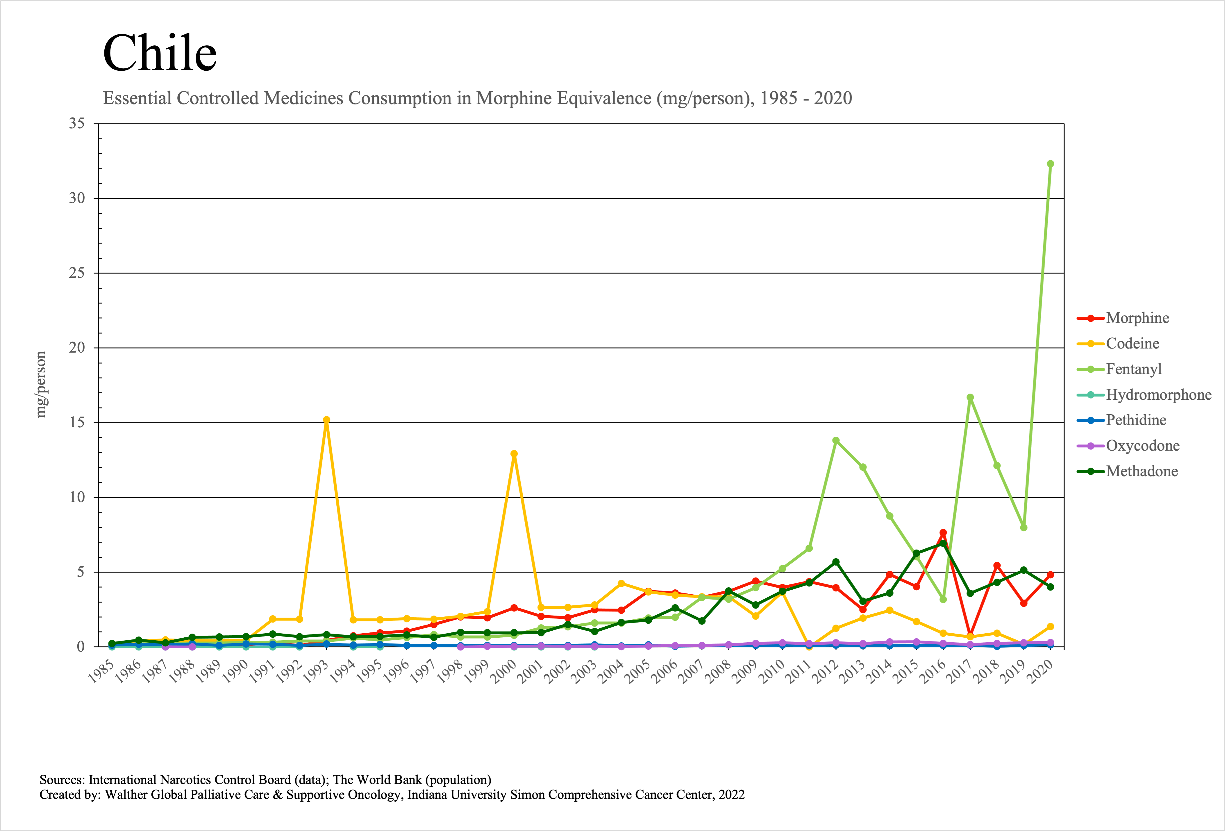 The graphs below provide the Essential Controlled Medicines consumption data trends from 1985 to 2020 in milligrams per capita and Morphine Equivalence (ME) milligrams per capita, as reported to the International Narcotics Control Board (INCB).