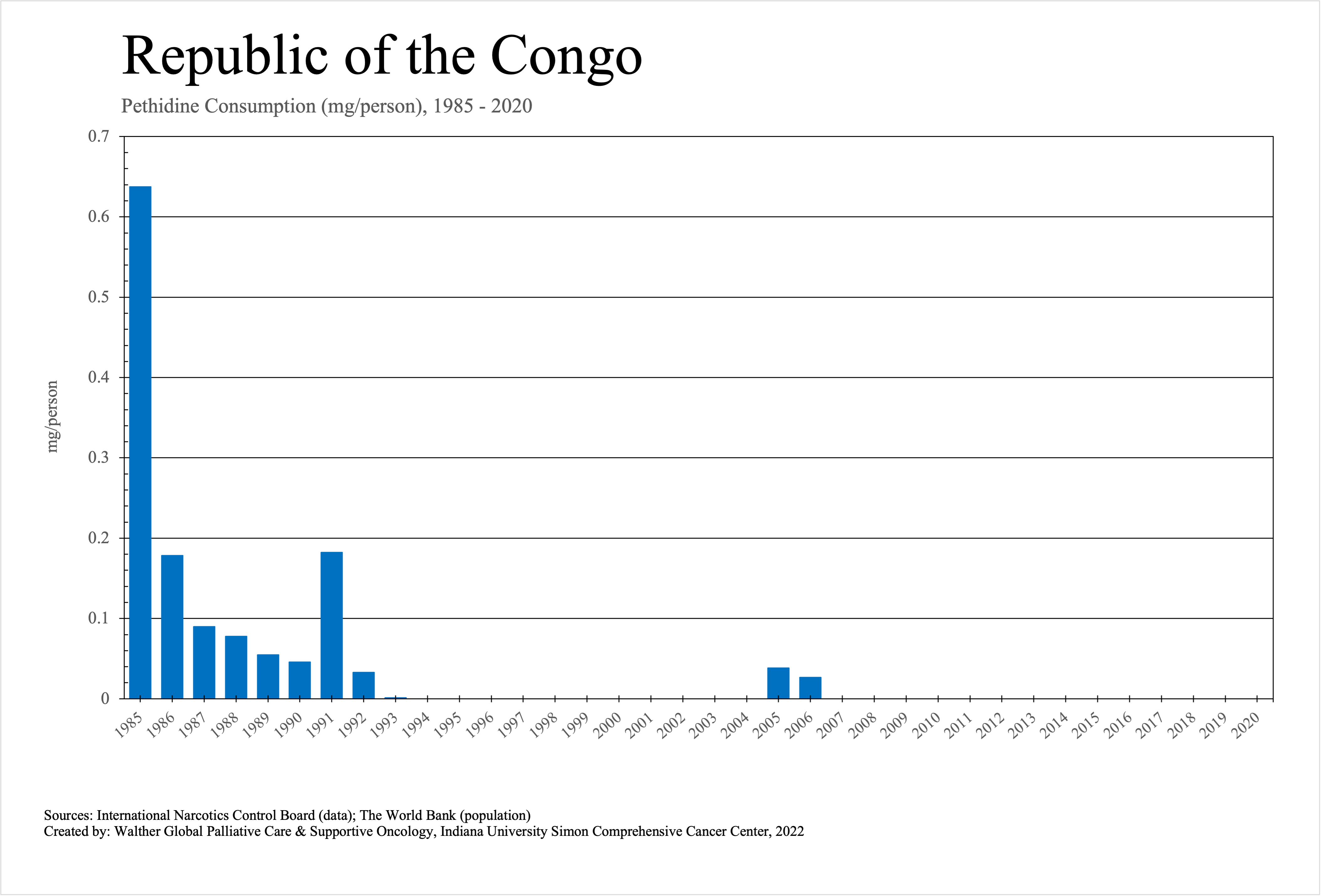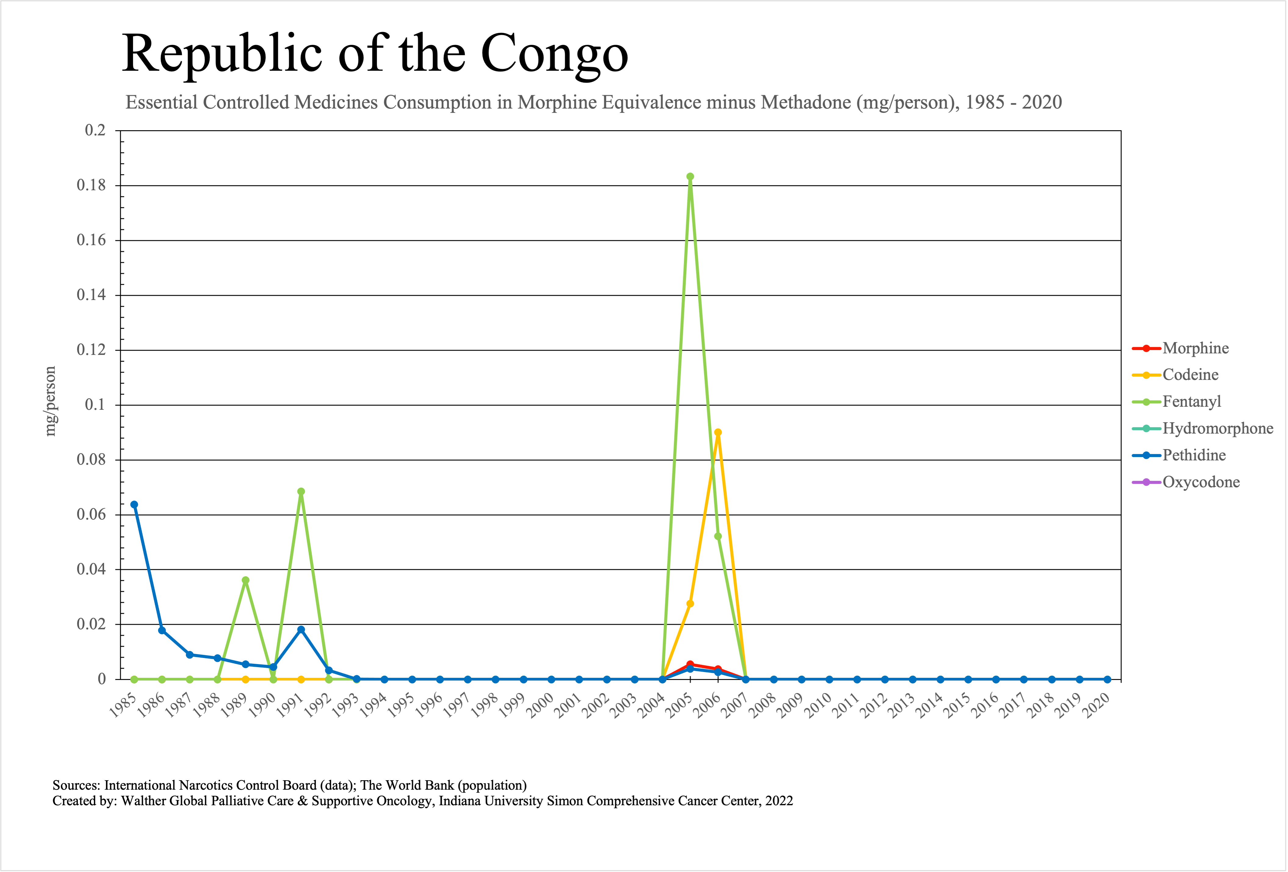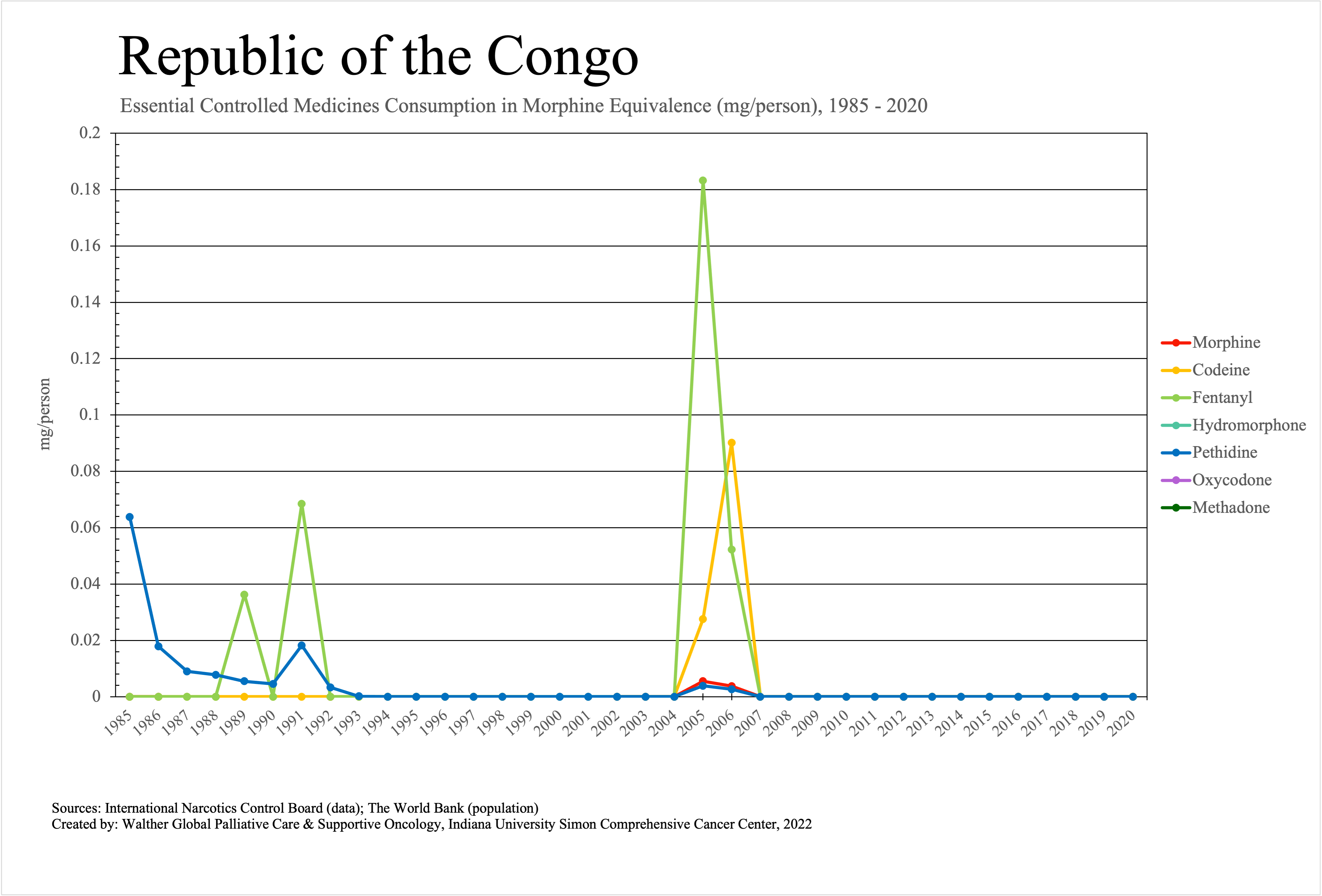 The graphs below provide the Essential Controlled Medicines consumption data trends from 1985 to 2020 in milligrams per capita and Morphine Equivalence (ME) milligrams per capita, as reported to the International Narcotics Control Board (INCB).