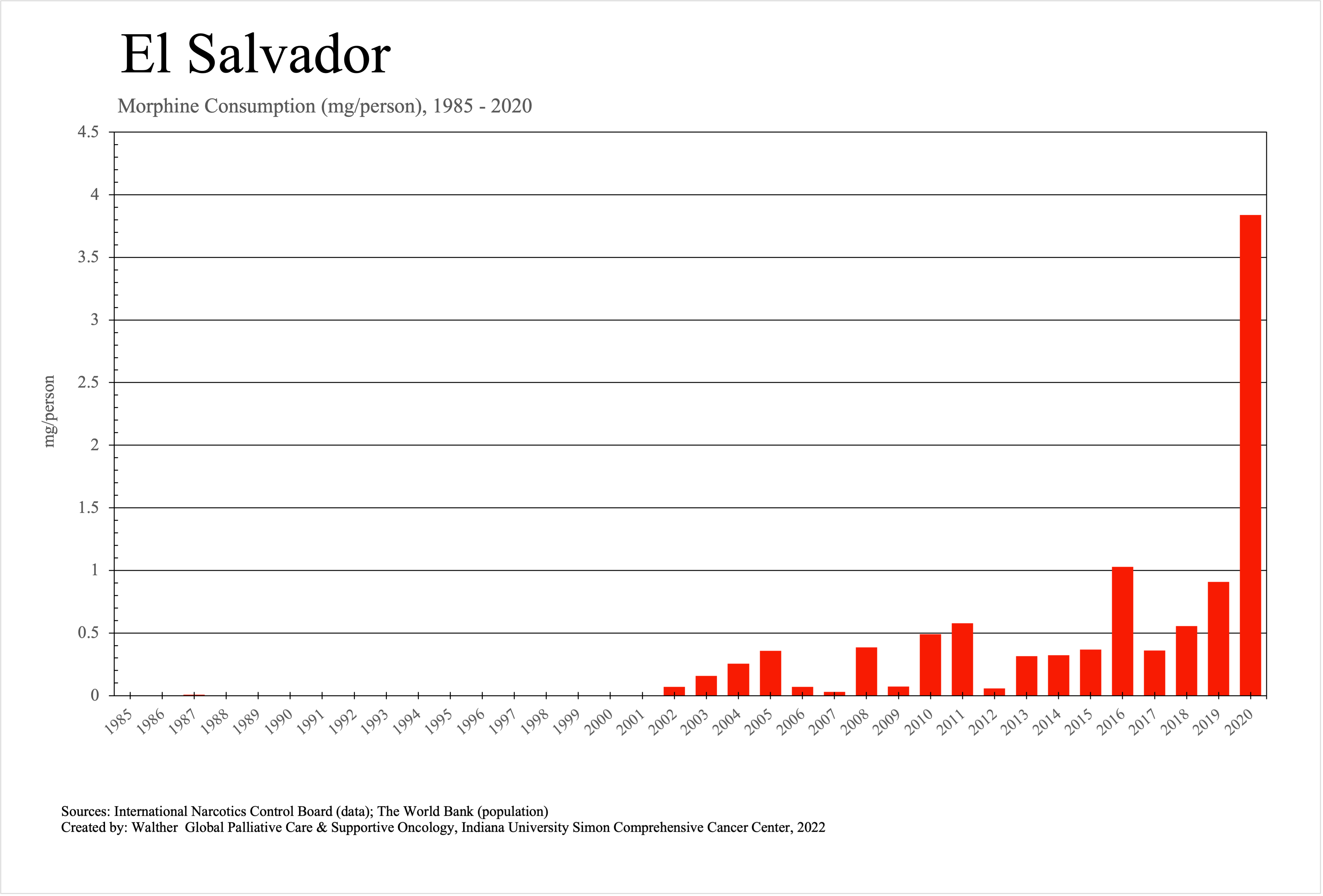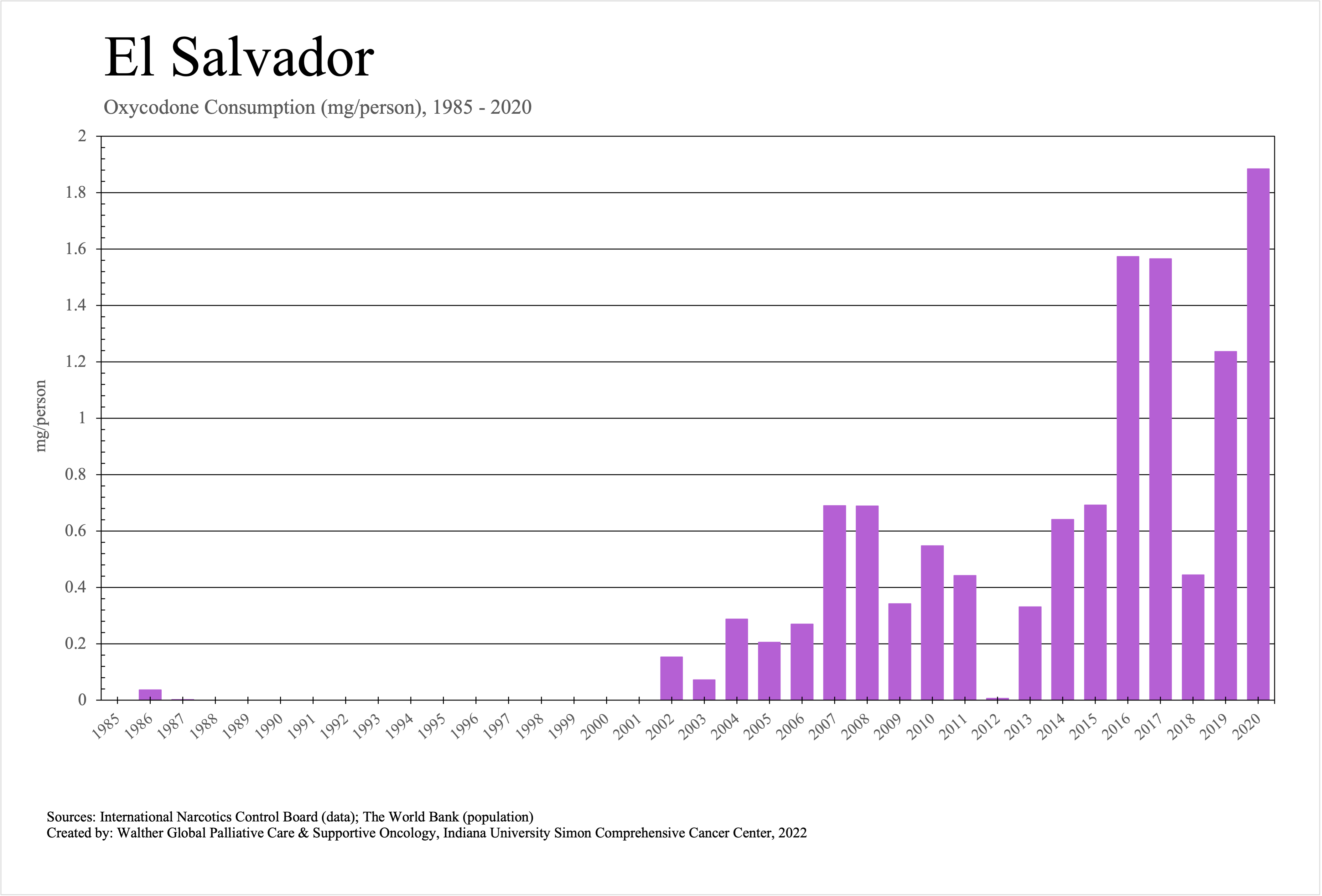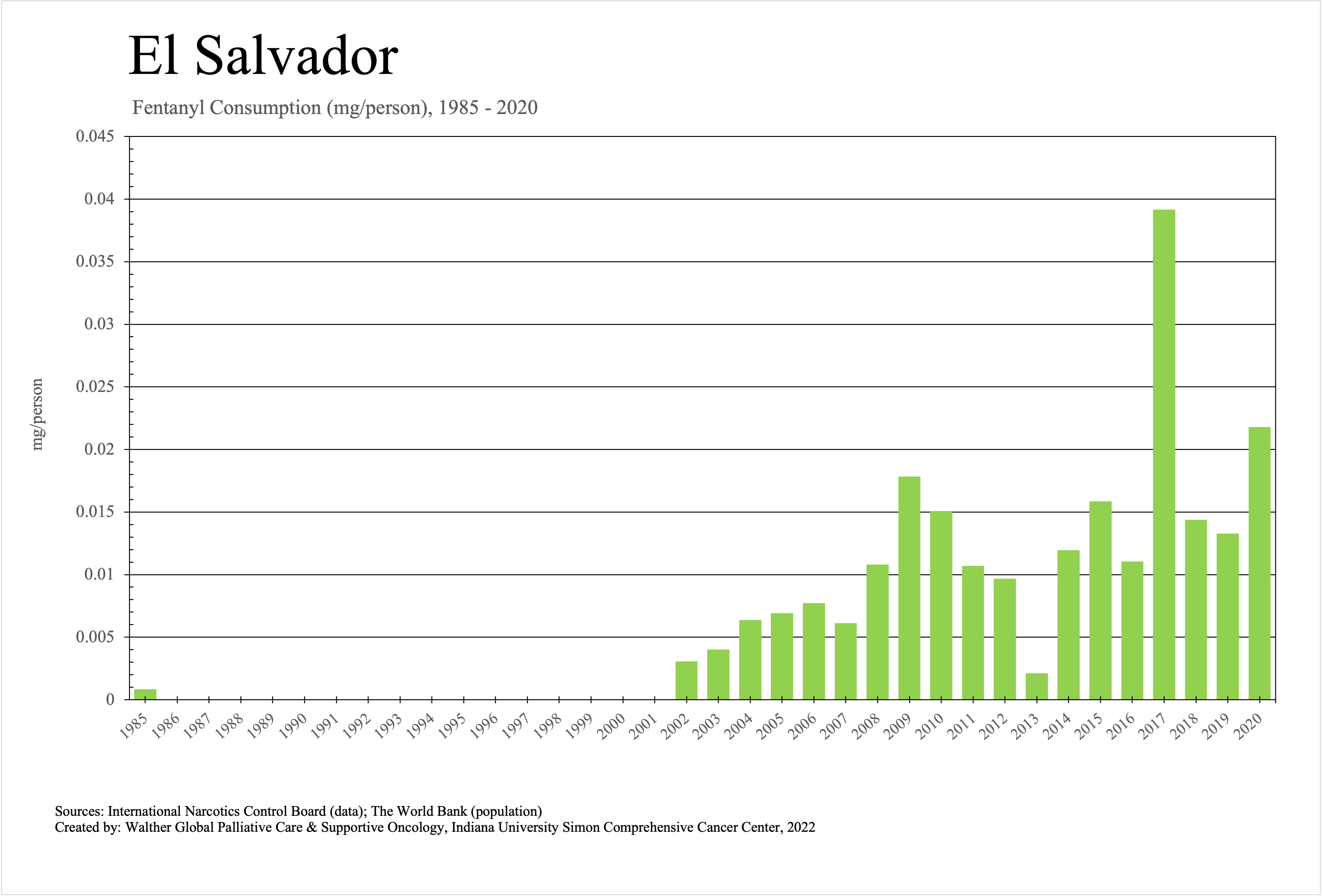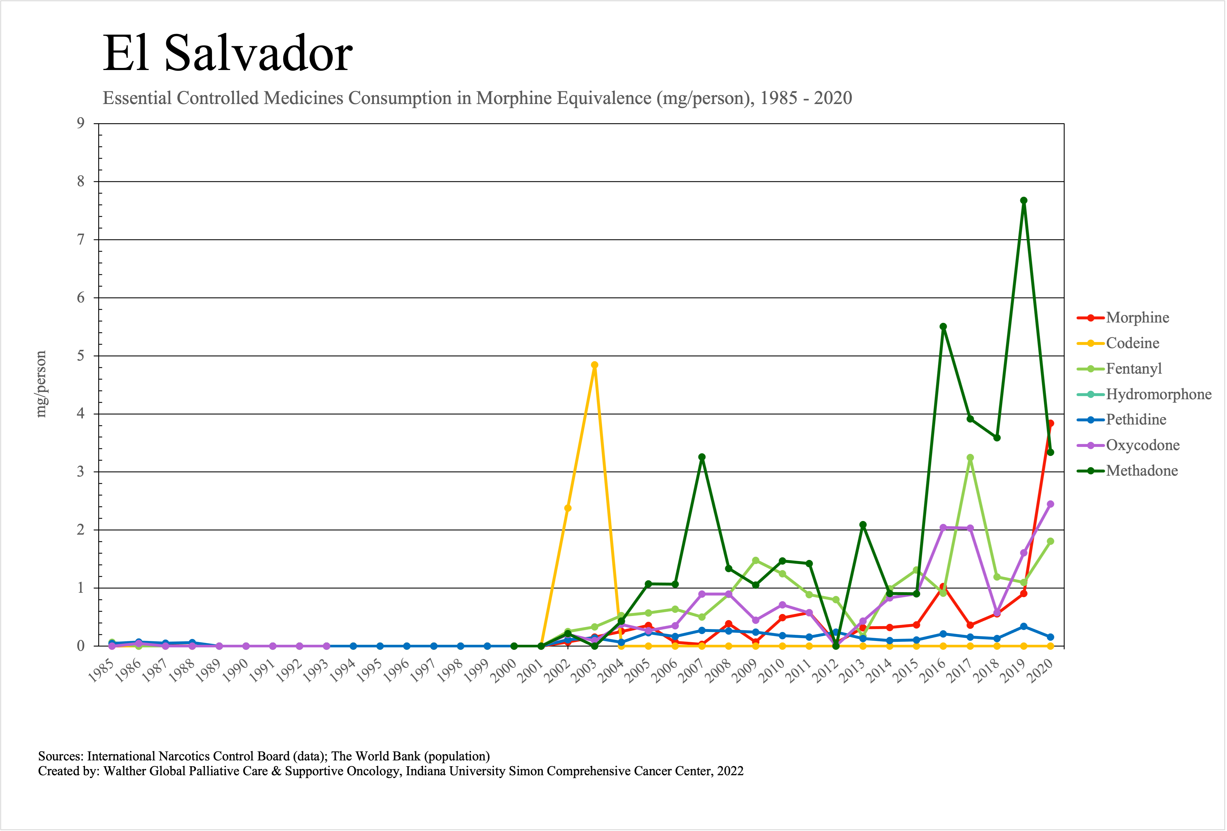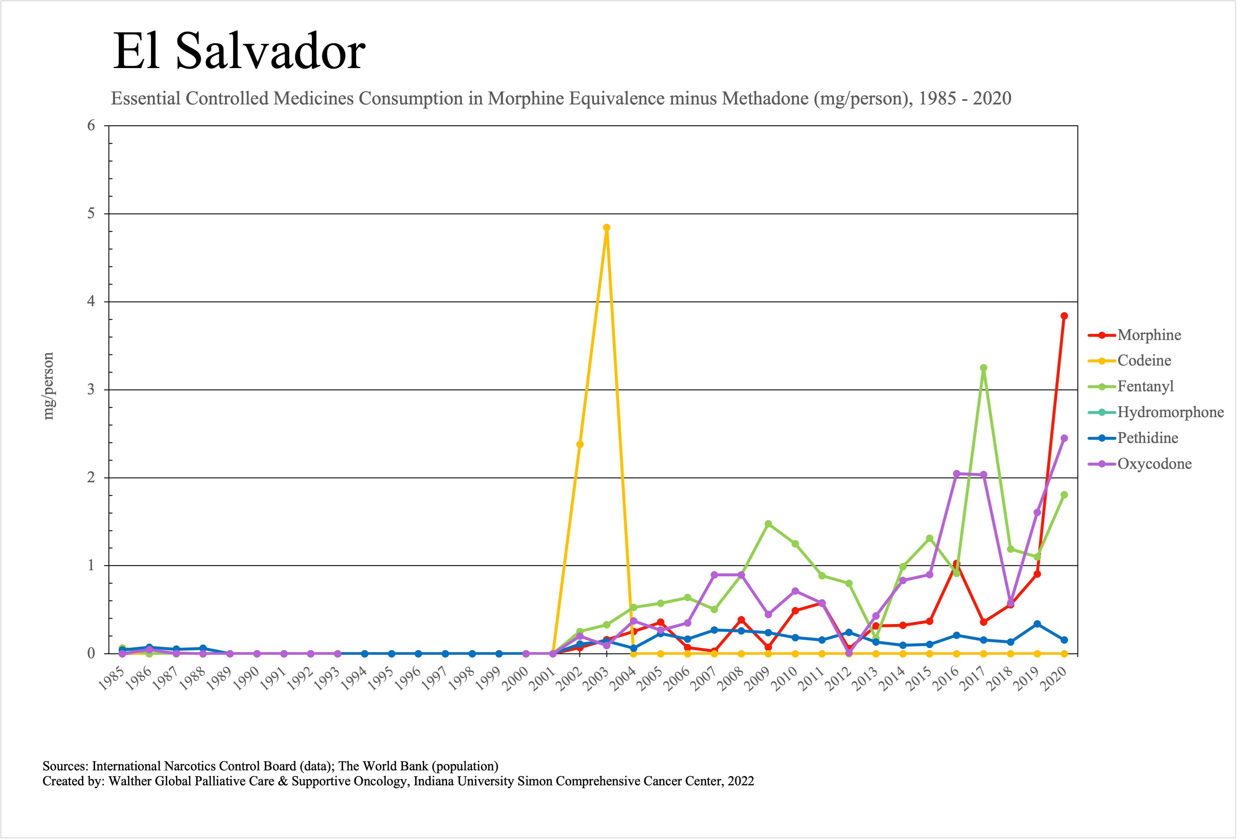 The graphs below provide the Essential Controlled Medicines consumption data trends from 1985 to 2020 in milligrams per capita and Morphine Equivalence (ME) milligrams per capita, as reported to the International Narcotics Control Board (INCB).