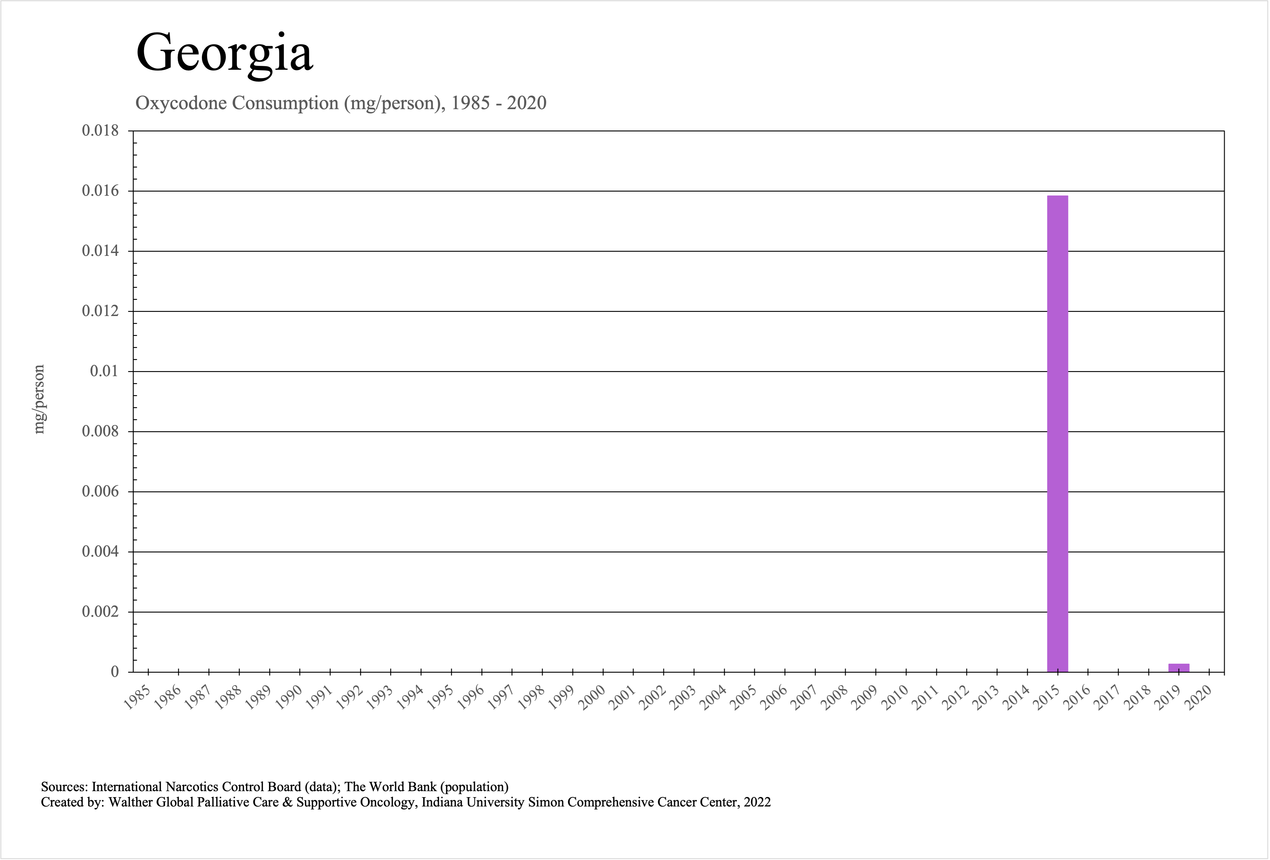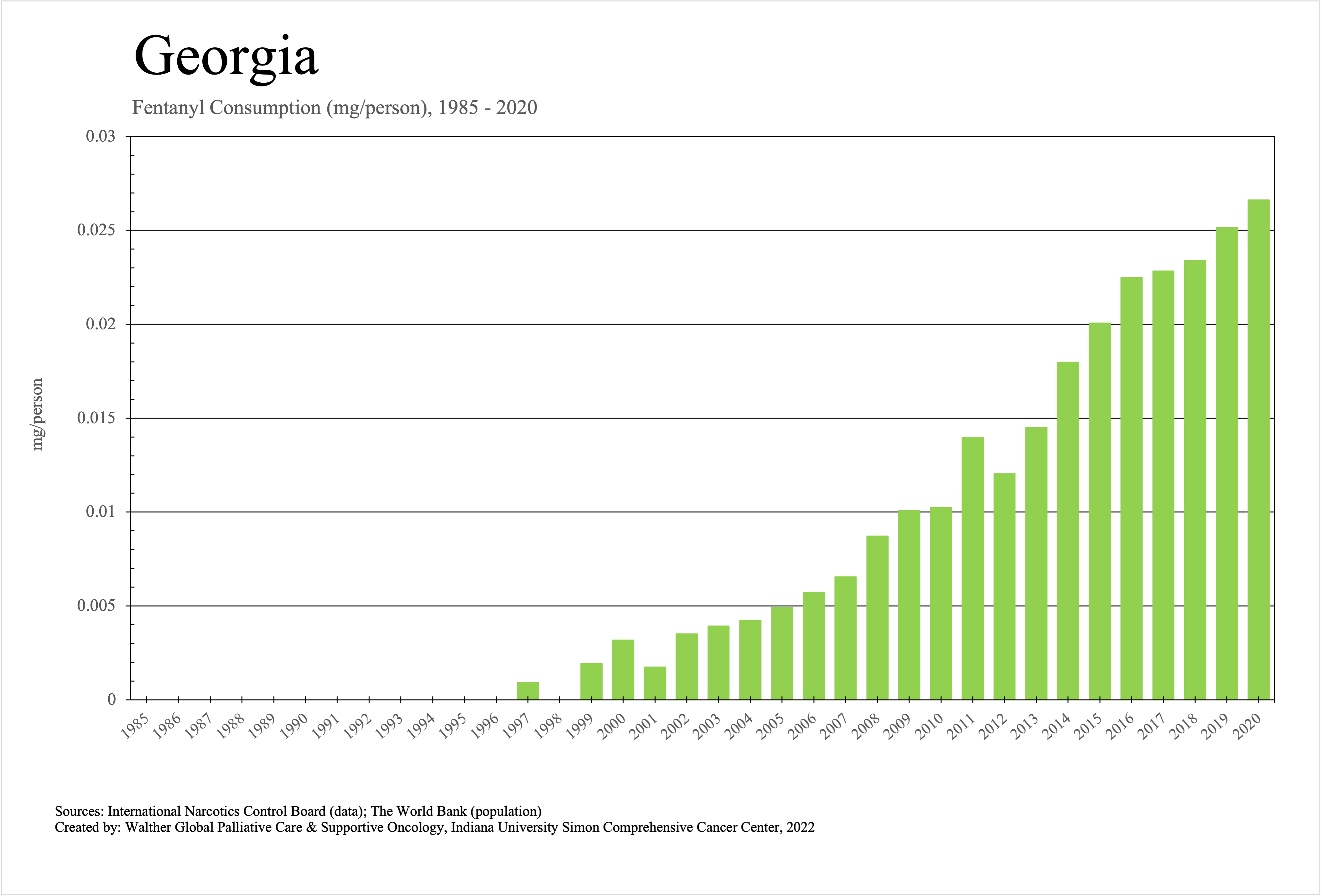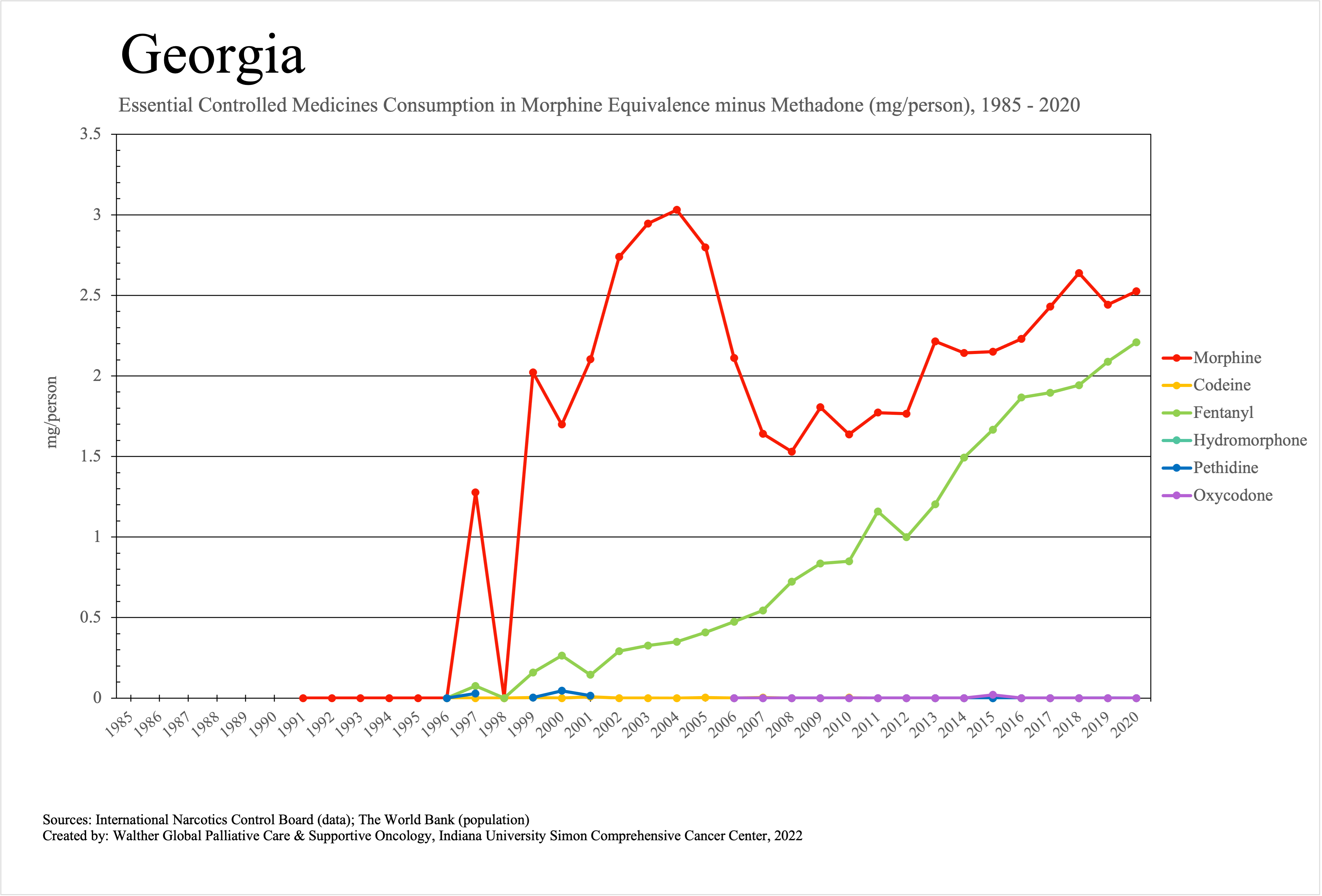 The graphs below provide the Essential Controlled Medicines consumption data trends from 1985 to 2020 in milligrams per capita and Morphine Equivalence (ME) milligrams per capita, as reported to the International Narcotics Control Board (INCB).