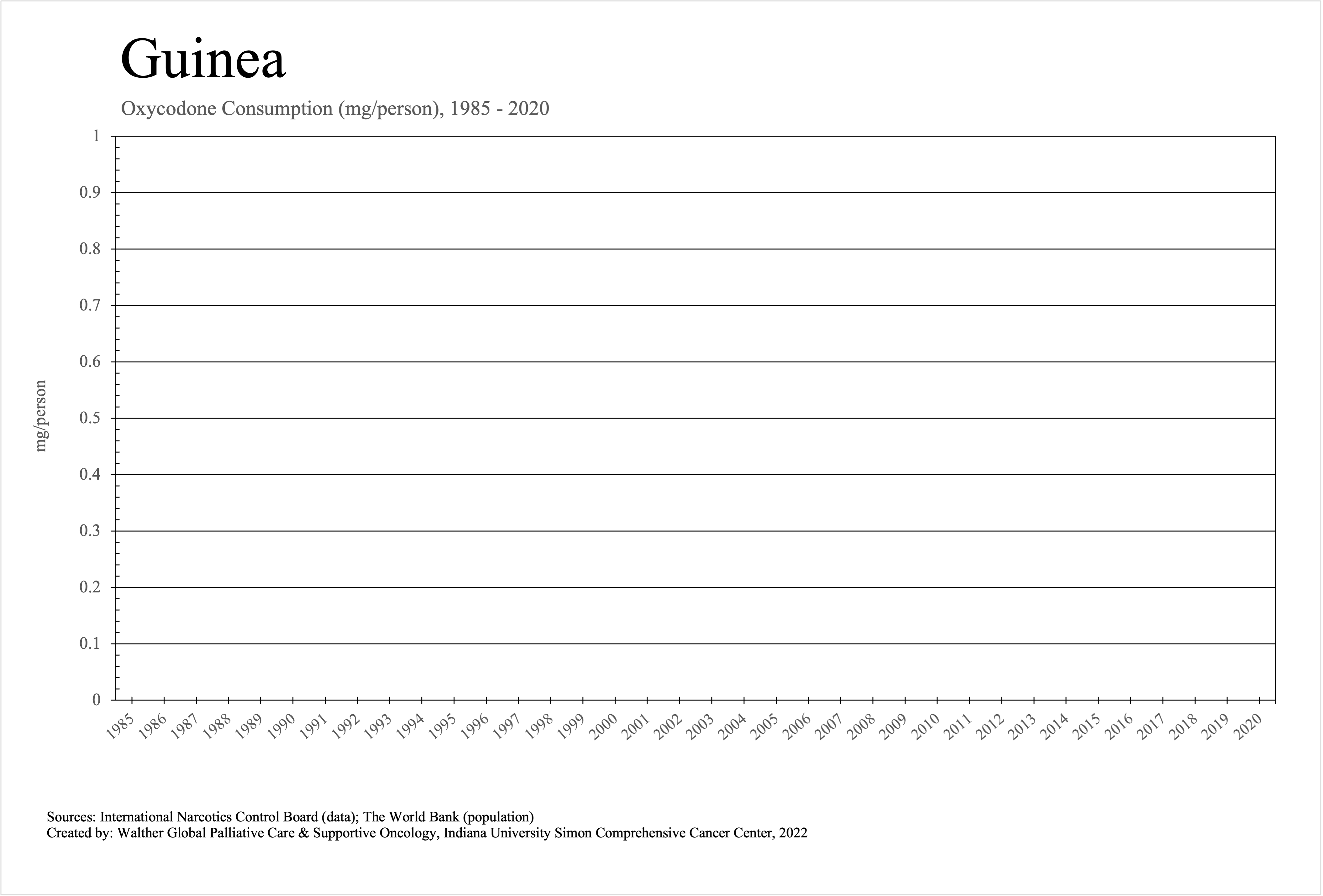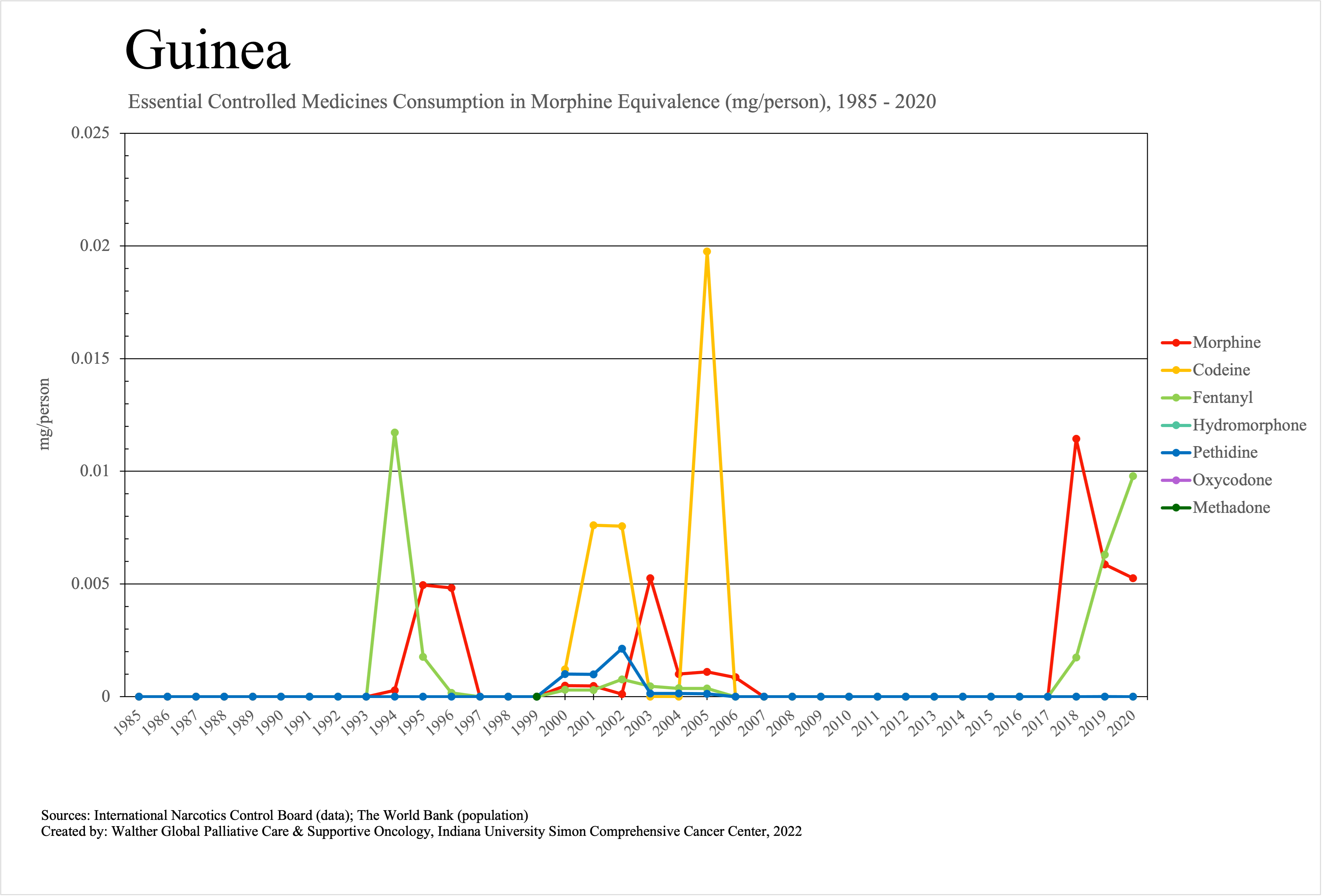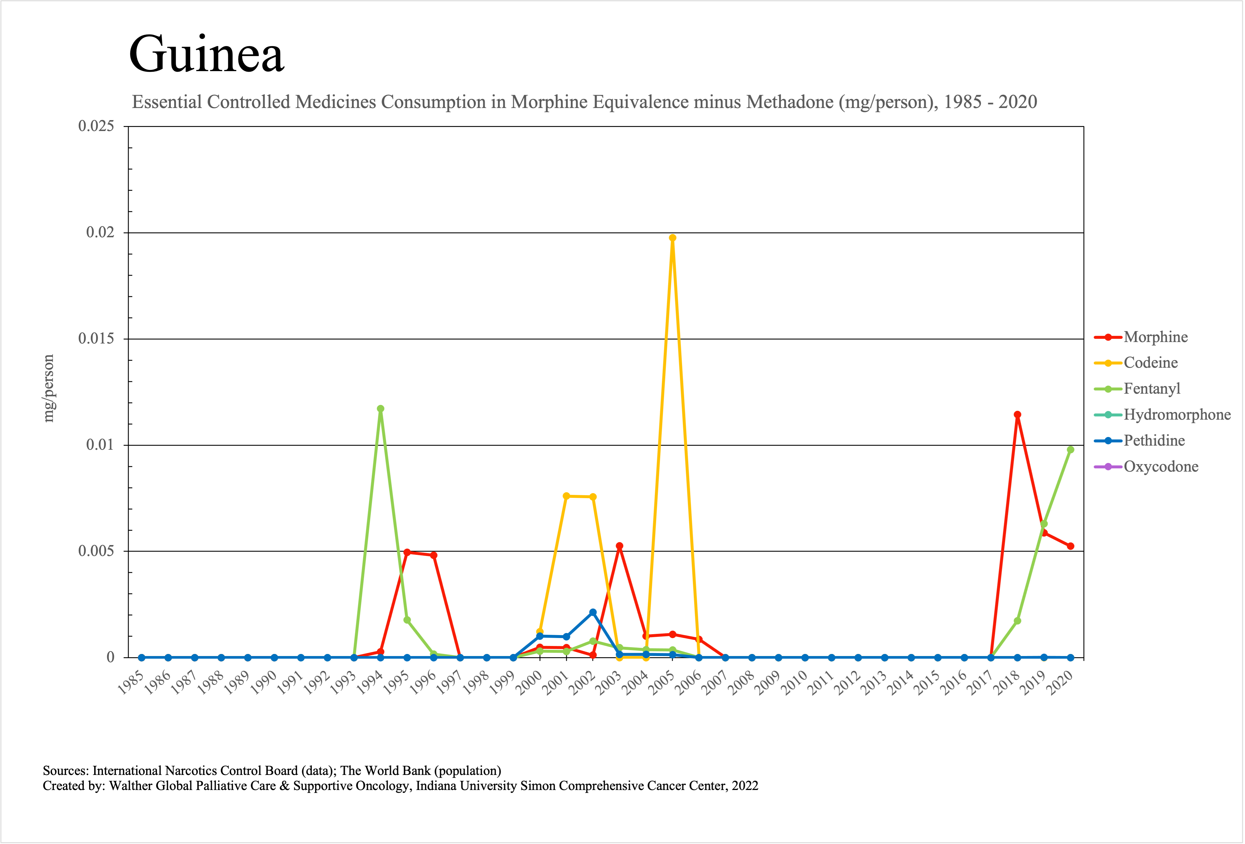 The graphs below provide the Essential Controlled Medicines consumption data trends from 1985 to 2020 in milligrams per capita and Morphine Equivalence (ME) milligrams per capita, as reported to the International Narcotics Control Board (INCB).