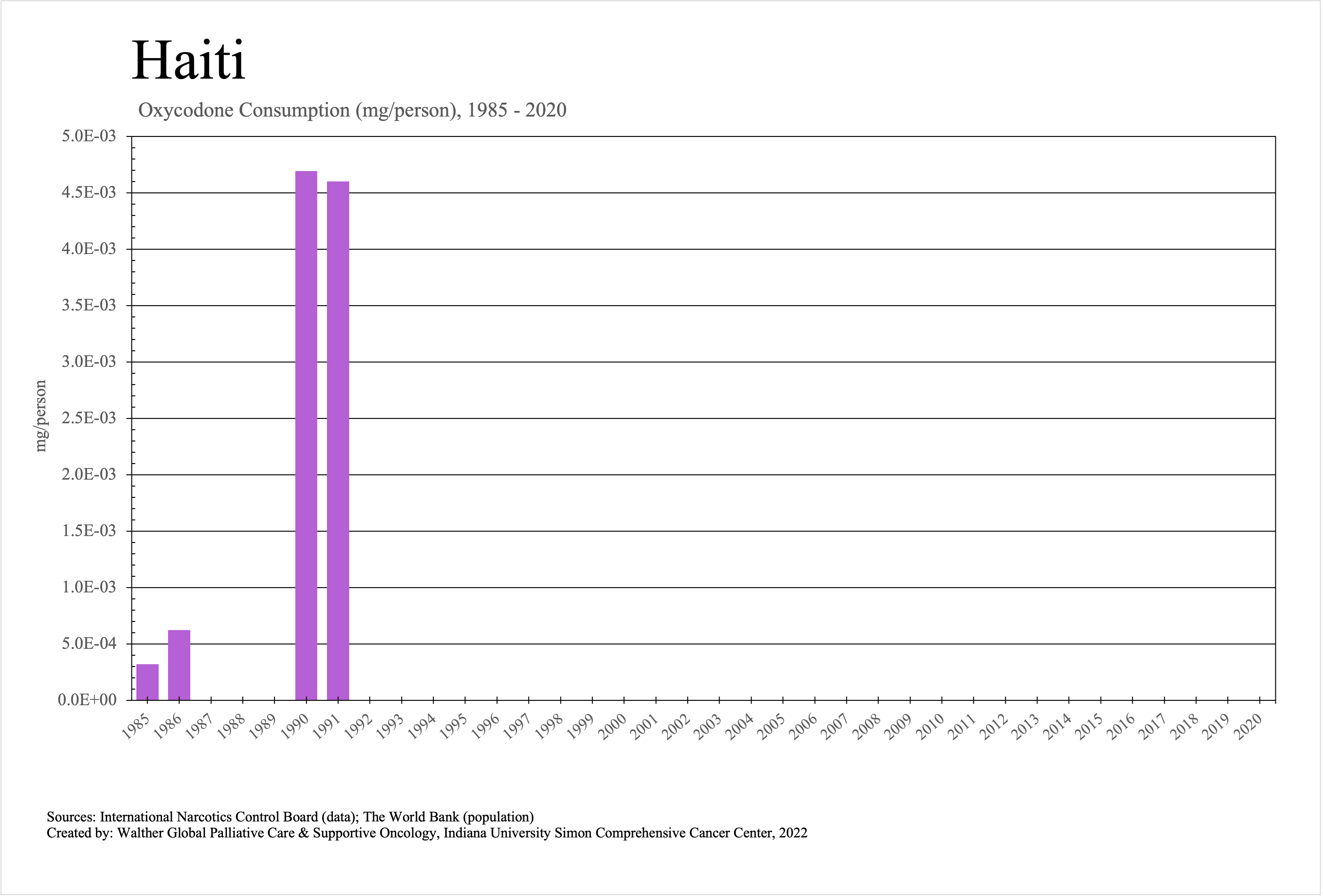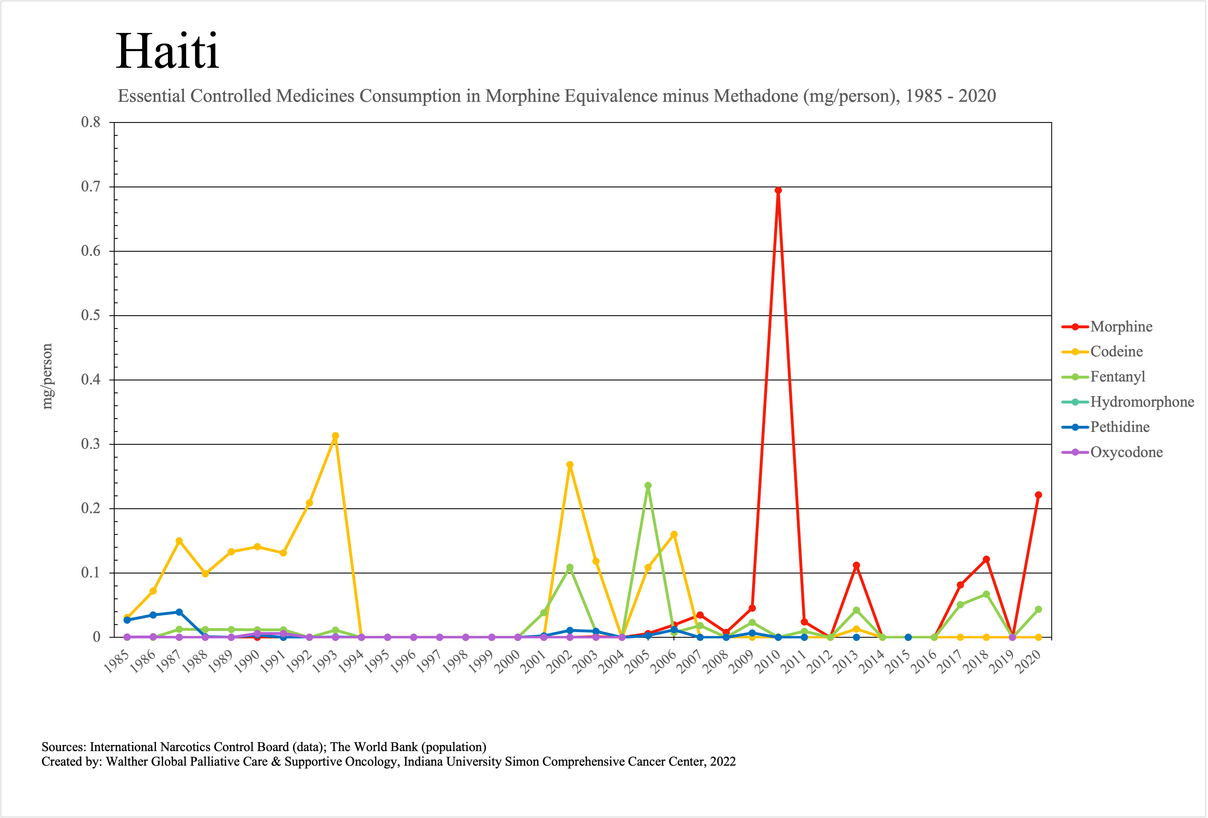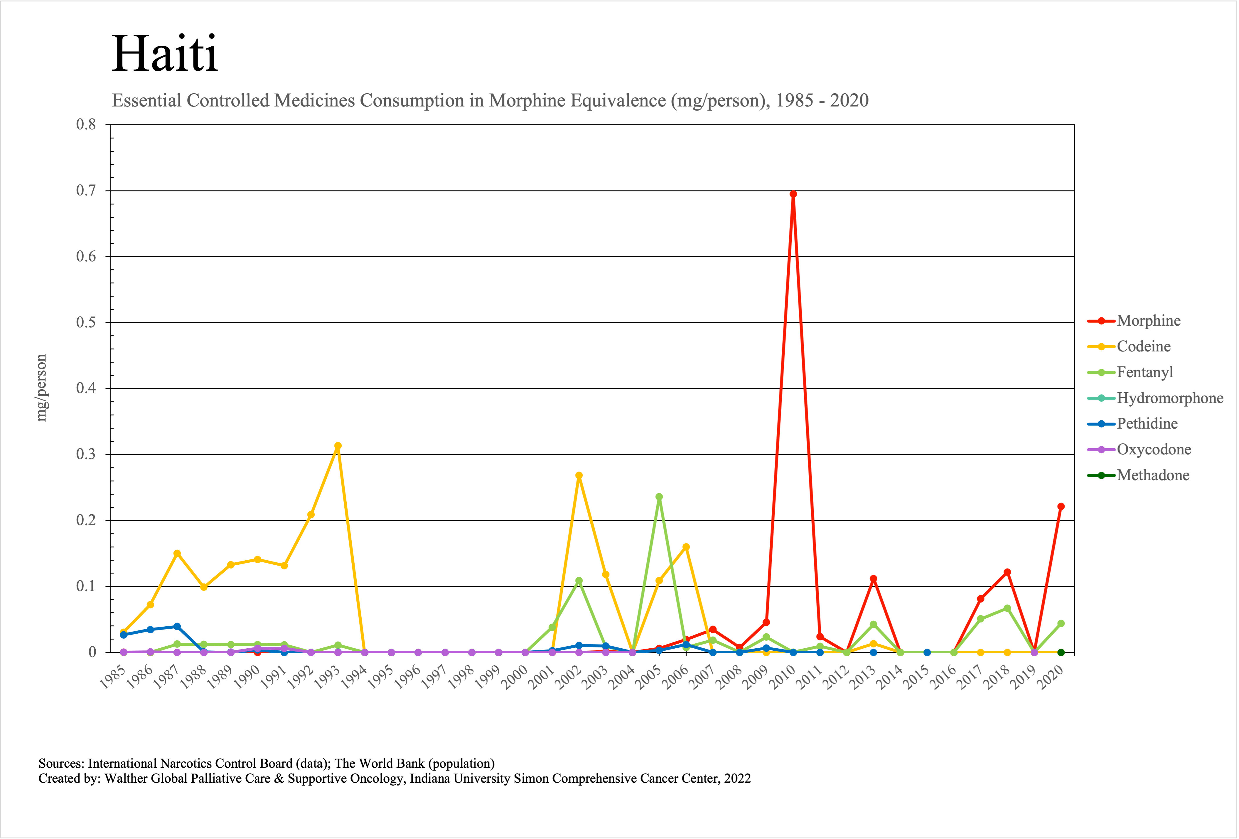 The graphs below provide the Essential Controlled Medicines consumption data trends from 1985 to 2020 in milligrams per capita and Morphine Equivalence (ME) milligrams per capita, as reported to the International Narcotics Control Board (INCB).