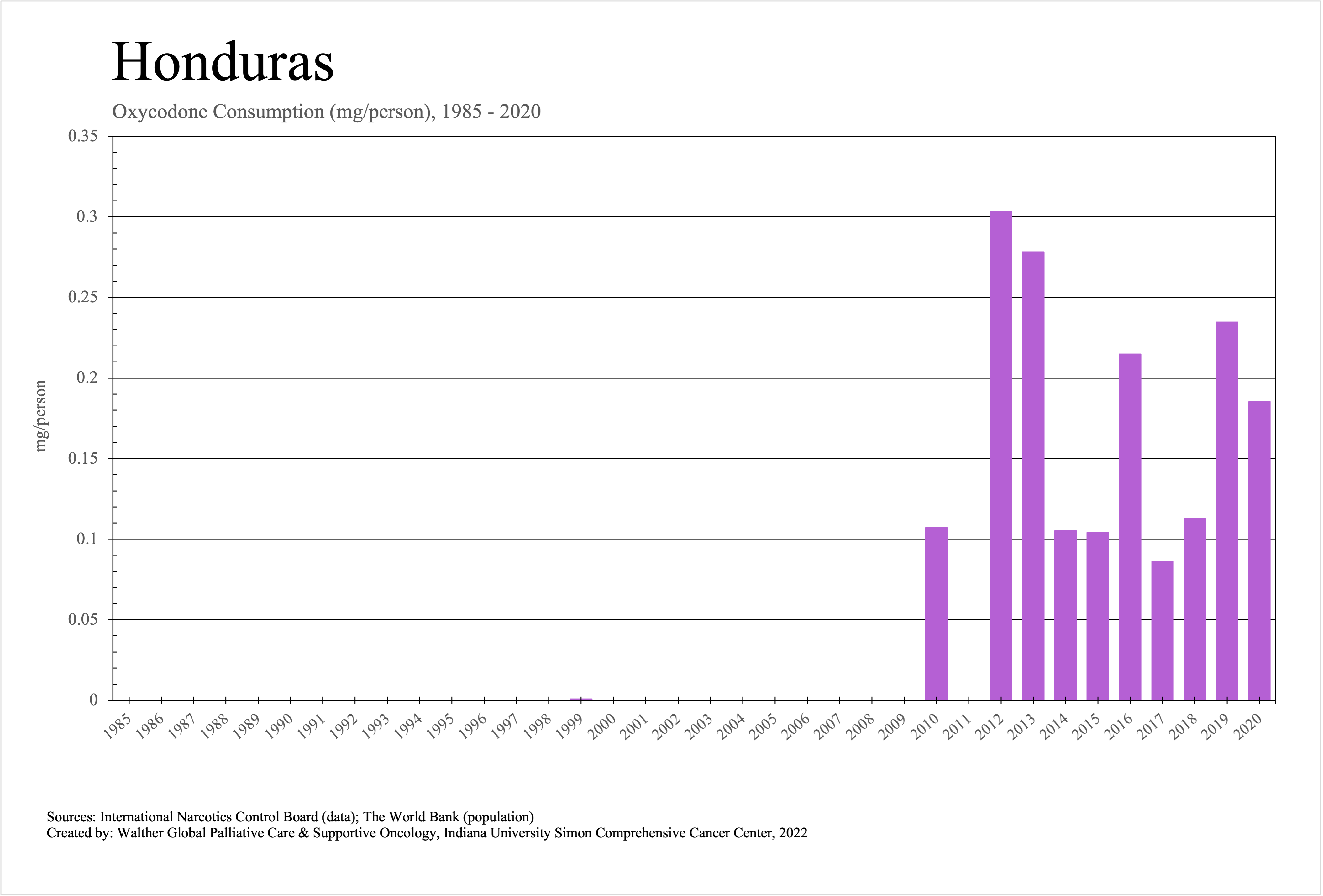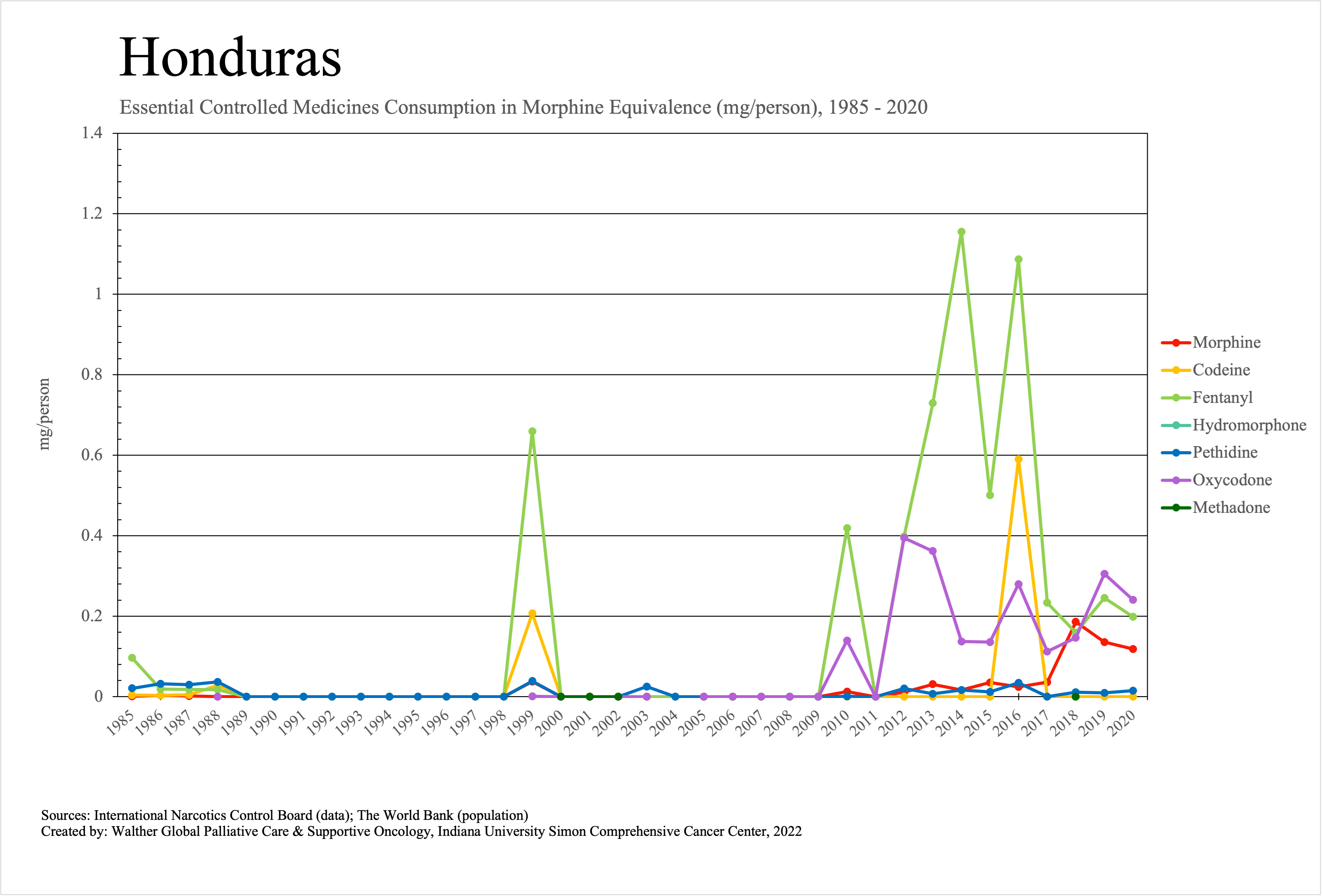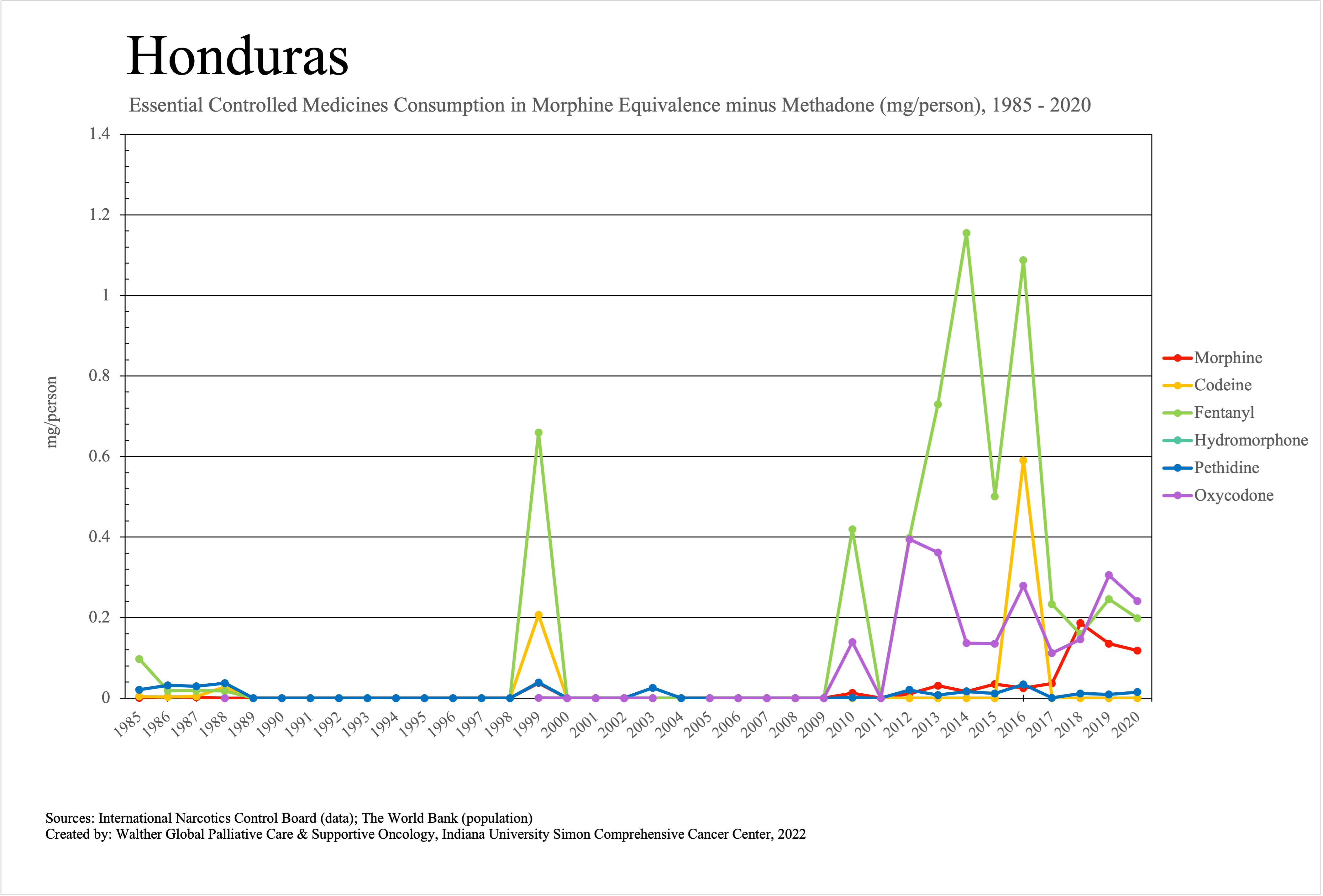The graphs below provide the Essential Controlled Medicines consumption data trends from 1985 to 2020 in milligrams per capita and Morphine Equivalence (ME) milligrams per capita, as reported to the International Narcotics Control Board (INCB).