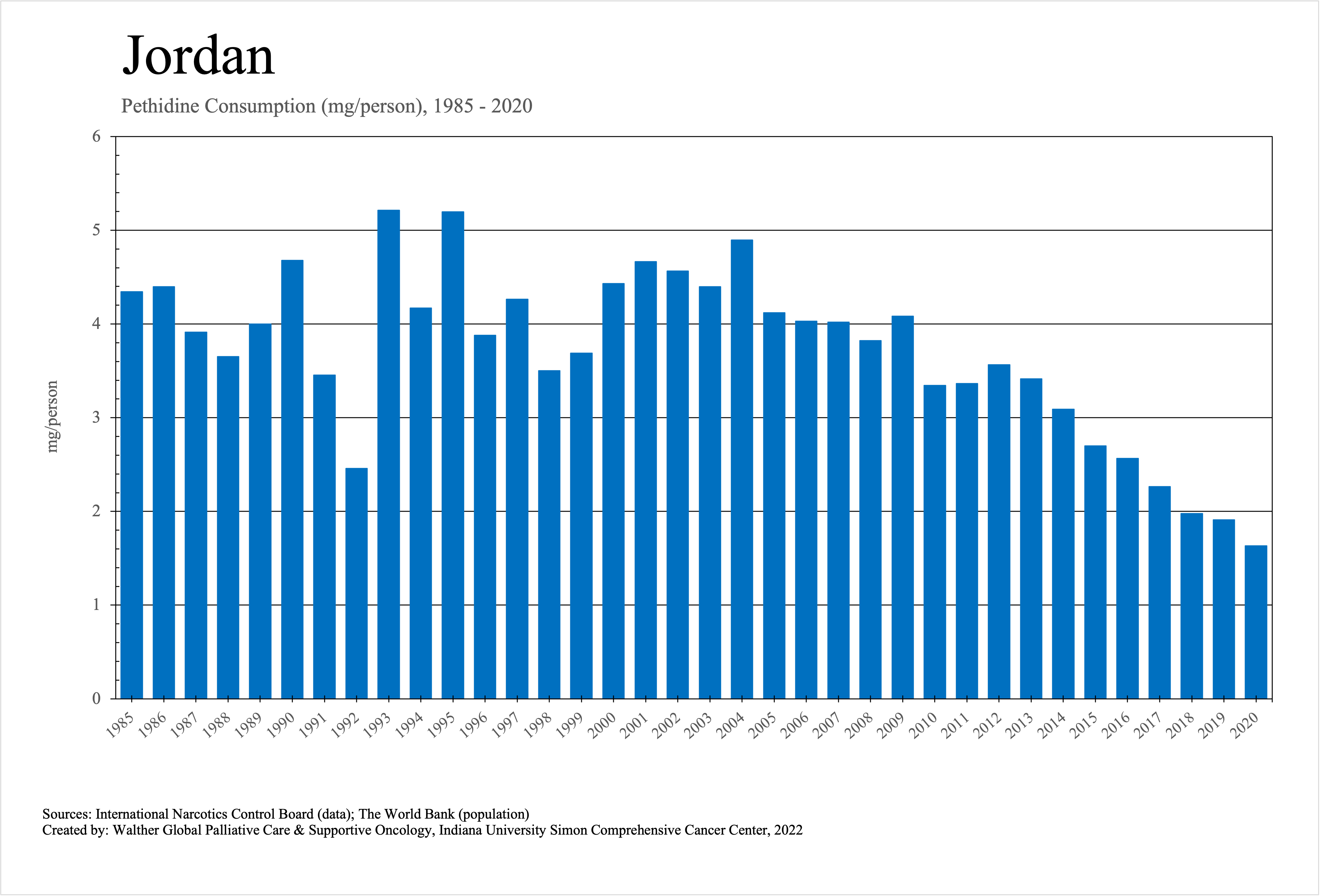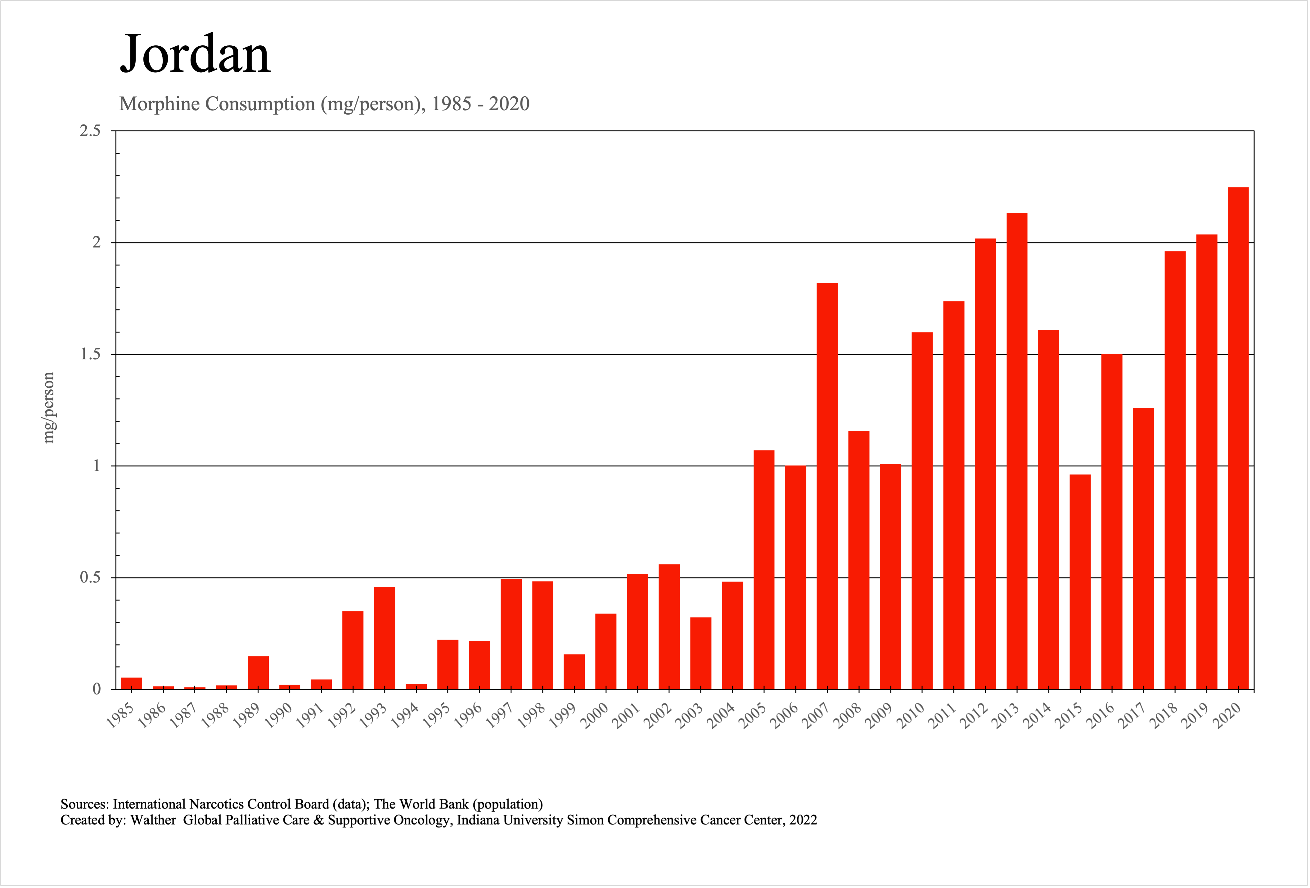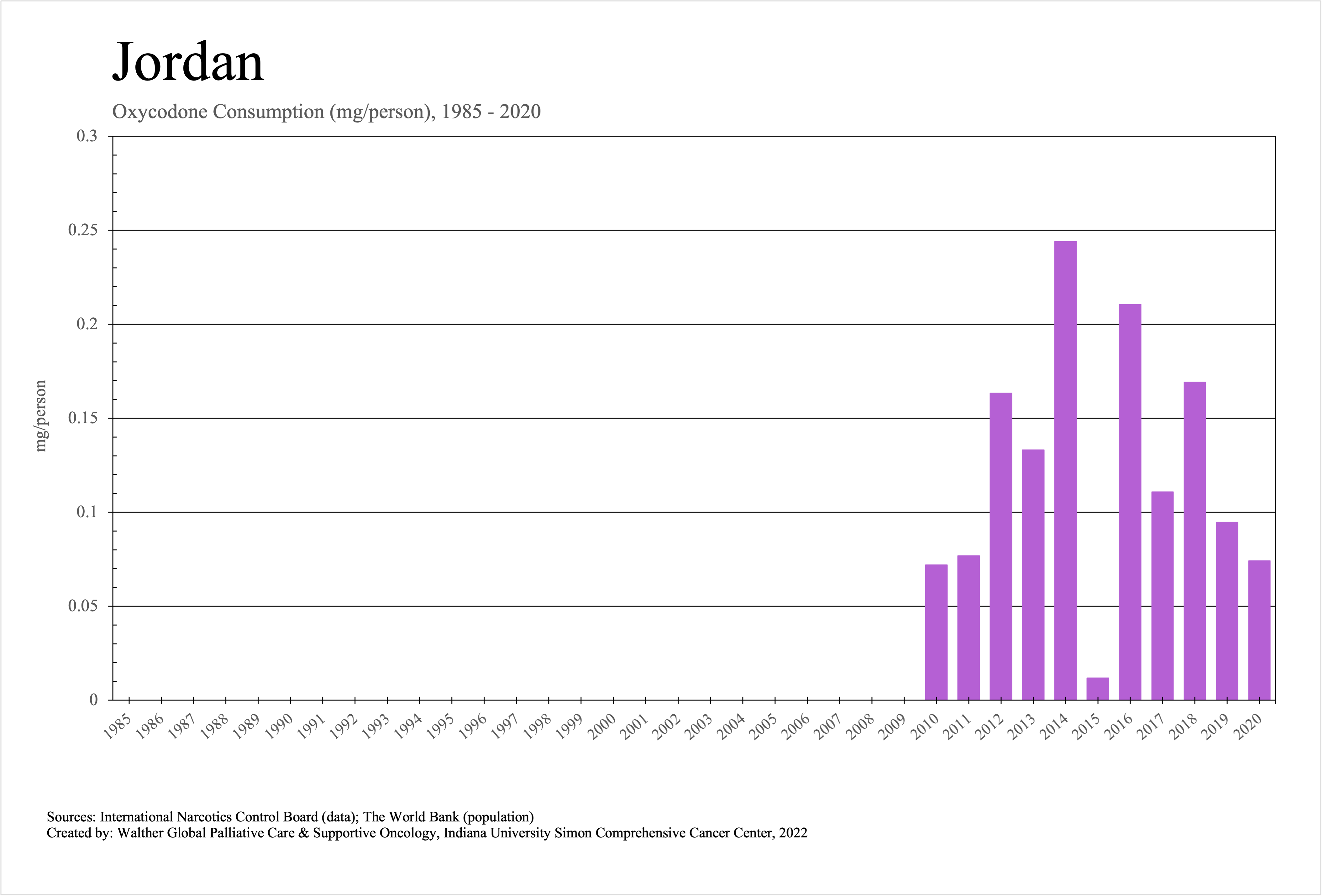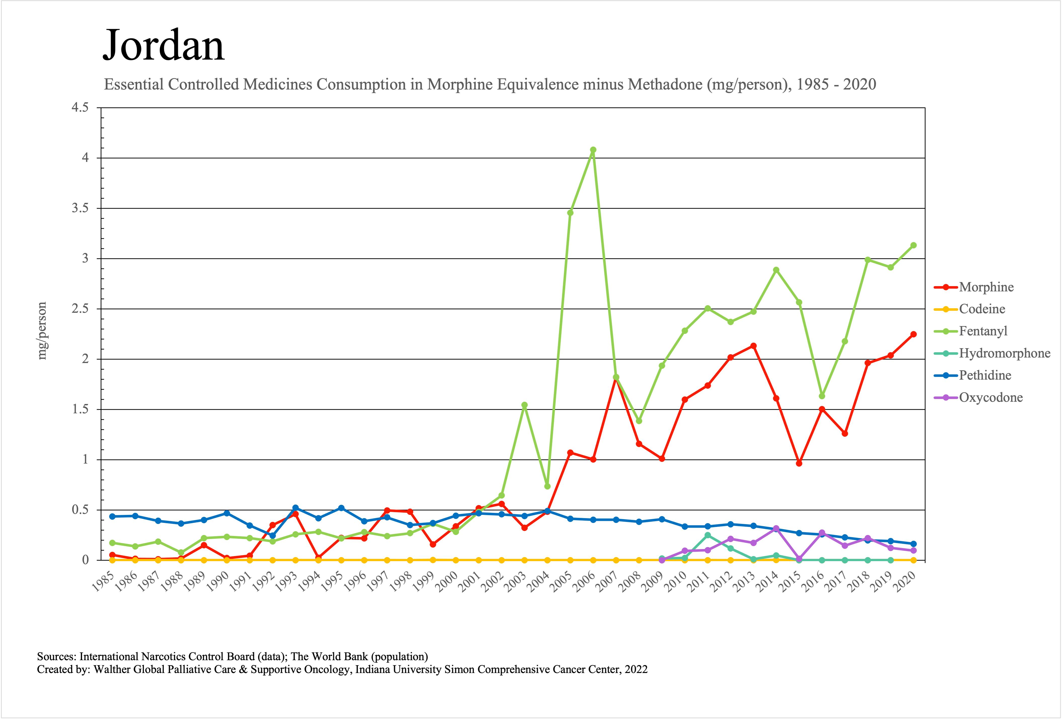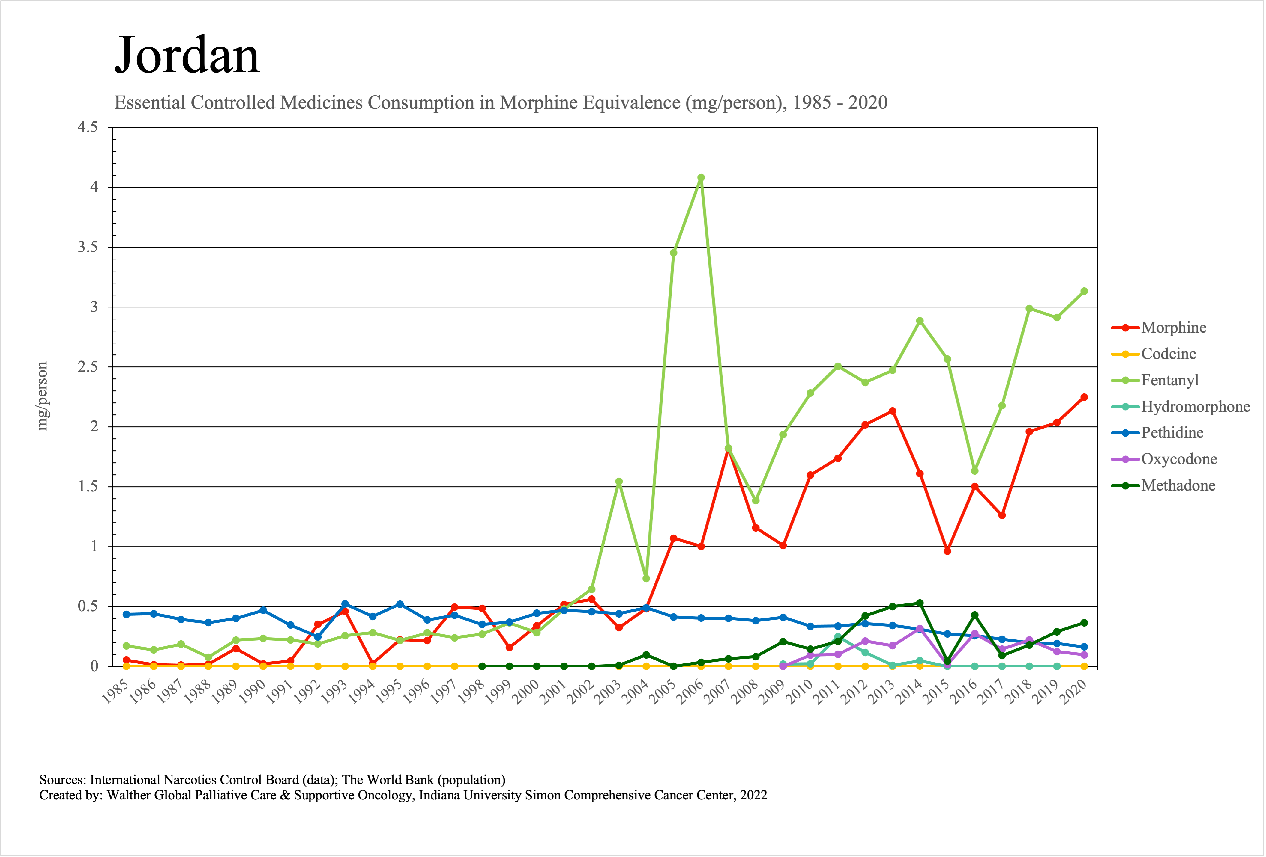 The graphs below provide the Essential Controlled Medicines consumption data trends from 1985 to 2020 in milligrams per capita and Morphine Equivalence (ME) milligrams per capita, as reported to the International Narcotics Control Board (INCB).