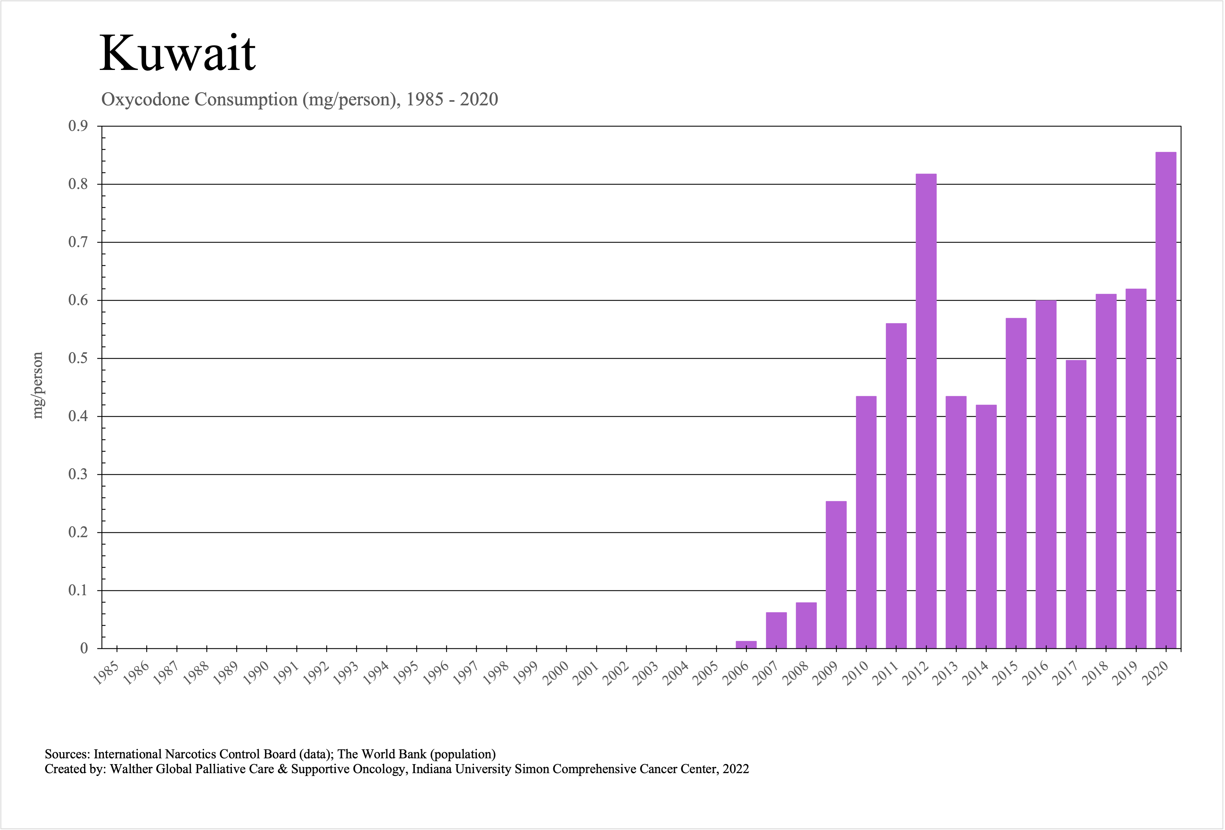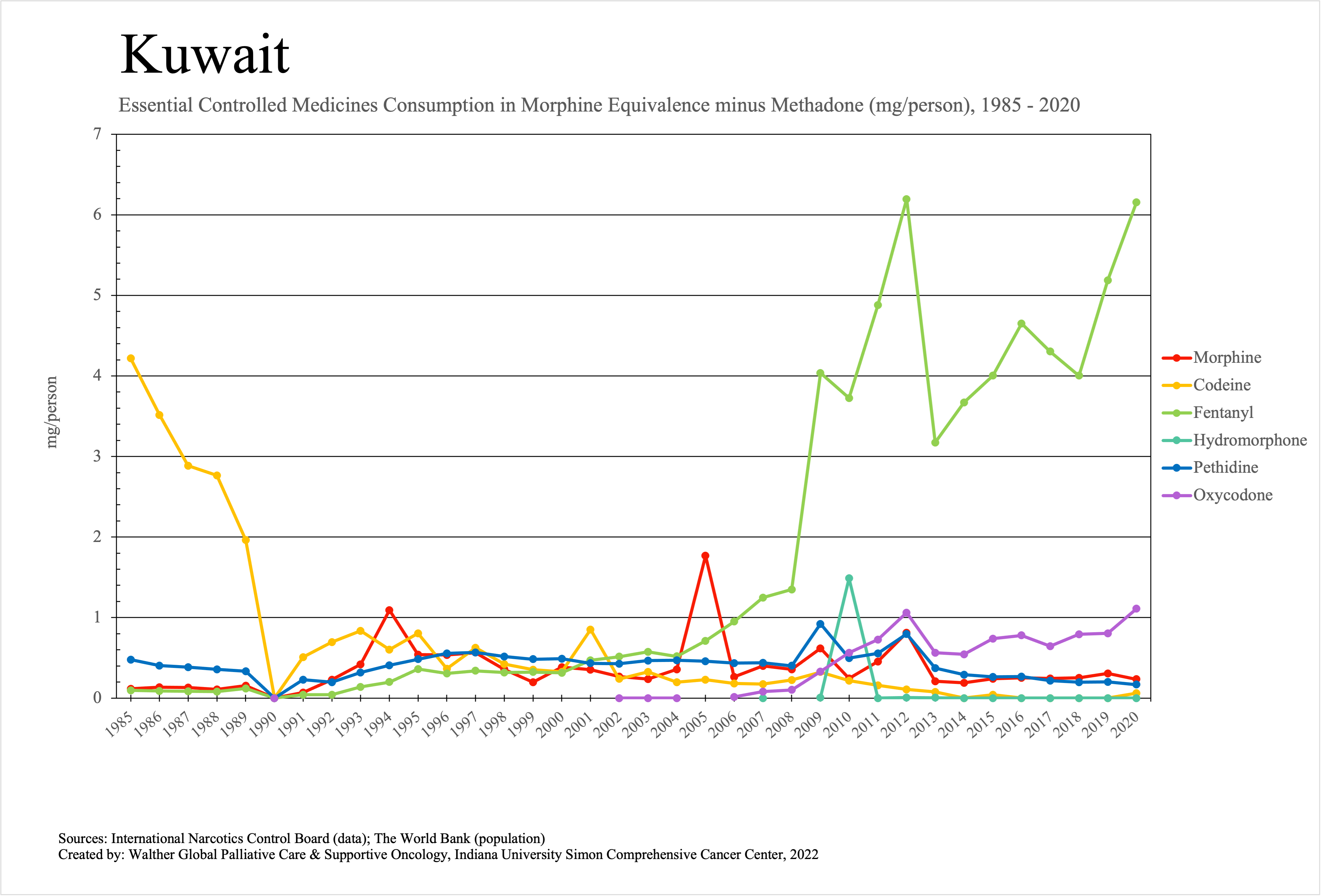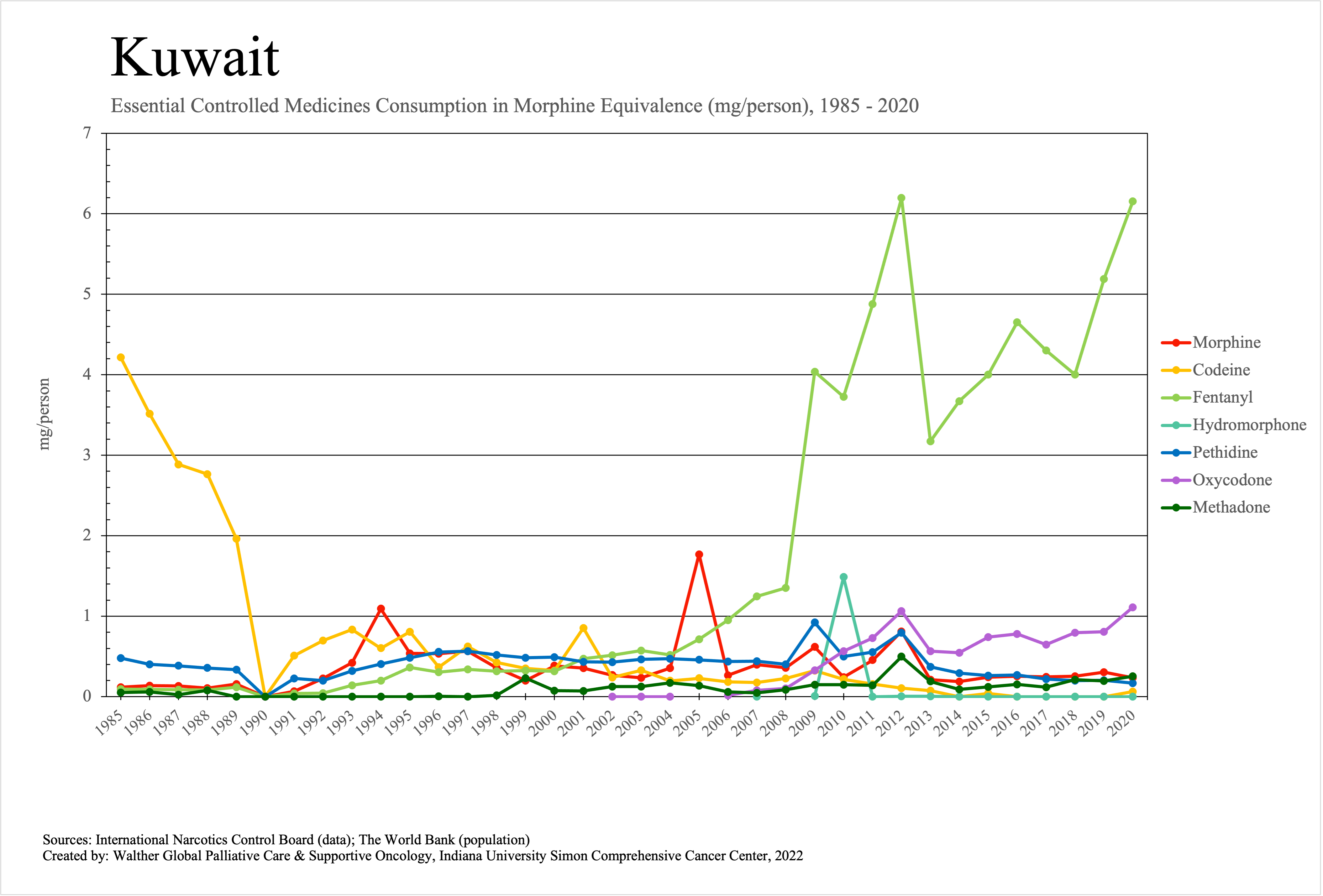 The graphs below provide the Essential Controlled Medicines consumption data trends from 1985 to 2020 in milligrams per capita and Morphine Equivalence (ME) milligrams per capita, as reported to the International Narcotics Control Board (INCB).