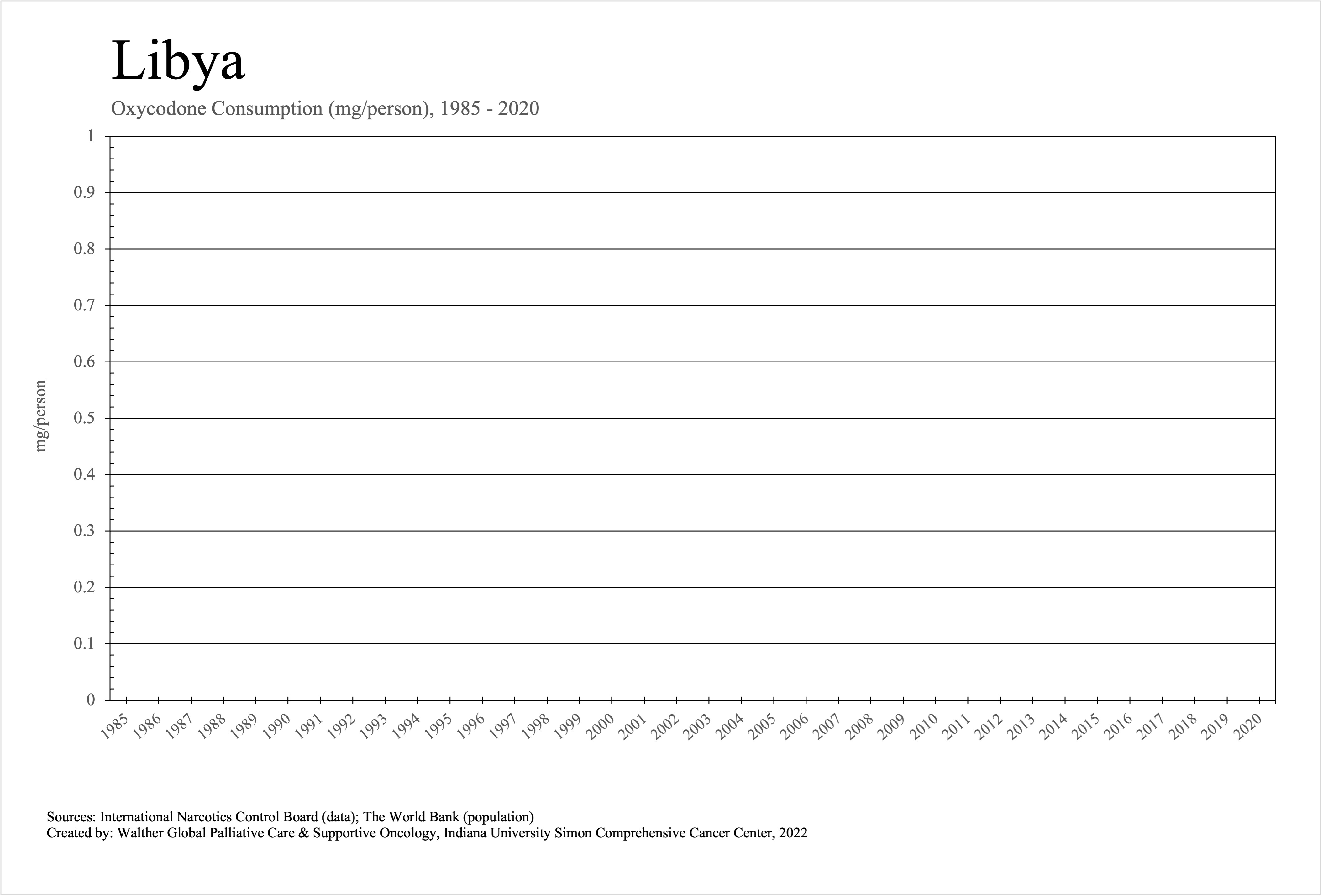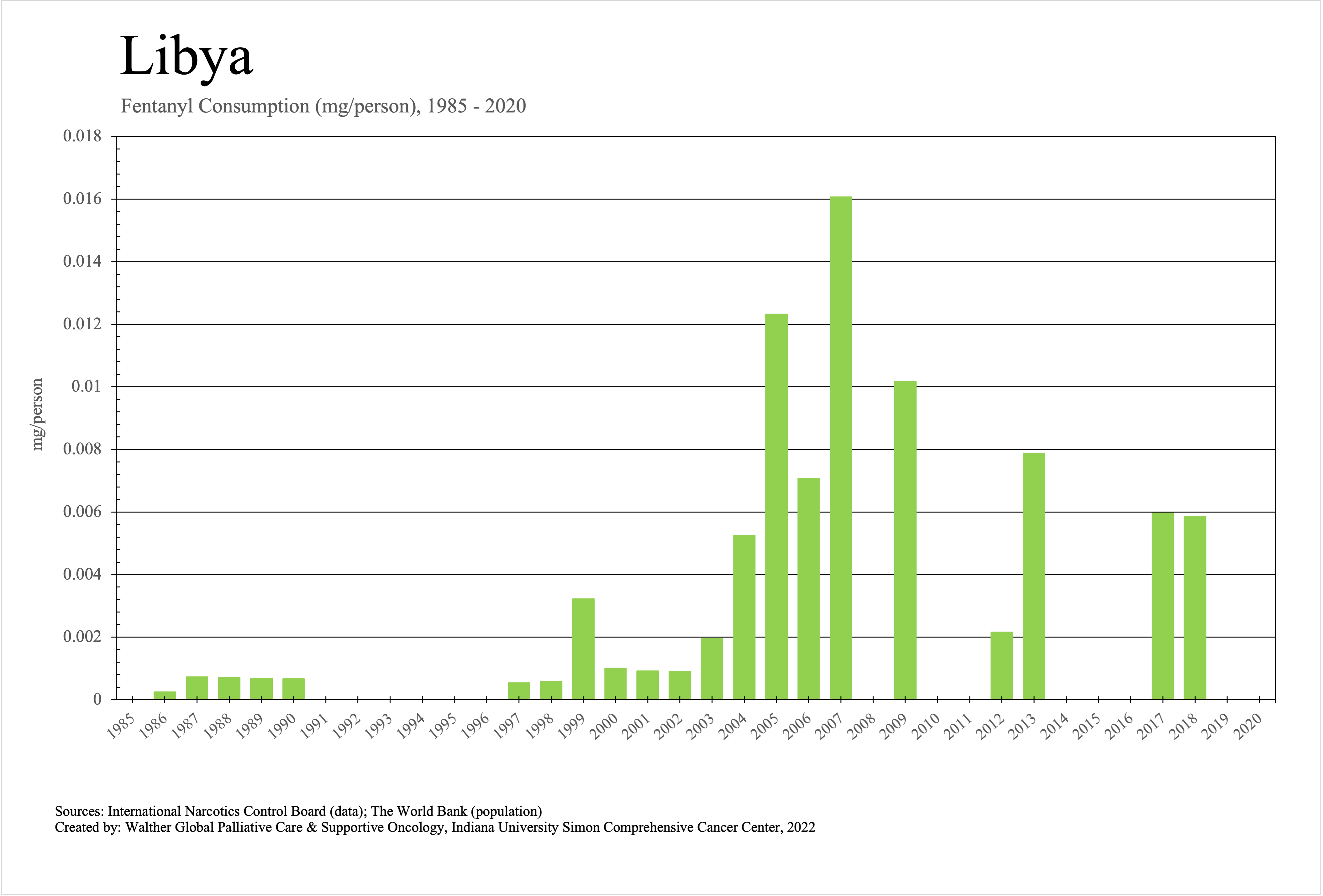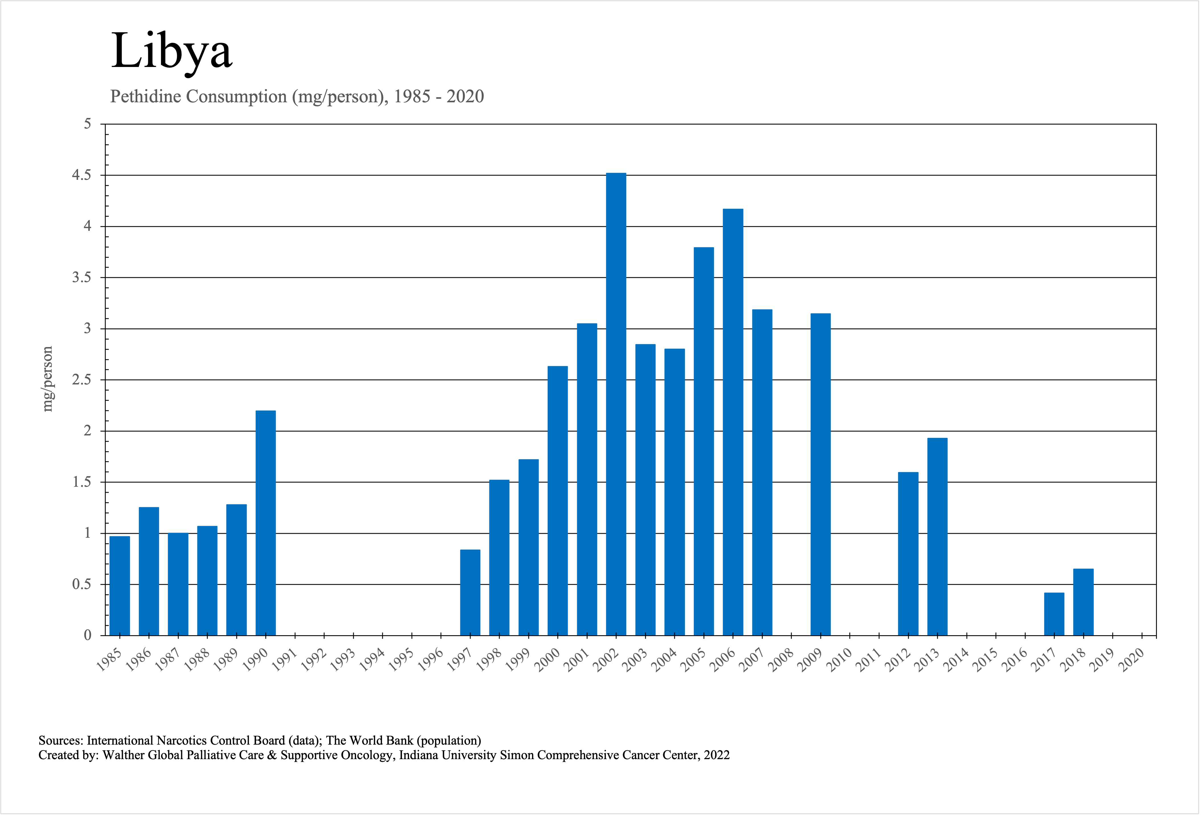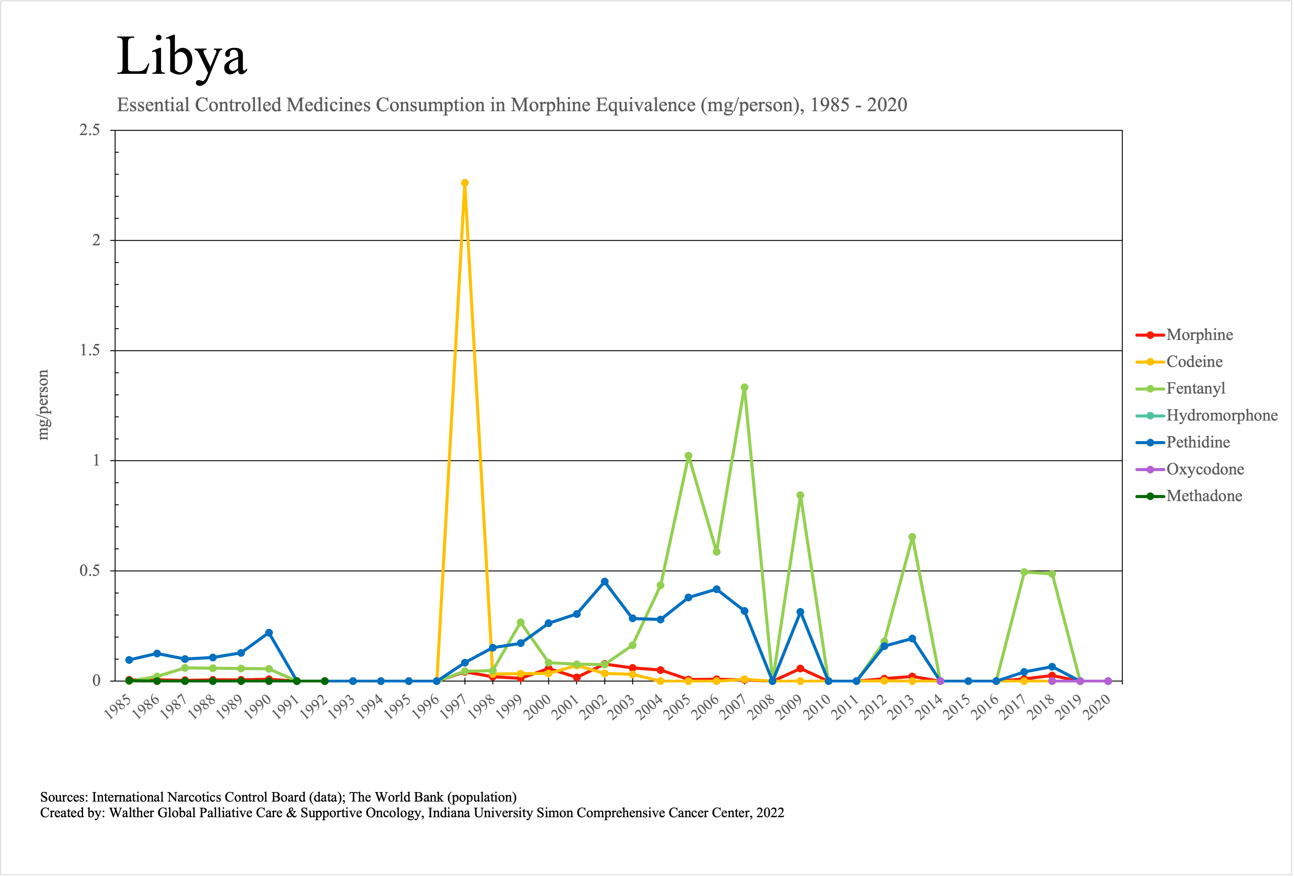 The graphs below provide the Essential Controlled Medicines consumption data trends from 1985 to 2020 in milligrams per capita and Morphine Equivalence (ME) milligrams per capita, as reported to the International Narcotics Control Board (INCB).