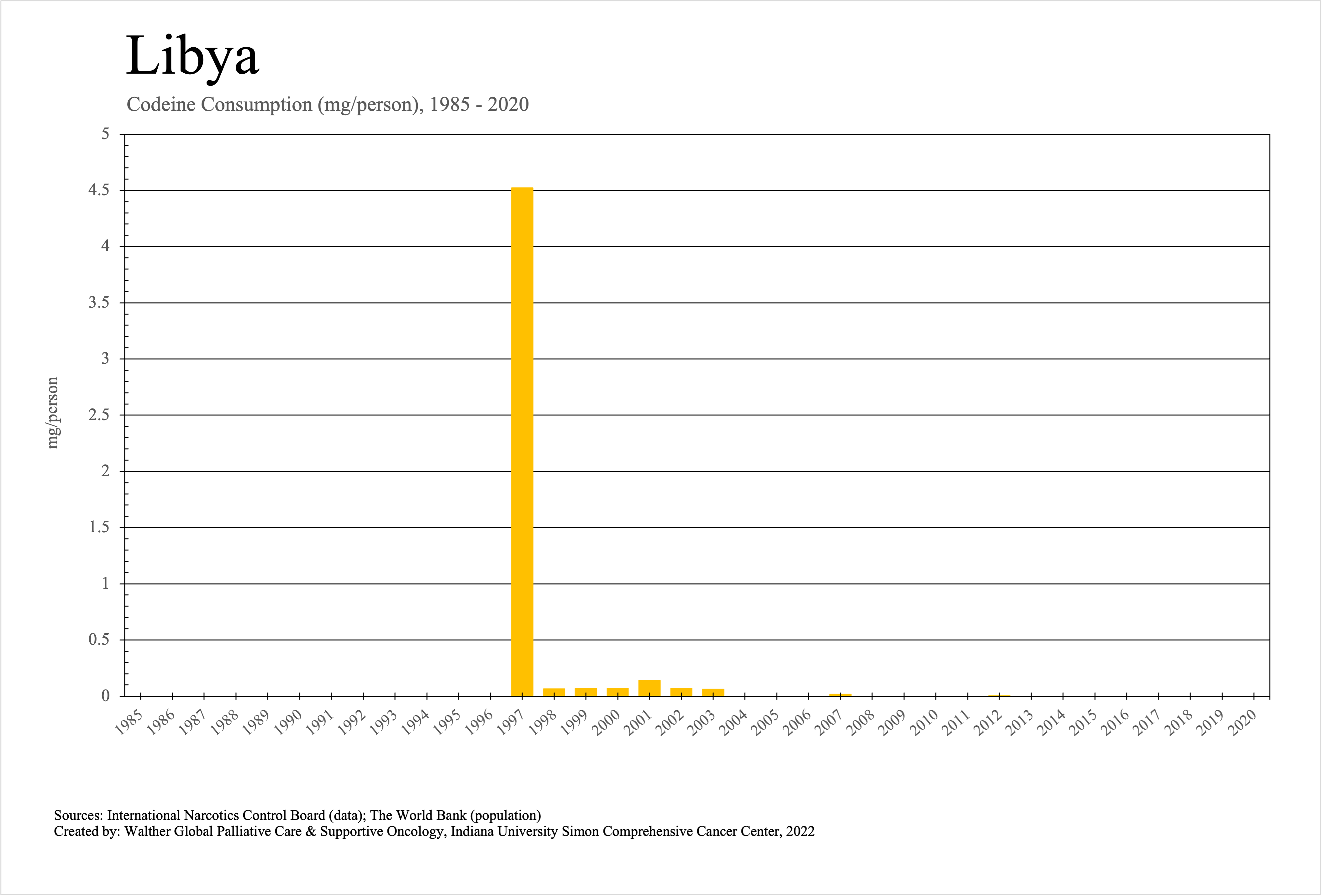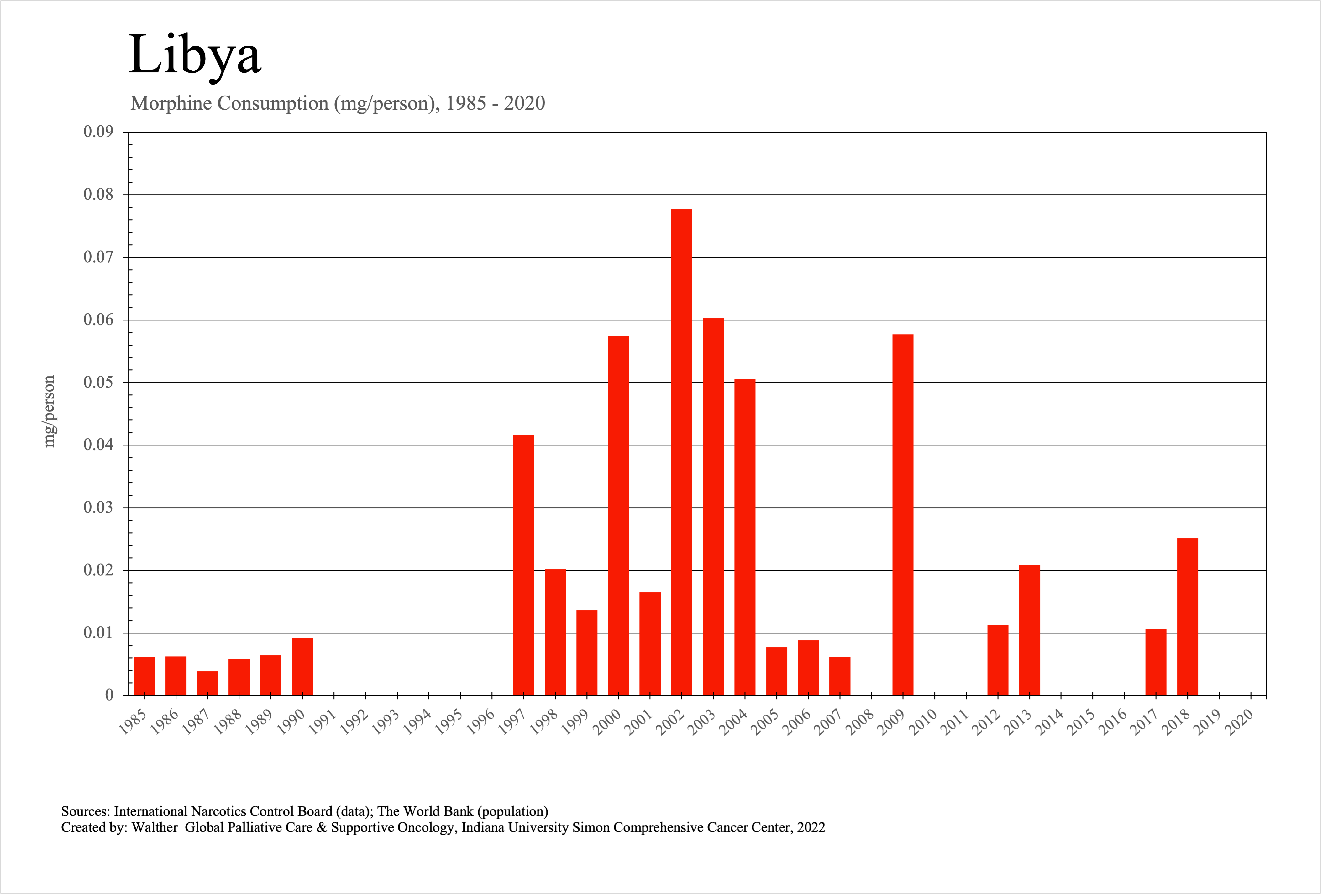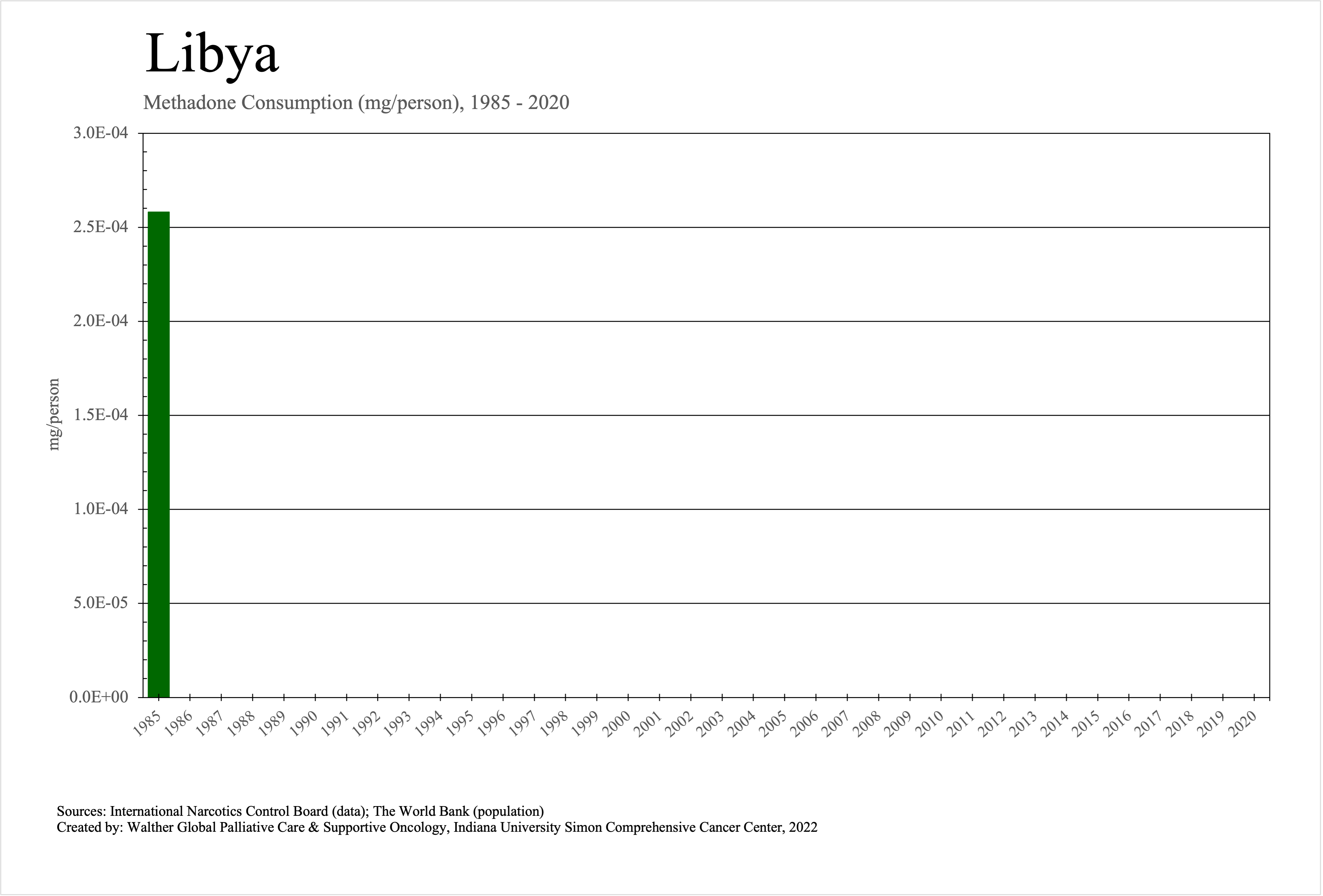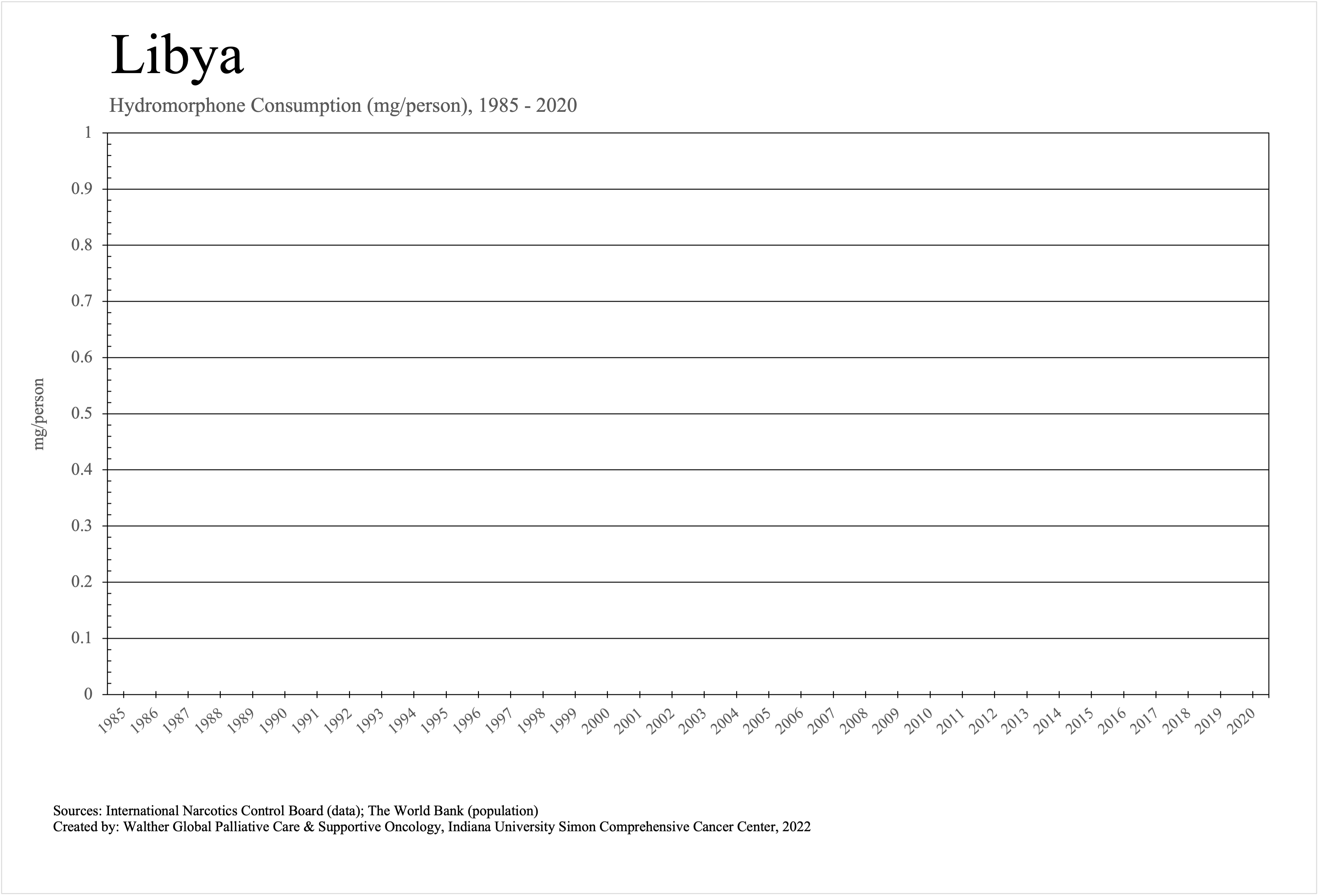 The graphs below provide the Essential Controlled Medicines consumption data trends from 1985 to 2020 in milligrams per capita and Morphine Equivalence (ME) milligrams per capita, as reported to the International Narcotics Control Board (INCB).