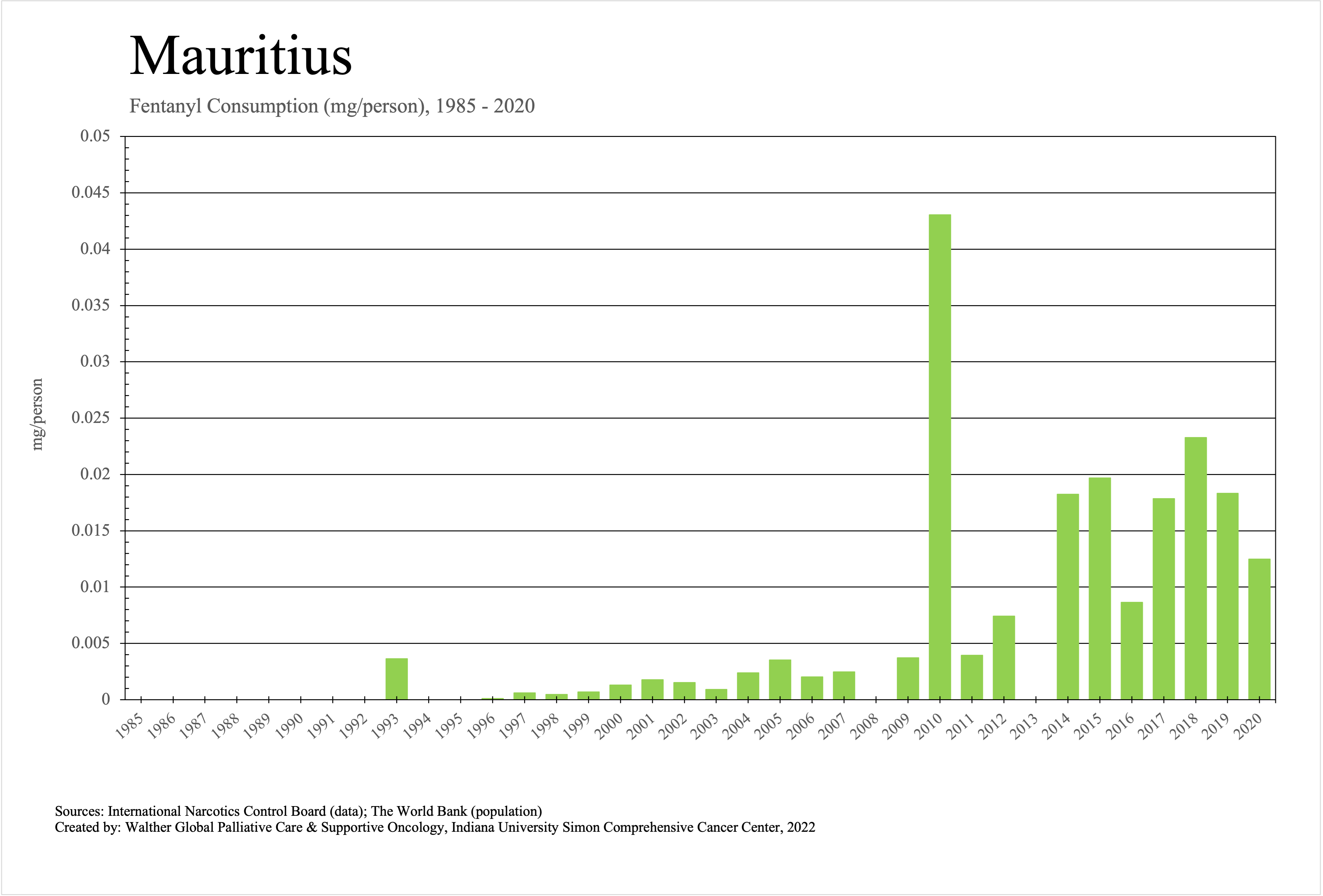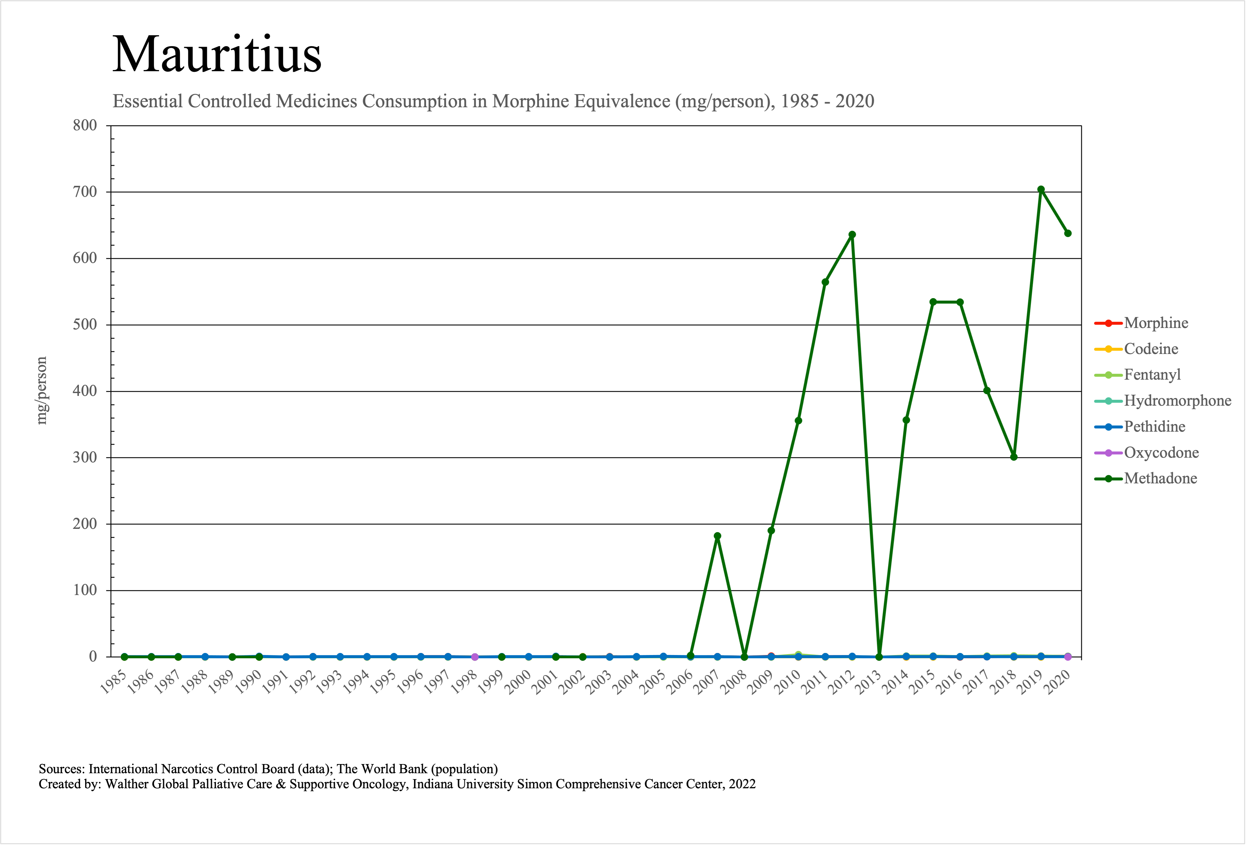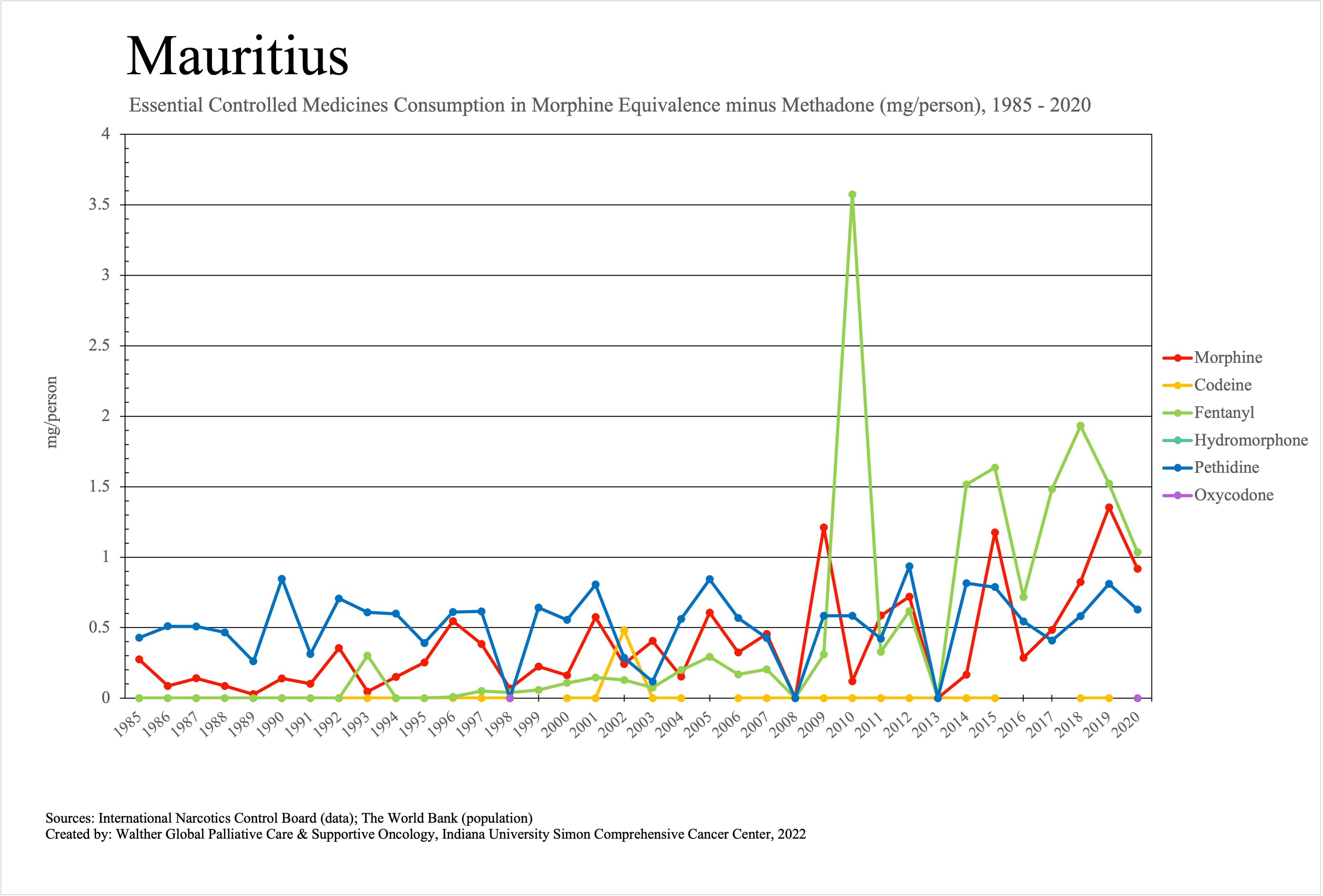 The graphs below provide the Essential Controlled Medicines consumption data trends from 1985 to 2020 in milligrams per capita and Morphine Equivalence (ME) milligrams per capita, as reported to the International Narcotics Control Board (INCB).