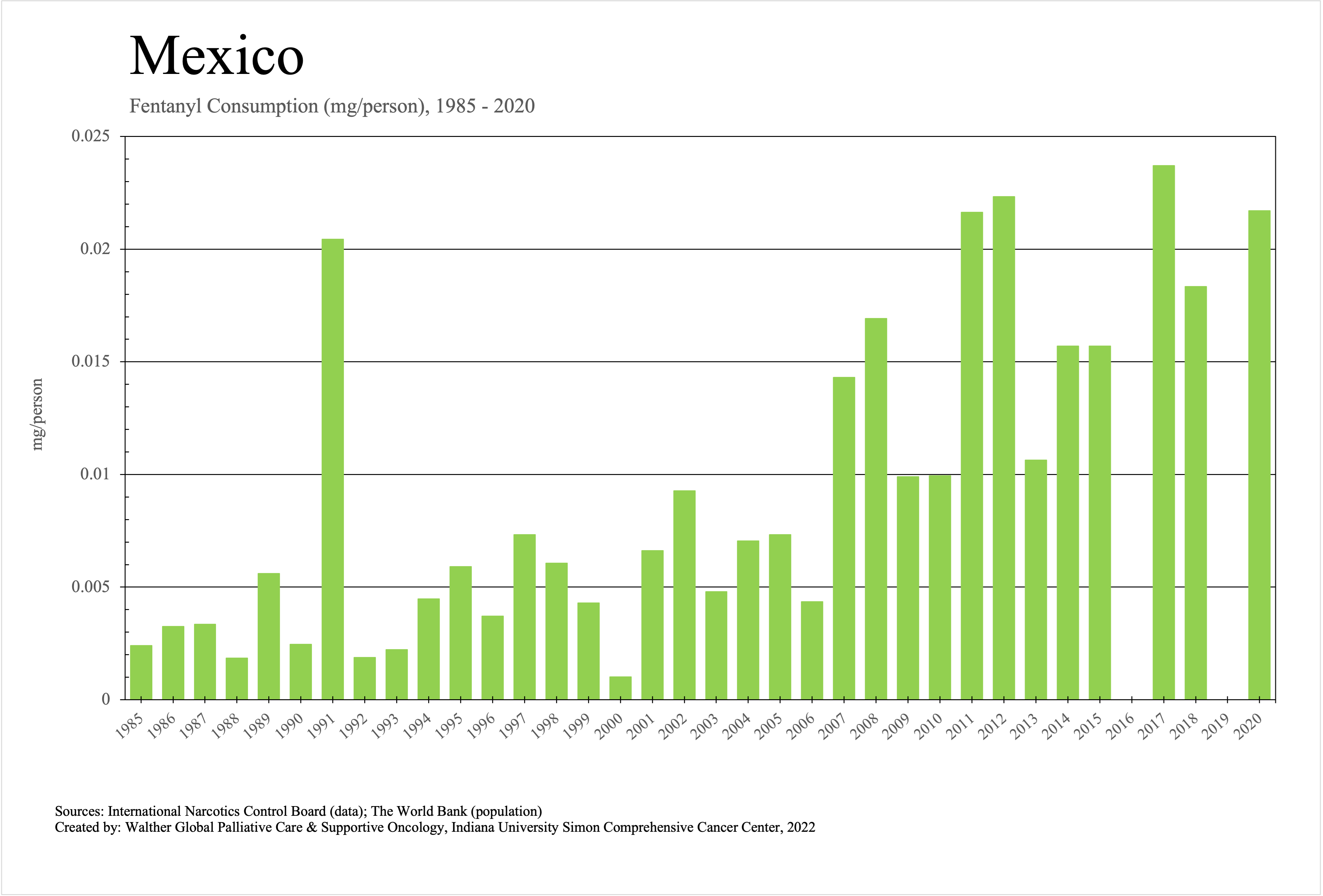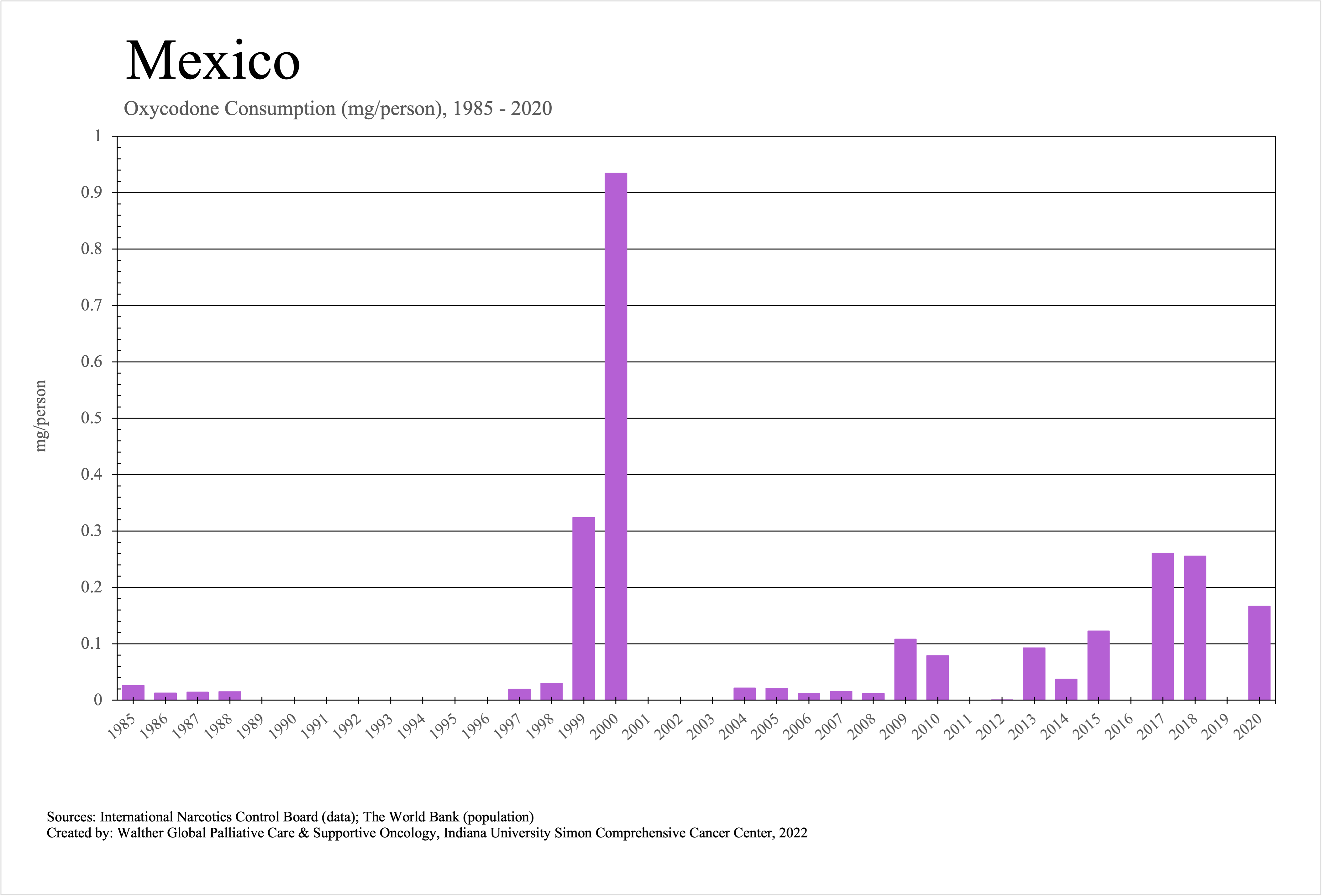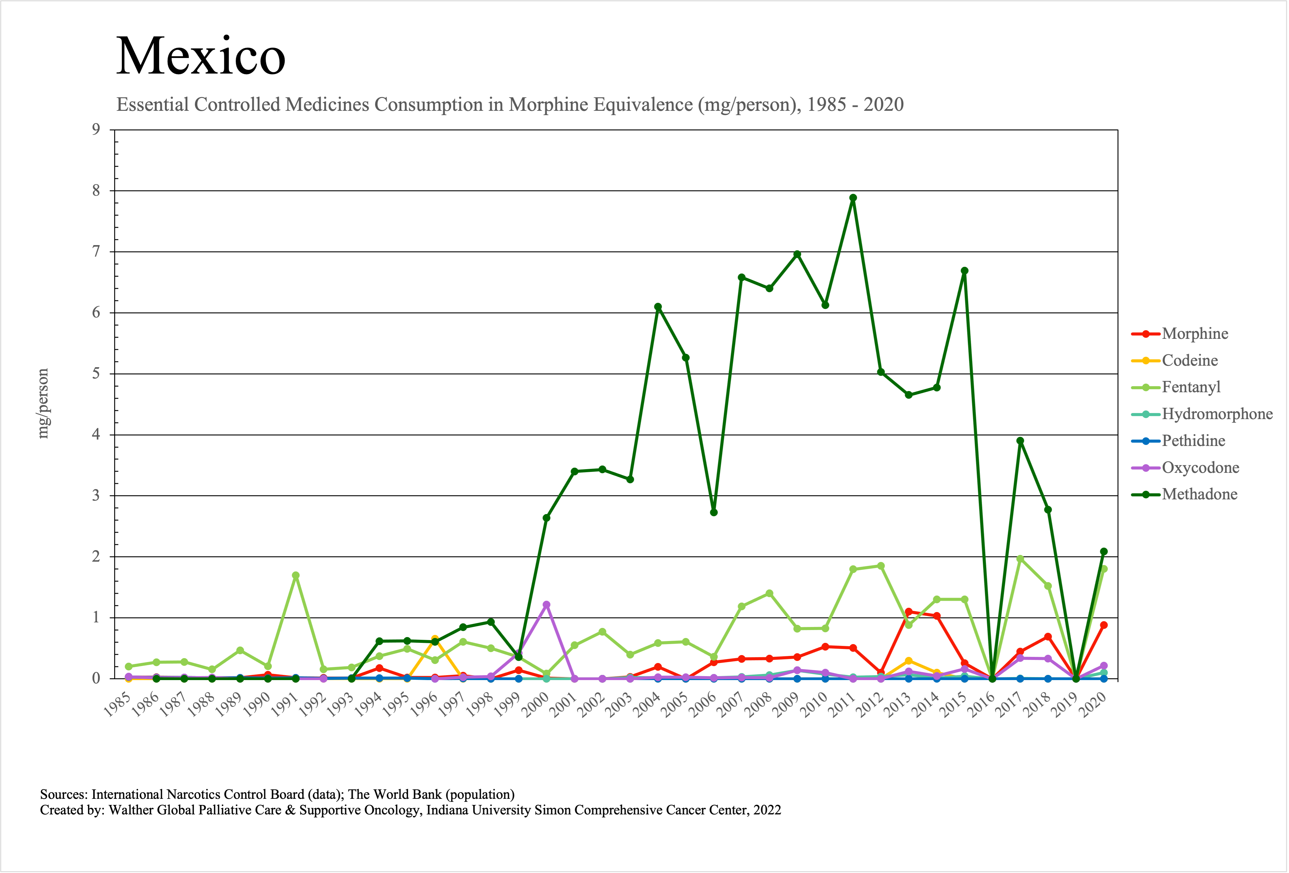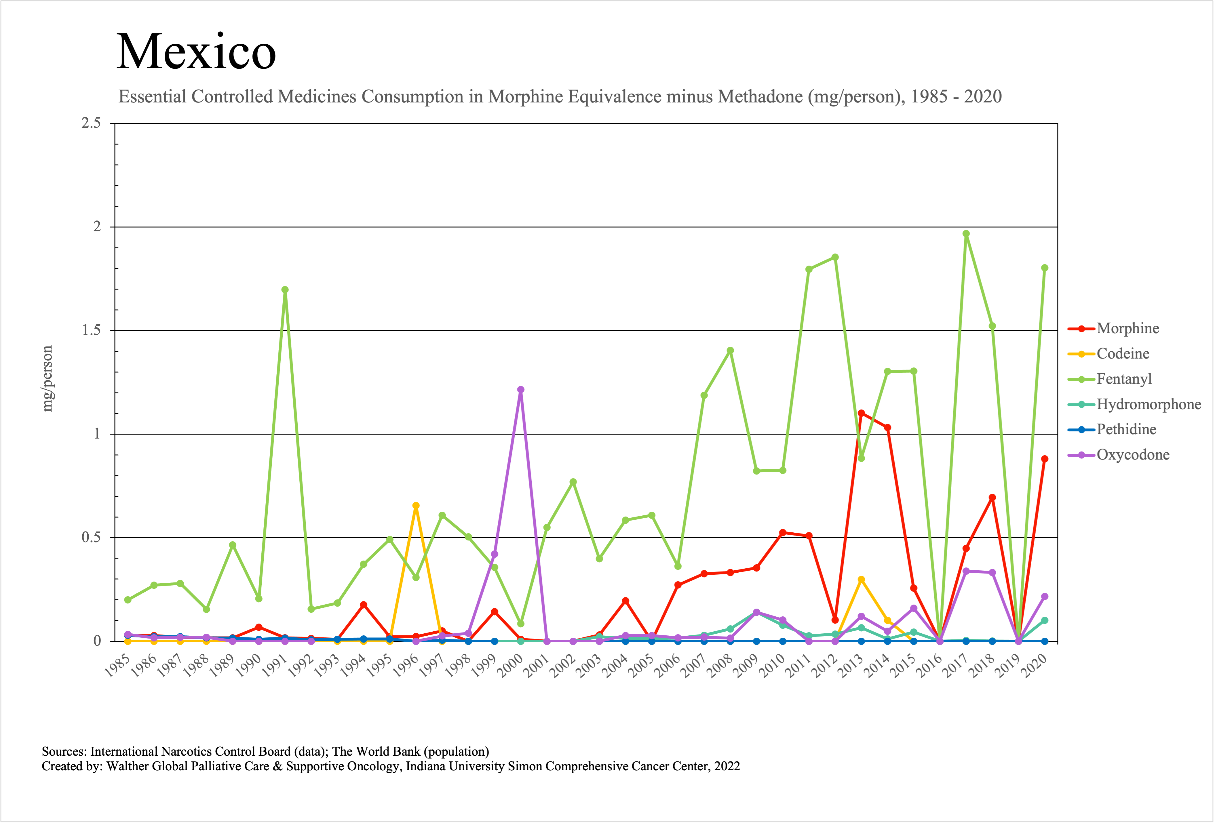 The graphs below provide the Essential Controlled Medicines consumption data trends from 1985 to 2020 in milligrams per capita and Morphine Equivalence (ME) milligrams per capita, as reported to the International Narcotics Control Board (INCB).