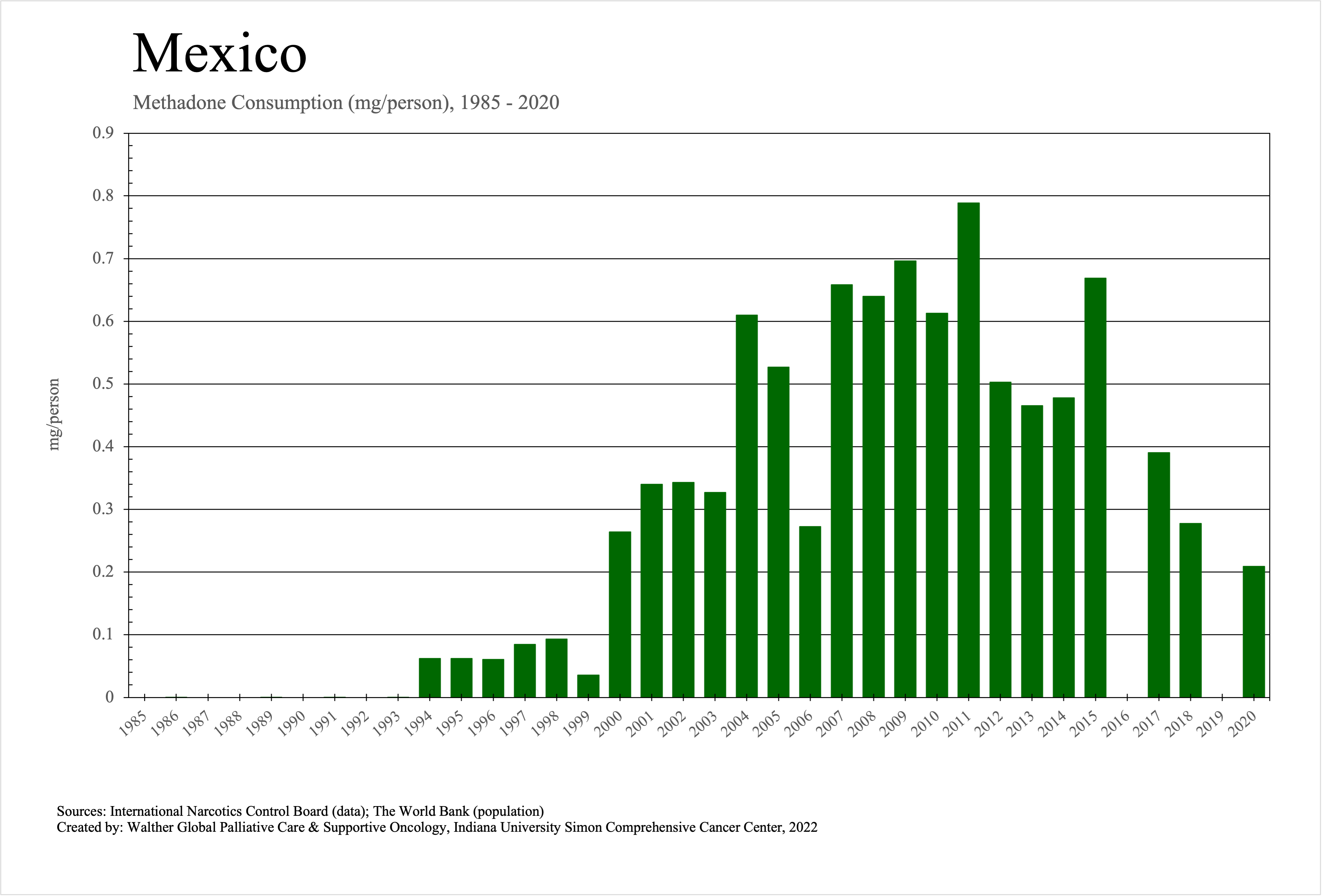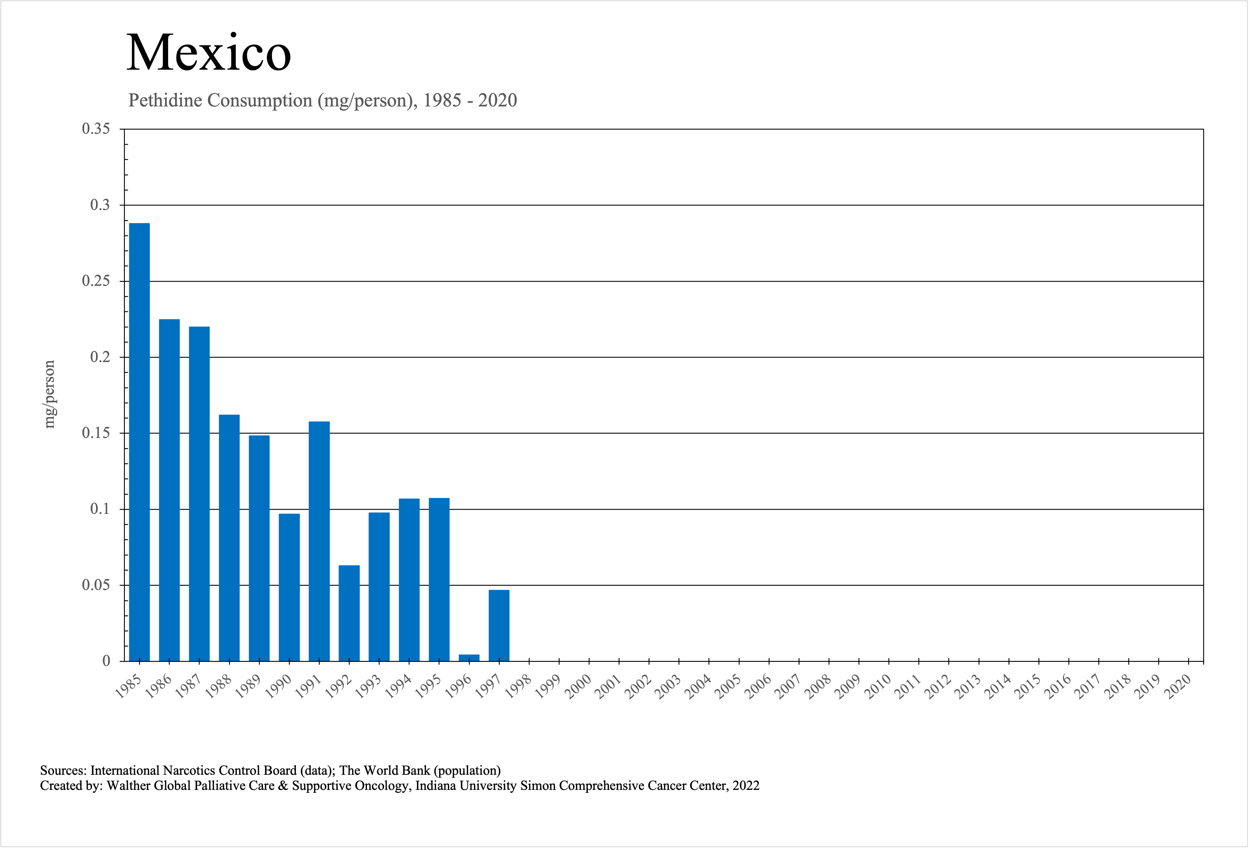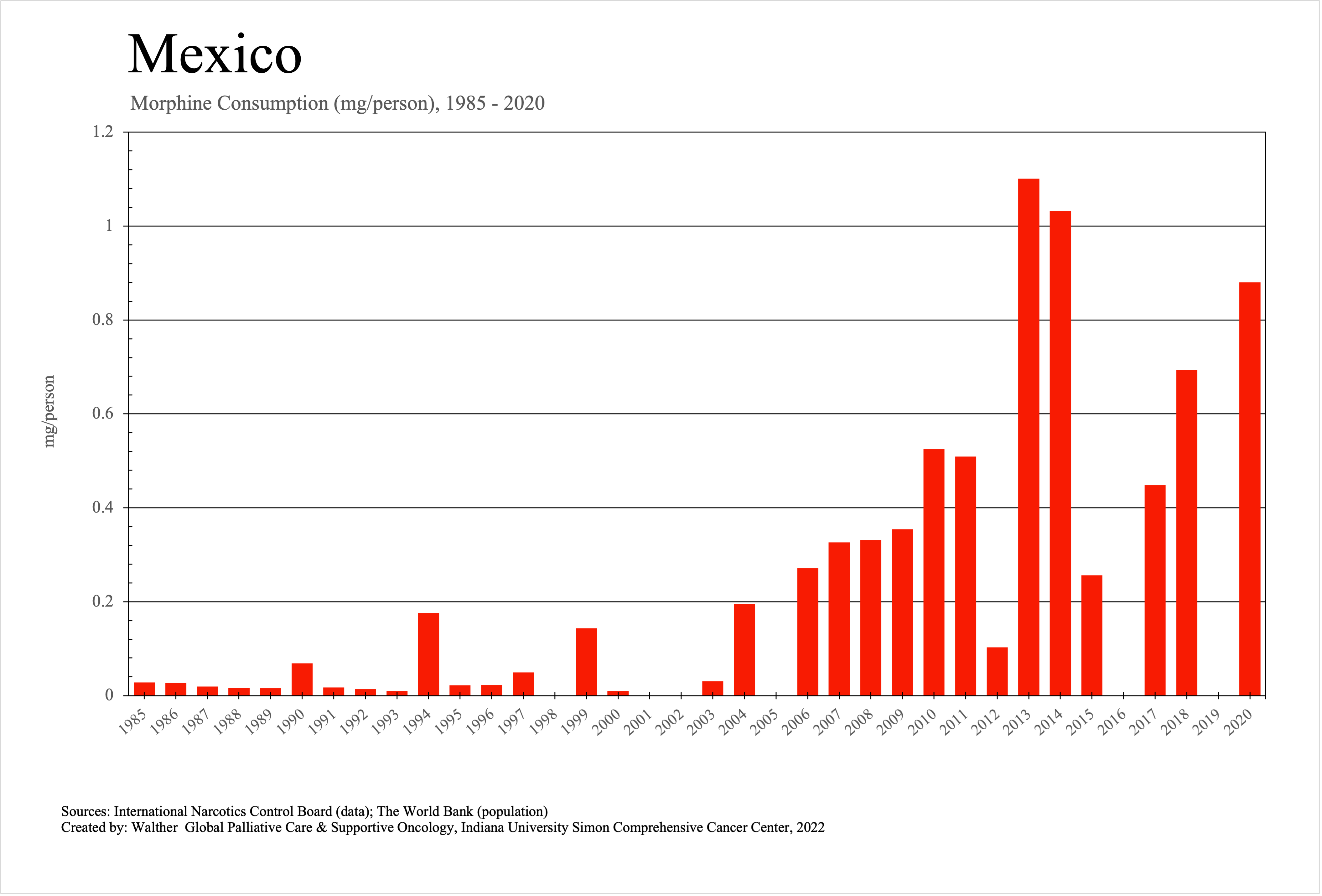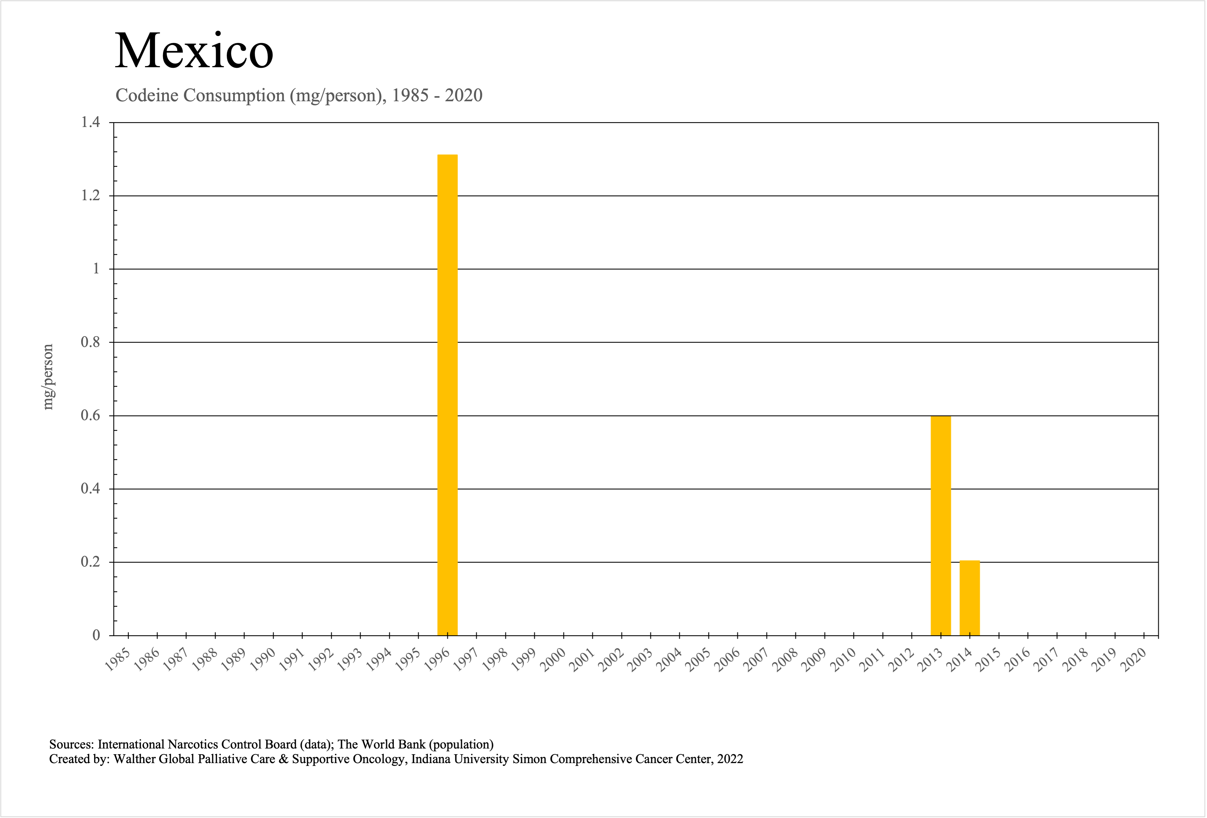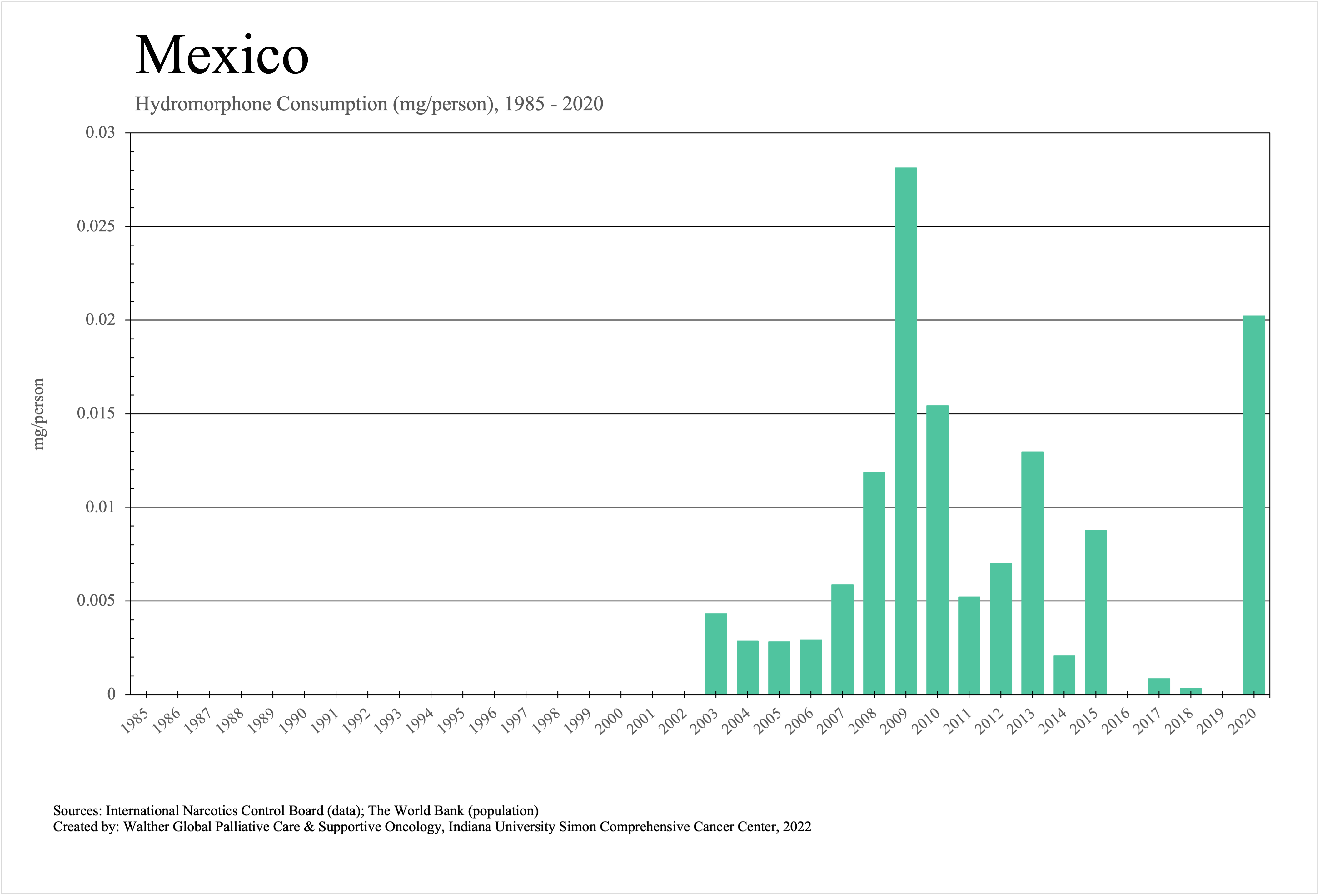 The graphs below provide the Essential Controlled Medicines consumption data trends from 1985 to 2020 in milligrams per capita and Morphine Equivalence (ME) milligrams per capita, as reported to the International Narcotics Control Board (INCB).
