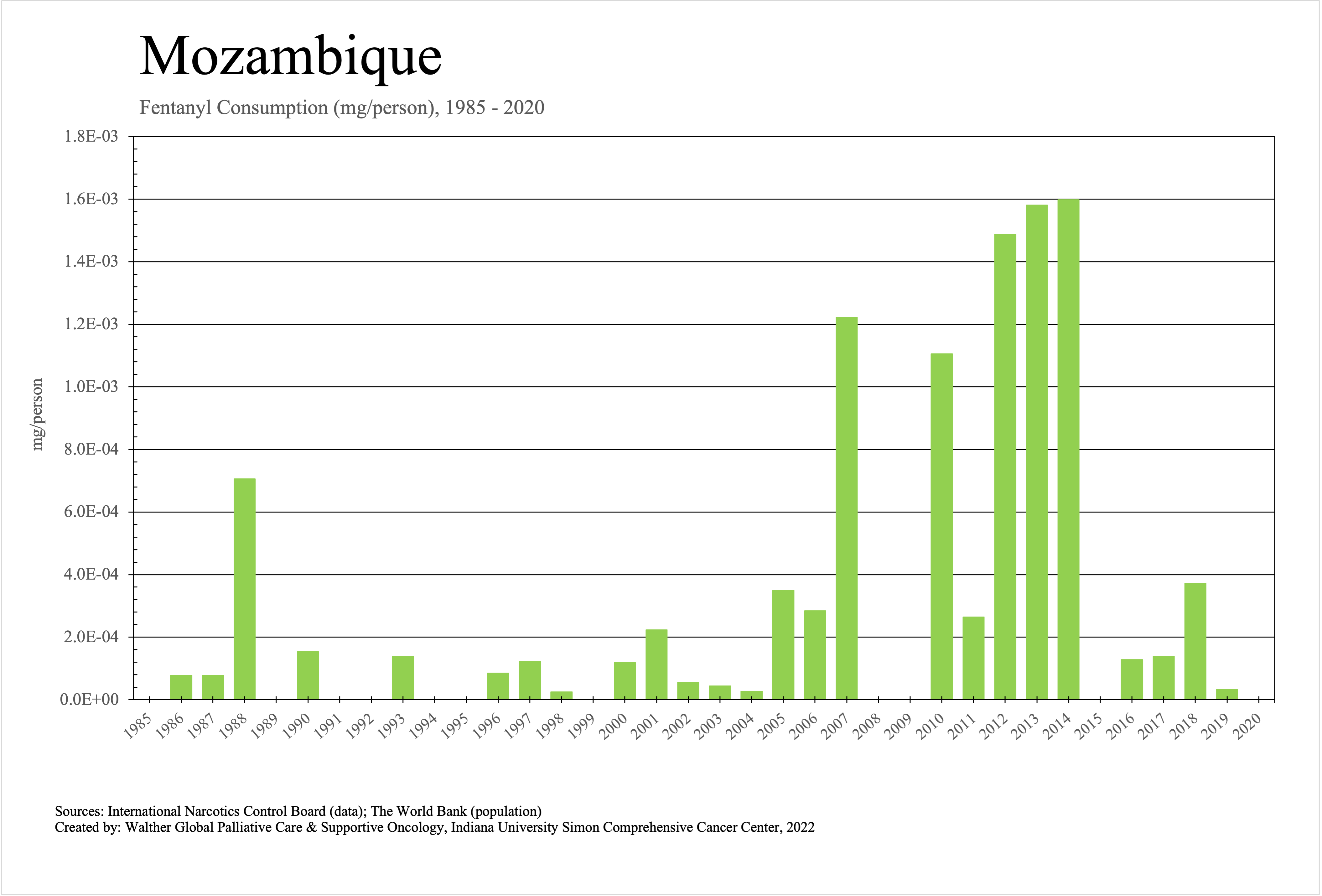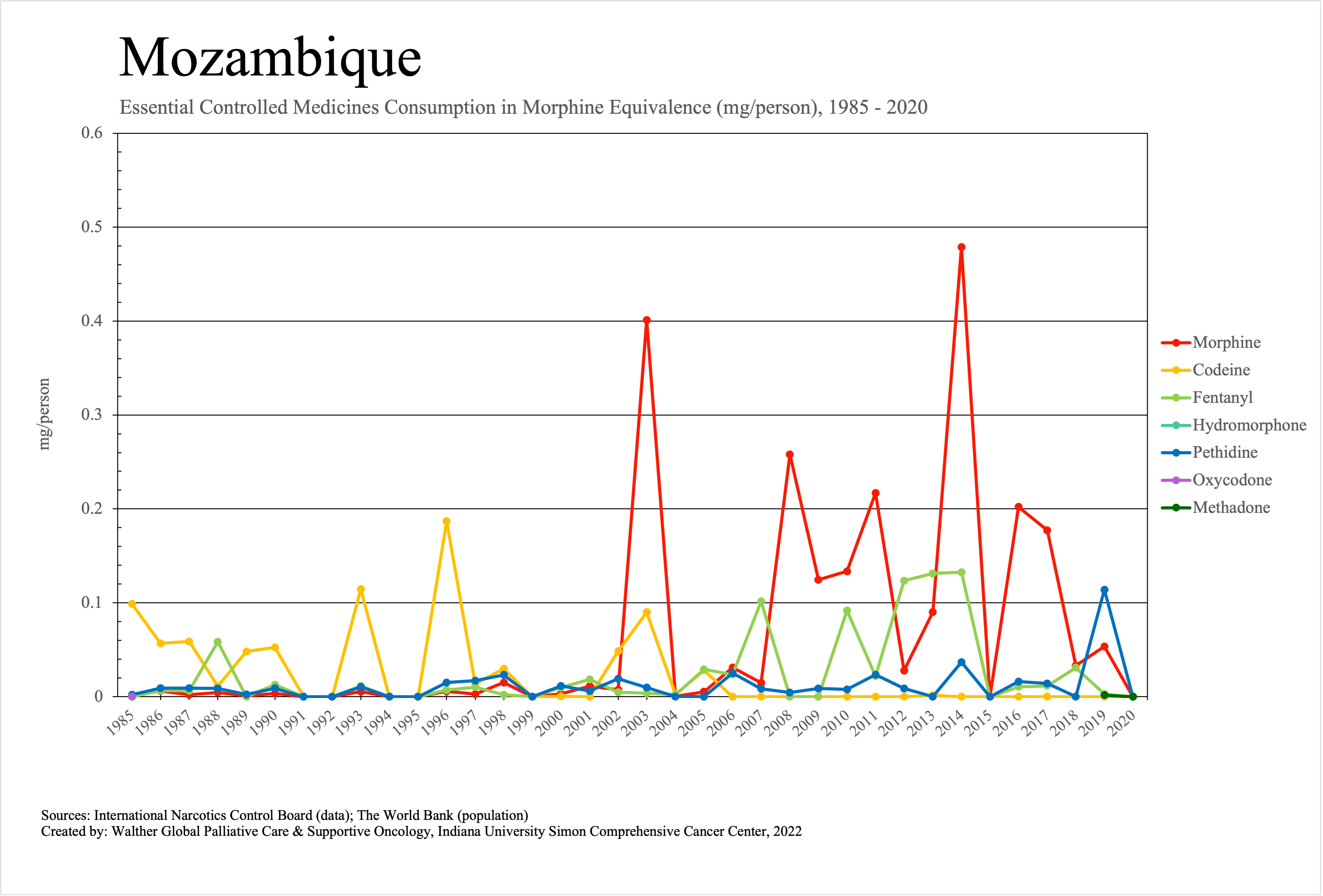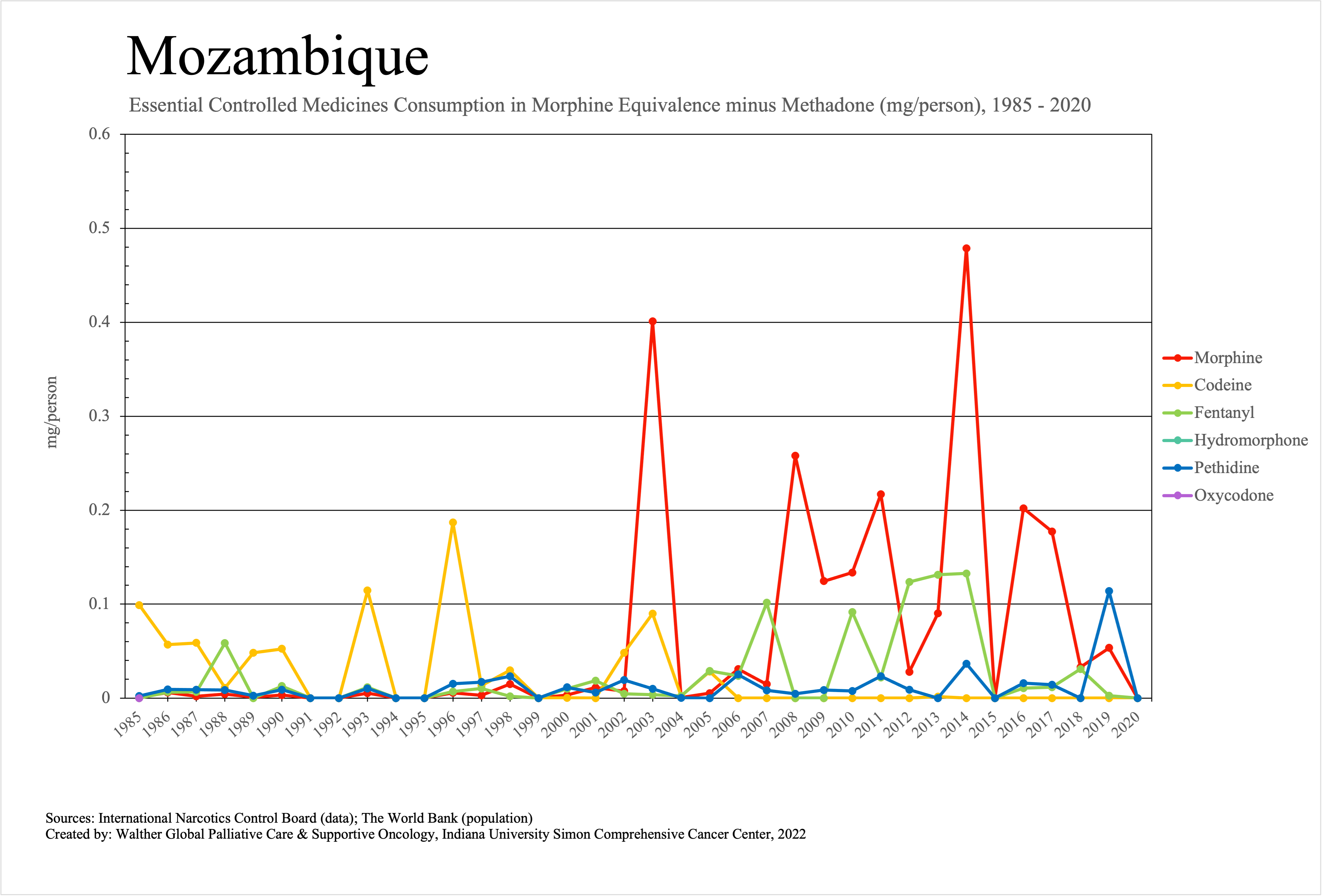 The graphs below provide the Essential Controlled Medicines consumption data trends from 1985 to 2020 in milligrams per capita and Morphine Equivalence (ME) milligrams per capita, as reported to the International Narcotics Control Board (INCB).