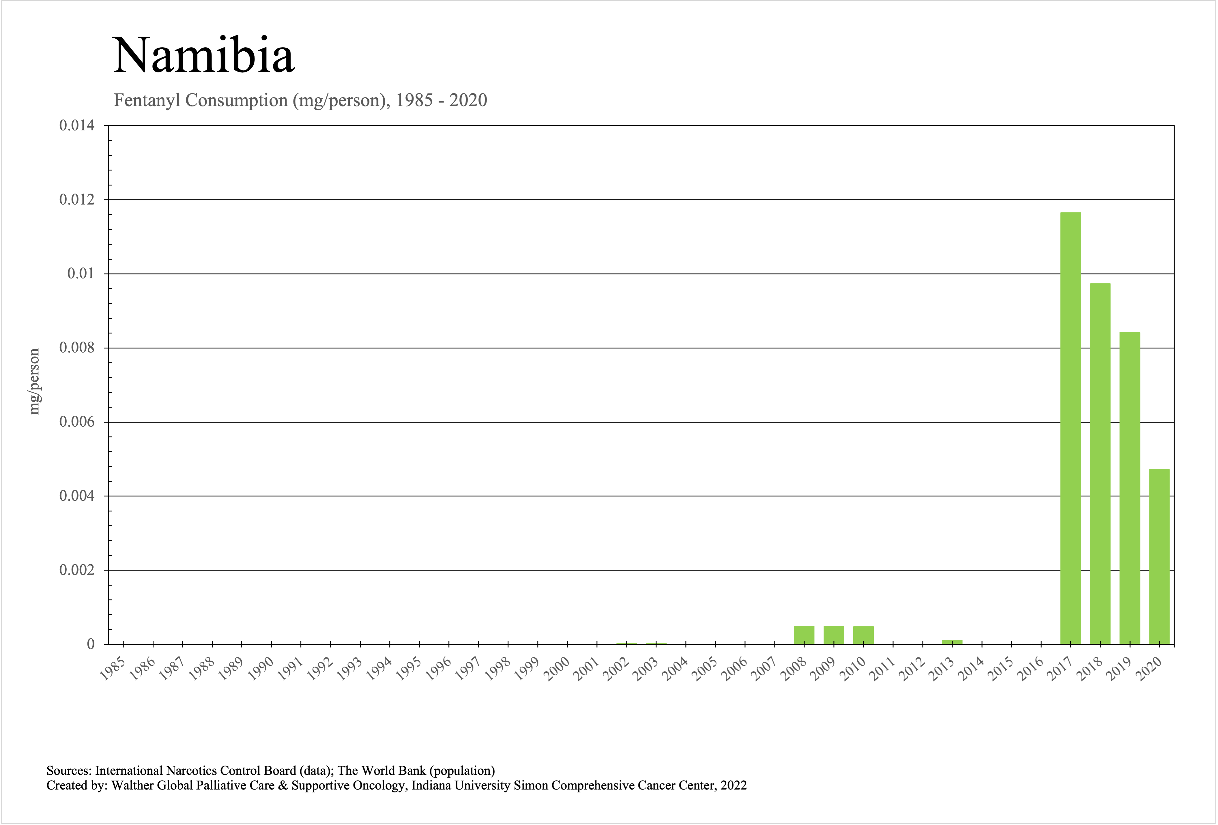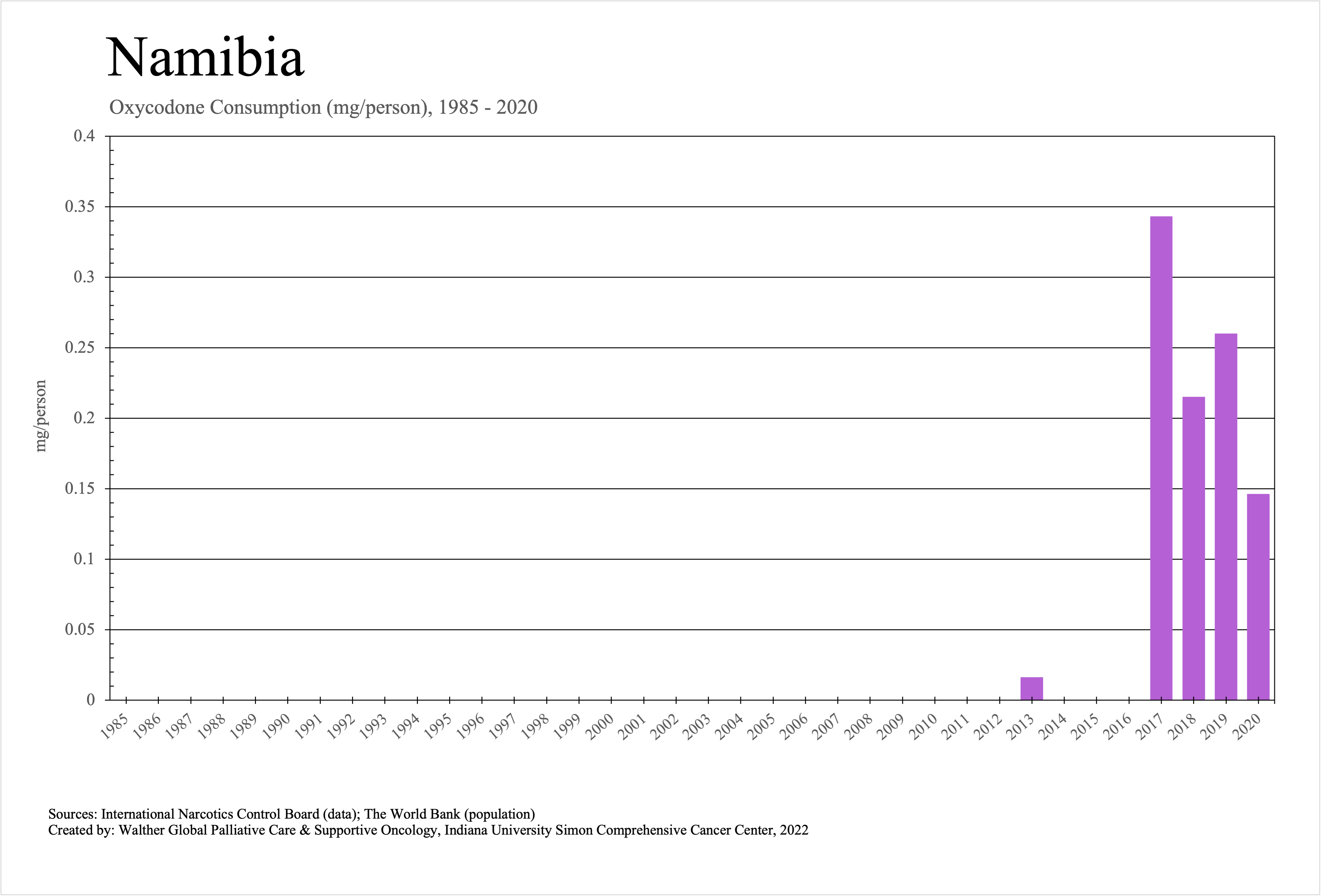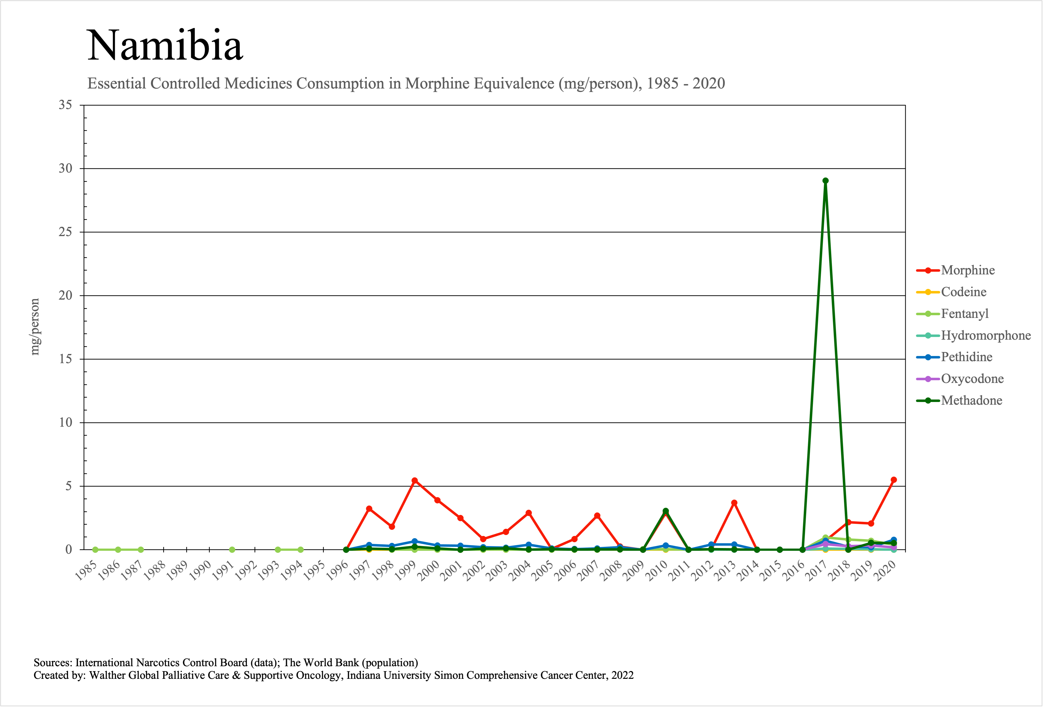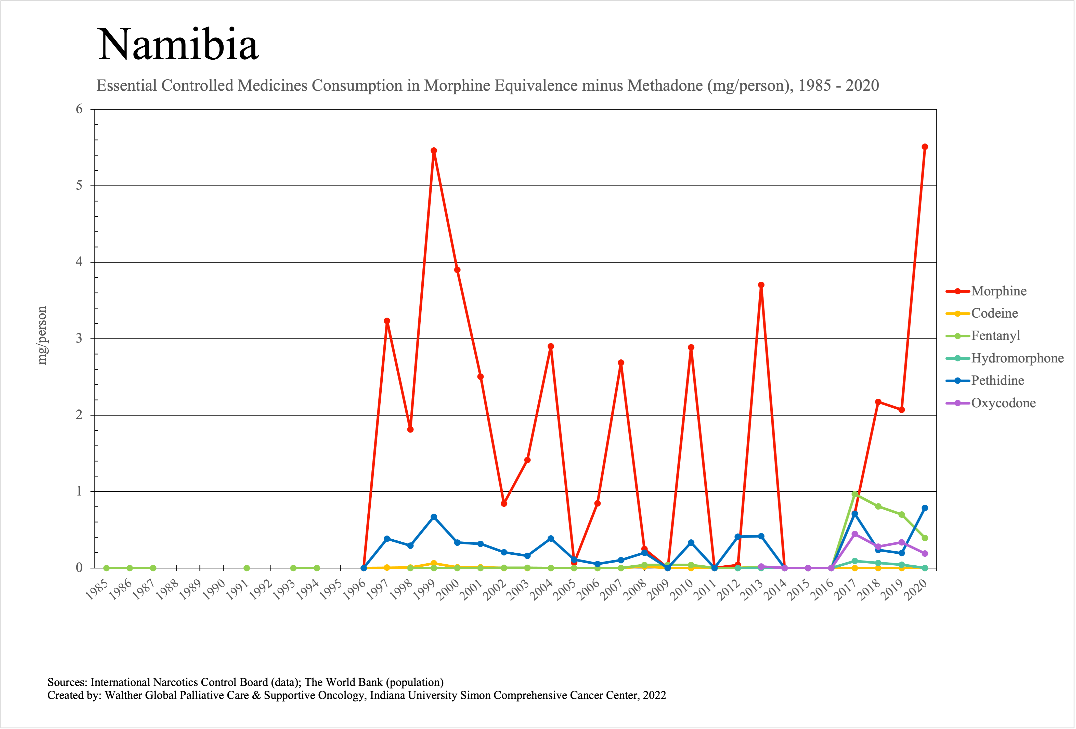 The graphs below provide the Essential Controlled Medicines consumption data trends from 1985 to 2020 in milligrams per capita and Morphine Equivalence (ME) milligrams per capita, as reported to the International Narcotics Control Board (INCB).