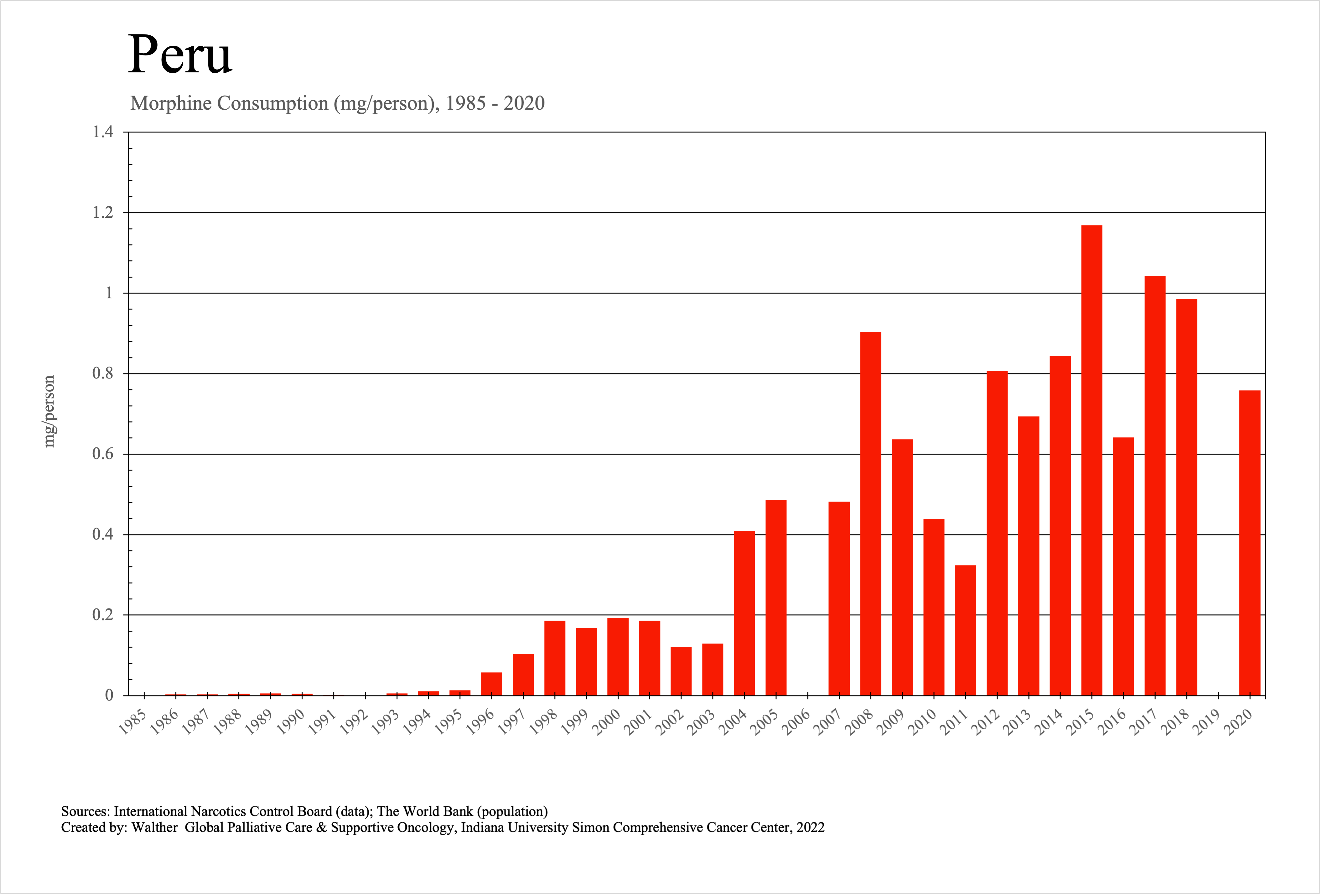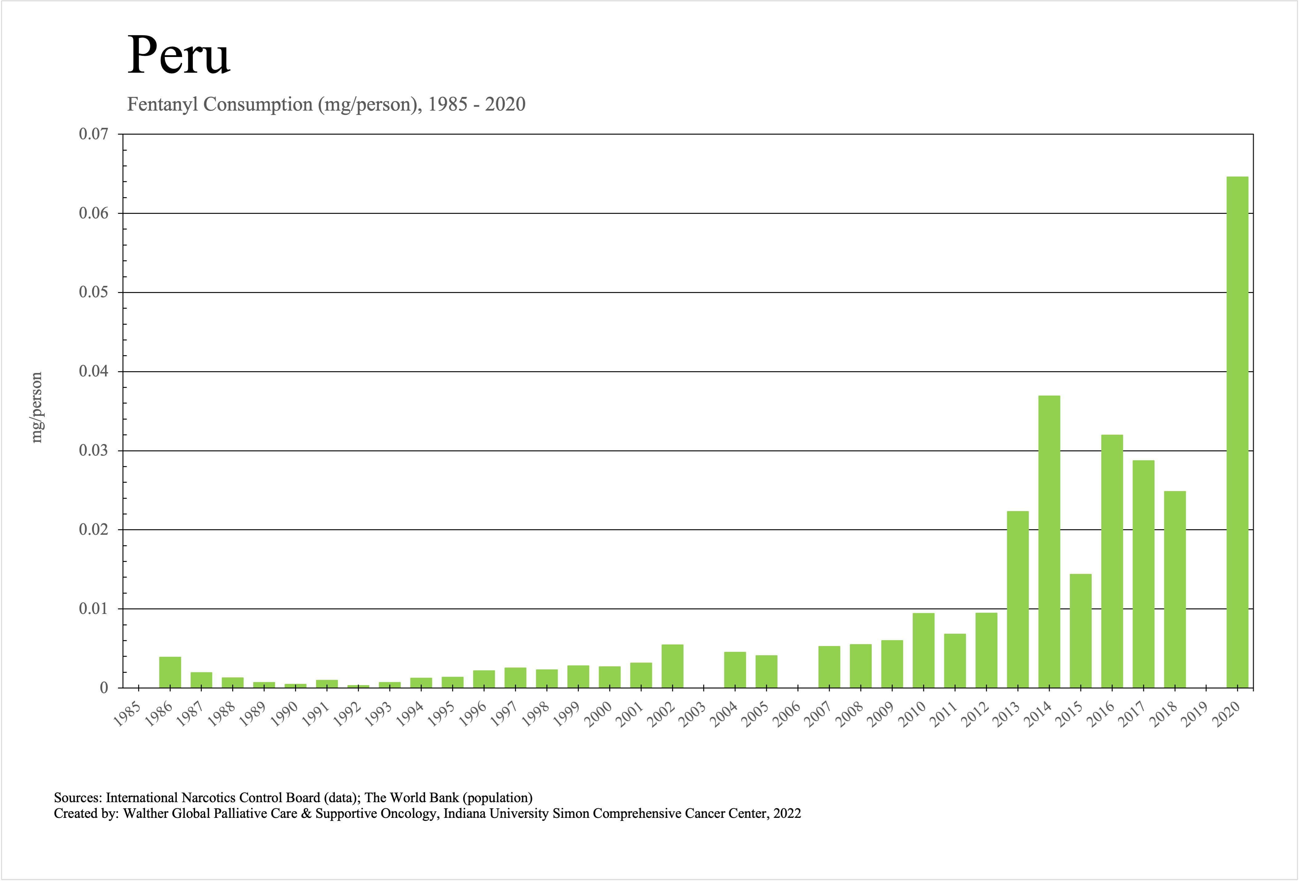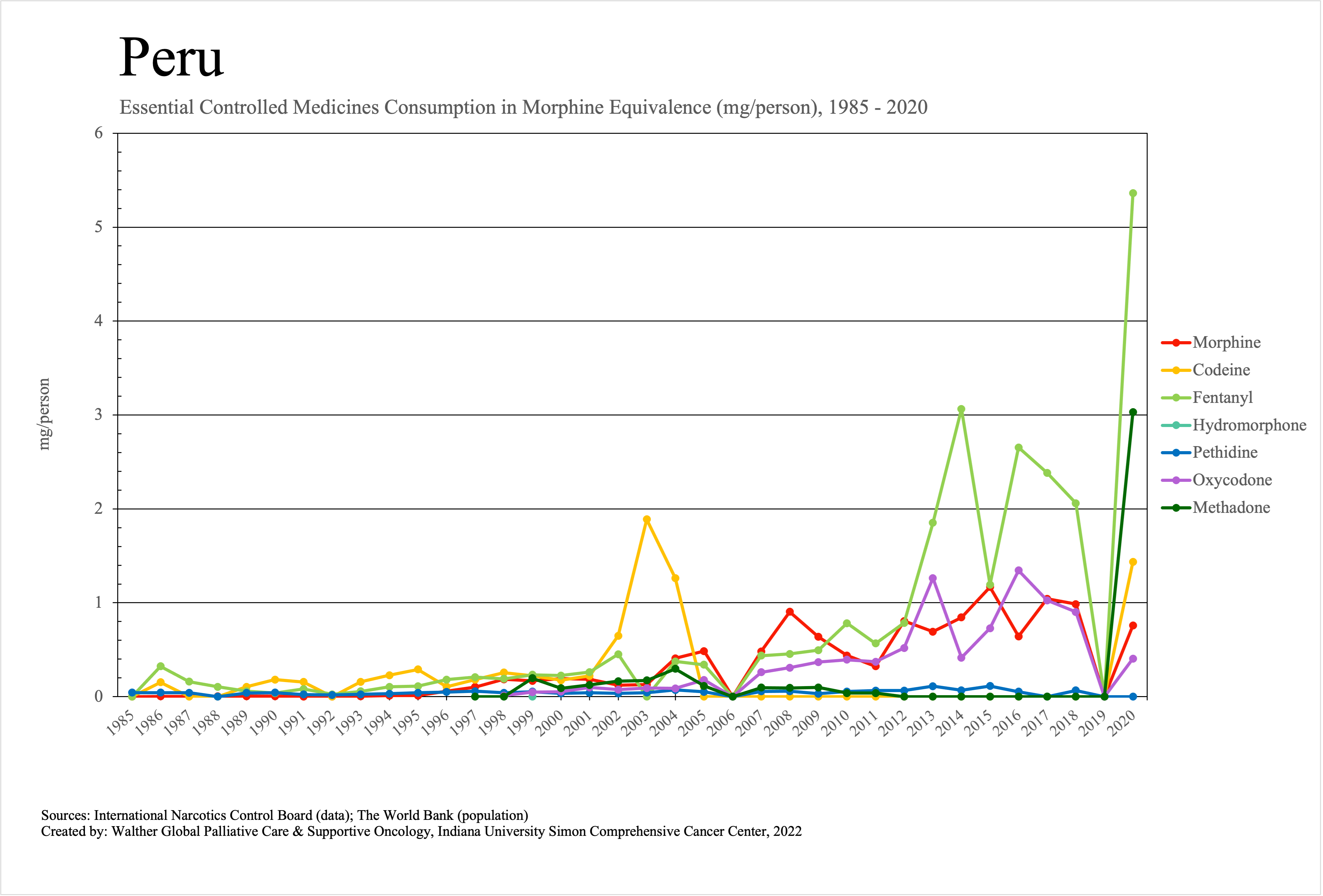 The graphs below provide the Essential Controlled Medicines consumption data trends from 1985 to 2020 in milligrams per capita and Morphine Equivalence (ME) milligrams per capita, as reported to the International Narcotics Control Board (INCB).