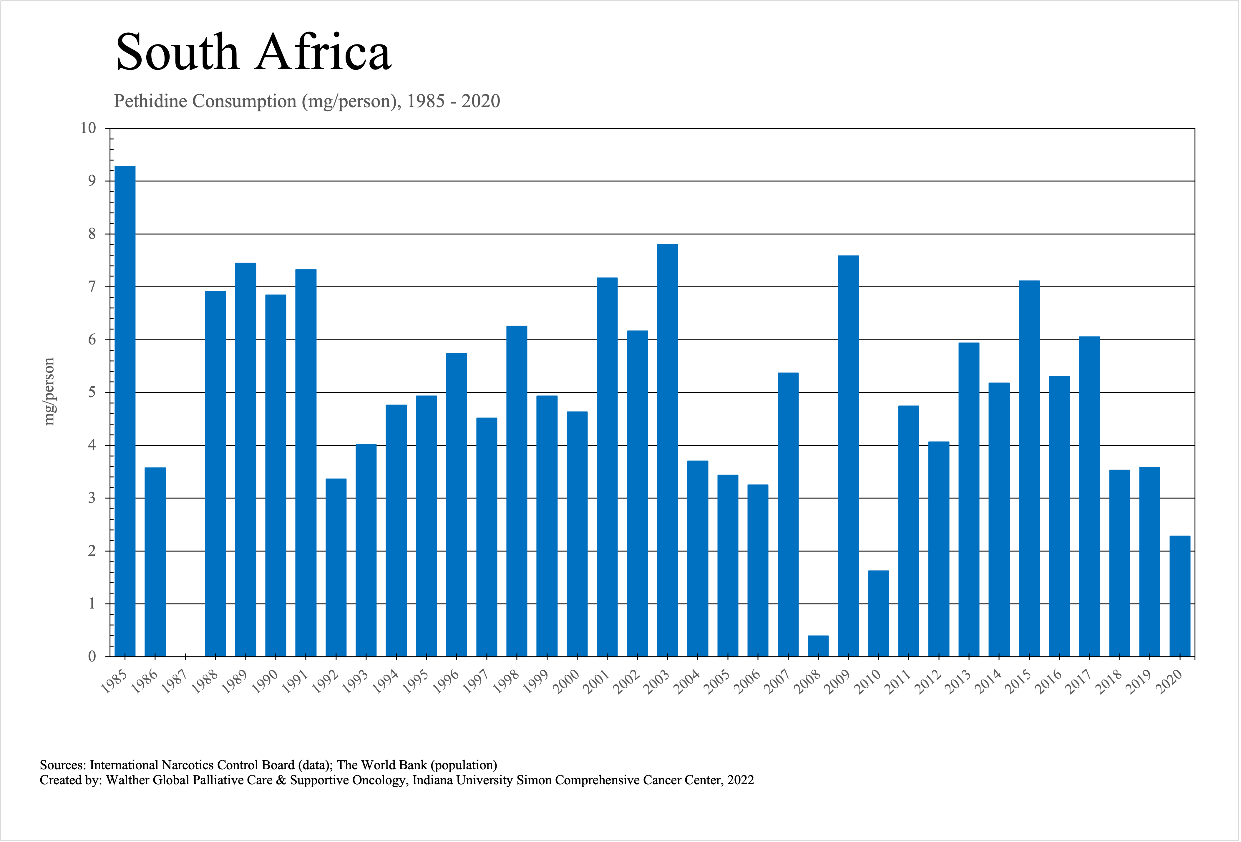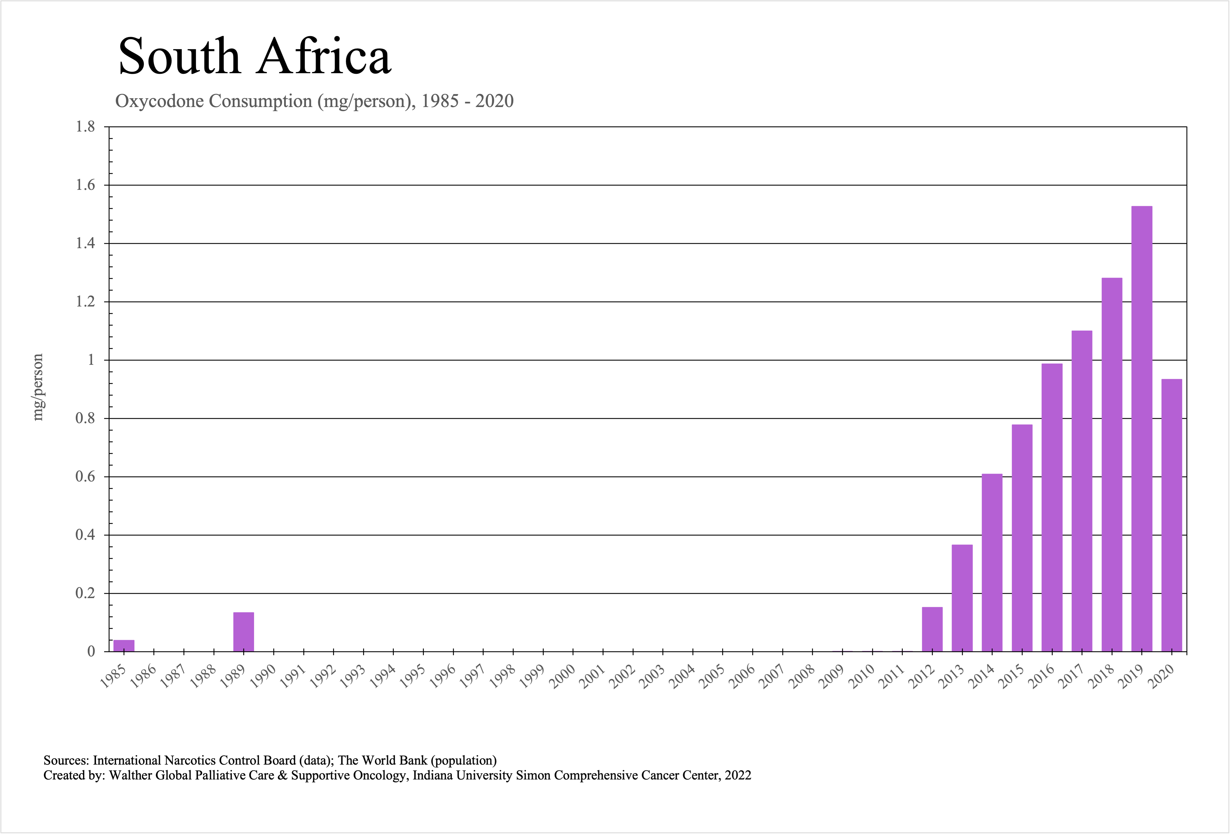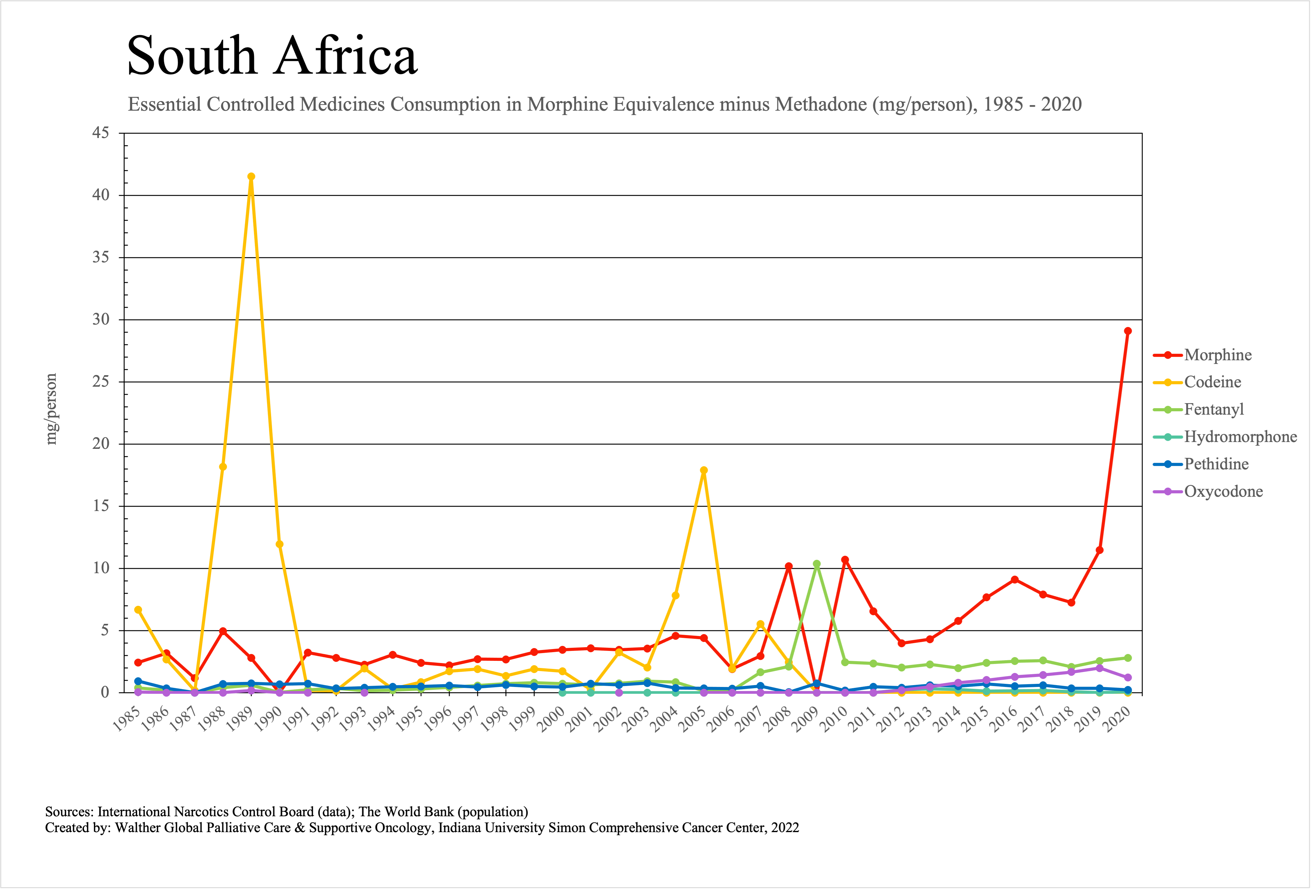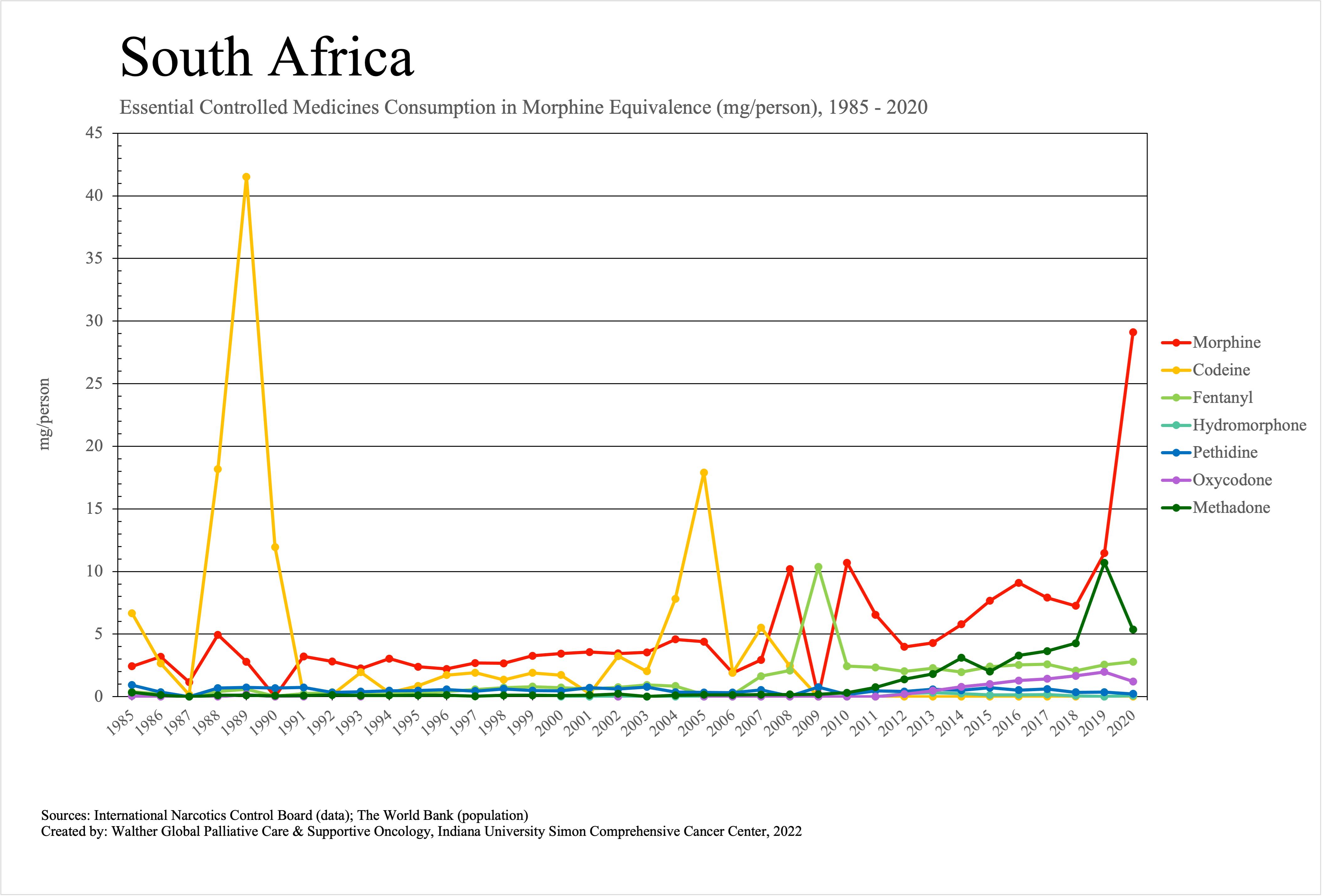 The graphs below provide the Essential Controlled Medicines consumption data trends from 1985 to 2020 in milligrams per capita and Morphine Equivalence (ME) milligrams per capita, as reported to the International Narcotics Control Board (INCB).