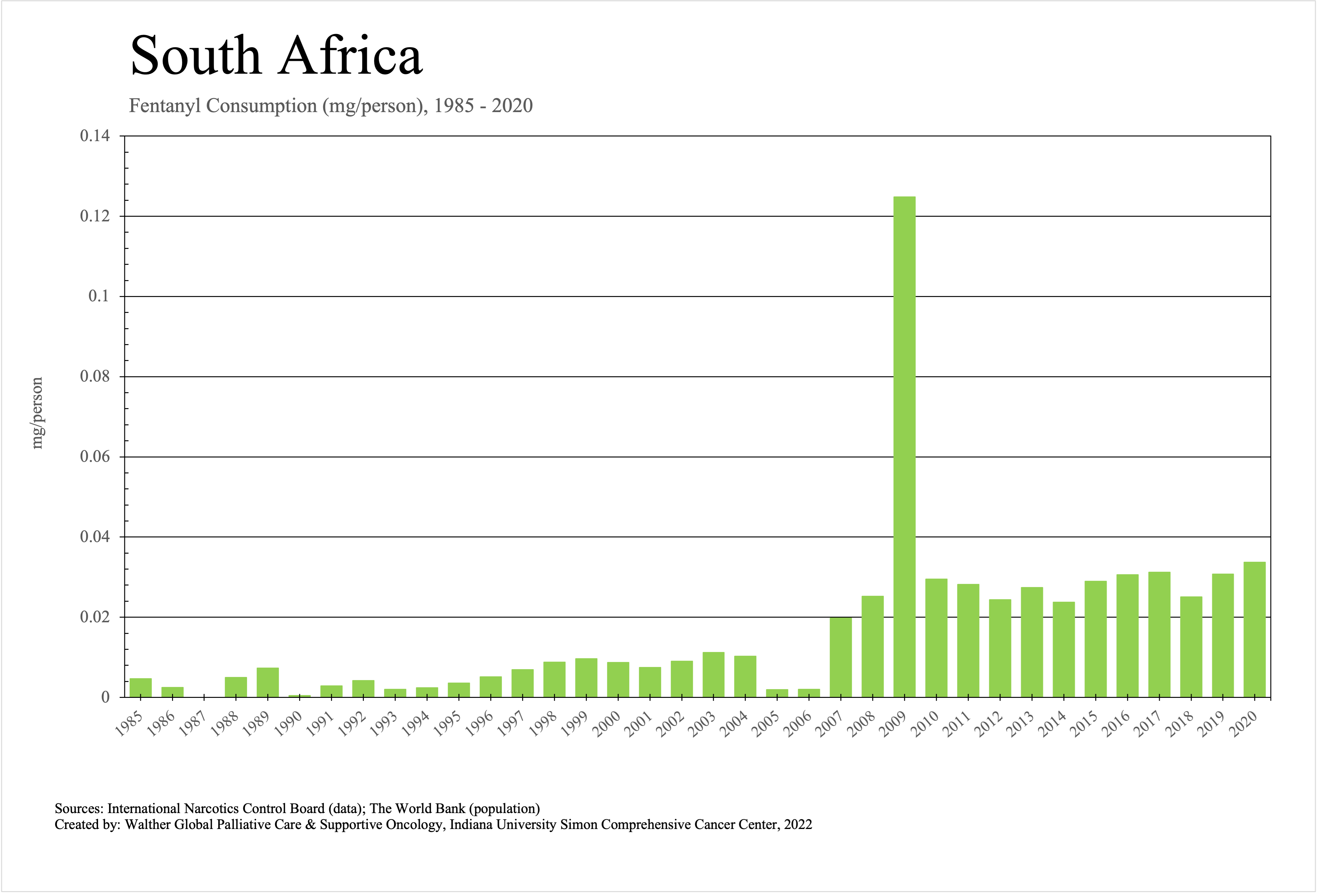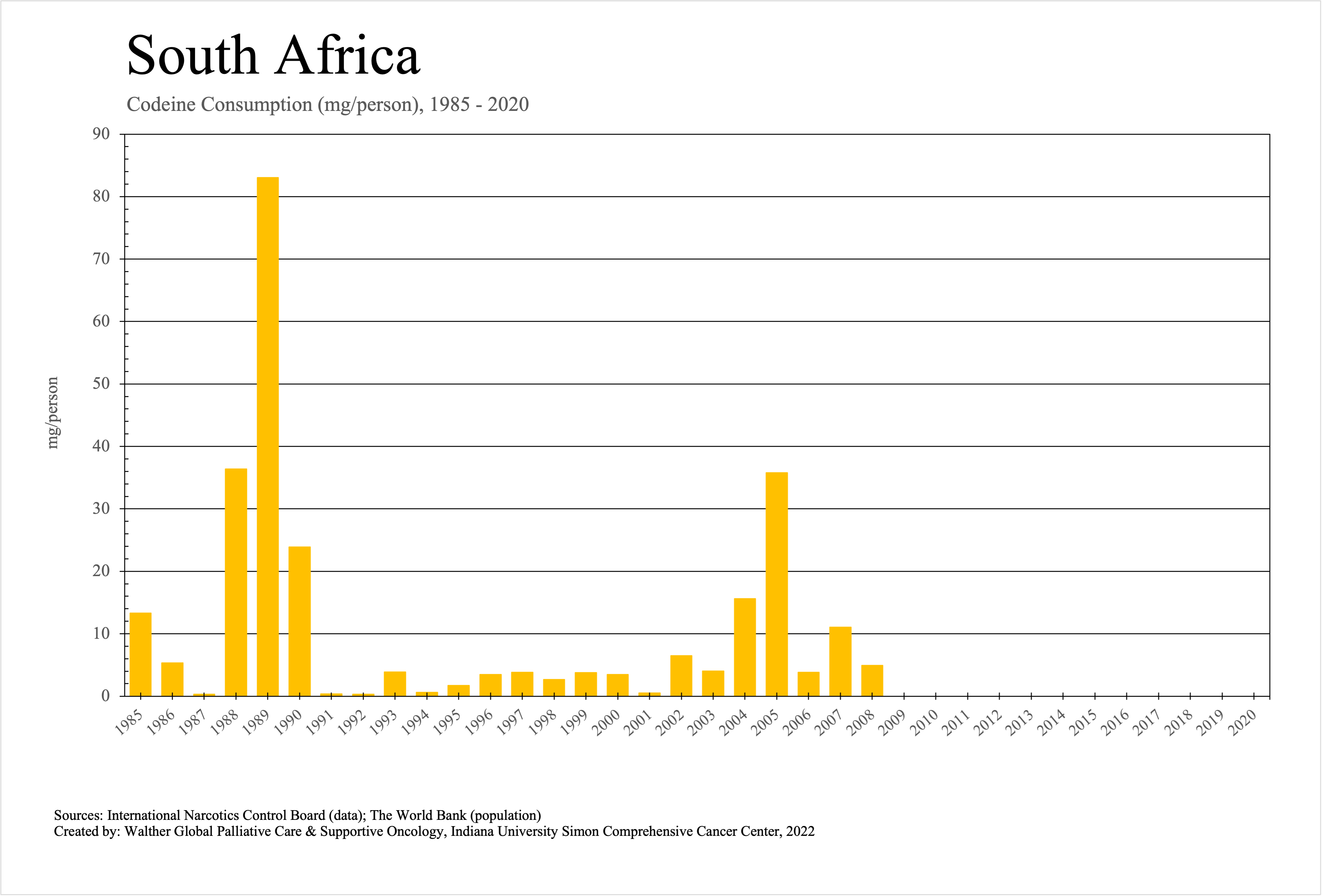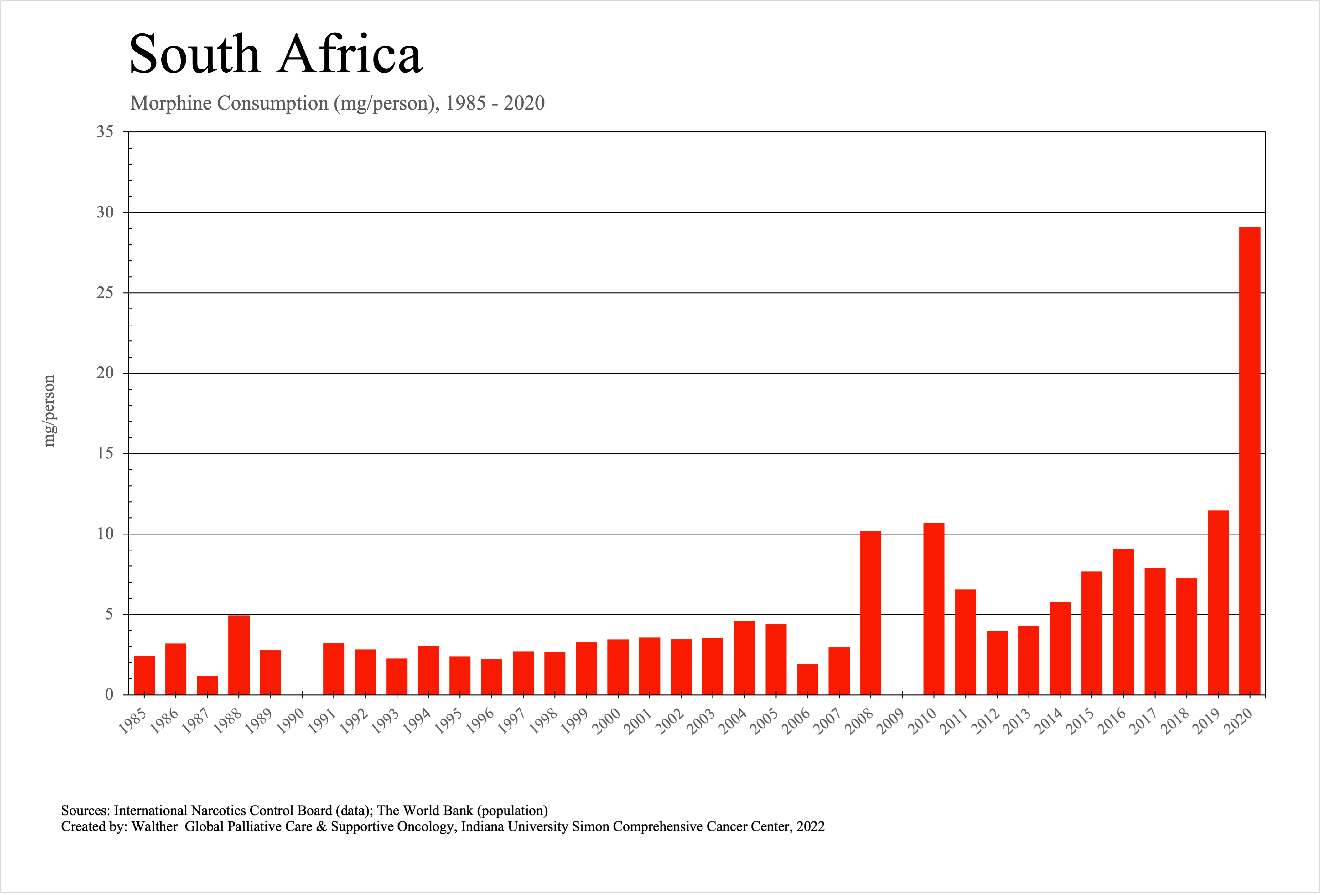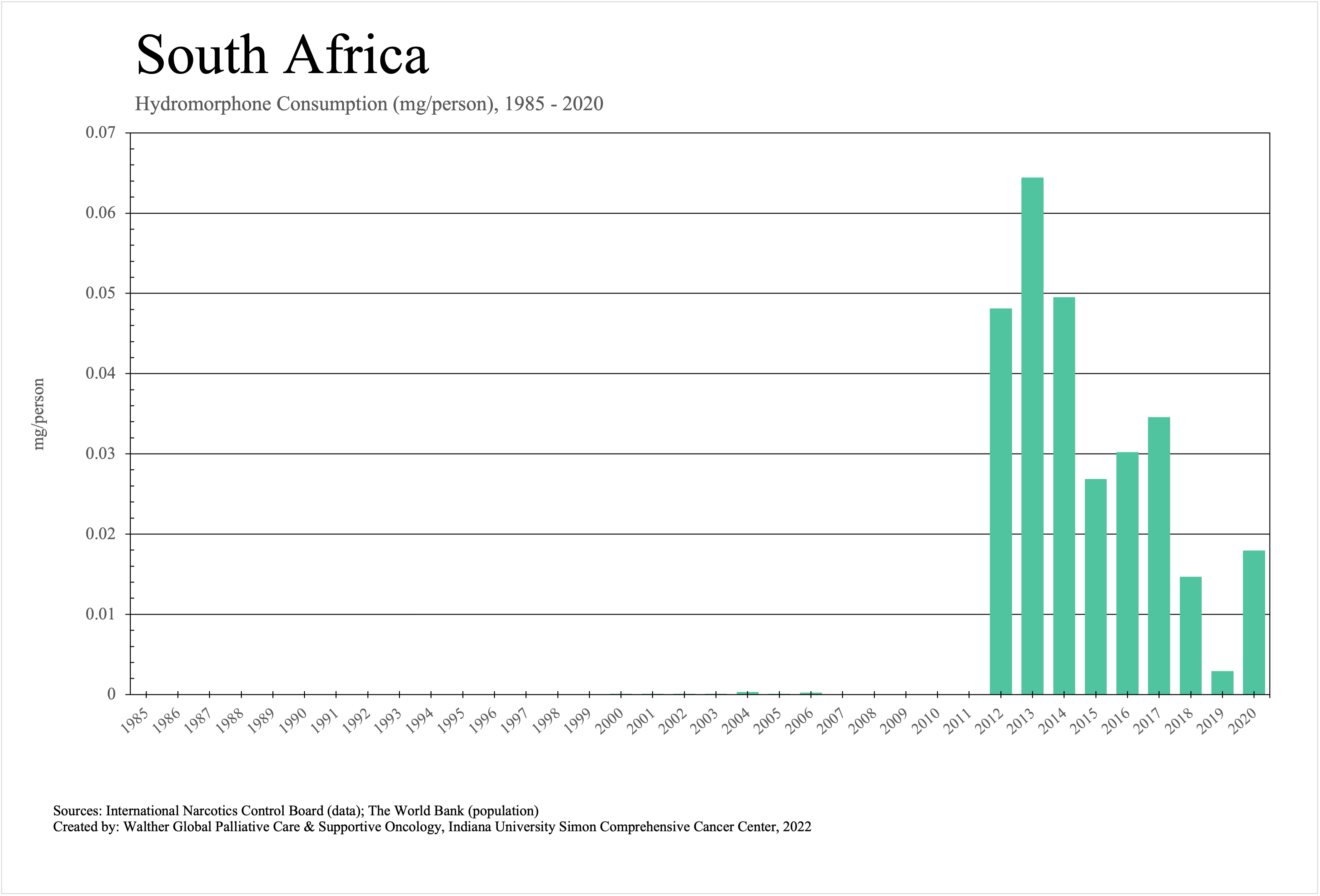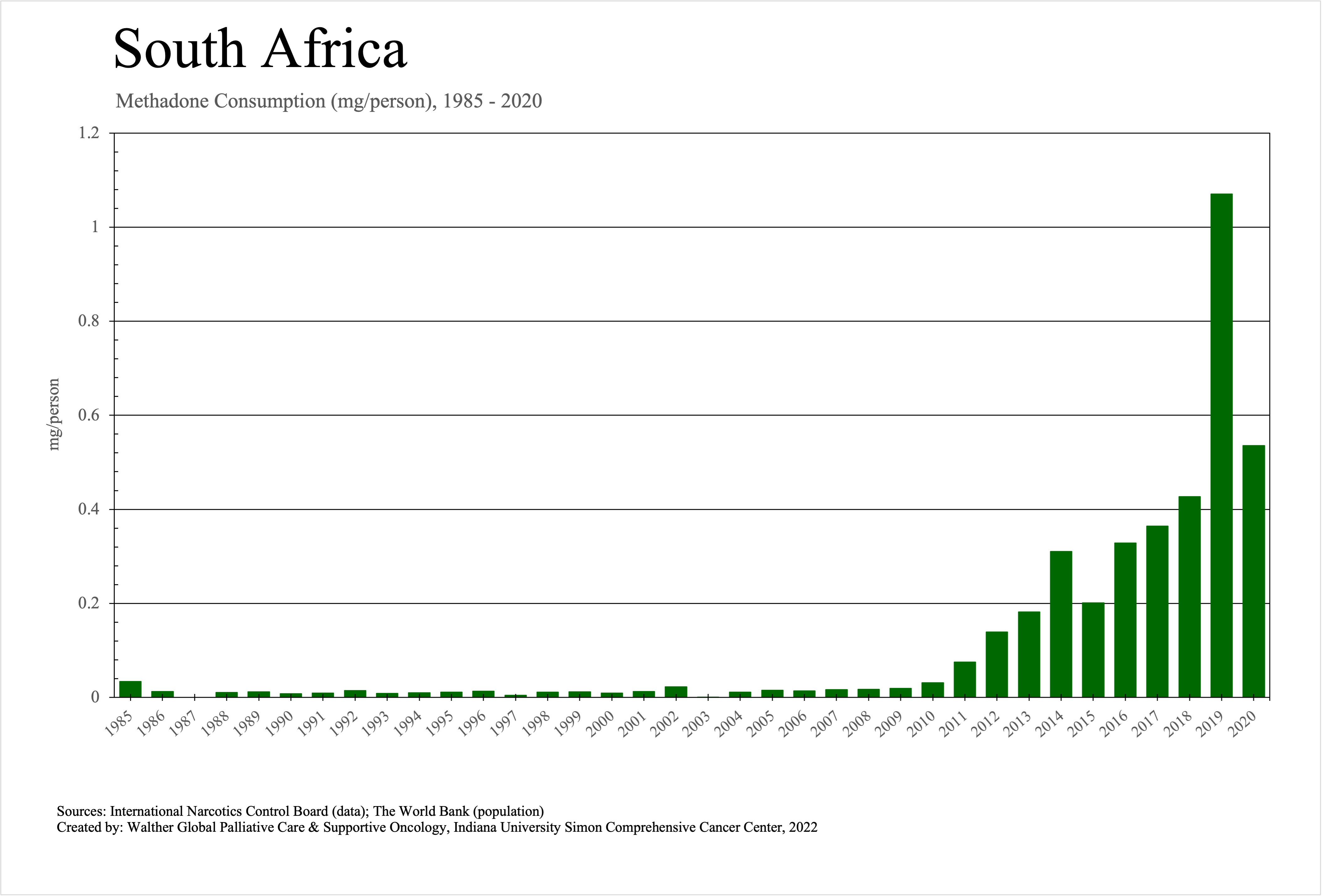The graphs below provide the Essential Controlled Medicines consumption data trends from 1985 to 2020 in milligrams per capita and Morphine Equivalence (ME) milligrams per capita, as reported to the International Narcotics Control Board (INCB).