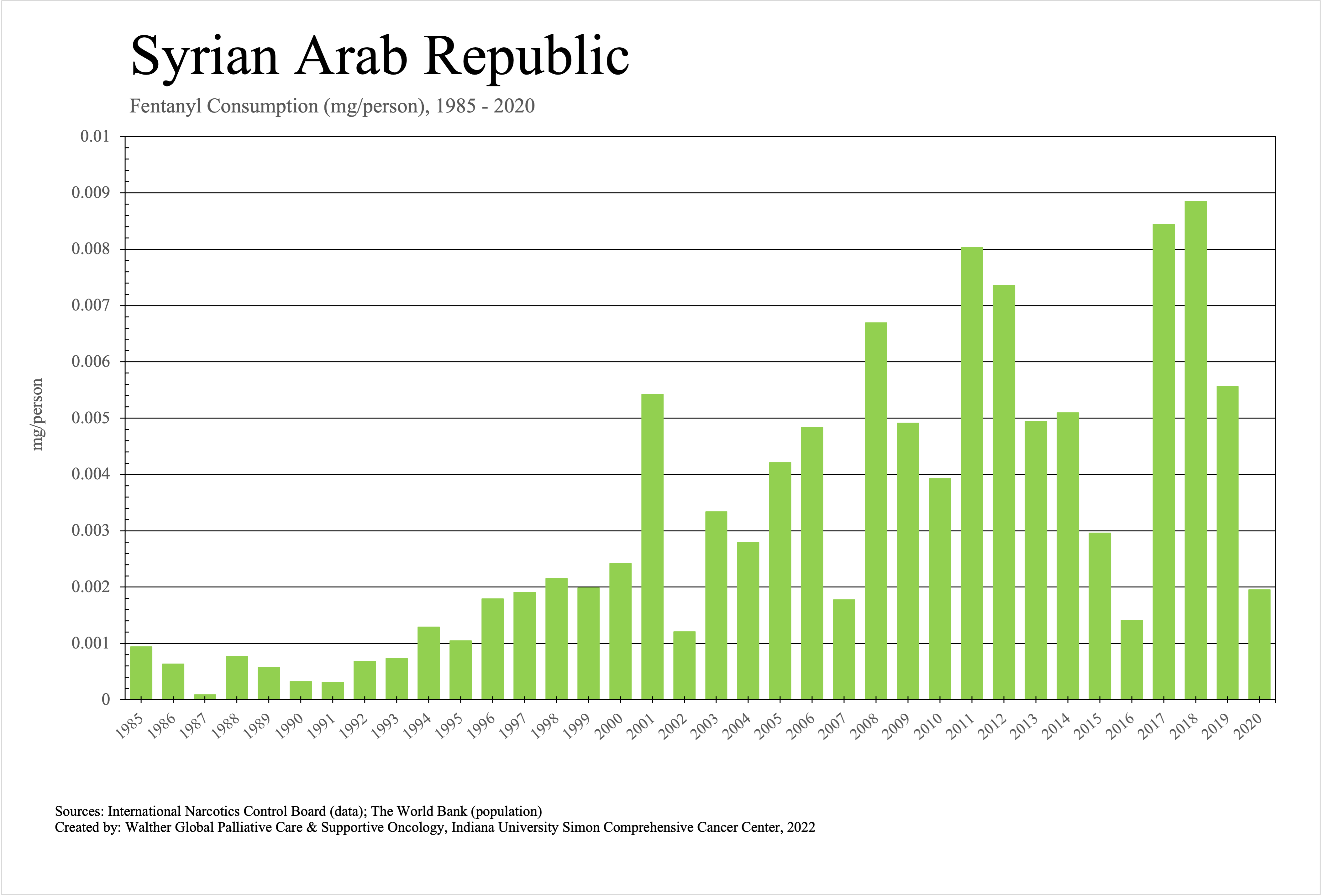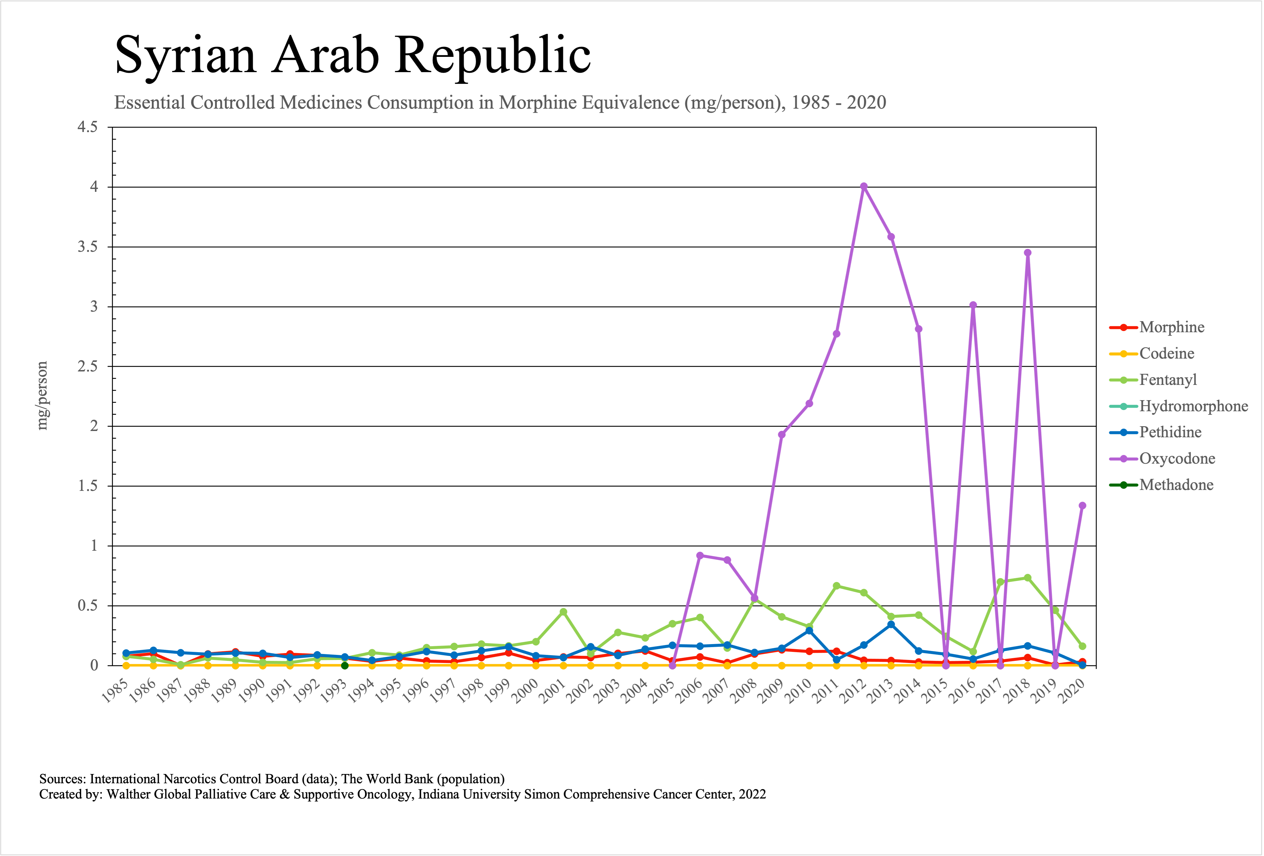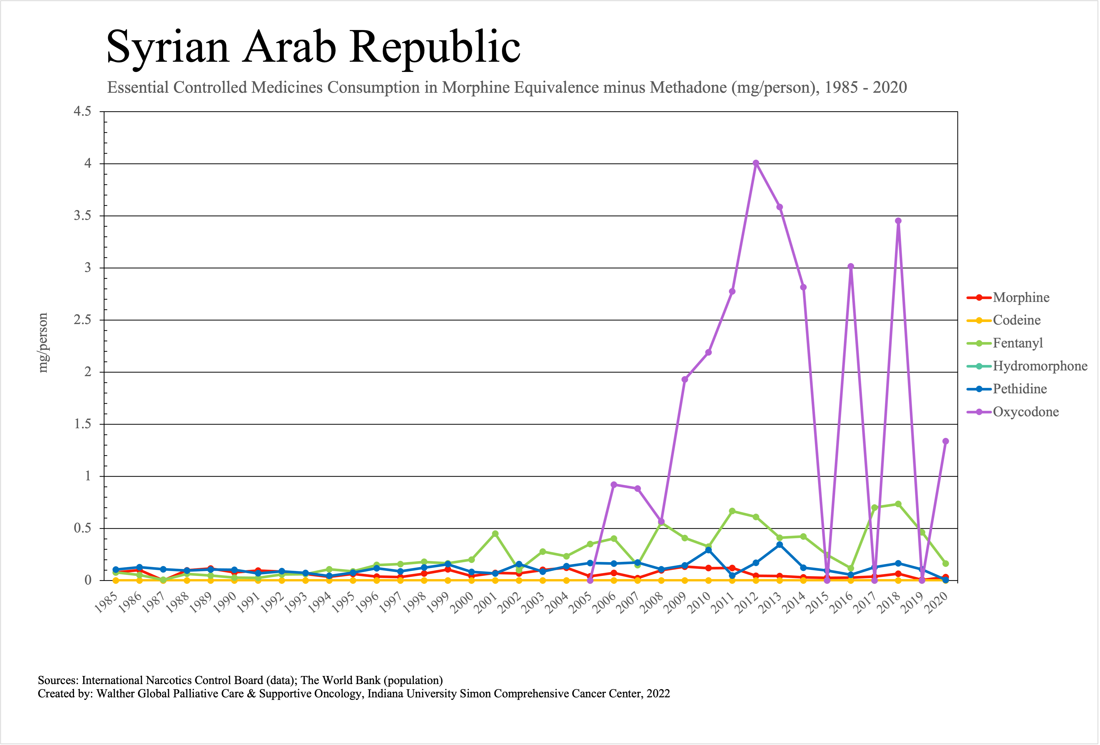 The graphs below provide the Essential Controlled Medicines consumption data trends from 1985 to 2020 in milligrams per capita and Morphine Equivalence (ME) milligrams per capita, as reported to the International Narcotics Control Board (INCB).