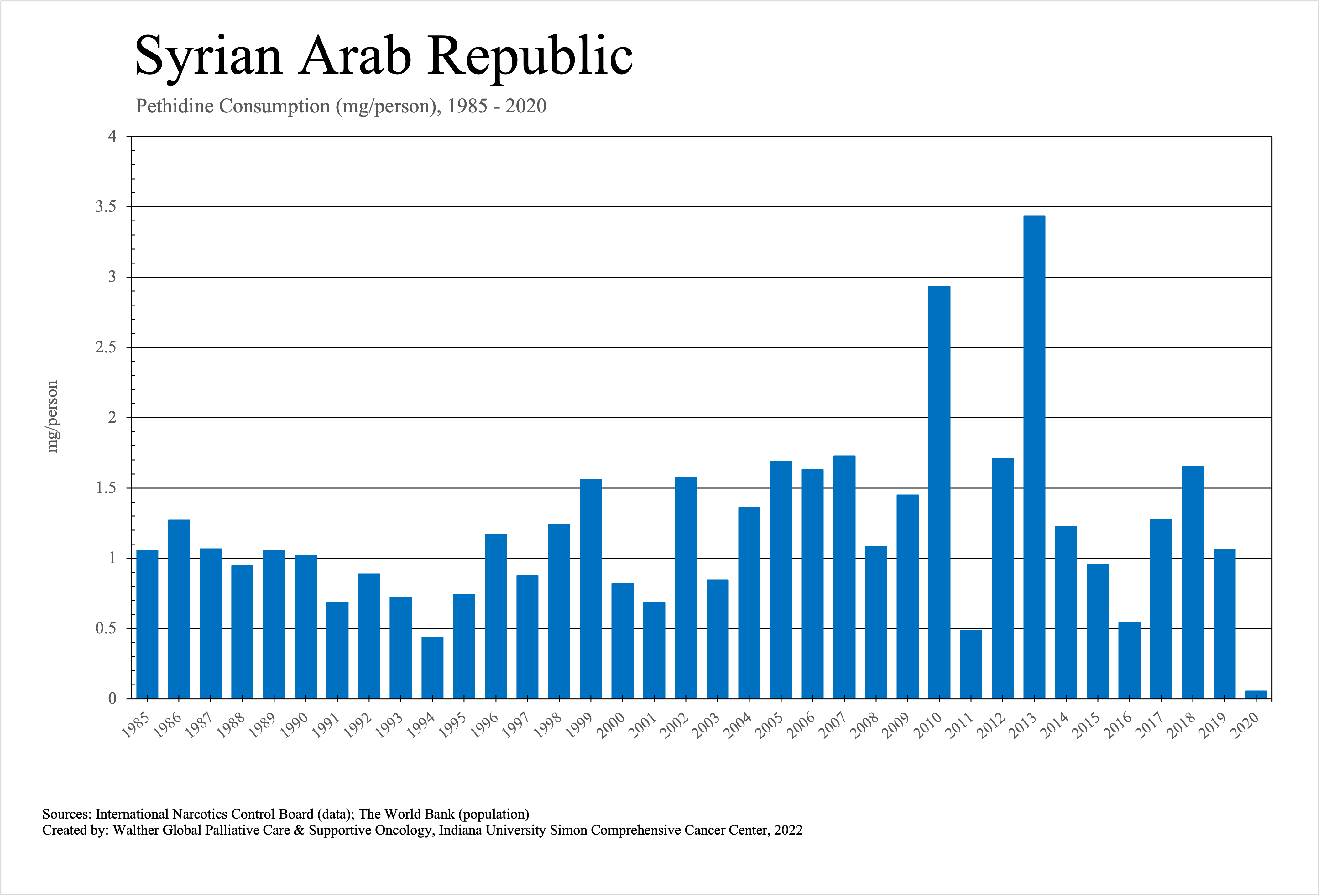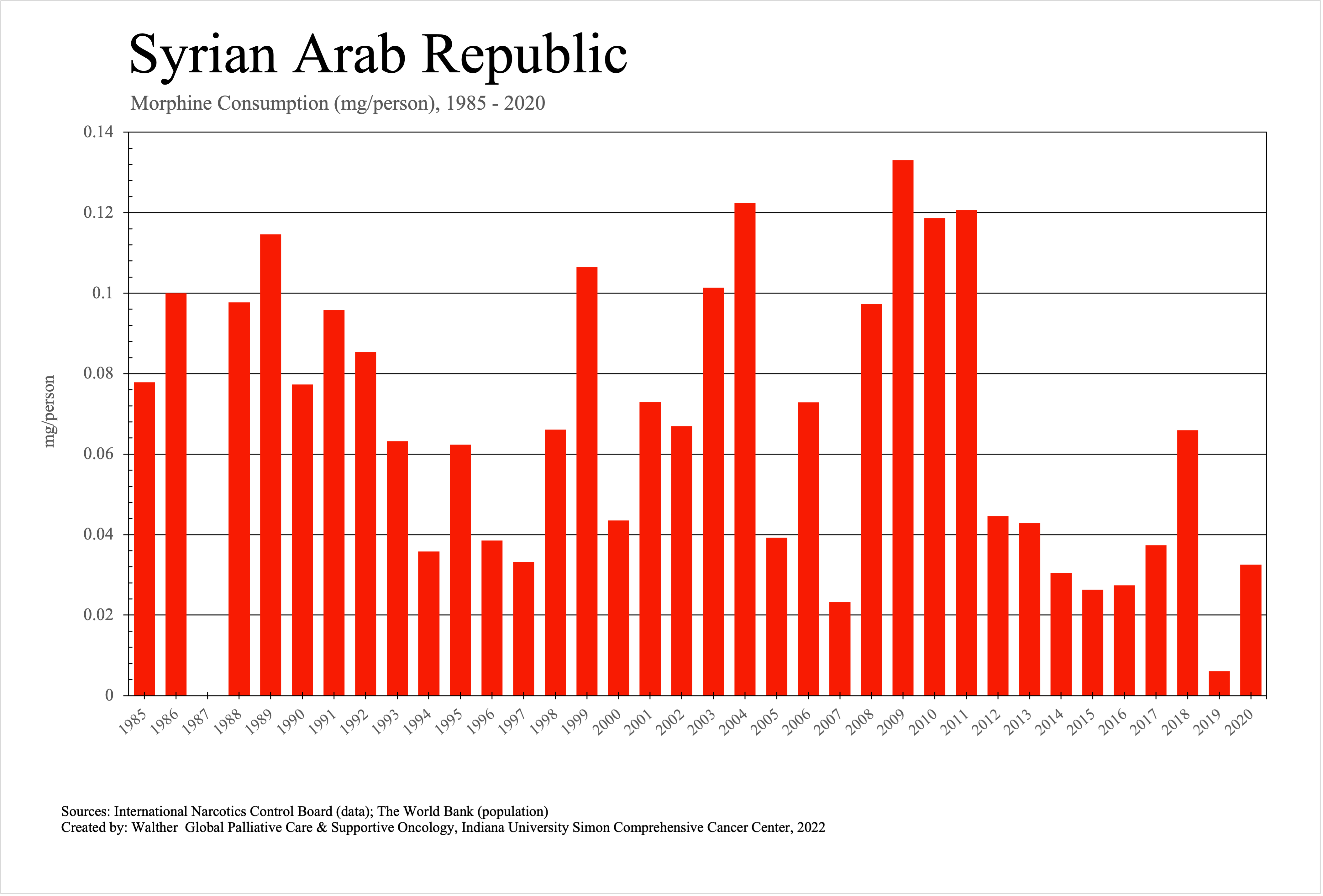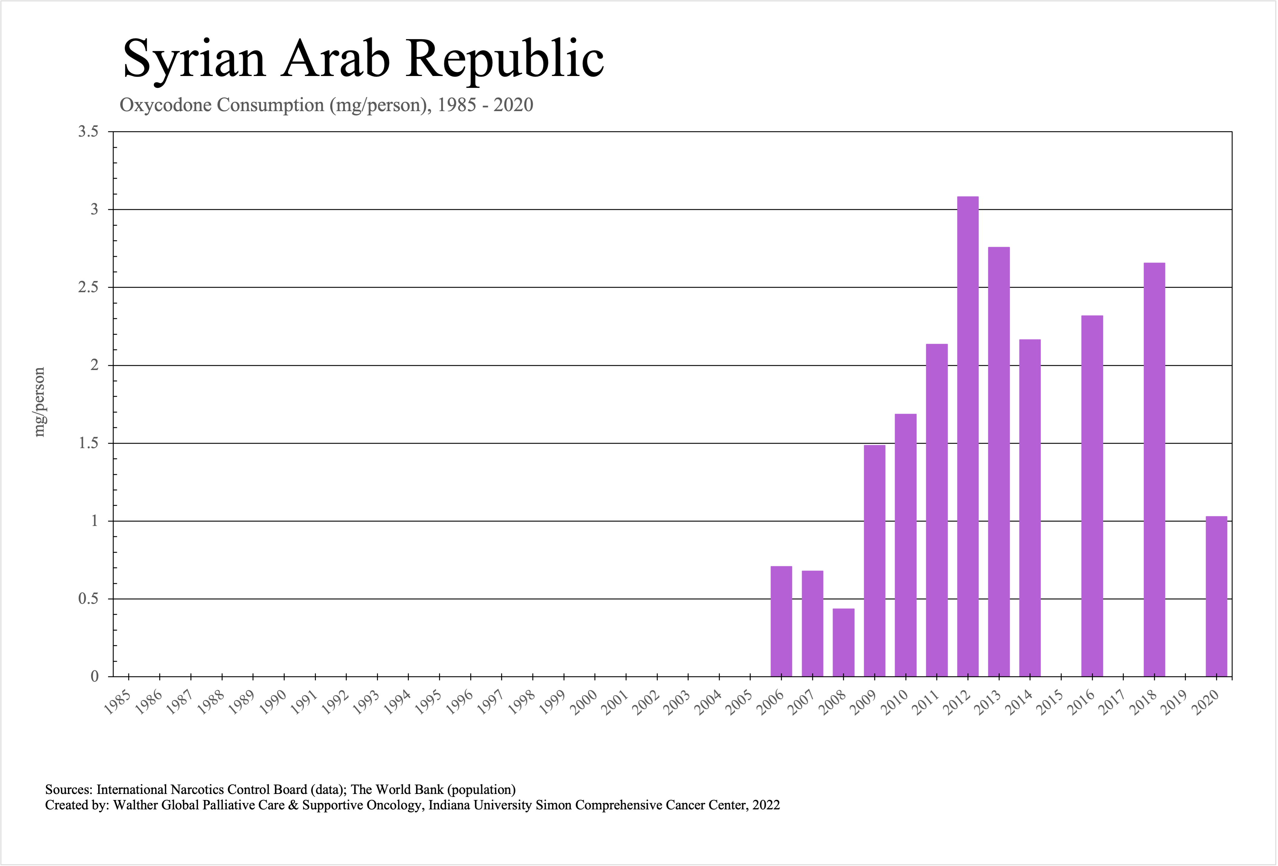 The graphs below provide the Essential Controlled Medicines consumption data trends from 1985 to 2020 in milligrams per capita and Morphine Equivalence (ME) milligrams per capita, as reported to the International Narcotics Control Board (INCB).