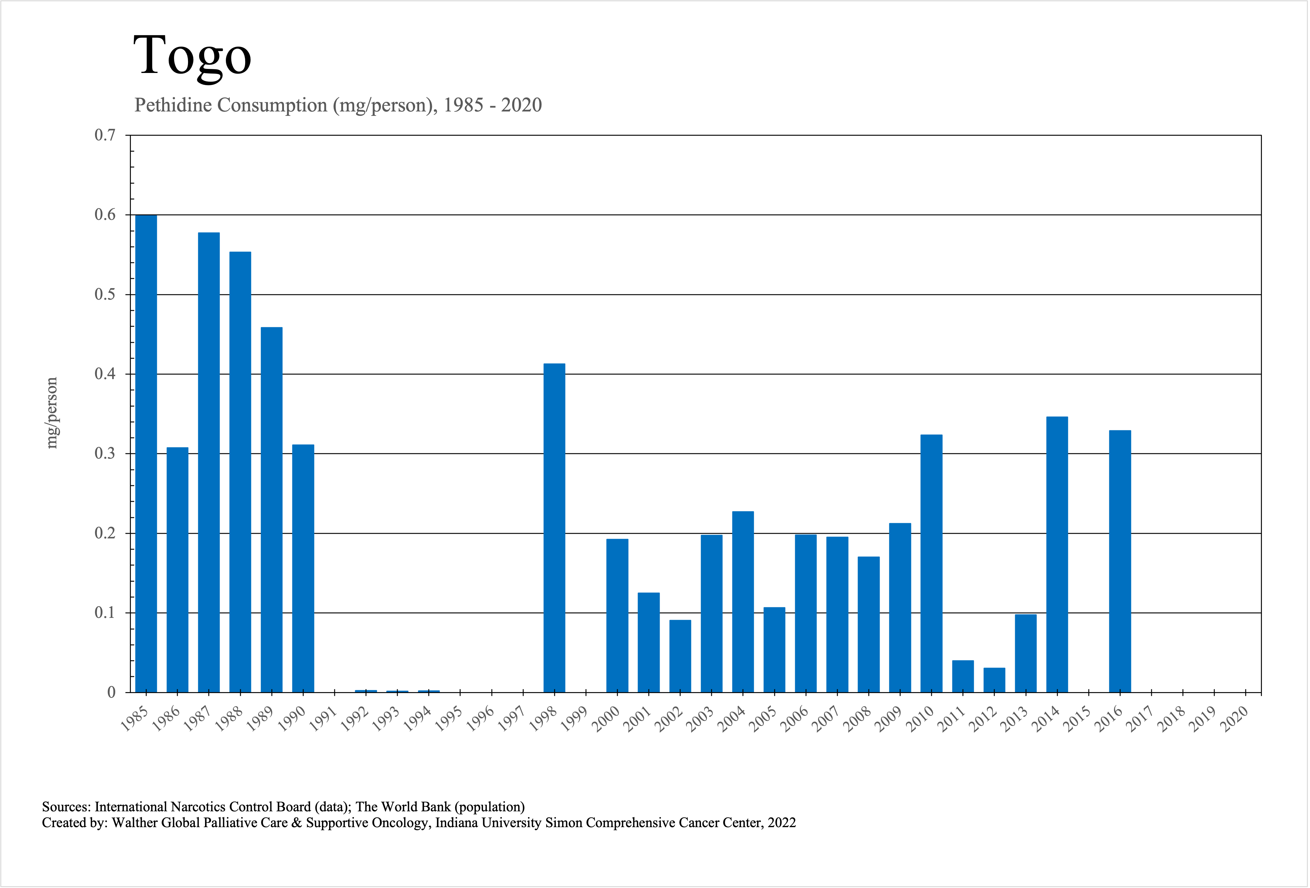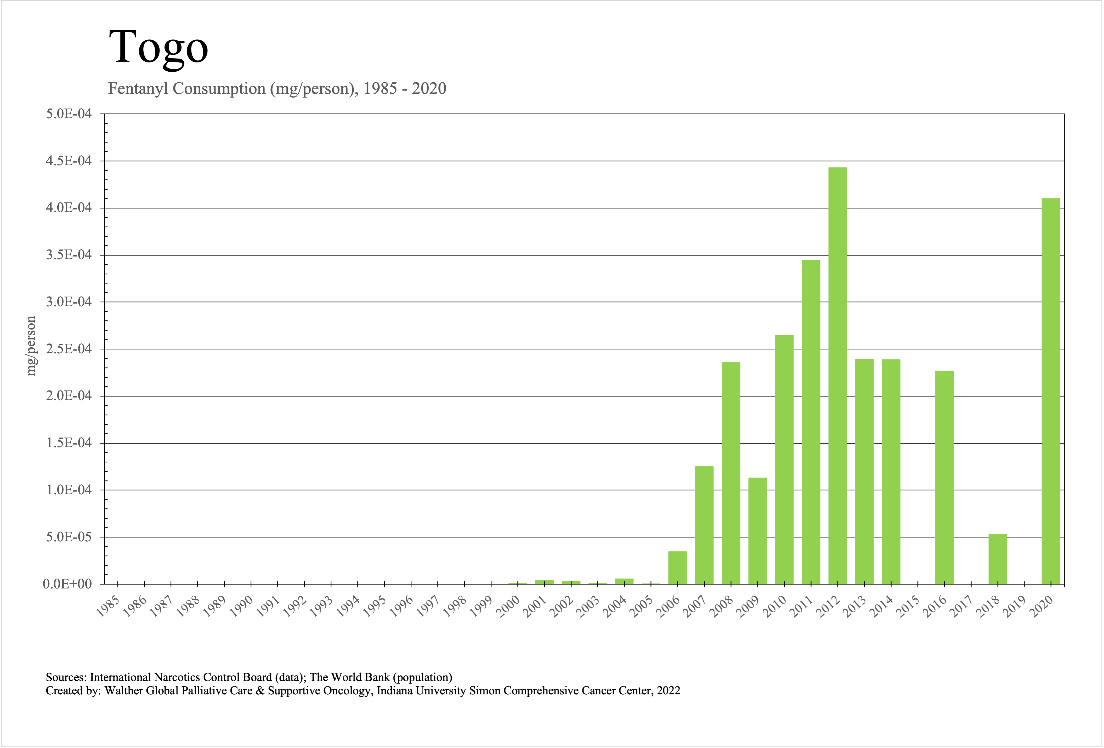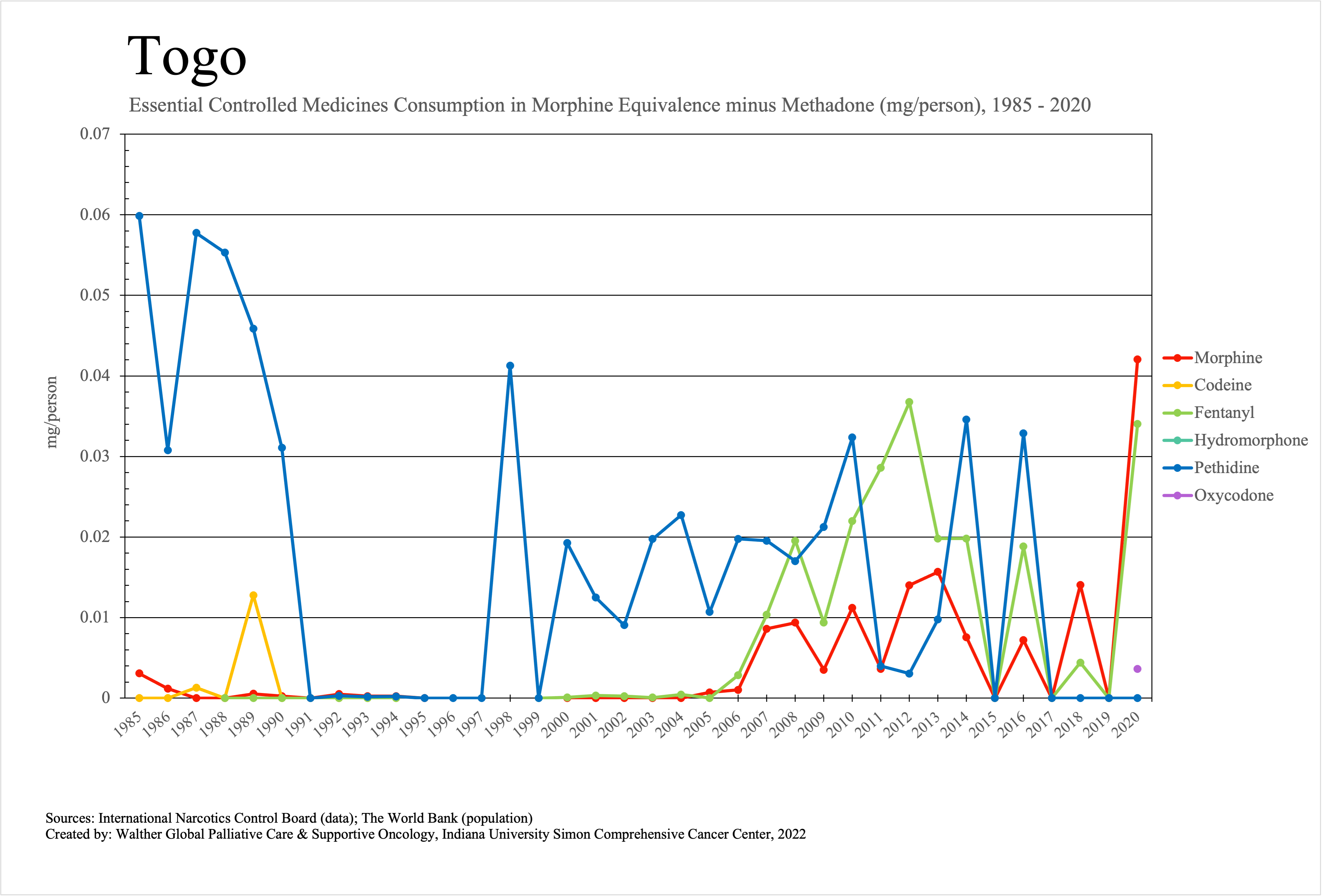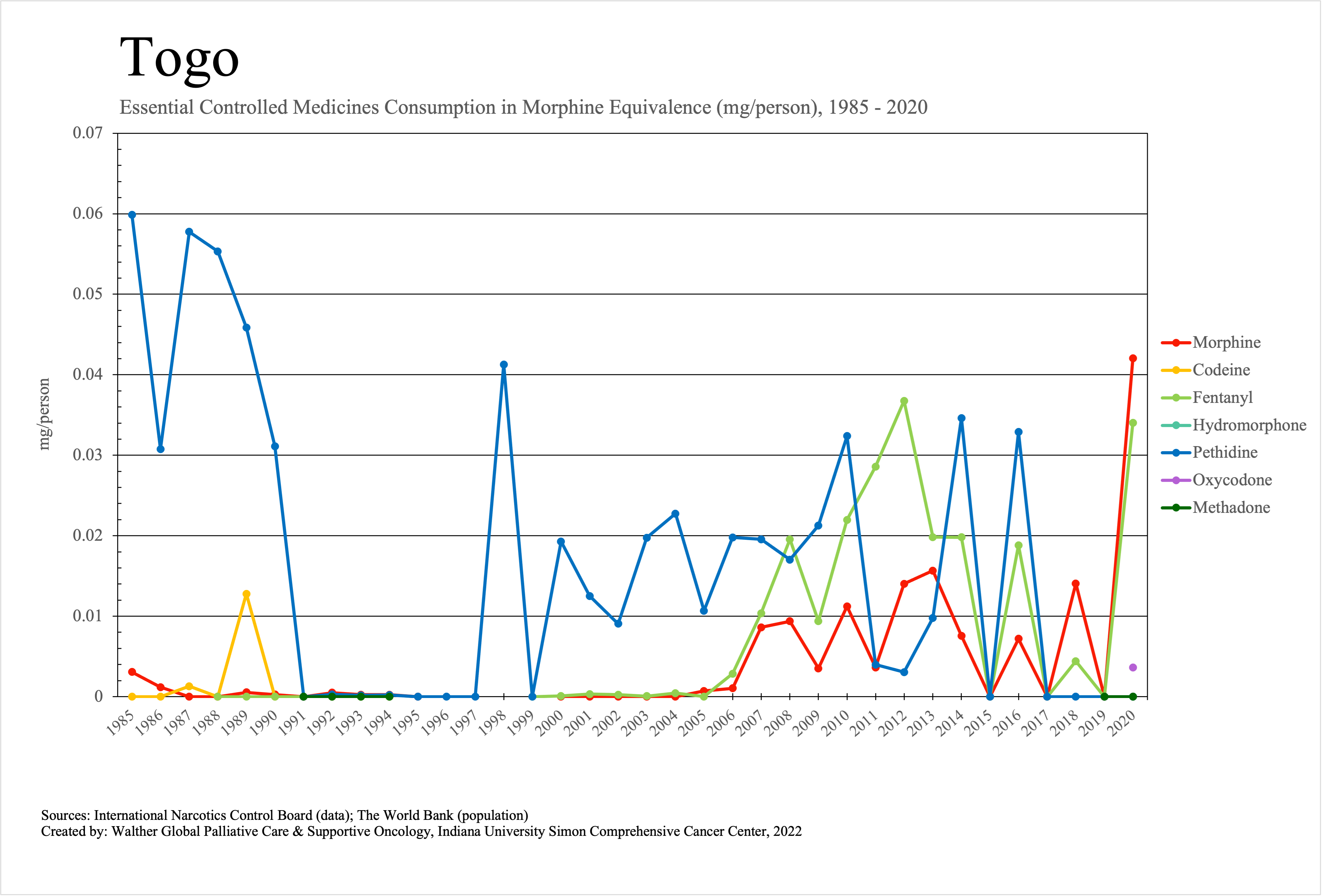 The graphs below provide the Essential Controlled Medicines consumption data trends from 1985 to 2020 in milligrams per capita and Morphine Equivalence (ME) milligrams per capita, as reported to the International Narcotics Control Board (INCB).
