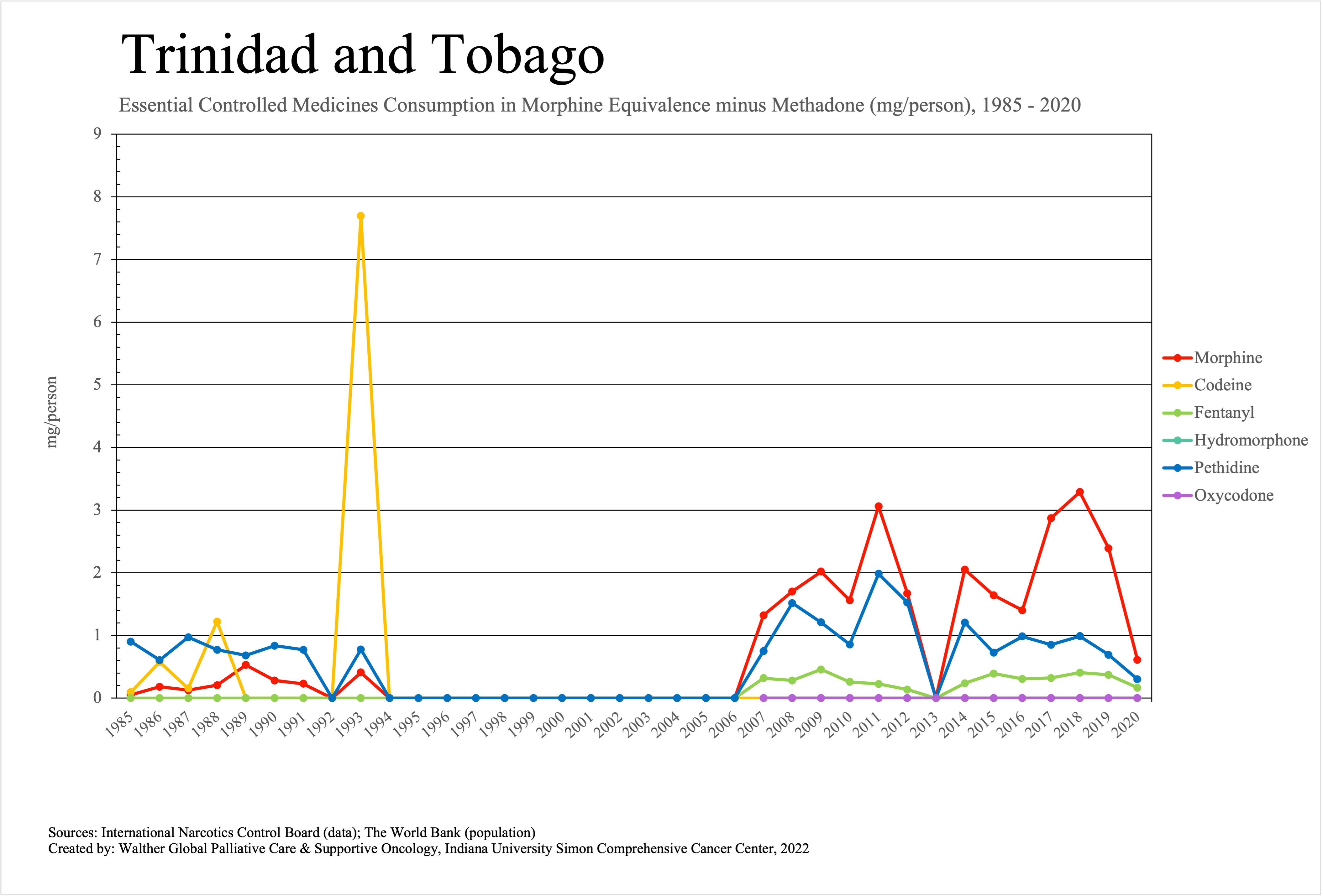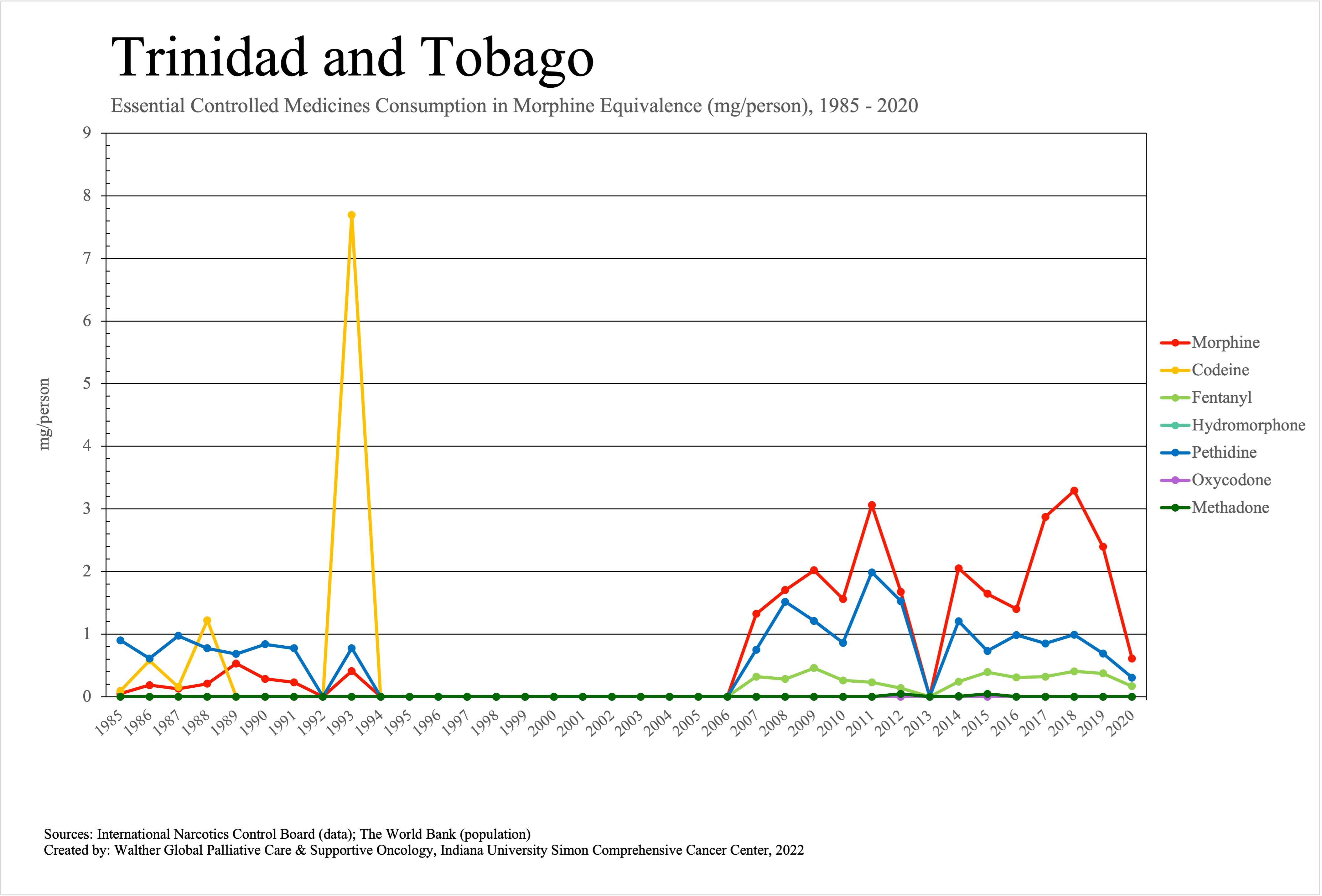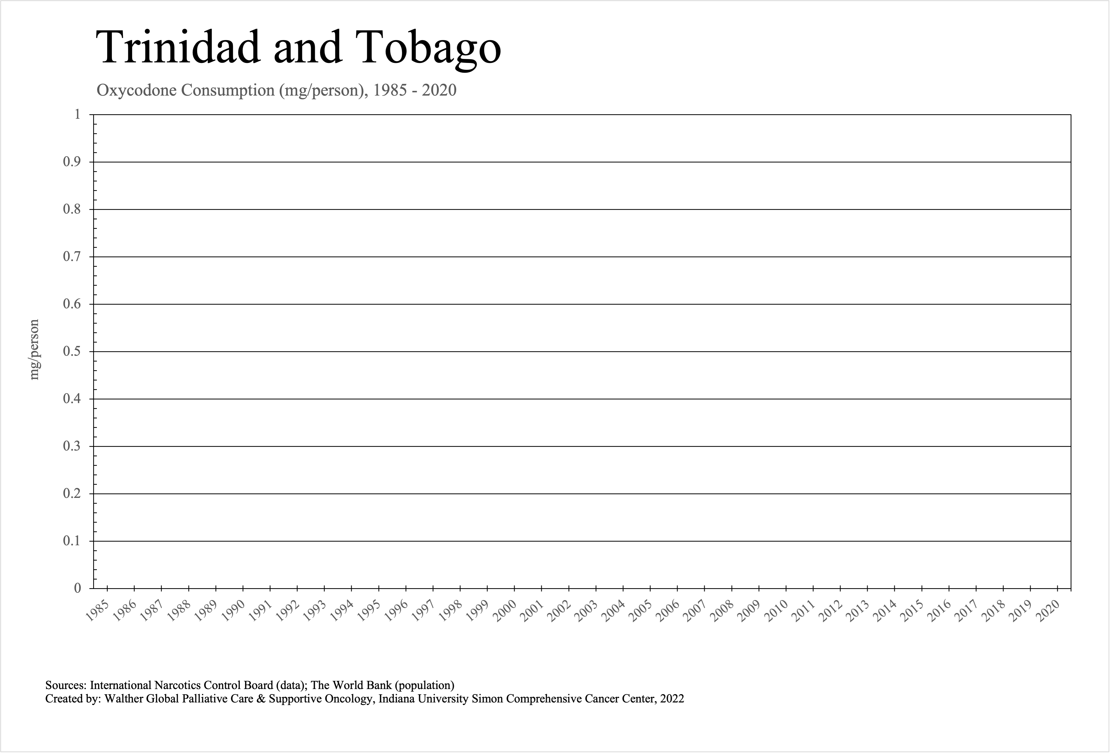The graphs below provide the Essential Controlled Medicines consumption data trends from 1985 to 2020 in milligrams per capita and Morphine Equivalence (ME) milligrams per capita, as reported to the International Narcotics Control Board (INCB).