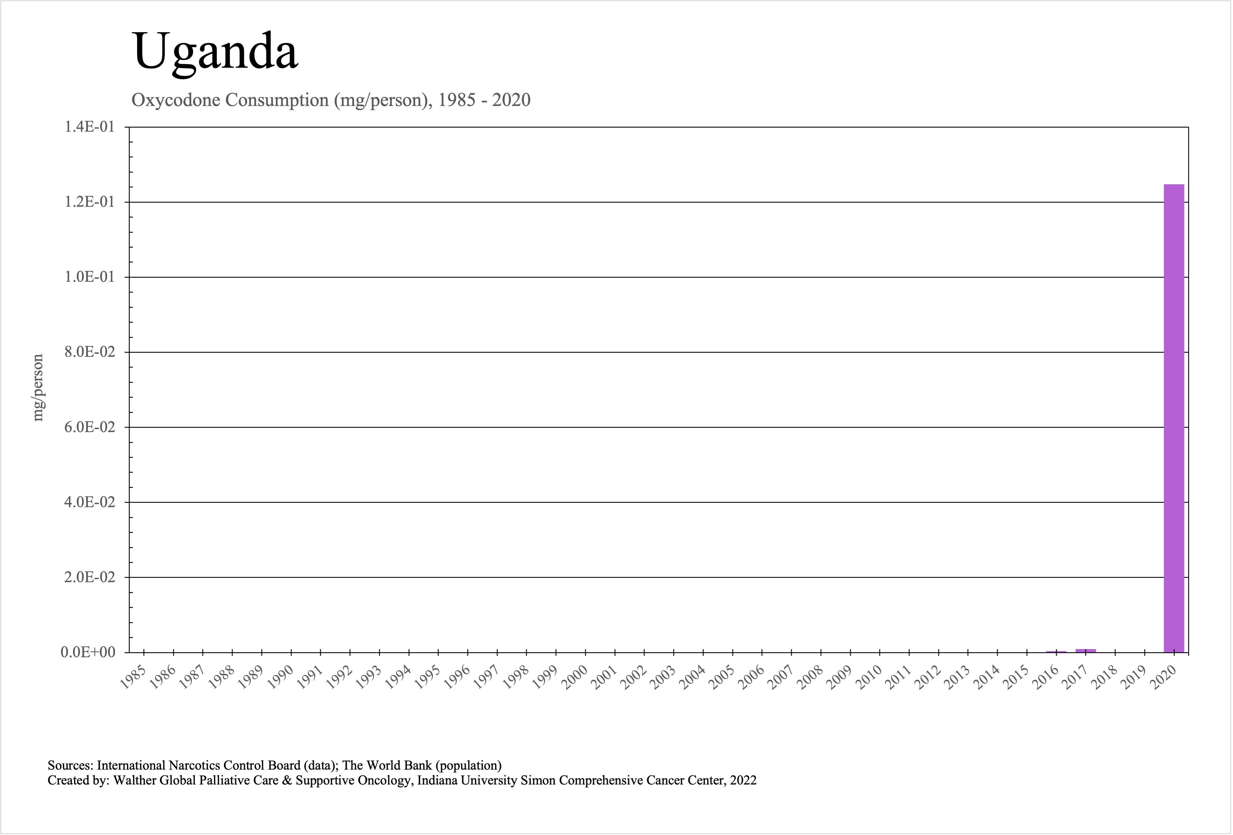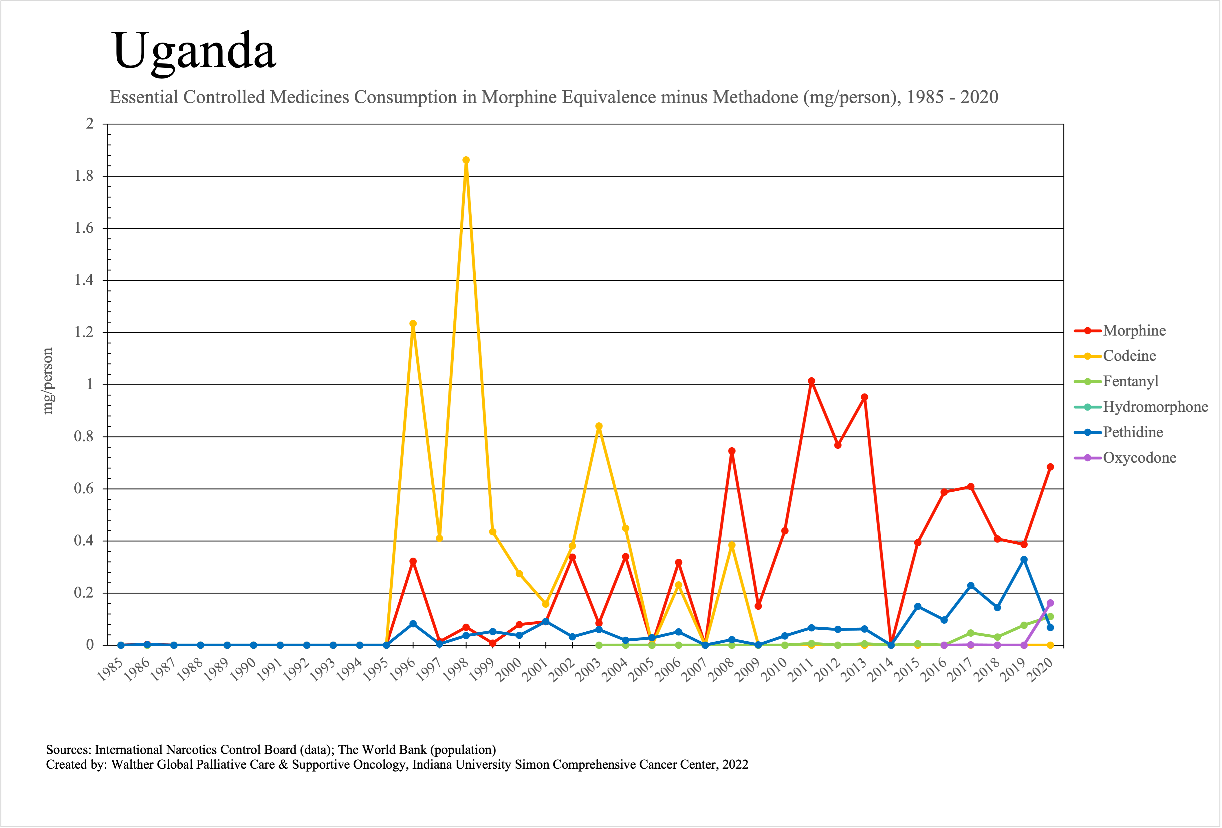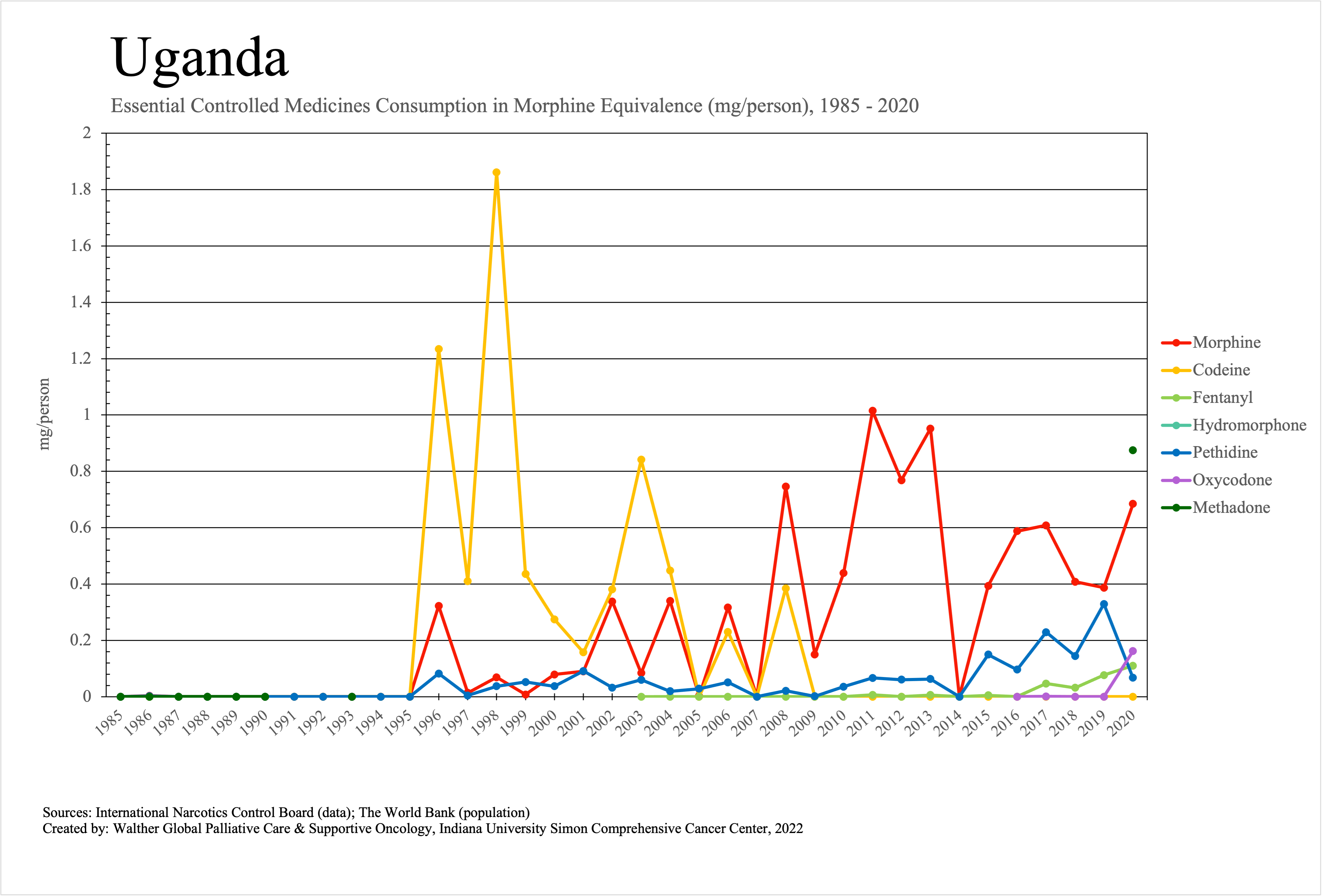 The graphs below provide the Essential Controlled Medicines consumption data trends from 1985 to 2020 in milligrams per capita and Morphine Equivalence (ME) milligrams per capita, as reported to the International Narcotics Control Board (INCB).