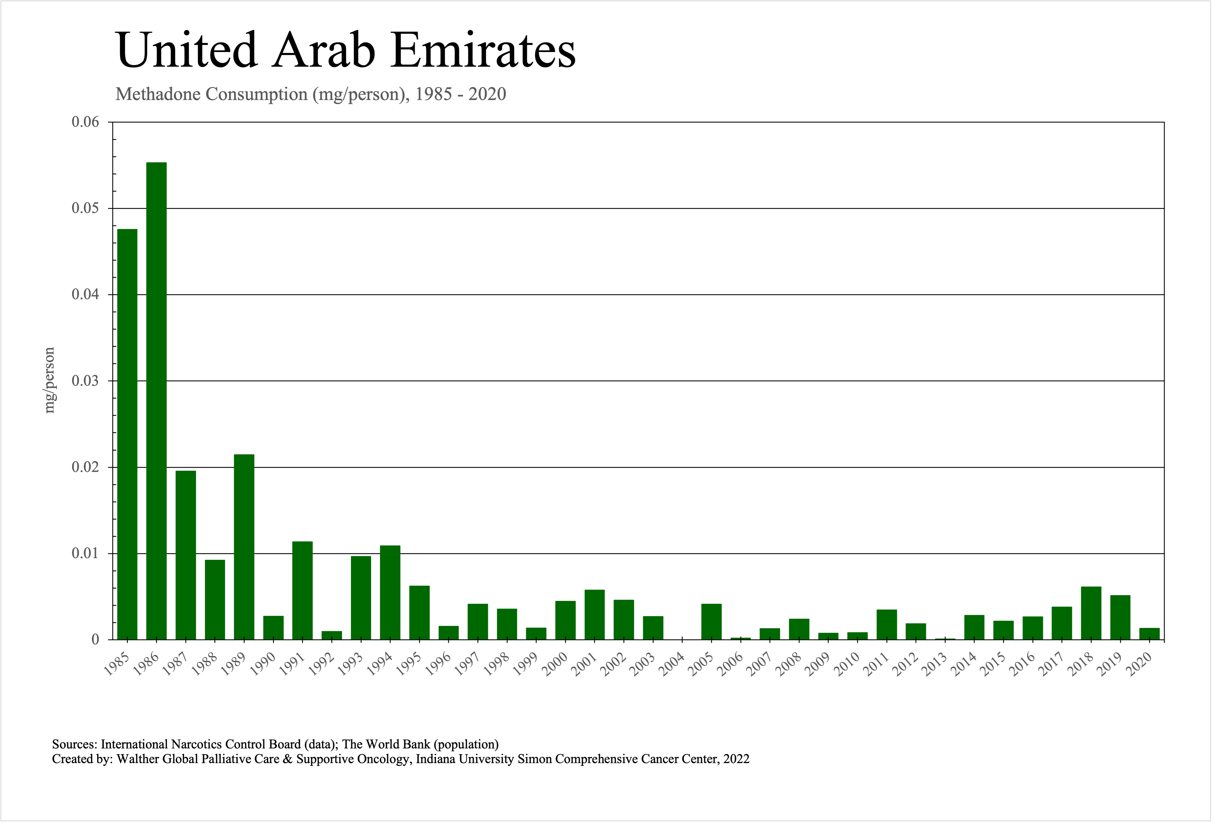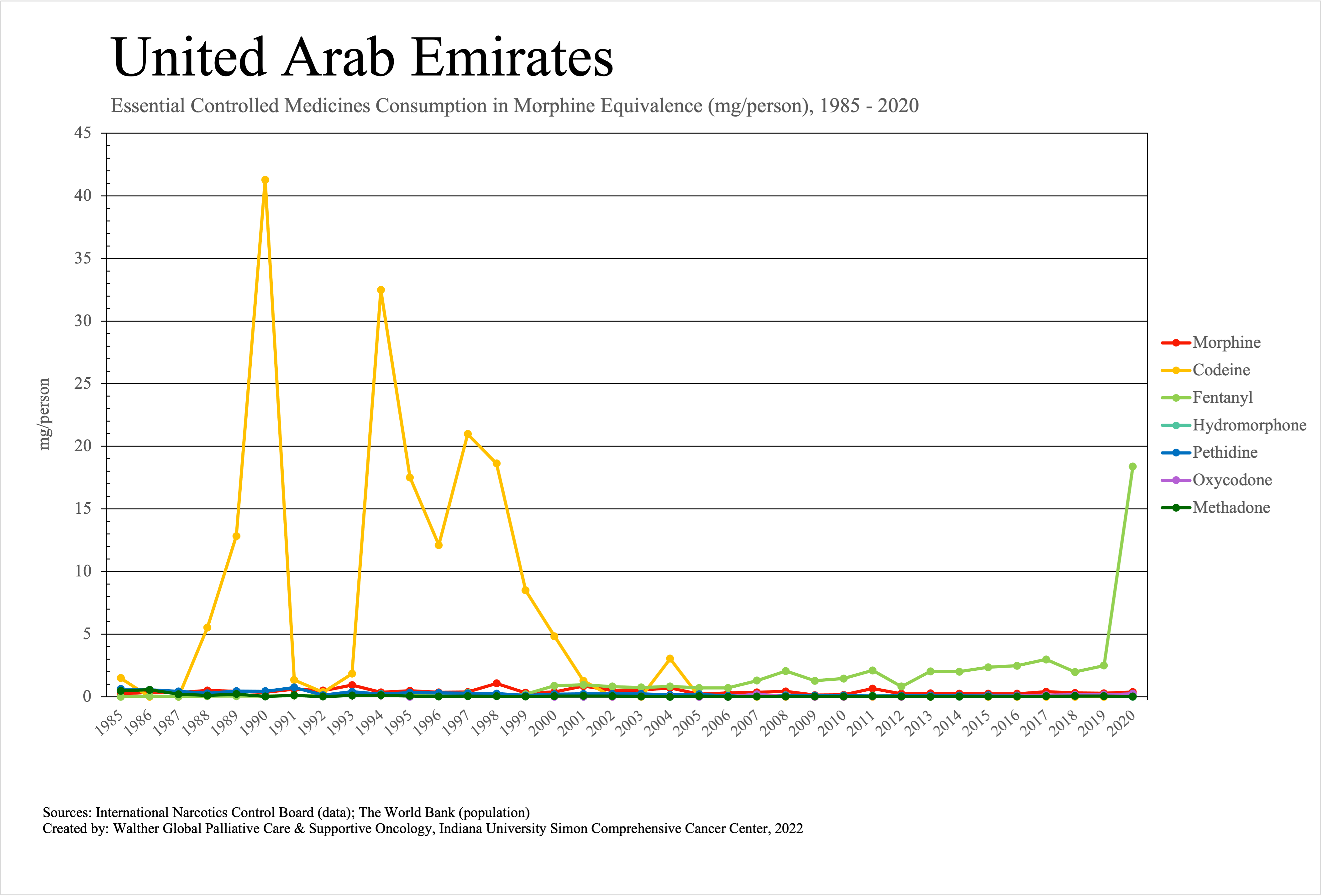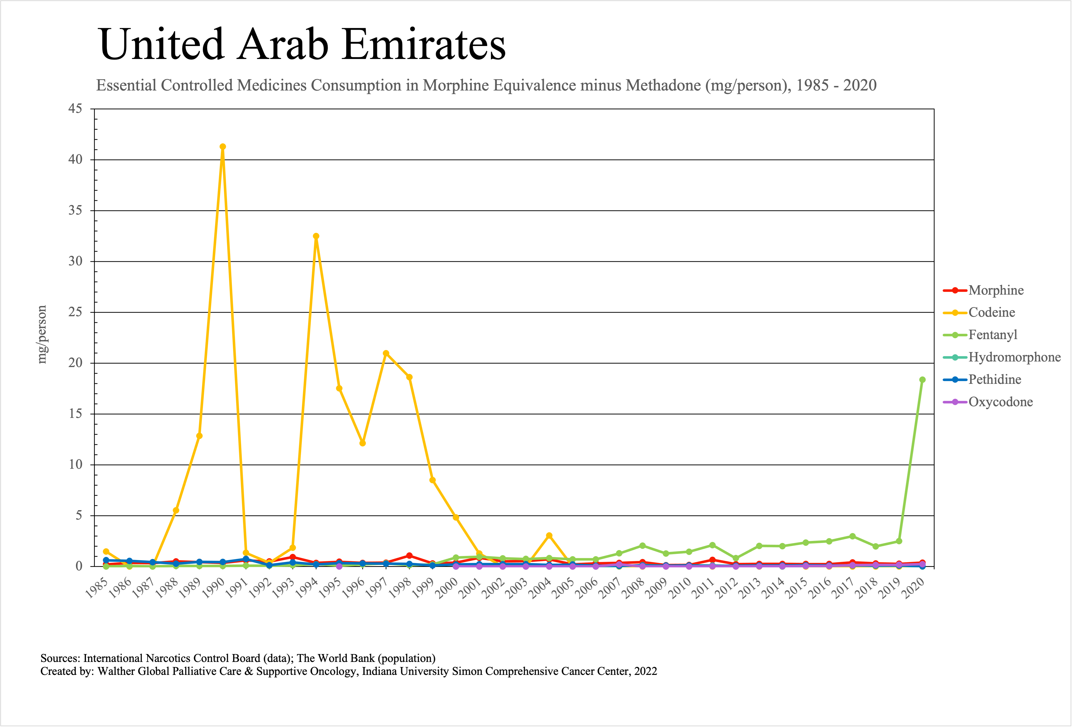 The graphs below provide the Essential Controlled Medicines consumption data trends from 1985 to 2020 in milligrams per capita and Morphine Equivalence (ME) milligrams per capita, as reported to the International Narcotics Control Board (INCB).