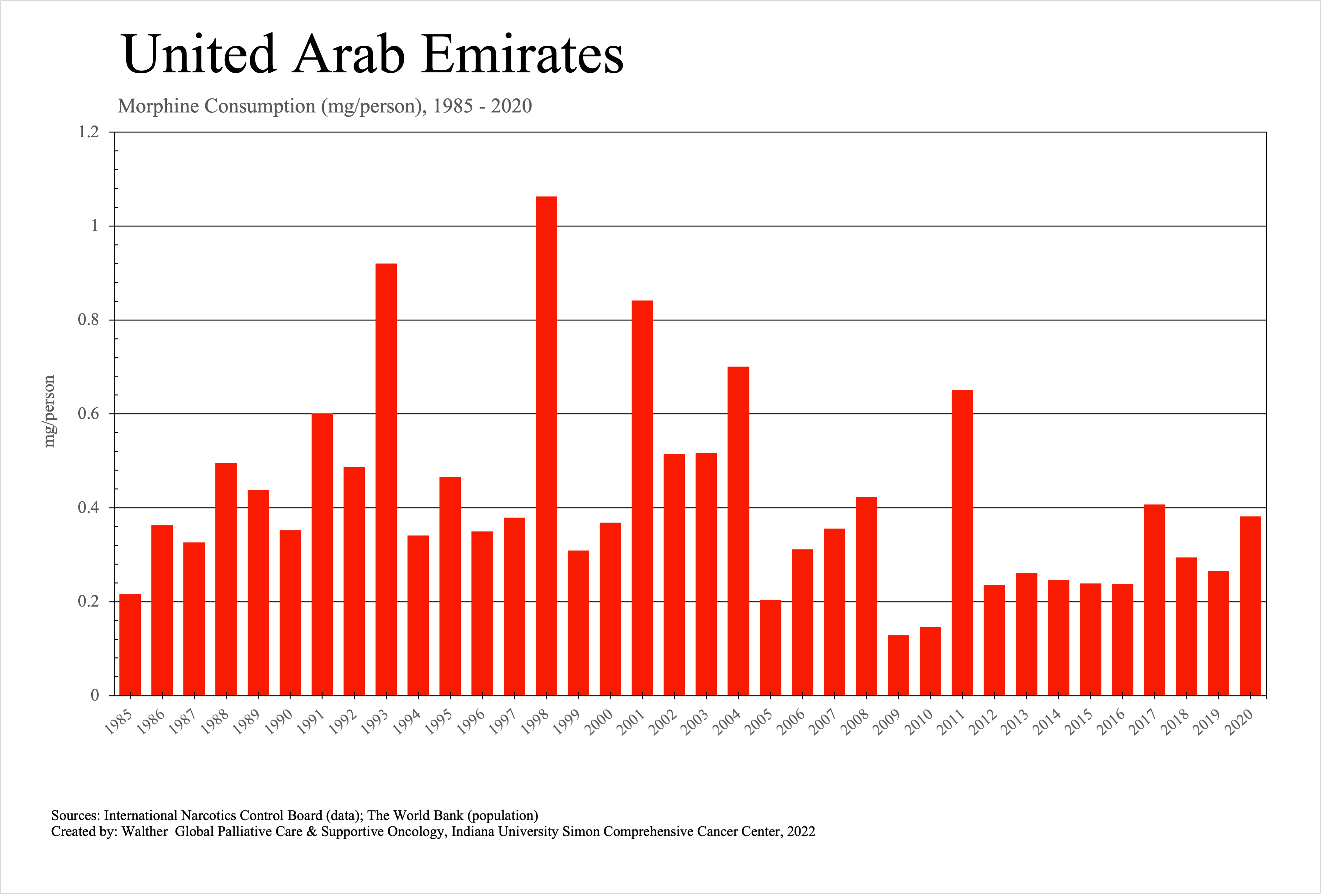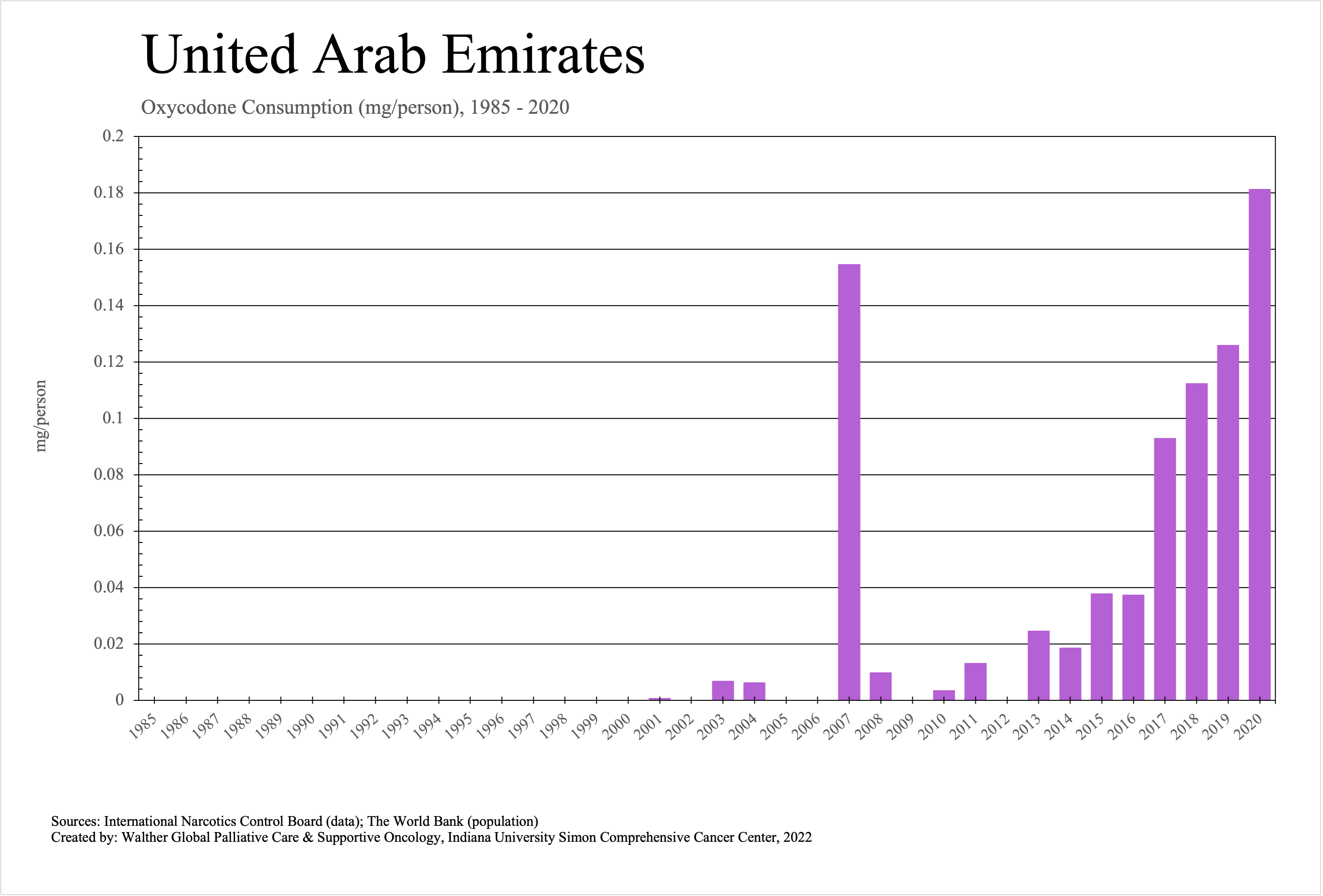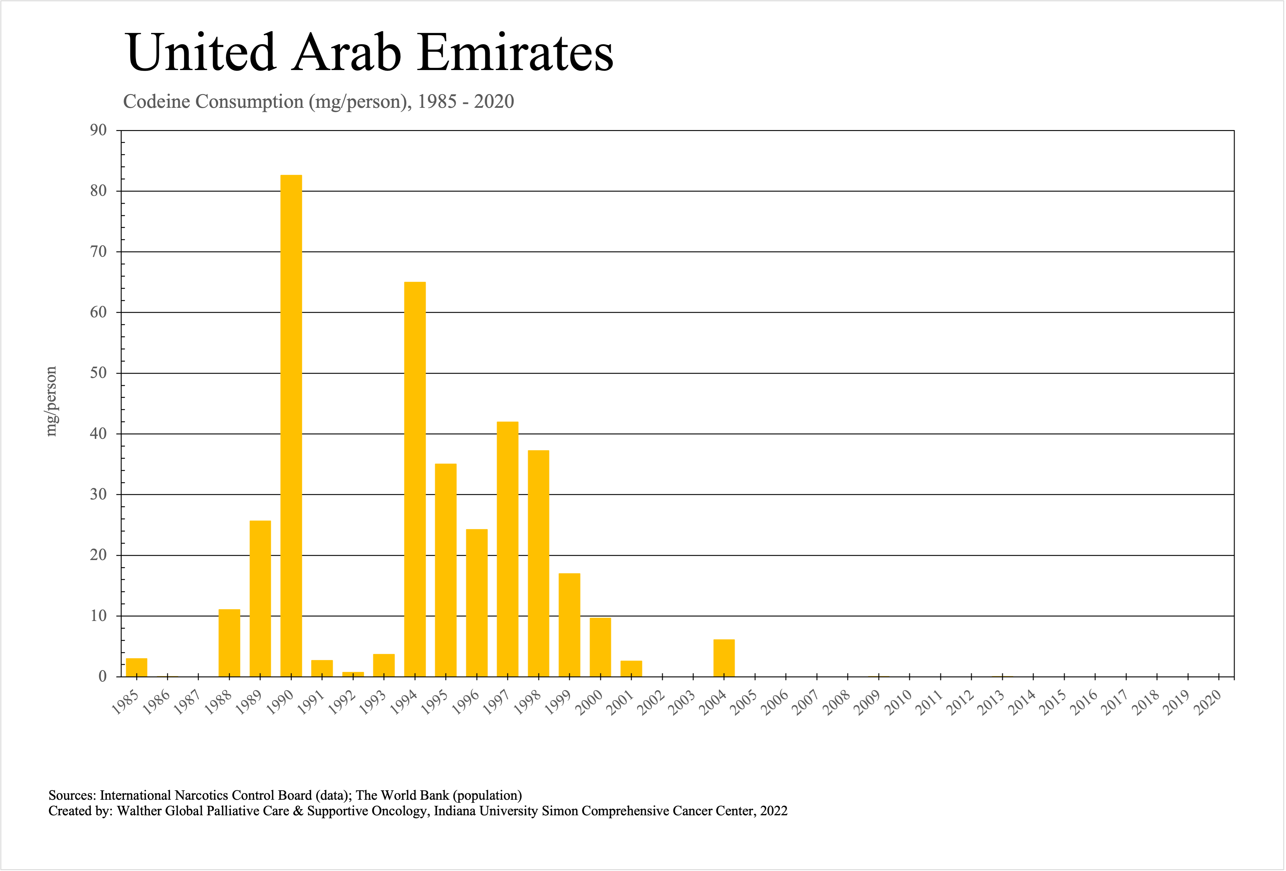 The graphs below provide the Essential Controlled Medicines consumption data trends from 1985 to 2020 in milligrams per capita and Morphine Equivalence (ME) milligrams per capita, as reported to the International Narcotics Control Board (INCB).