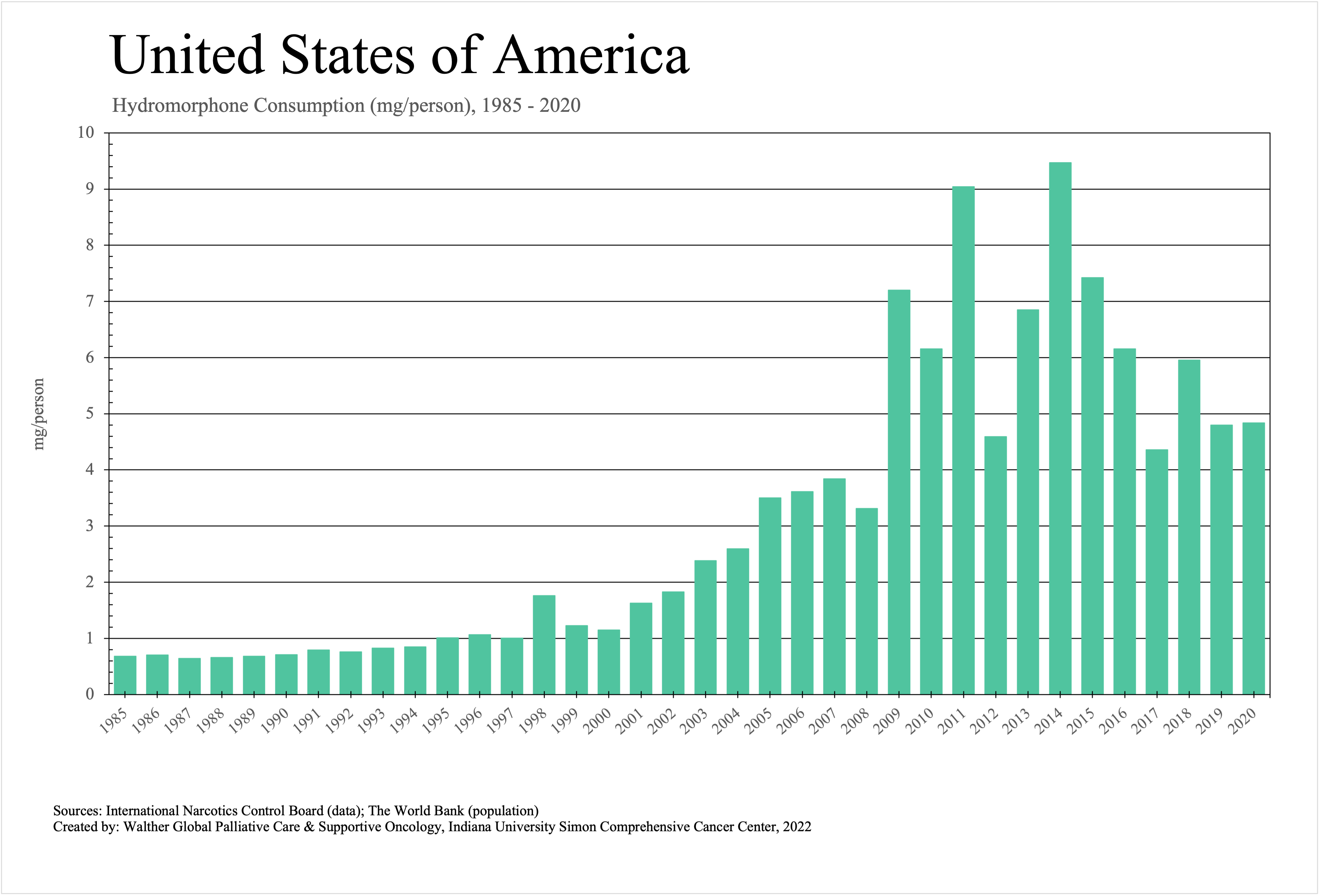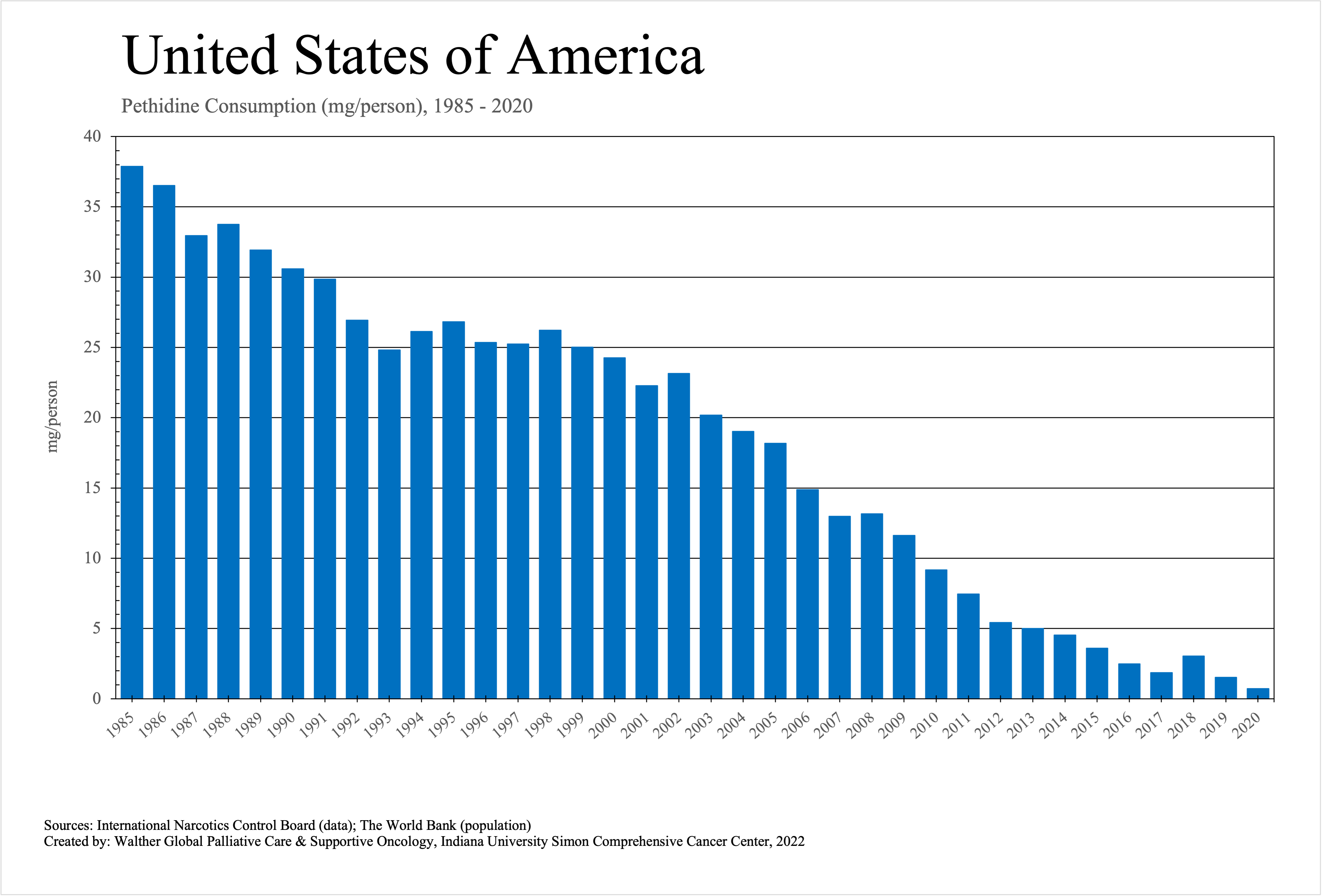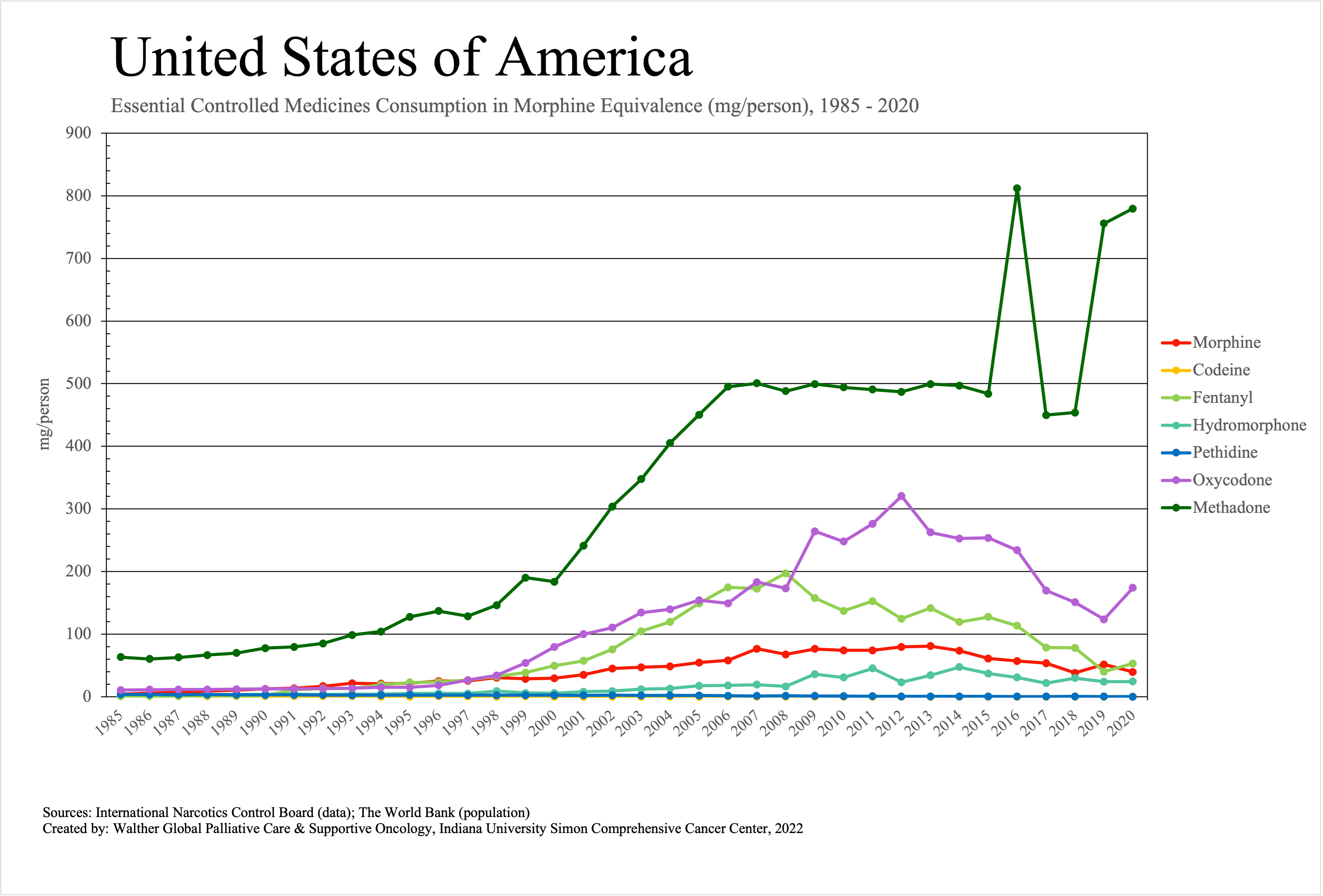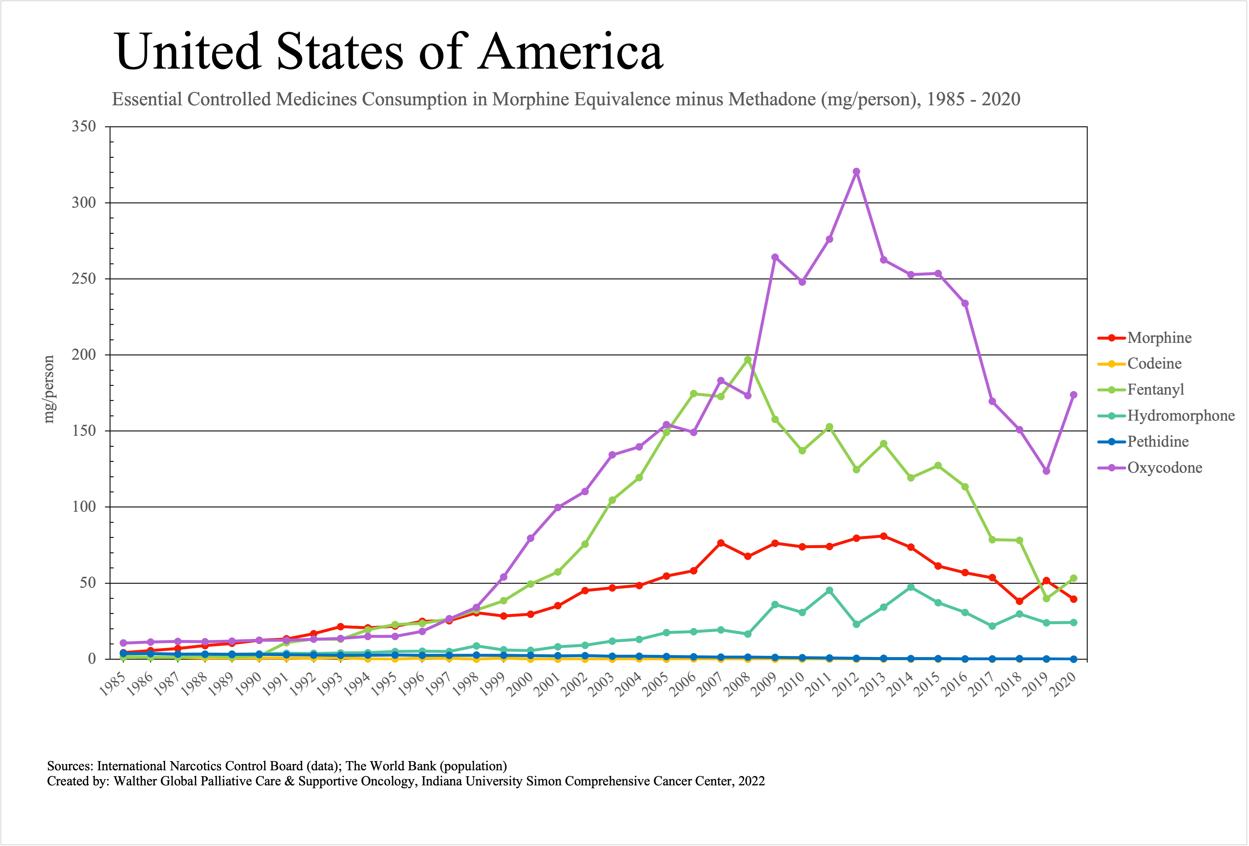 The graphs below provide the Essential Controlled Medicines consumption data trends from 1985 to 2020 in milligrams per capita and Morphine Equivalence (ME) milligrams per capita, as reported to the International Narcotics Control Board (INCB).