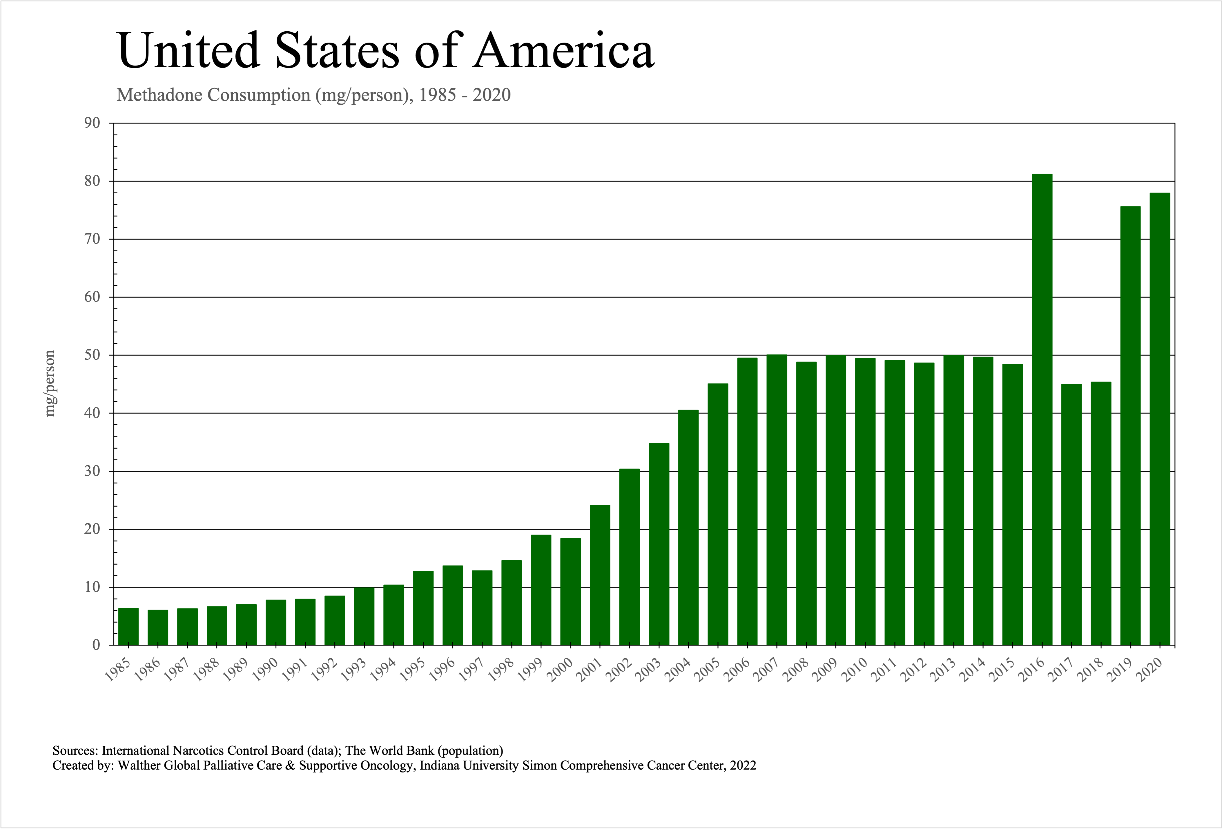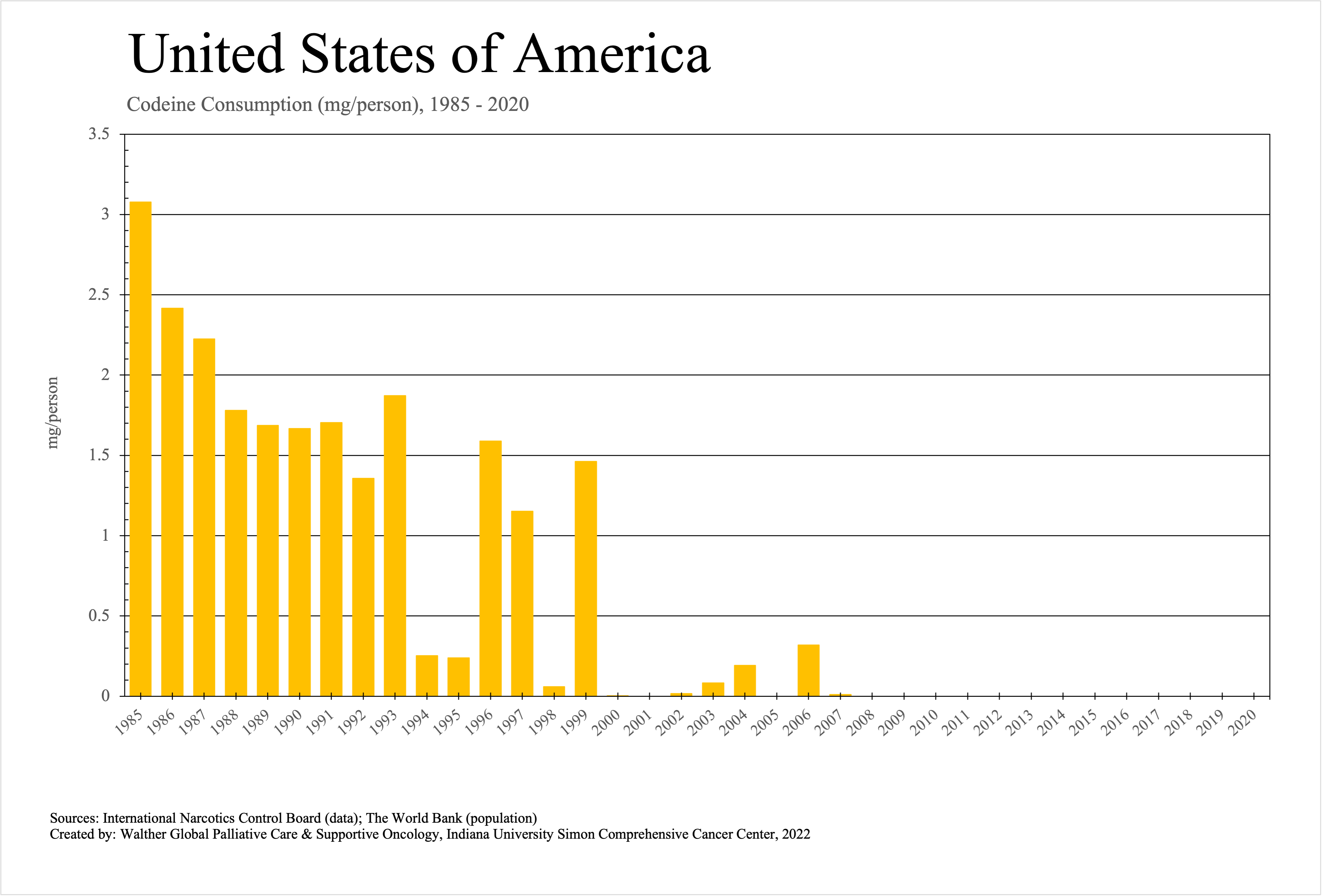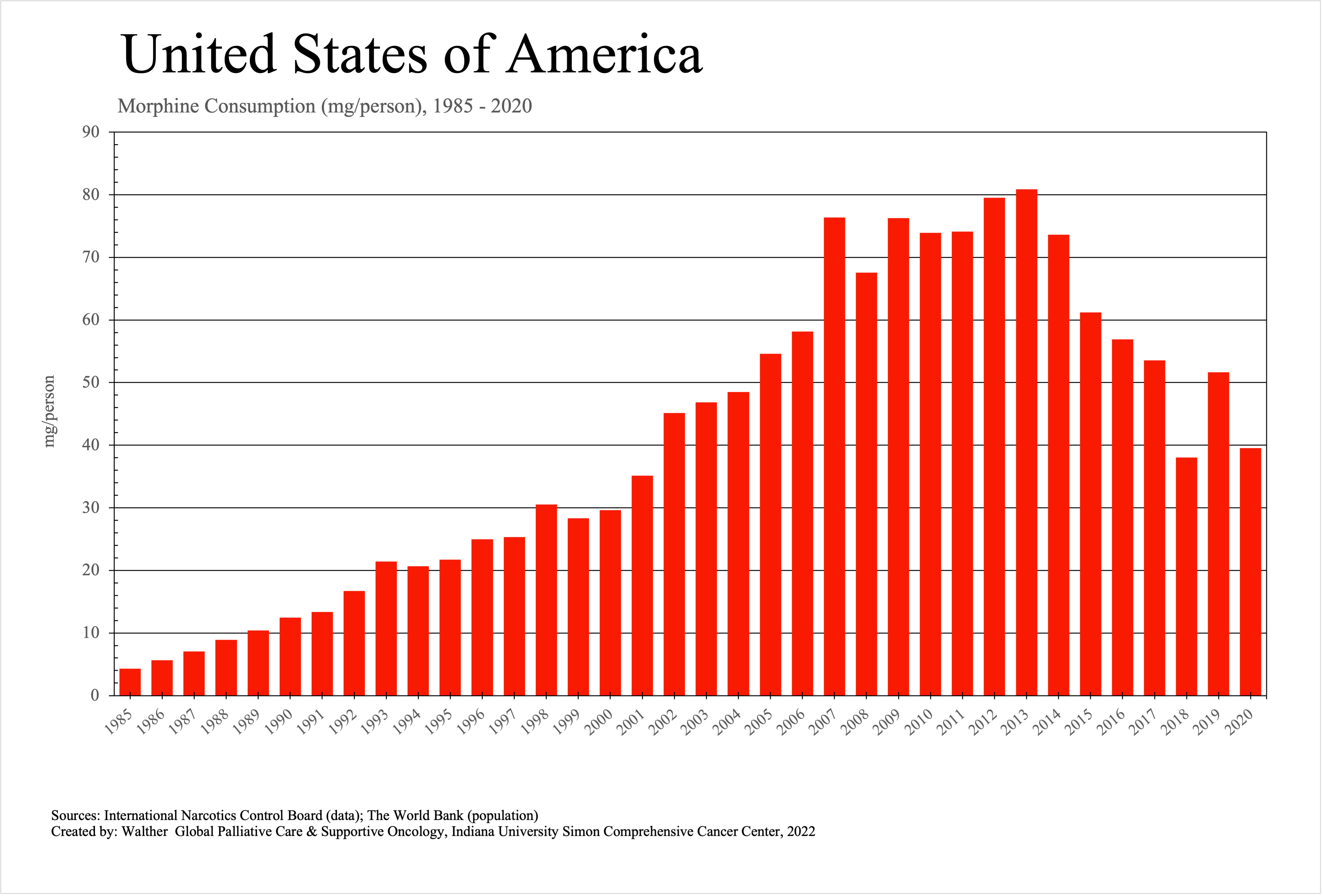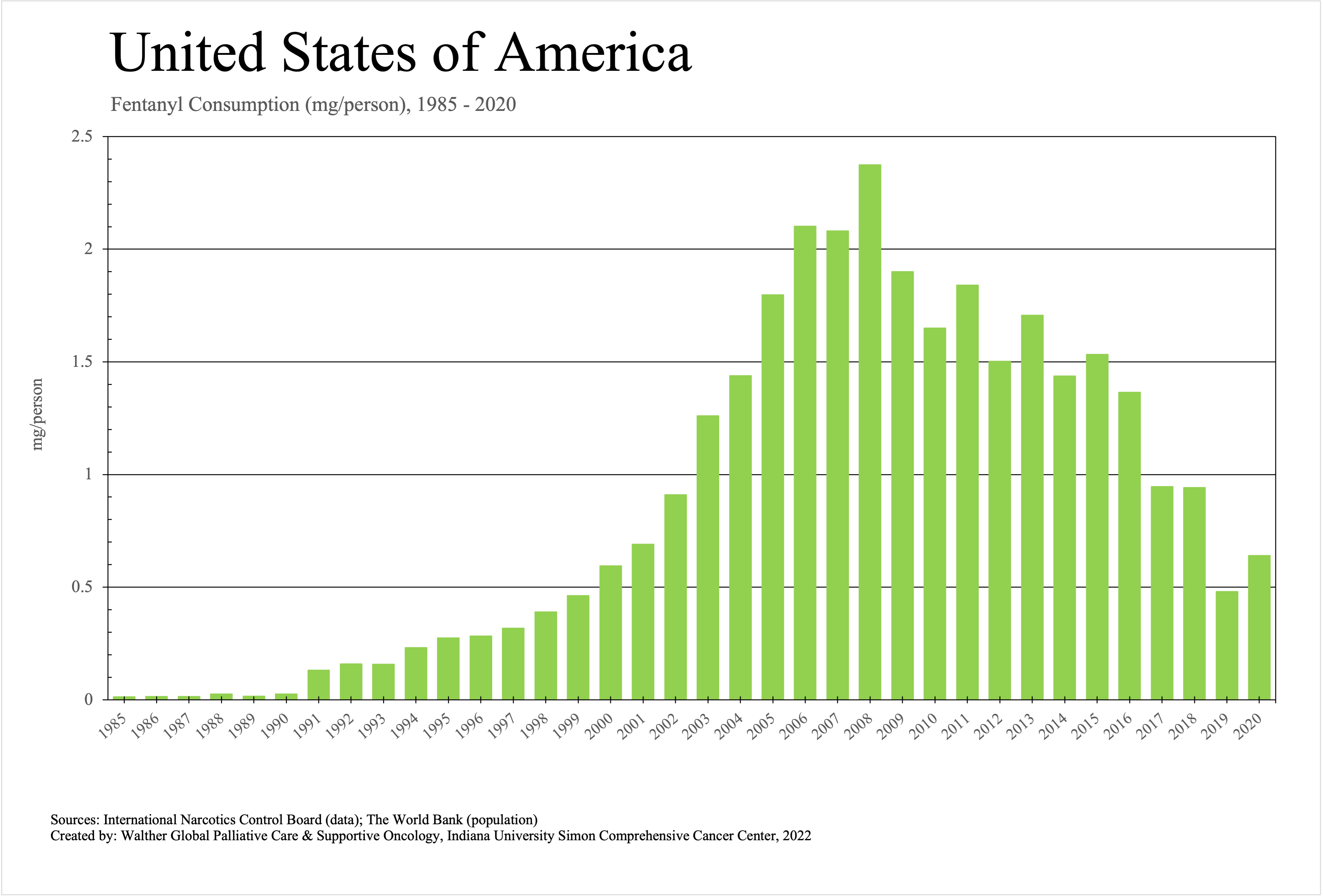 The graphs below provide the Essential Controlled Medicines consumption data trends from 1985 to 2020 in milligrams per capita and Morphine Equivalence (ME) milligrams per capita, as reported to the International Narcotics Control Board (INCB).