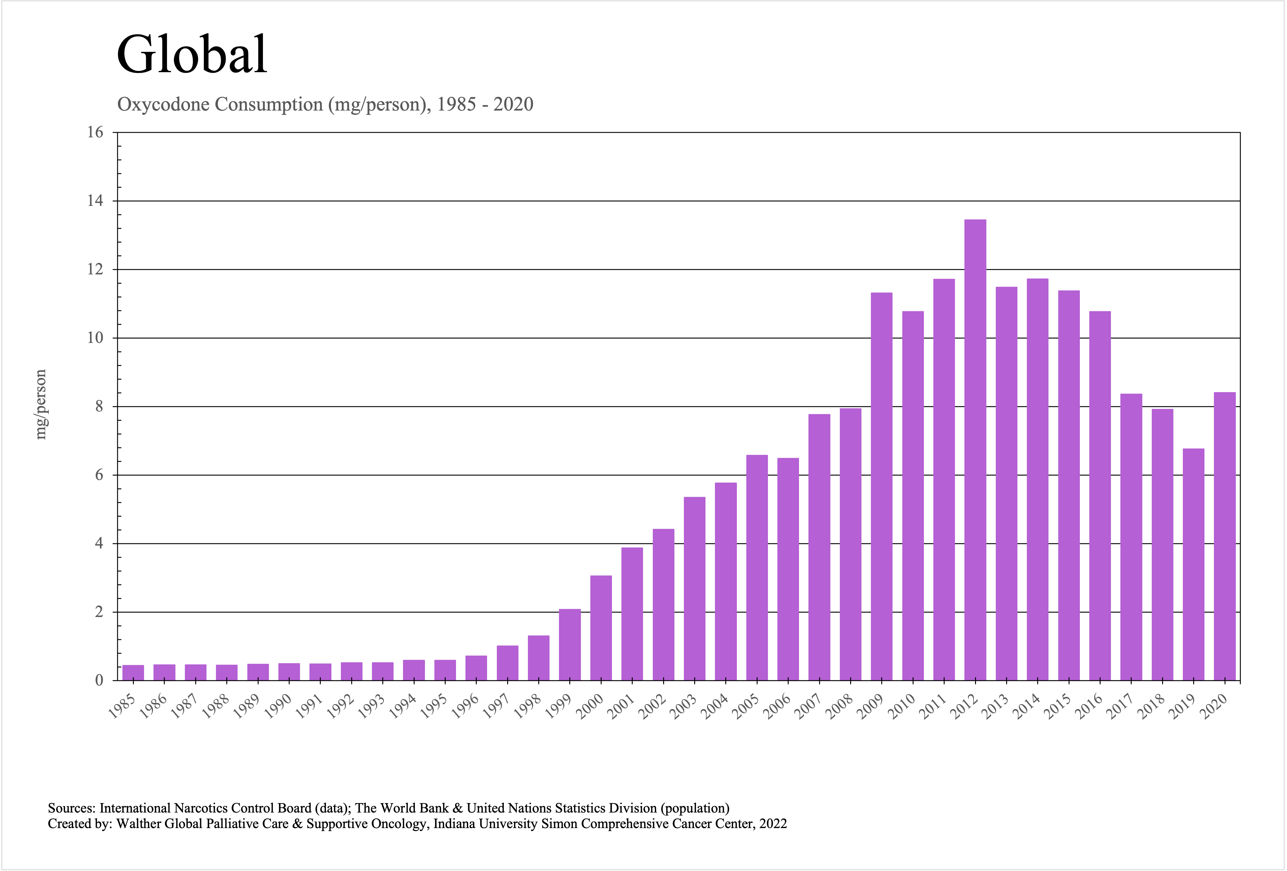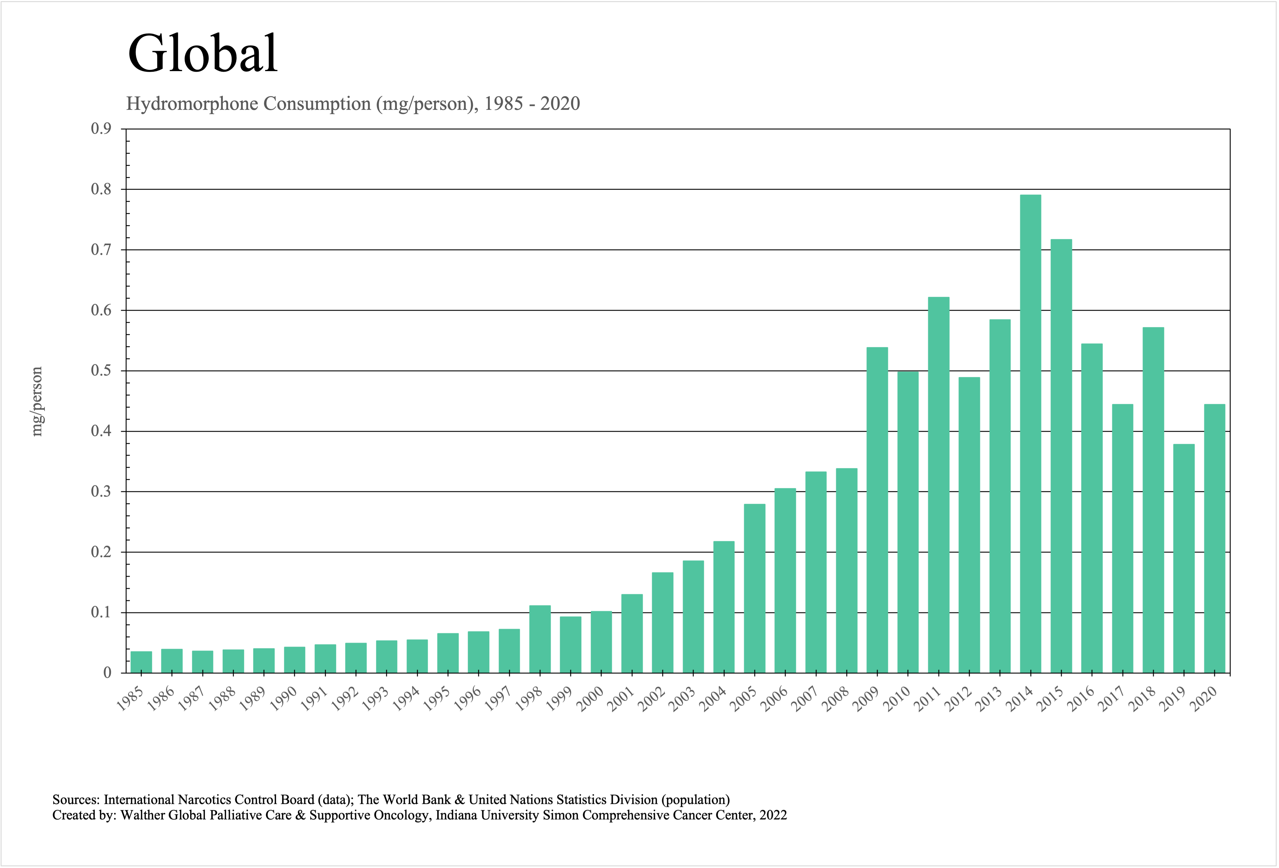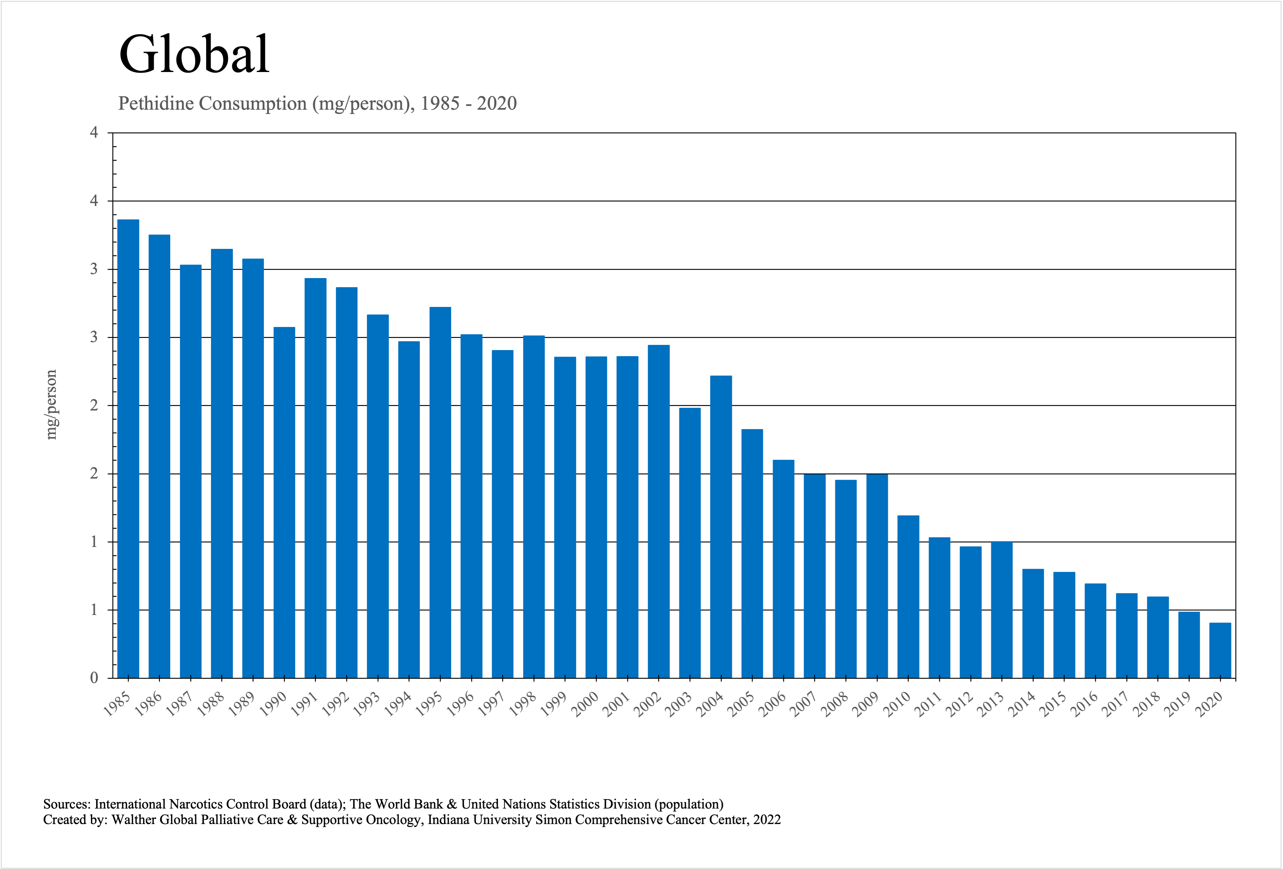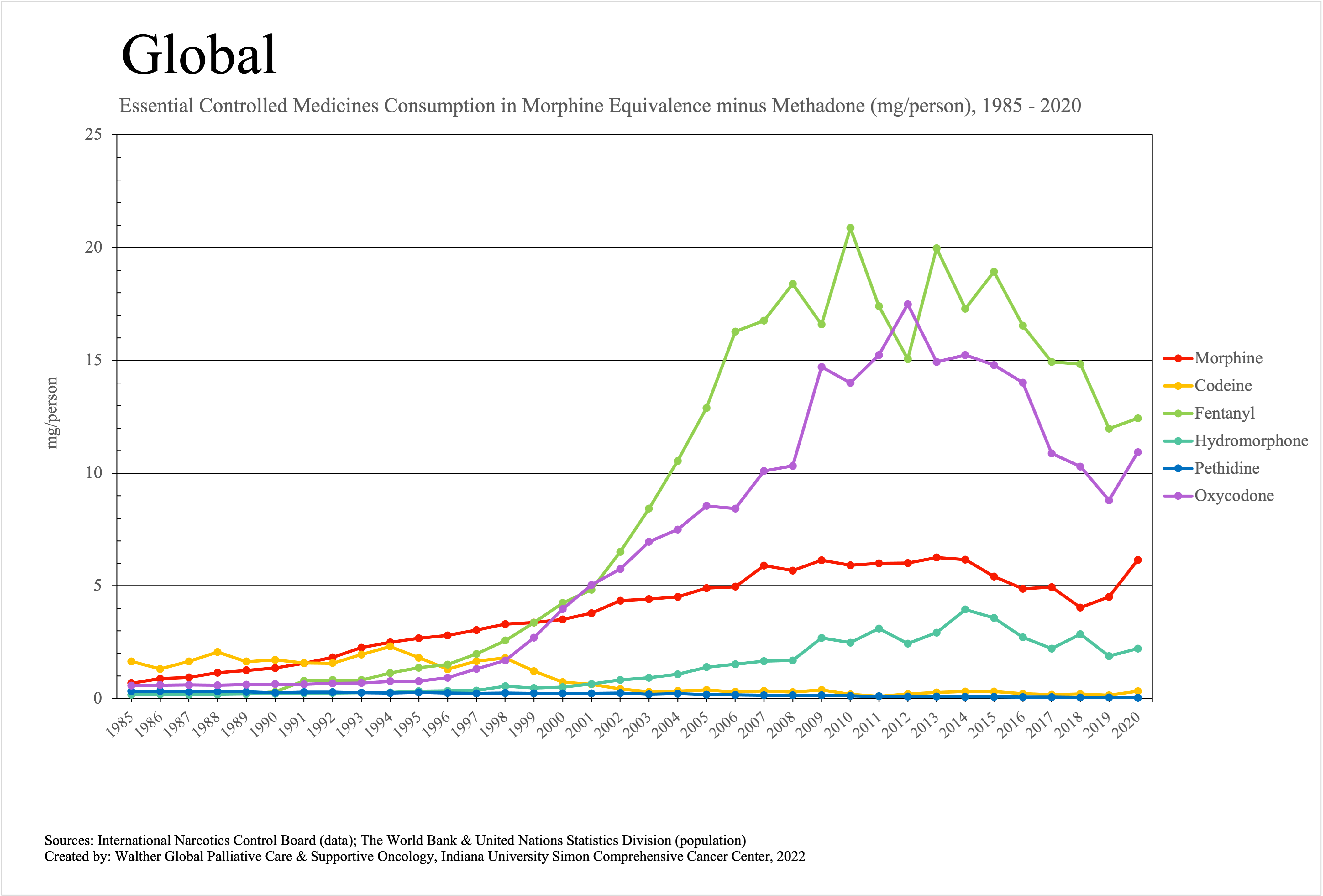 The graphs below provide the Essential Controlled Medicines consumption data trends from 1985 to 2020 in milligrams per capita and Morphine Equivalence (ME) milligrams per capita, as reported to the International Narcotics Control Board (INCB).
