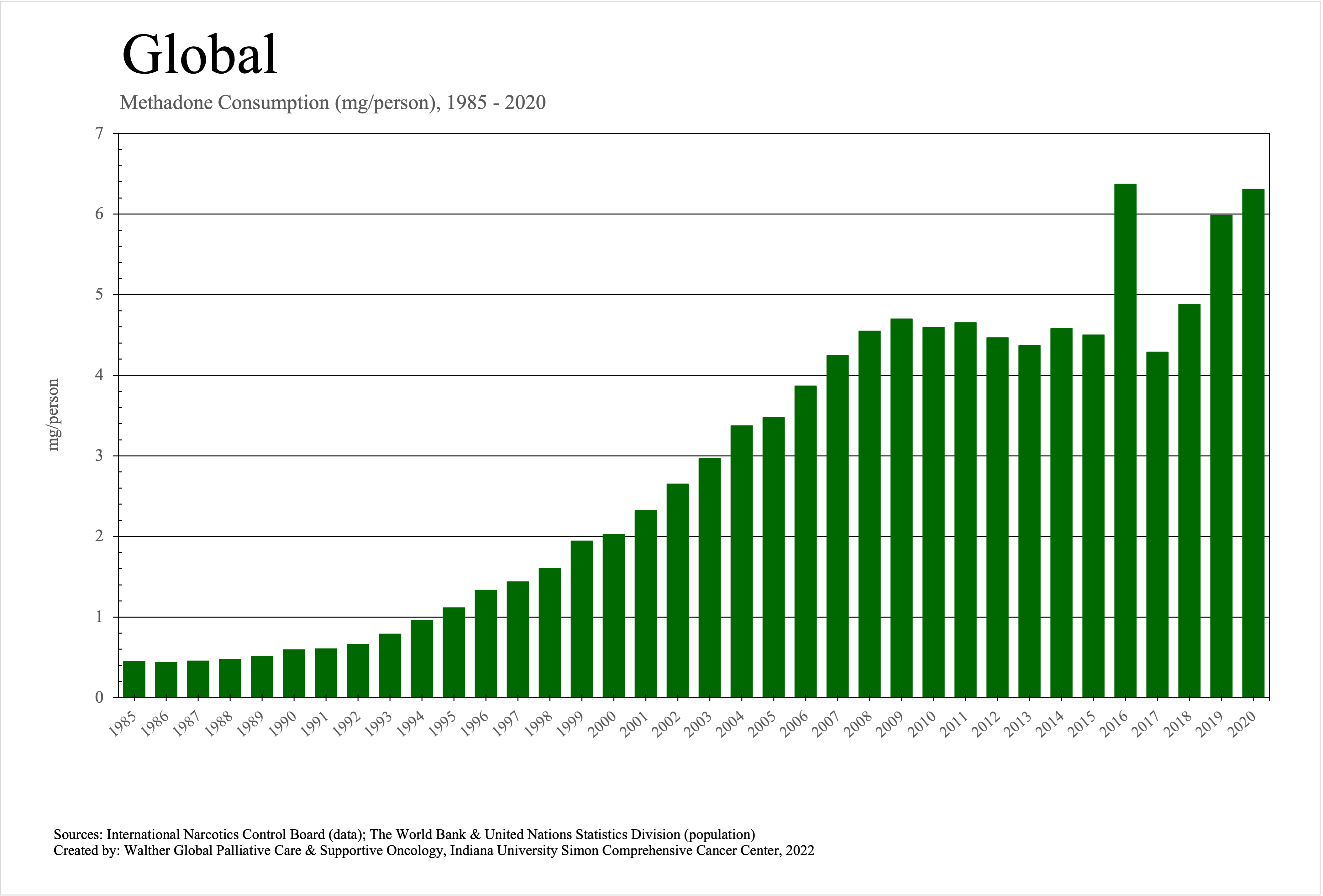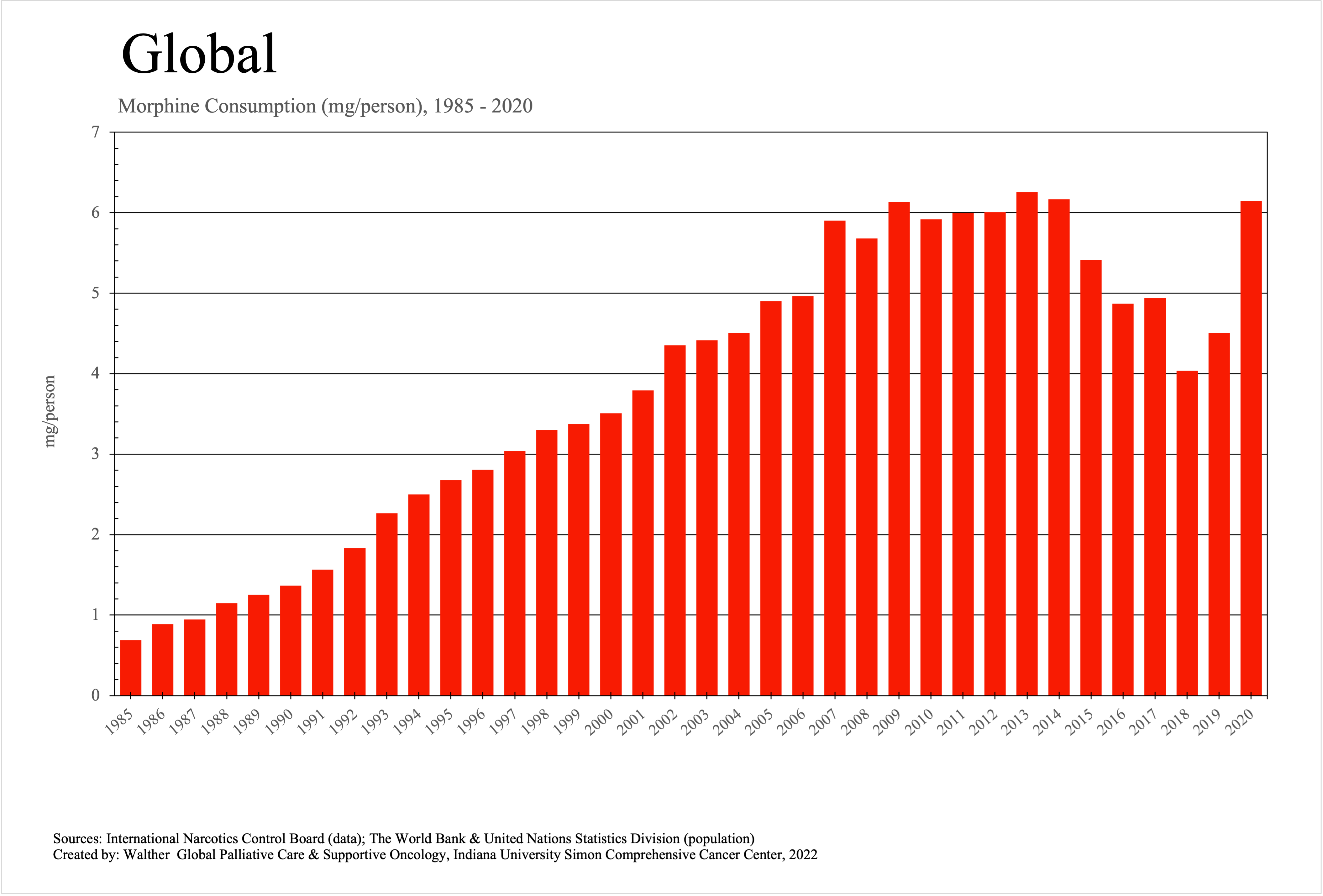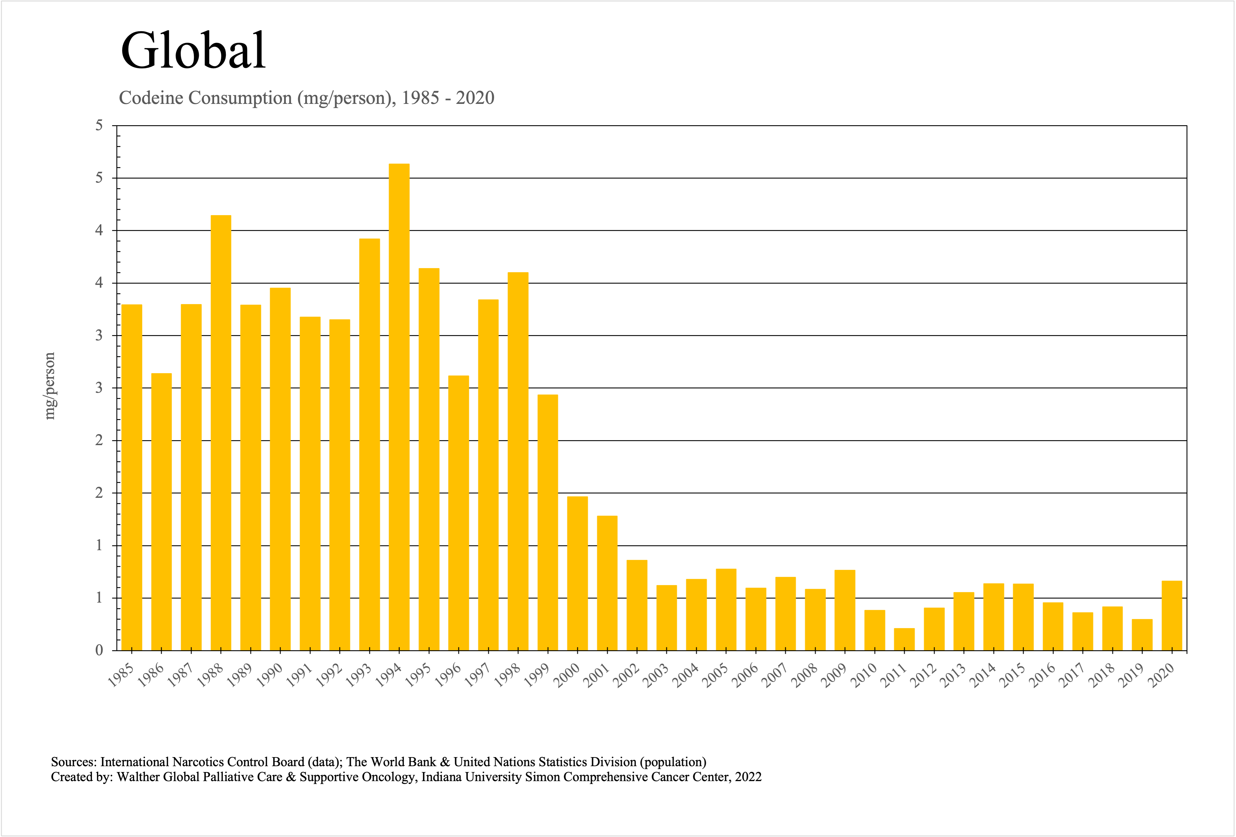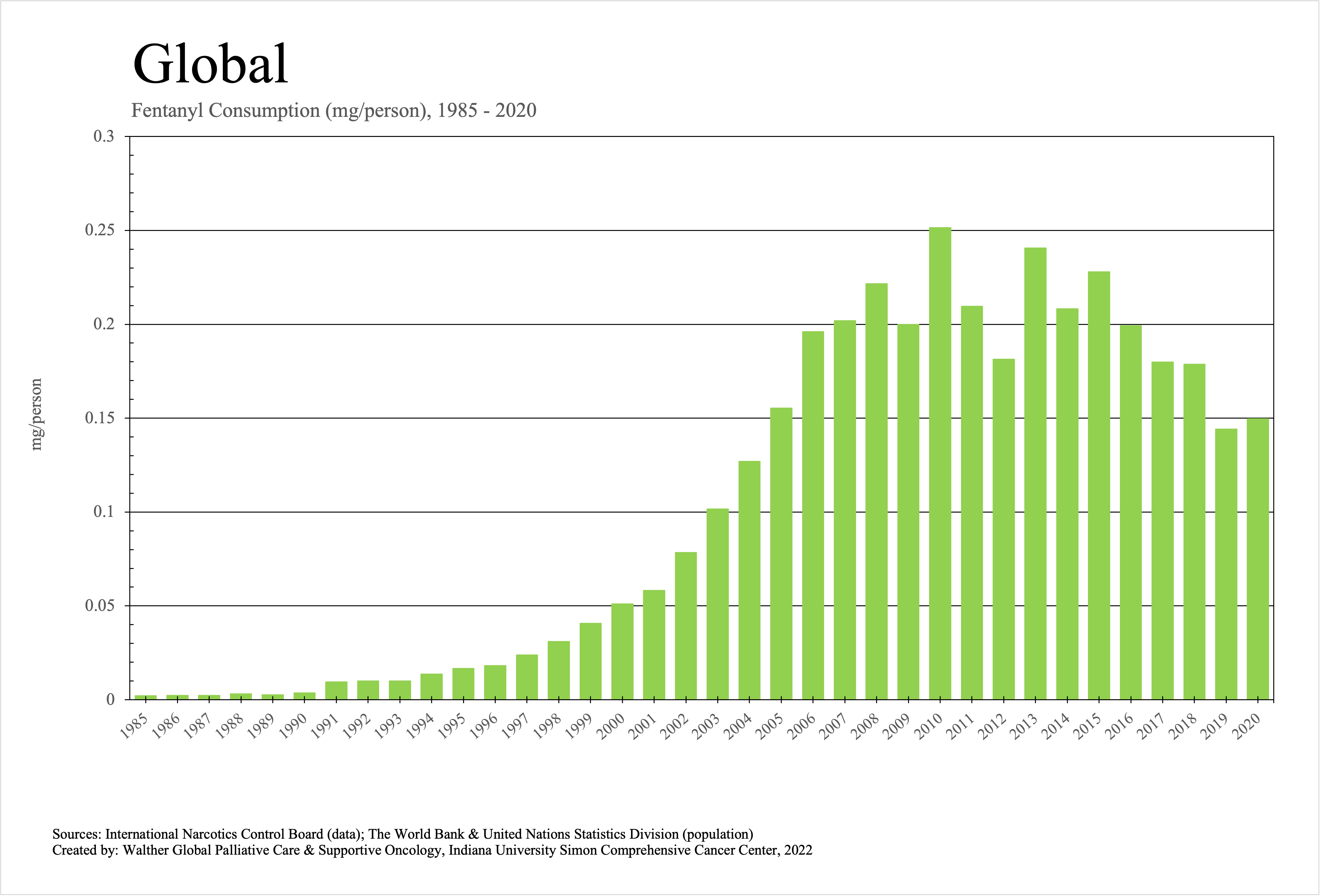 The graphs below provide the Essential Controlled Medicines consumption data trends from 1985 to 2020 in milligrams per capita and Morphine Equivalence (ME) milligrams per capita, as reported to the International Narcotics Control Board (INCB).